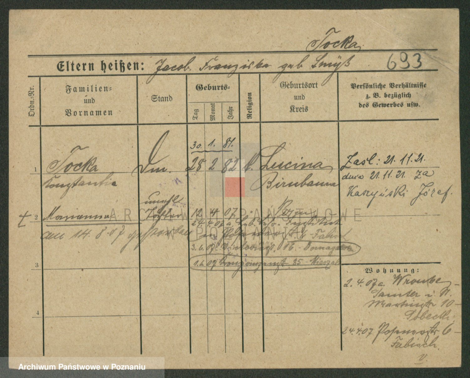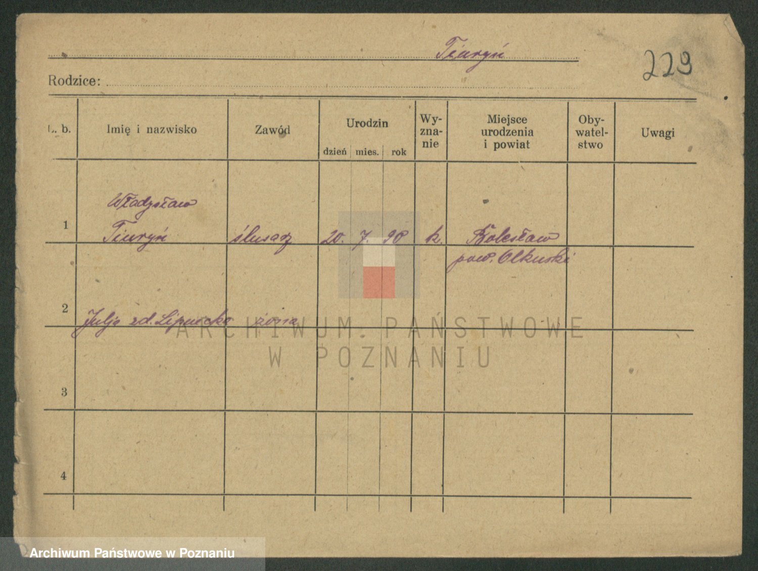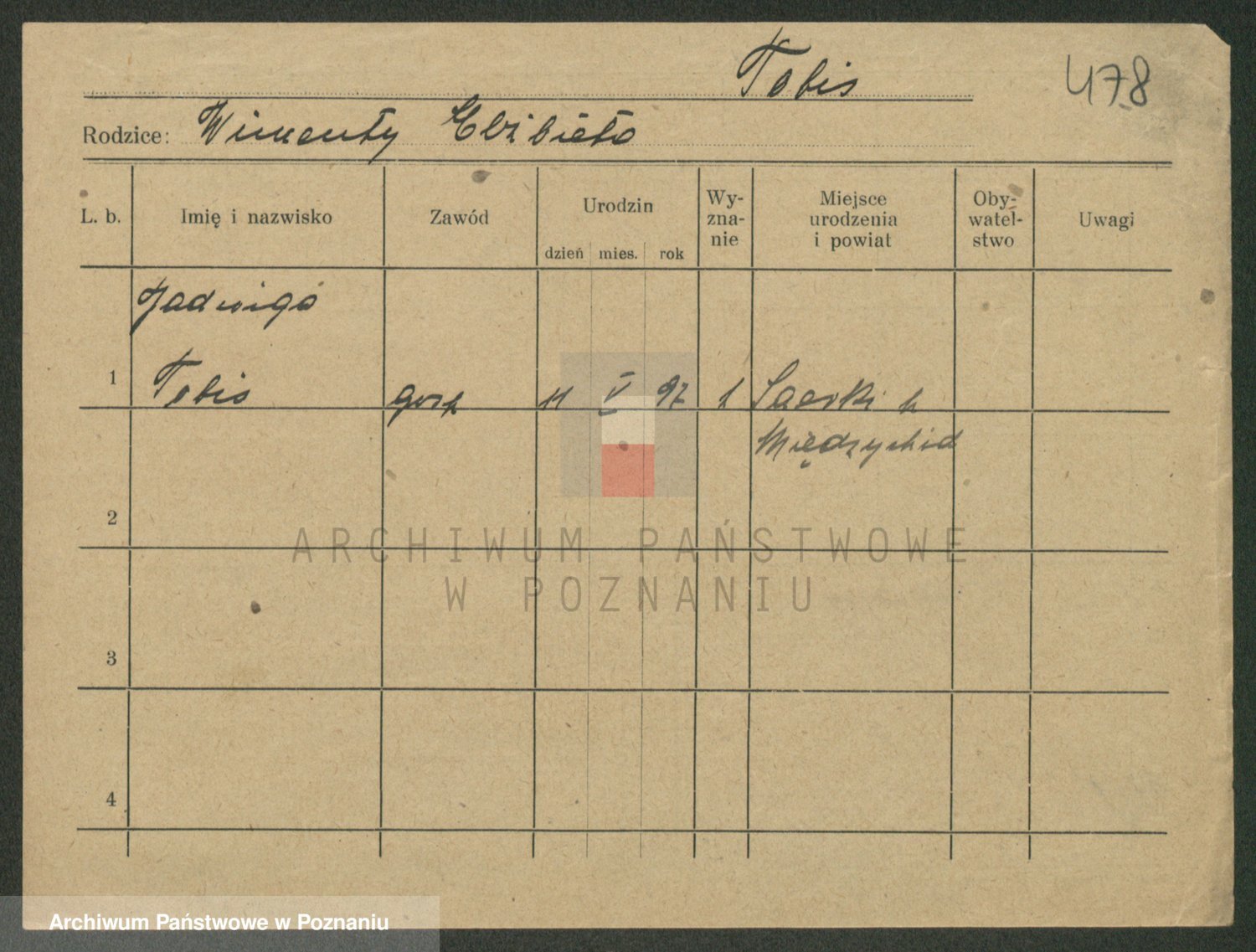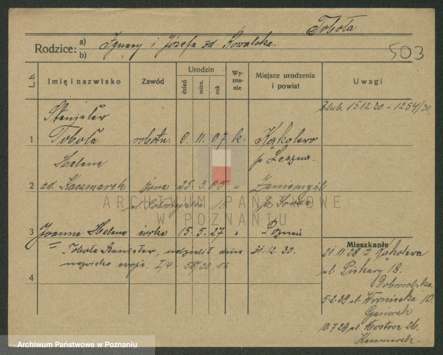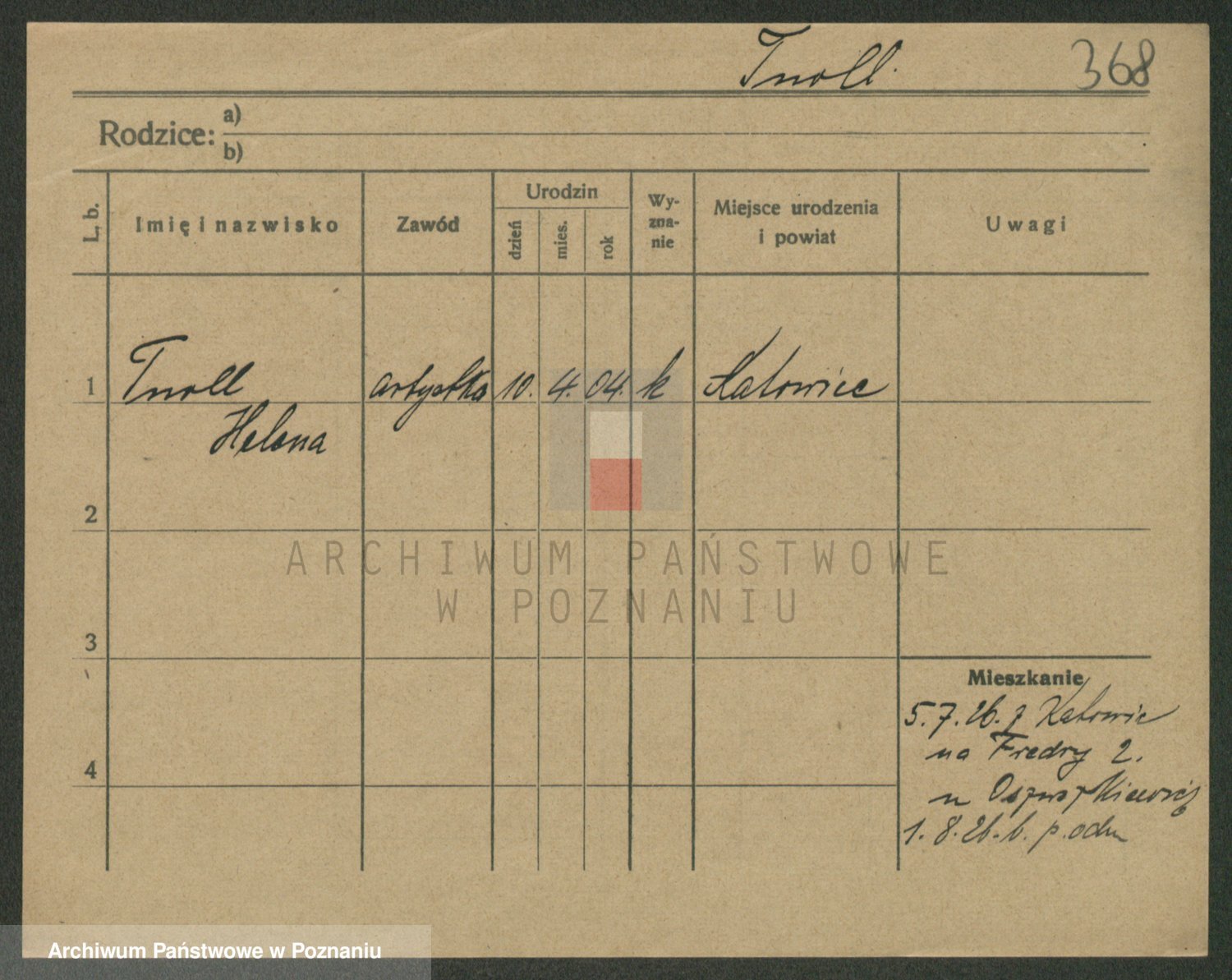 Podgląd karty osobowej dostępny jest po kliknięciu na nazwisko lub ikonkę karty. Można dokonywać powiększenia (ikony na górze) lub przechodzić między kolejnymi skanami (strzałki po bokach).
