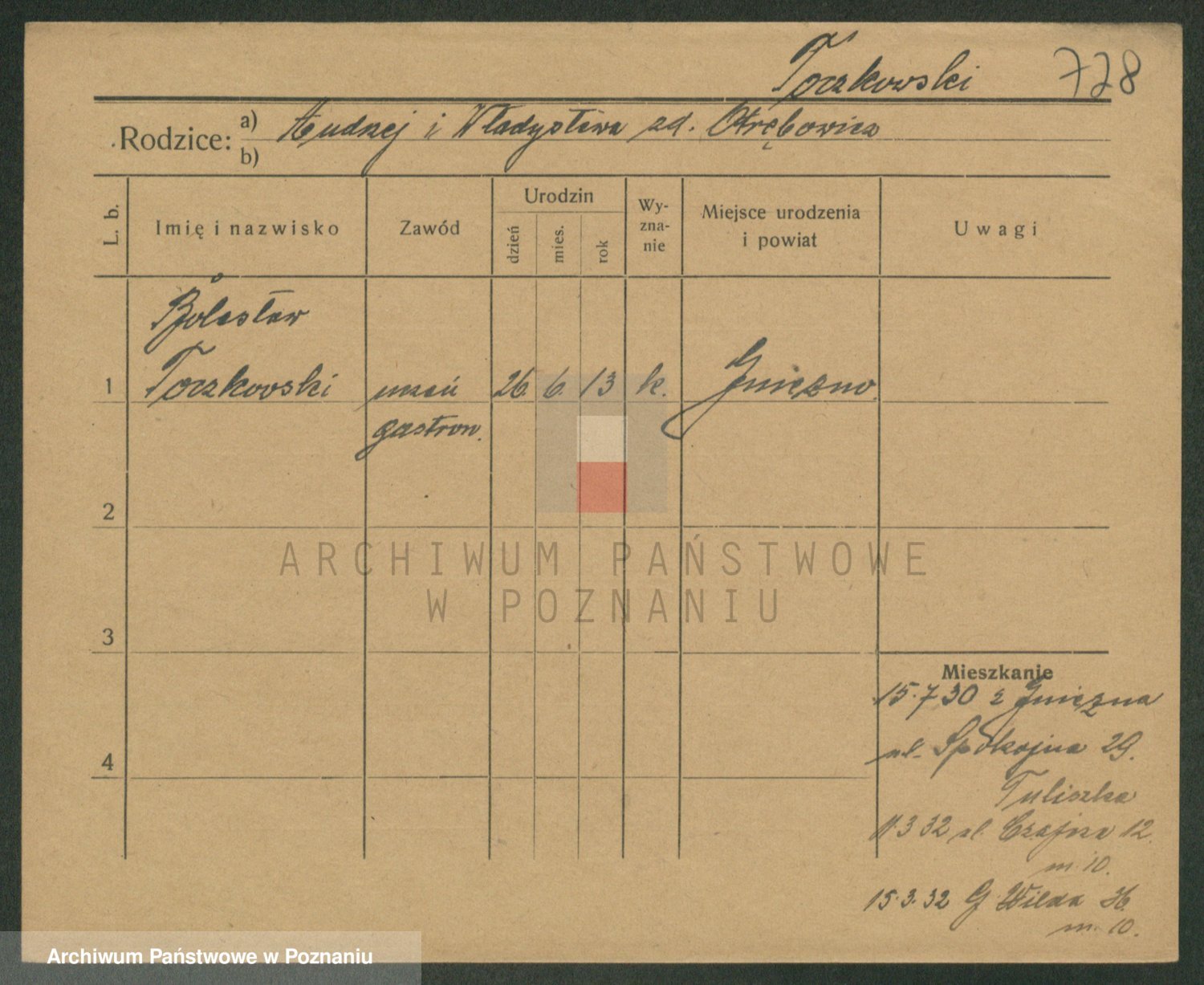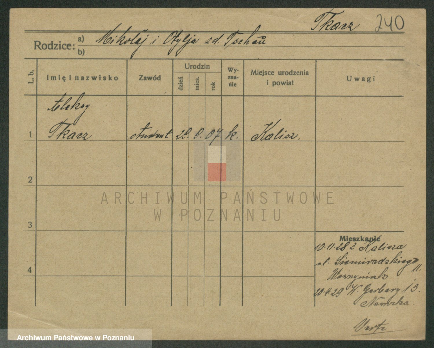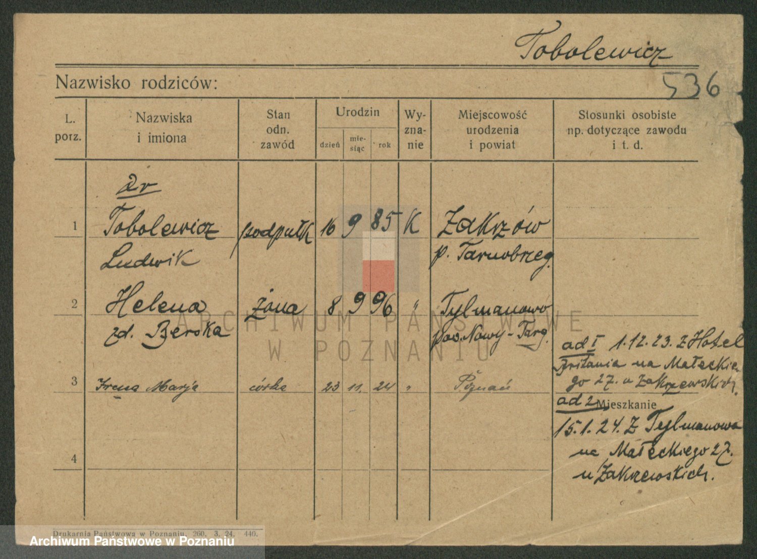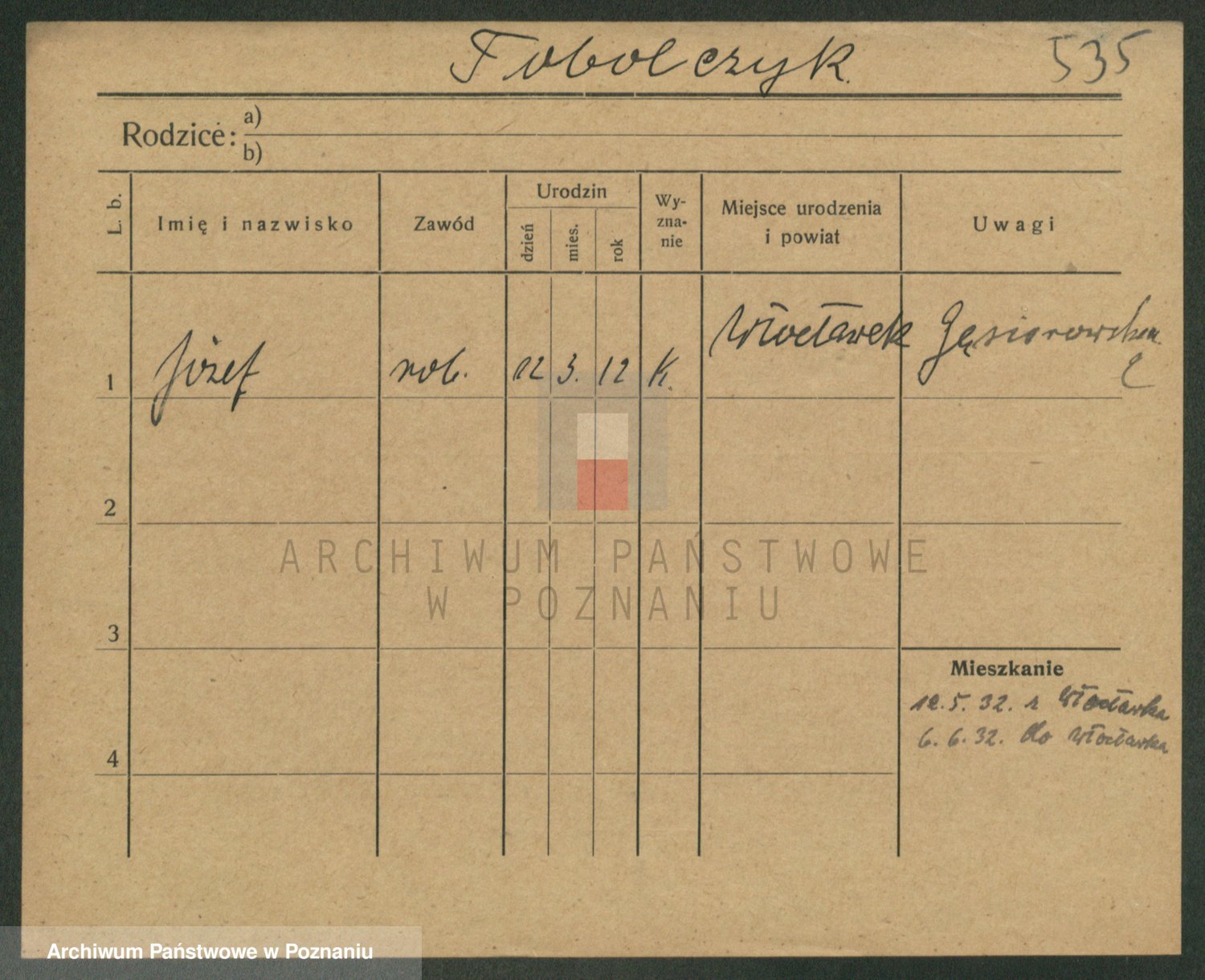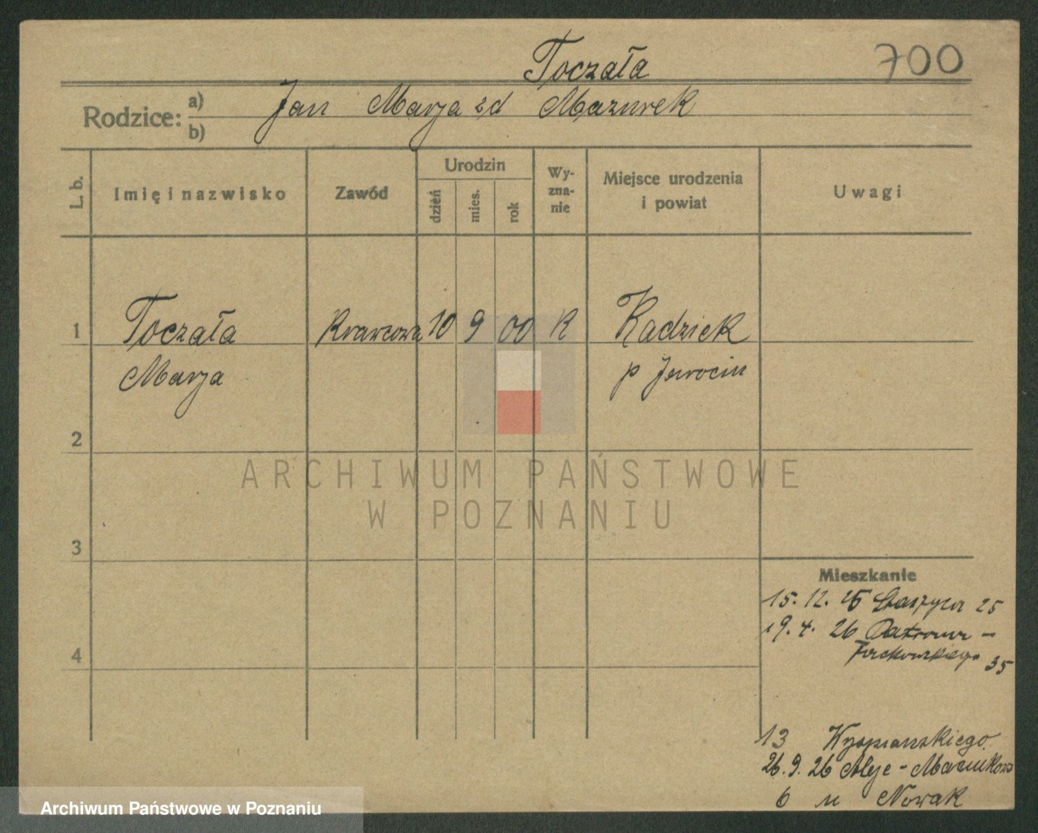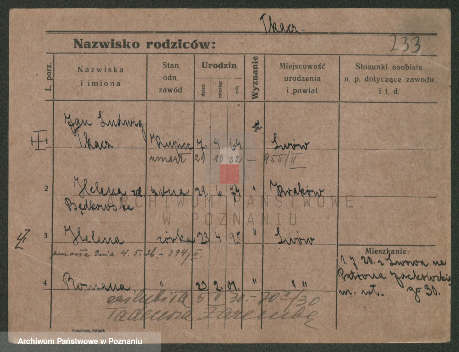 Podgląd karty osobowej dostępny jest po kliknięciu na nazwisko lub ikonkę karty. Można dokonywać powiększenia (ikony na górze) lub przechodzić między kolejnymi skanami (strzałki po bokach).