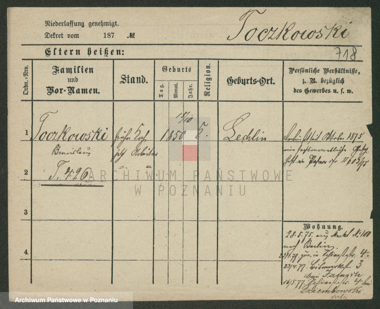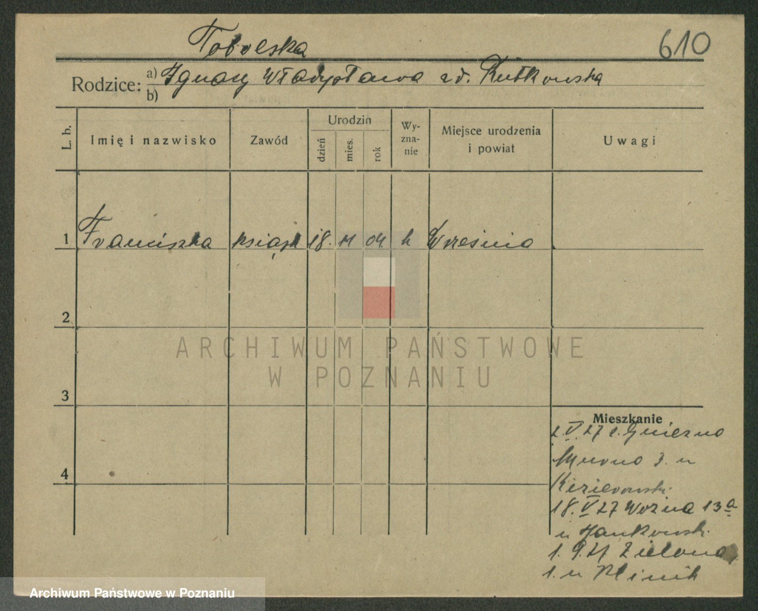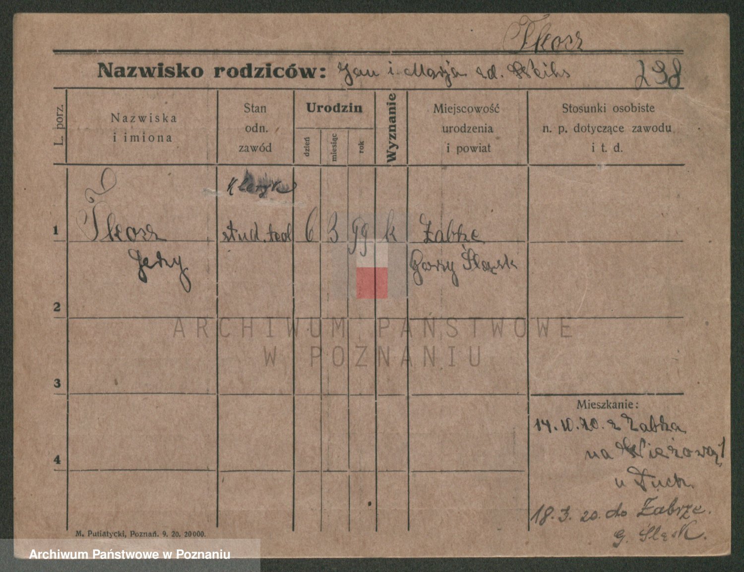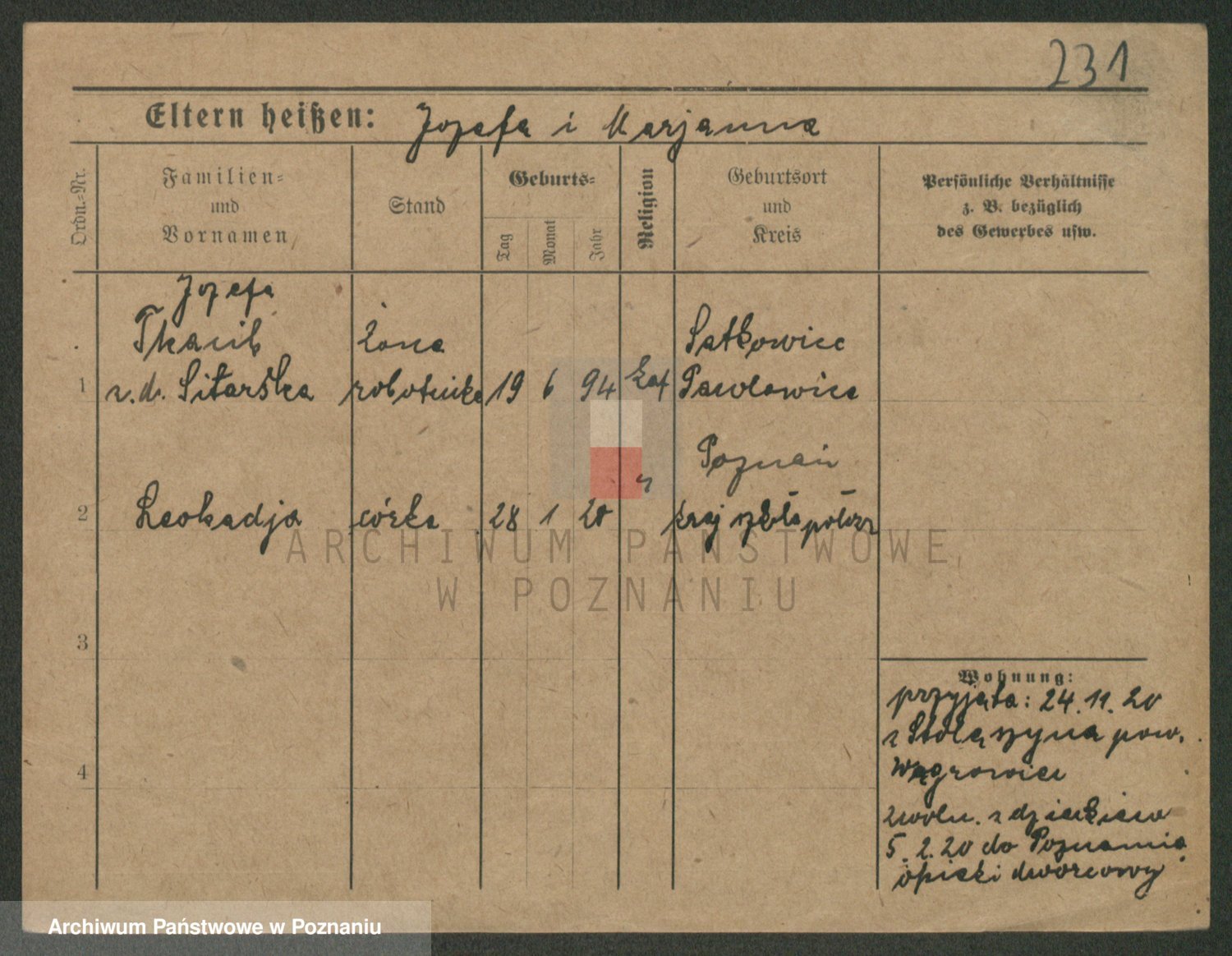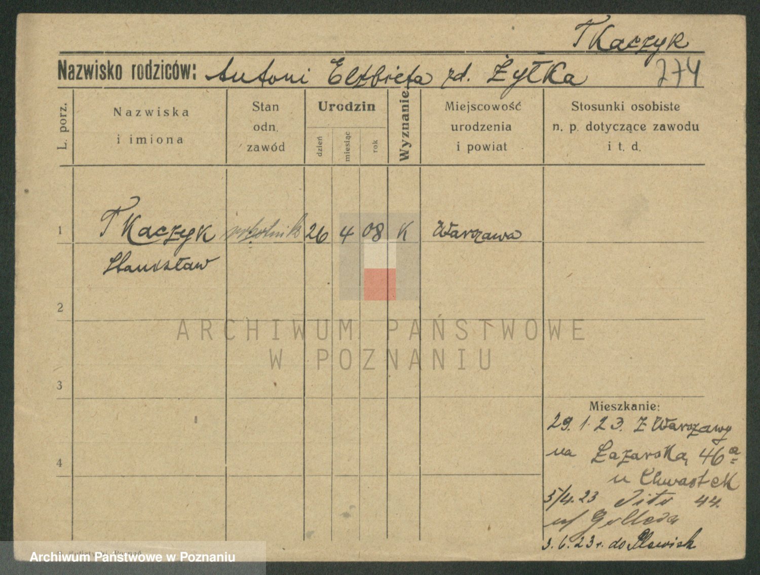 Podgląd karty osobowej dostępny jest po kliknięciu na nazwisko lub ikonkę karty. Można dokonywać powiększenia (ikony na górze) lub przechodzić między kolejnymi skanami (strzałki po bokach).