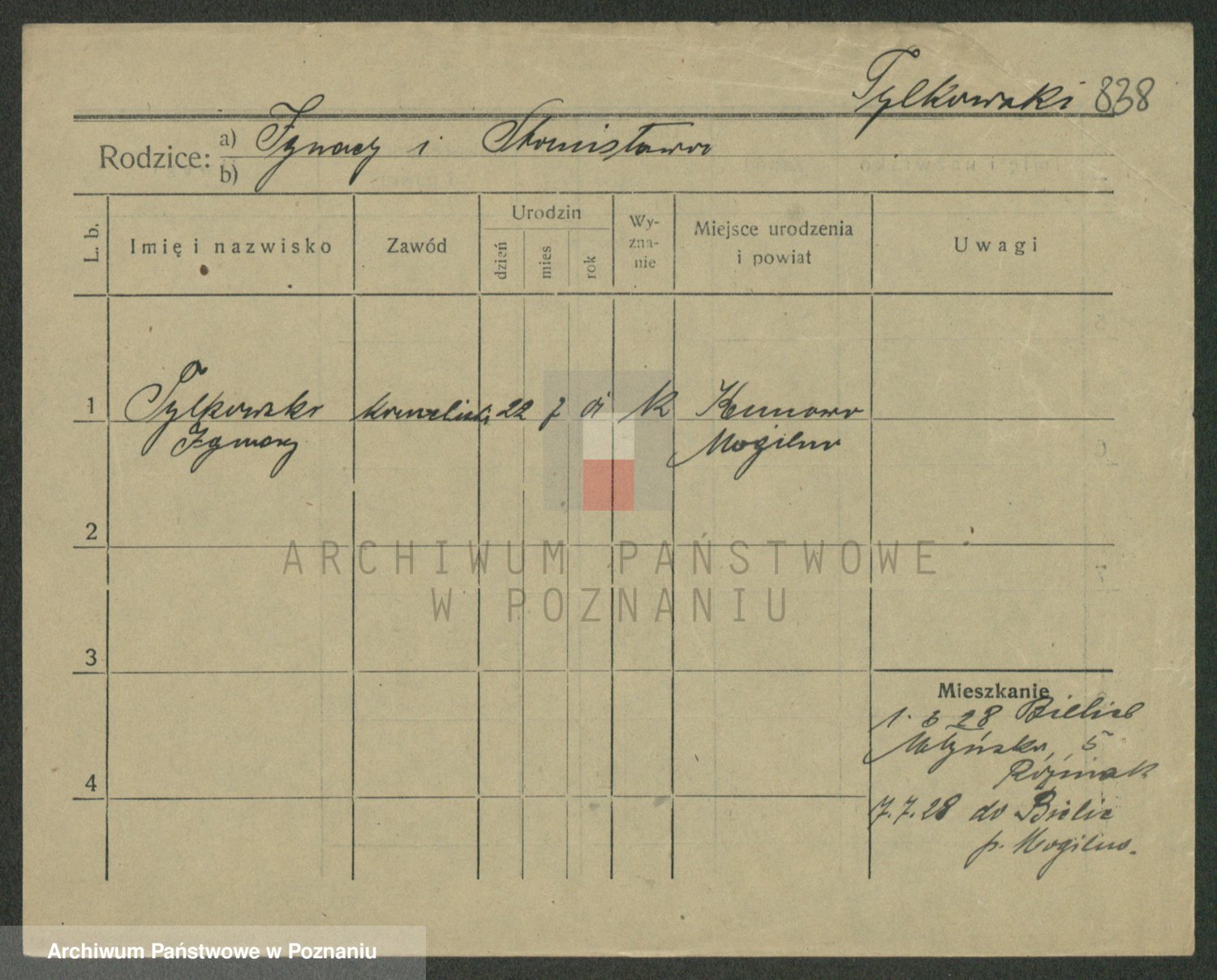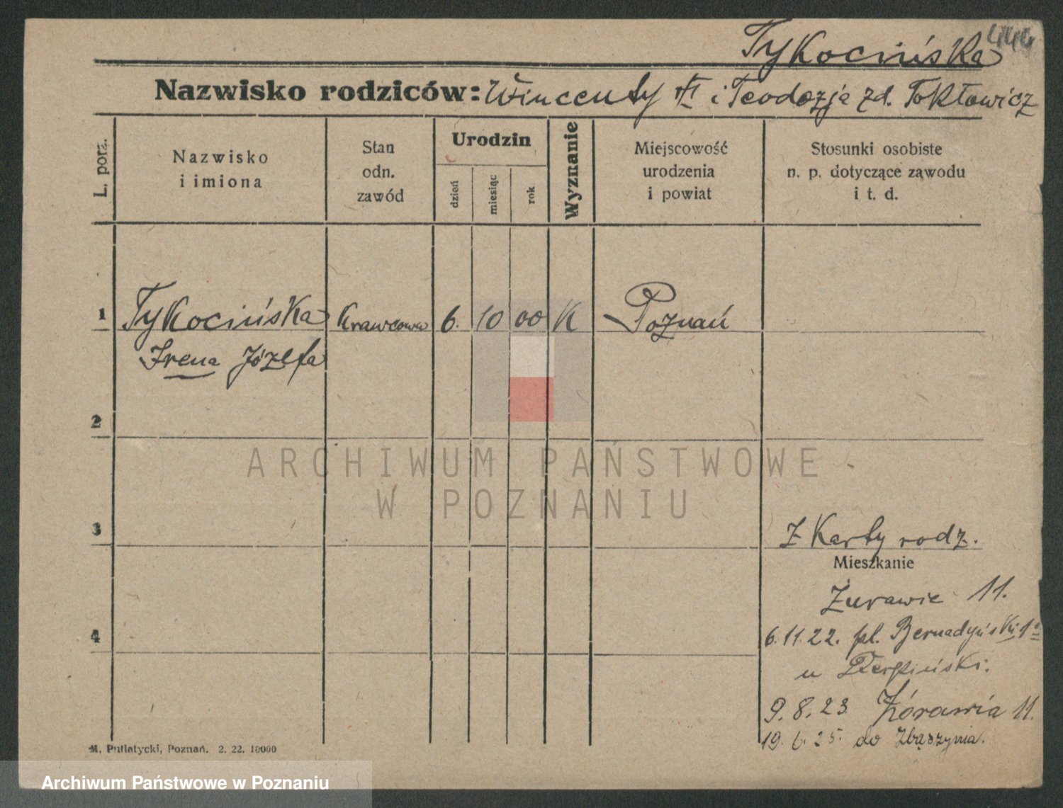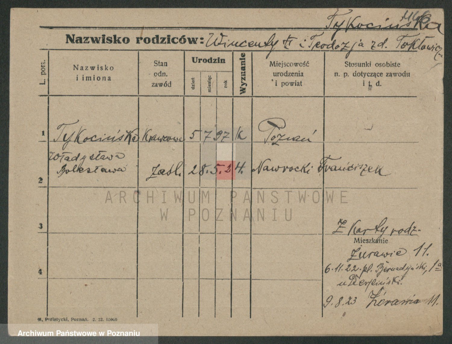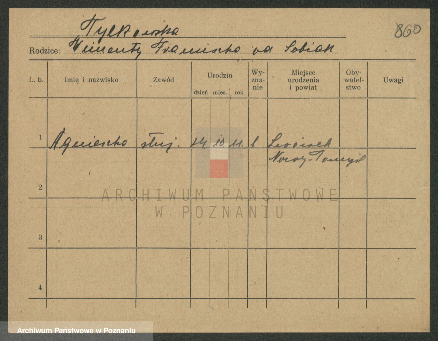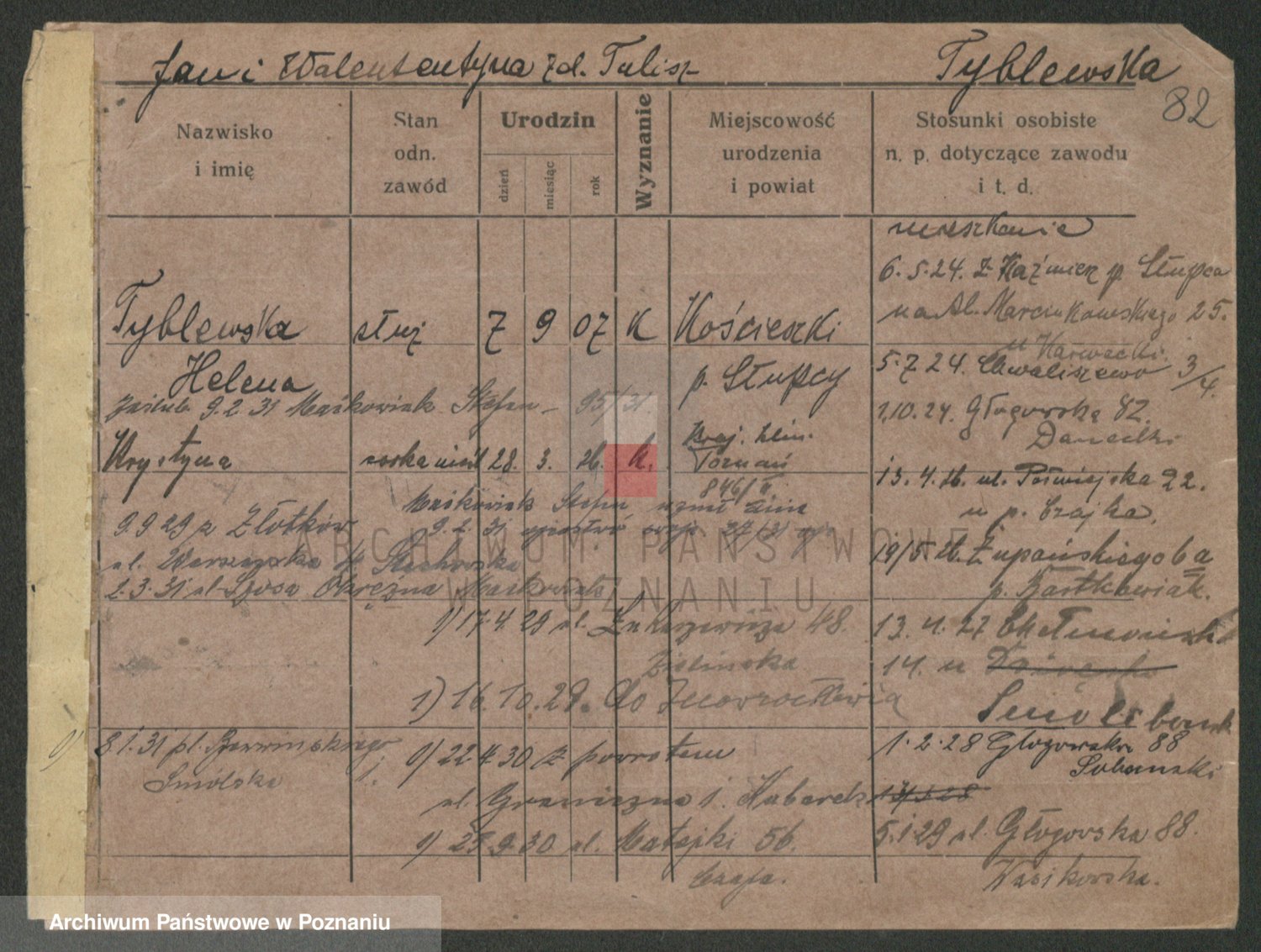 Podgląd karty osobowej dostępny jest po kliknięciu na nazwisko lub ikonkę karty. Można dokonywać powiększenia (ikony na górze) lub przechodzić między kolejnymi skanami (strzałki po bokach).