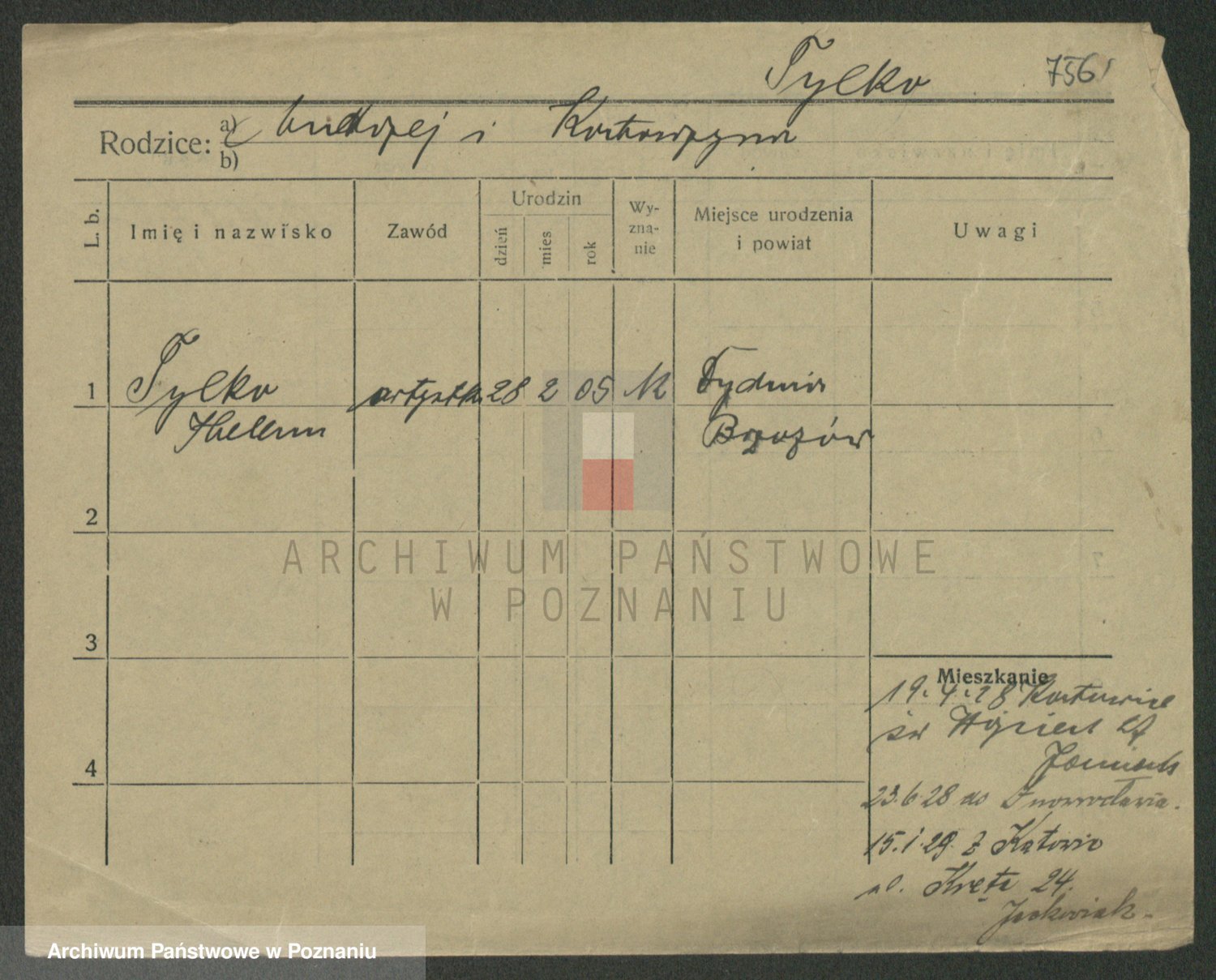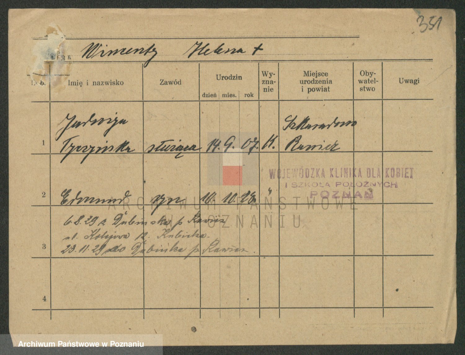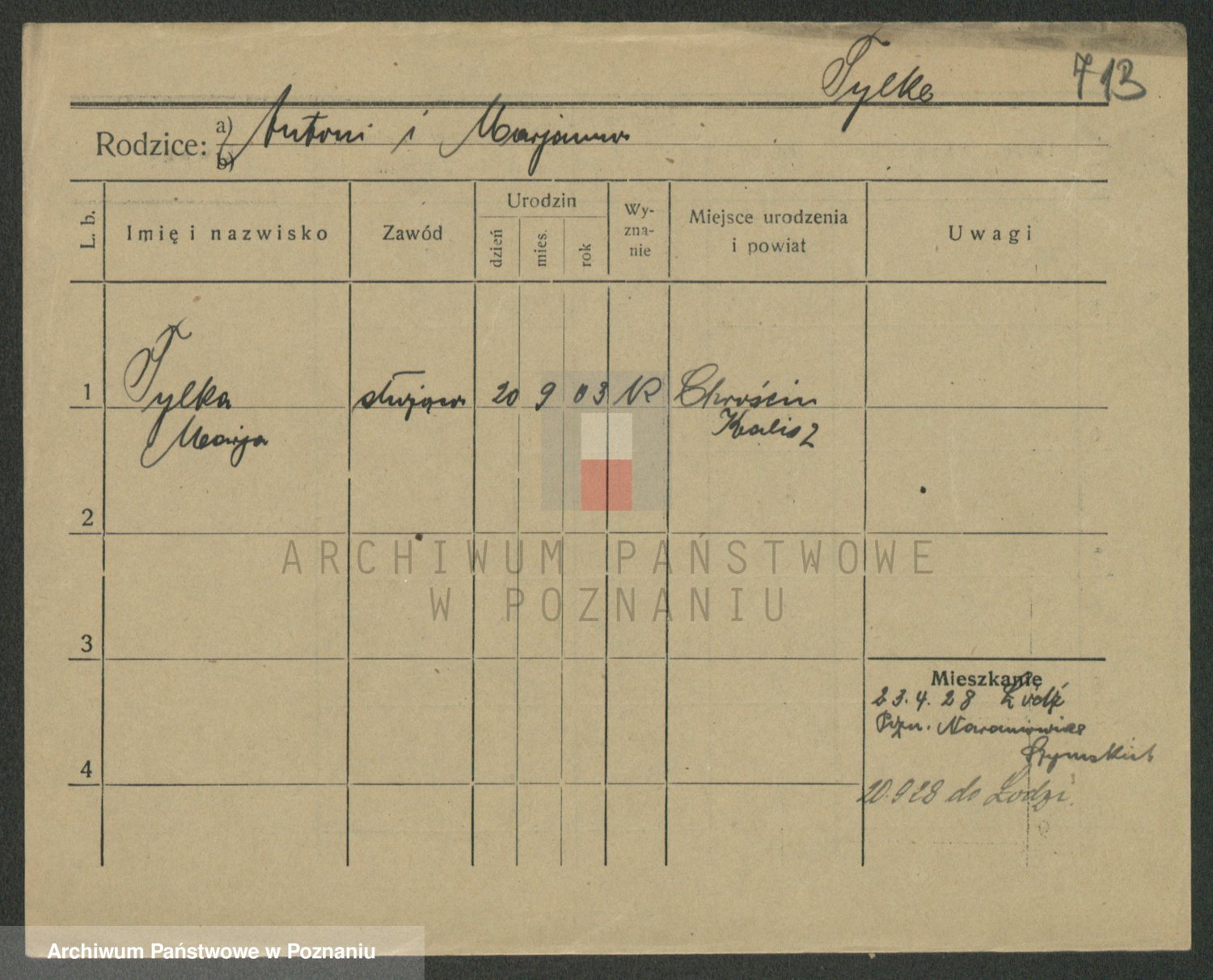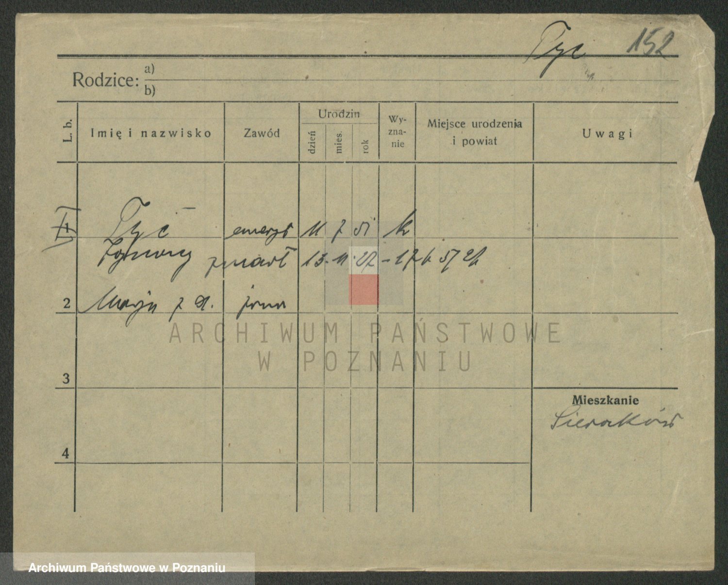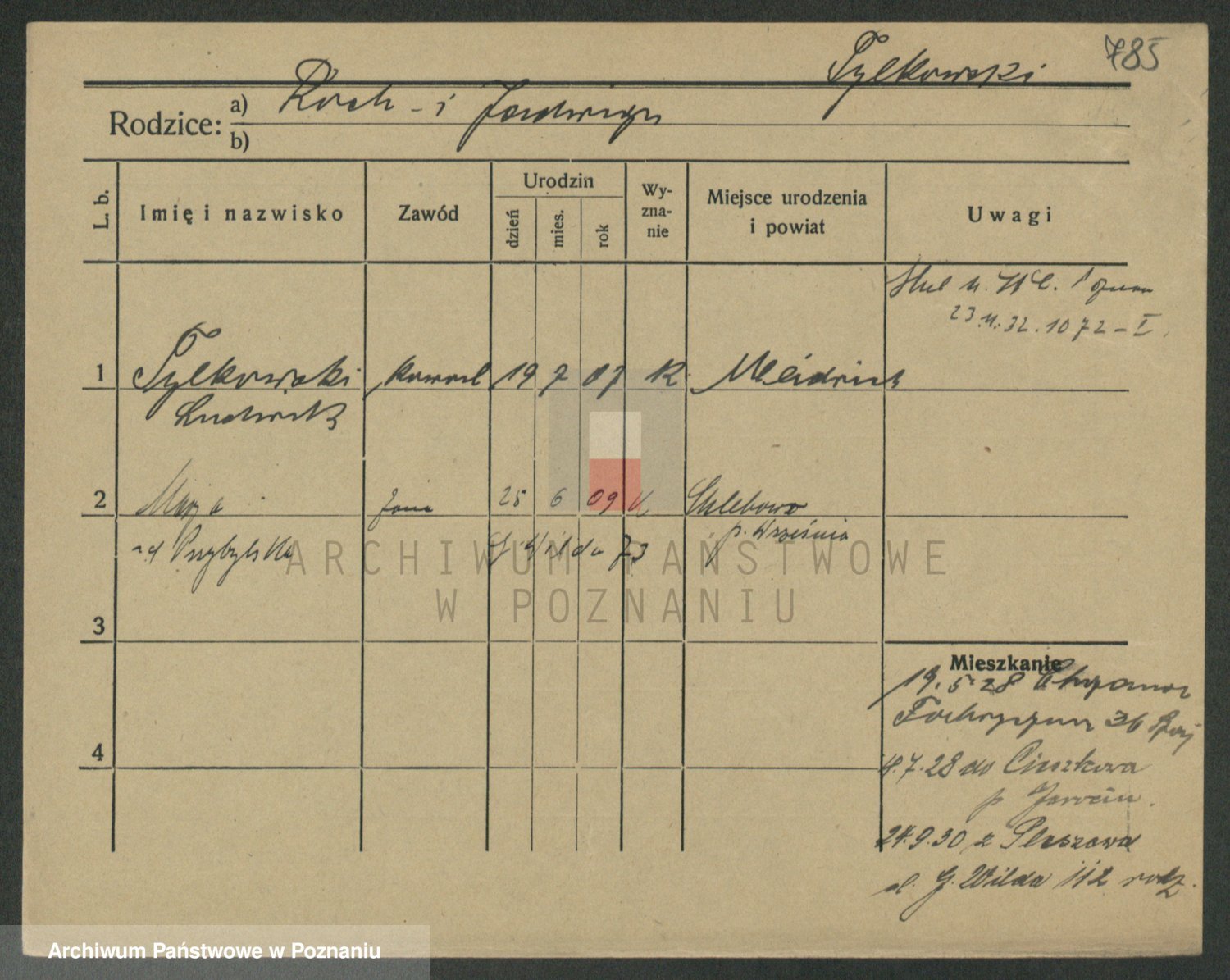 Podgląd karty osobowej dostępny jest po kliknięciu na nazwisko lub ikonkę karty. Można dokonywać powiększenia (ikony na górze) lub przechodzić między kolejnymi skanami (strzałki po bokach).