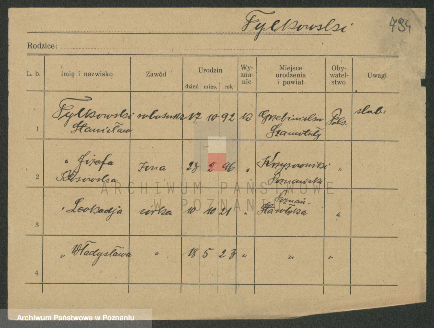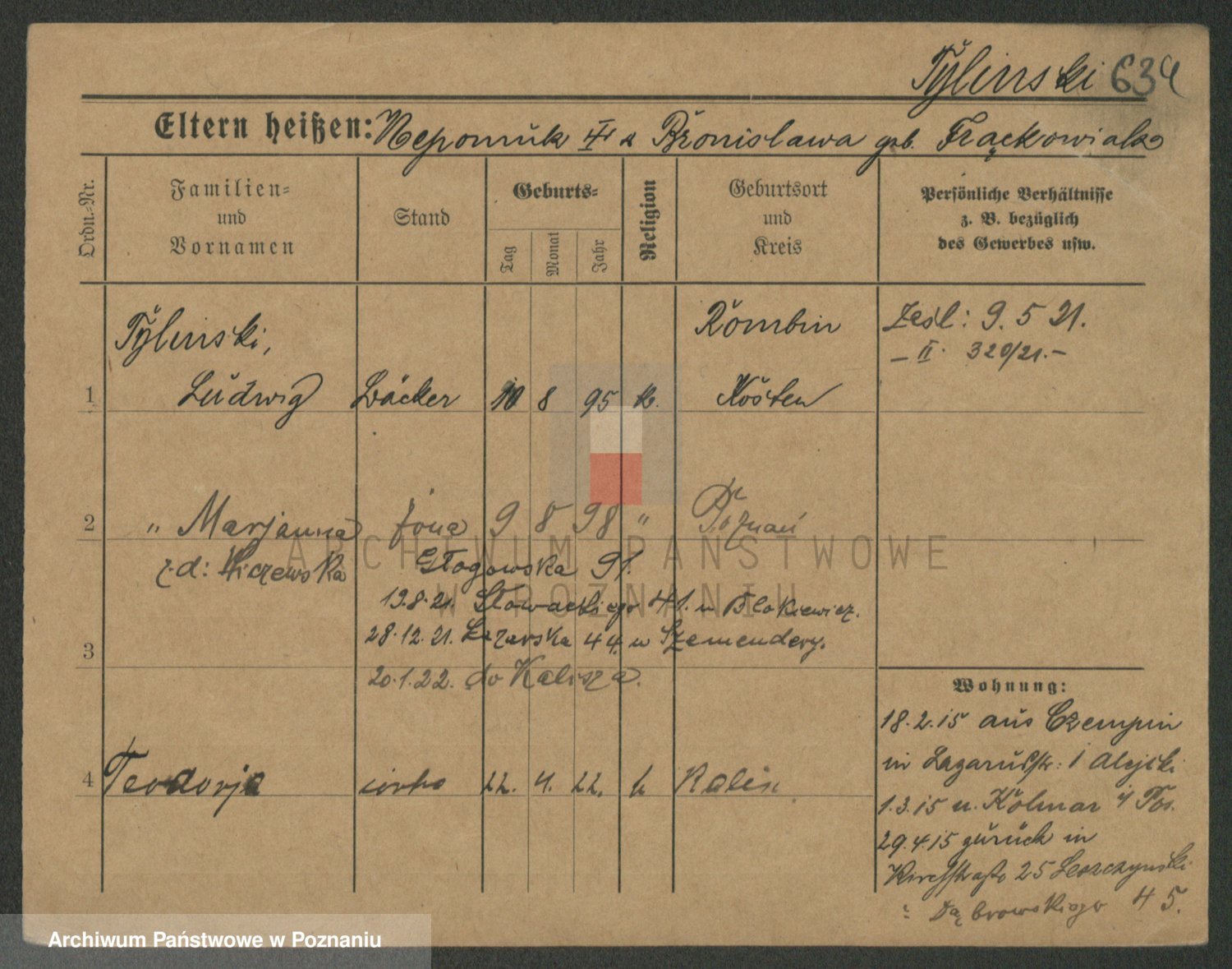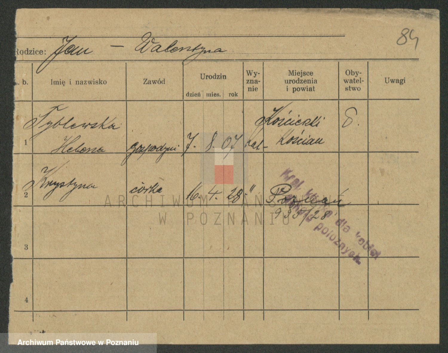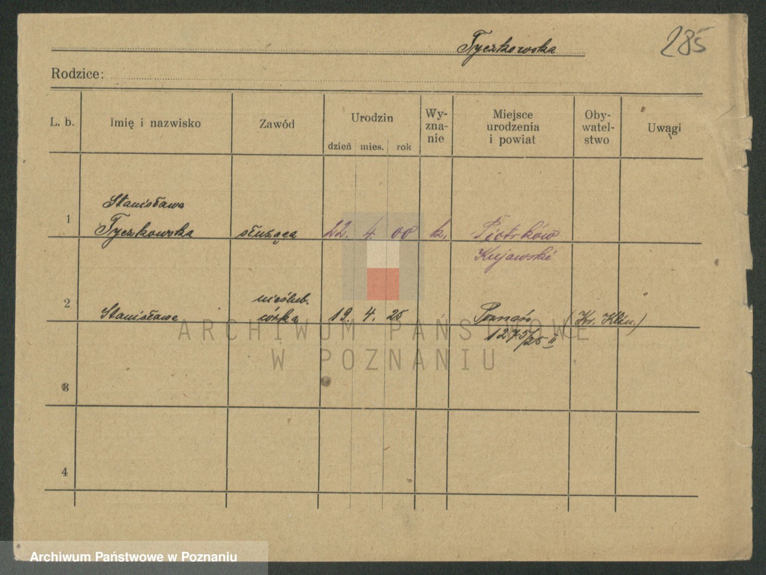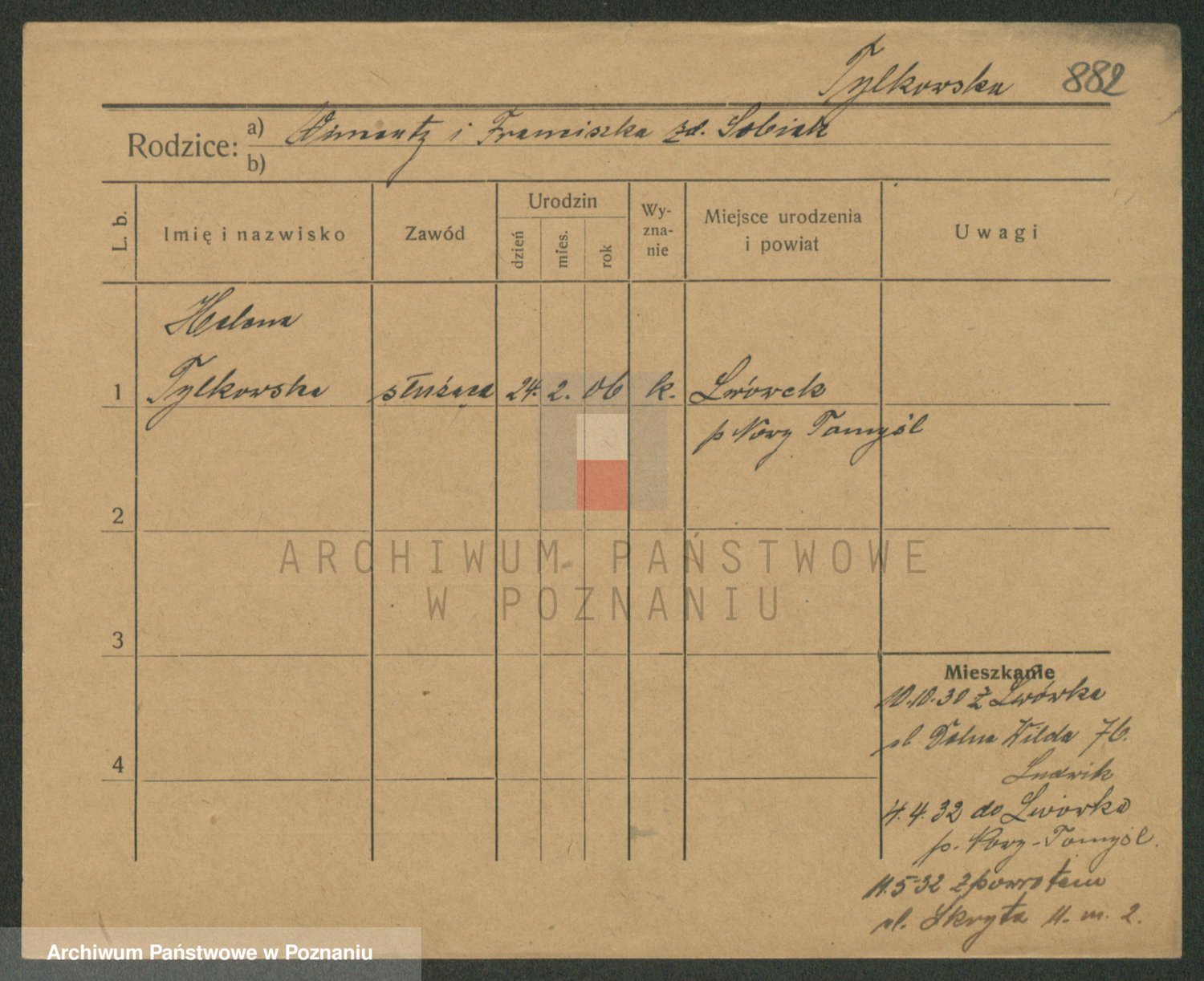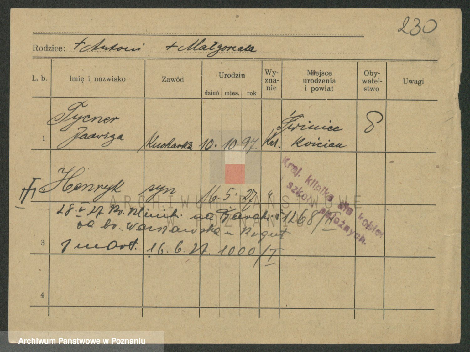 Podgląd karty osobowej dostępny jest po kliknięciu na nazwisko lub ikonkę karty. Można dokonywać powiększenia (ikony na górze) lub przechodzić między kolejnymi skanami (strzałki po bokach).