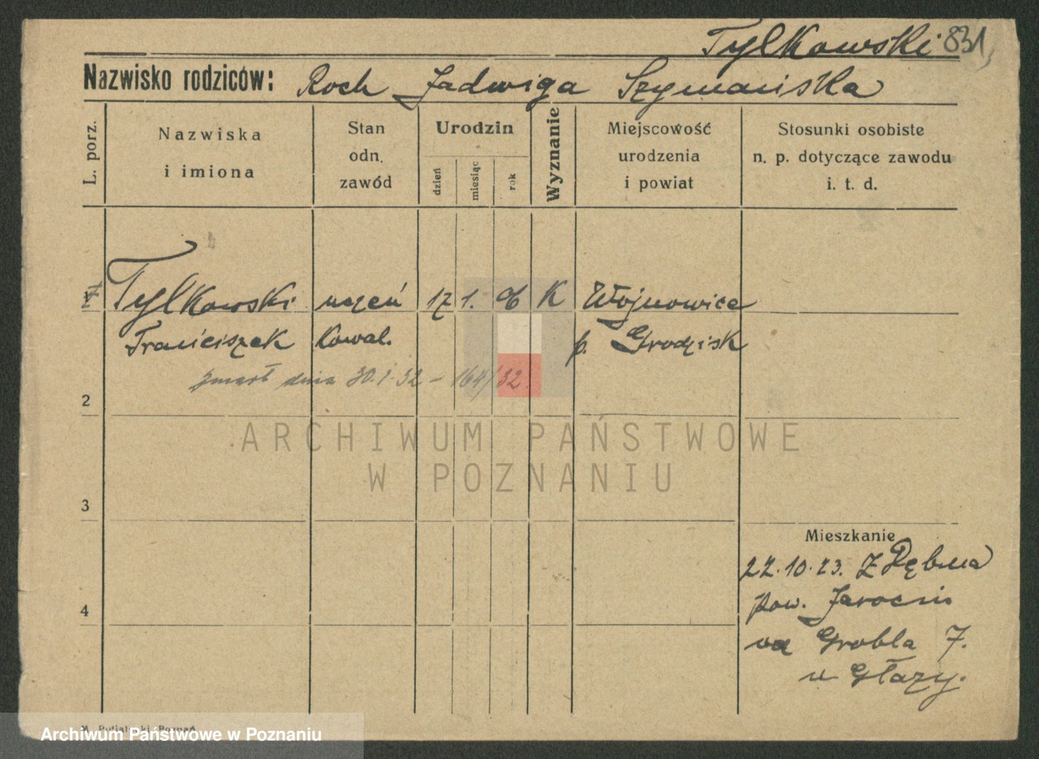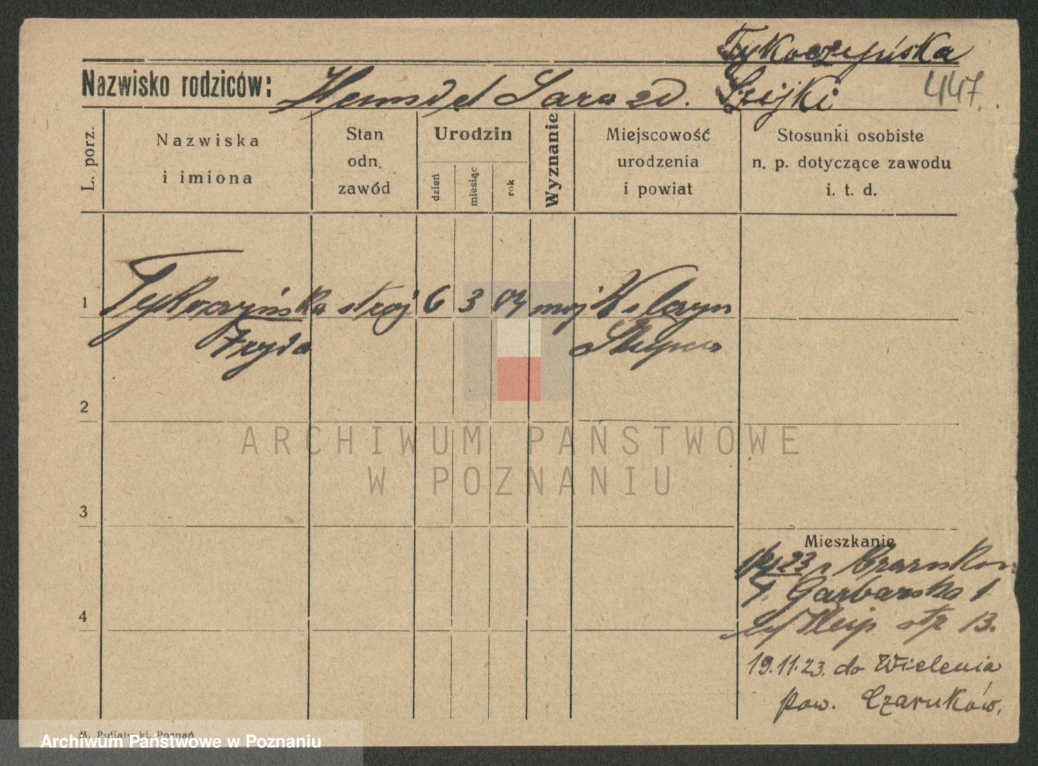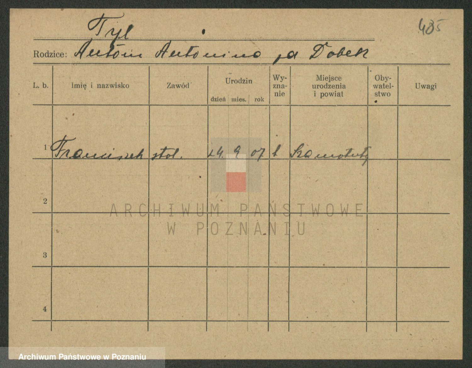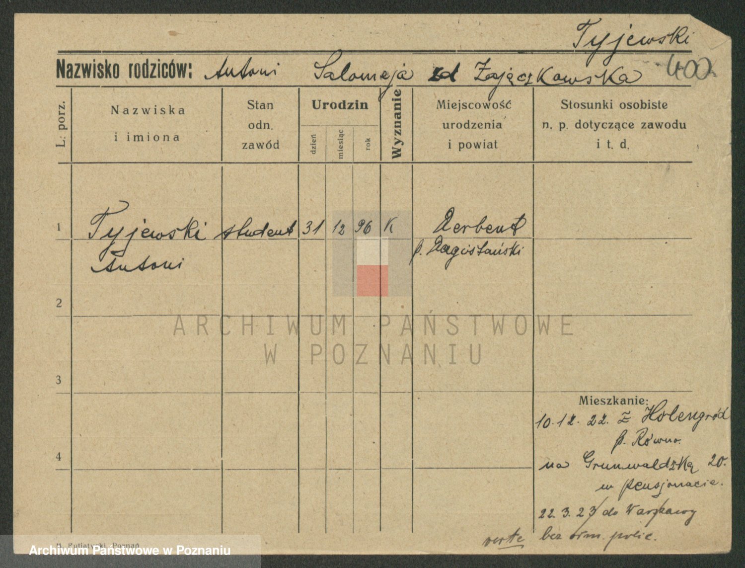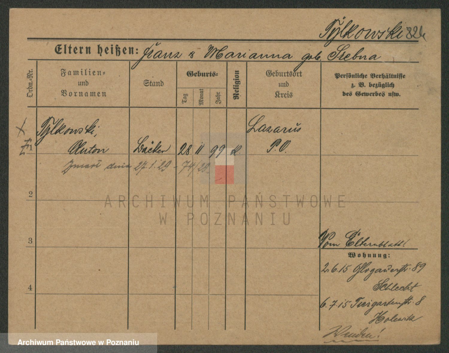 Podgląd karty osobowej dostępny jest po kliknięciu na nazwisko lub ikonkę karty. Można dokonywać powiększenia (ikony na górze) lub przechodzić między kolejnymi skanami (strzałki po bokach).