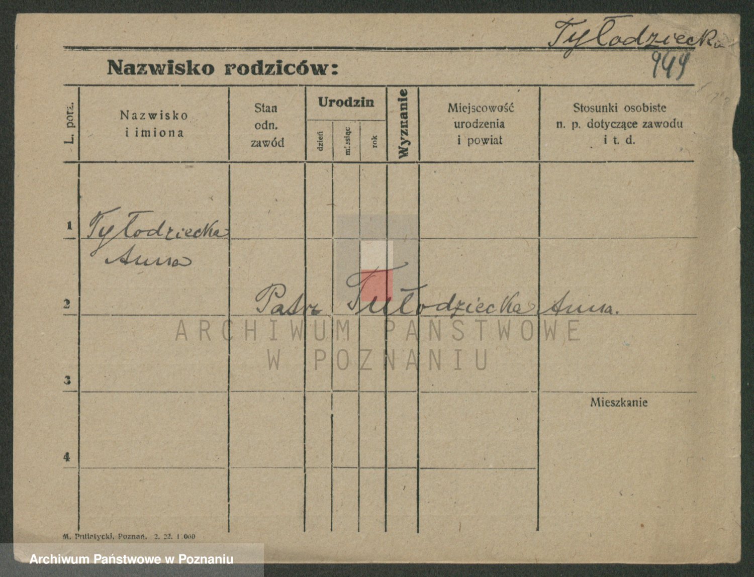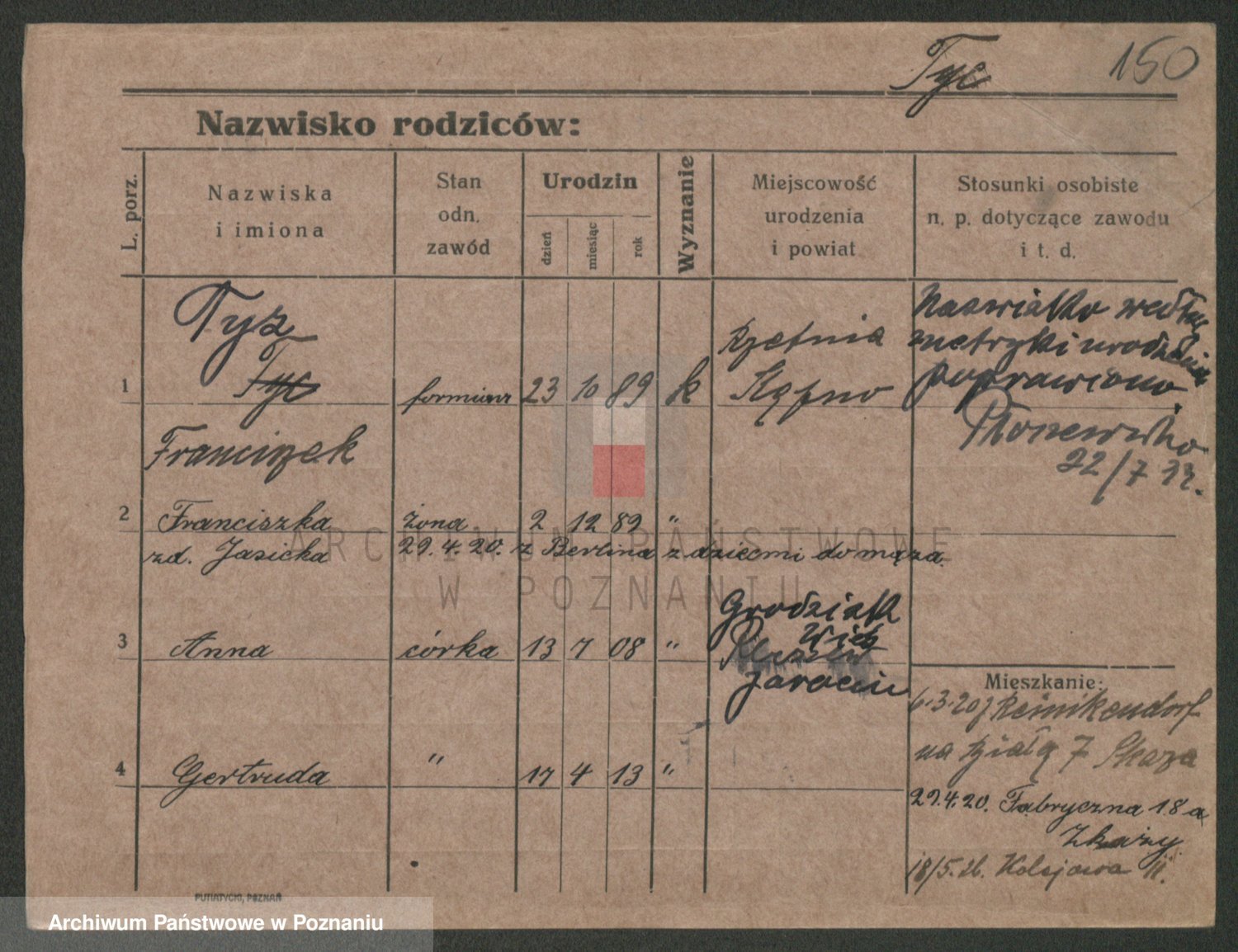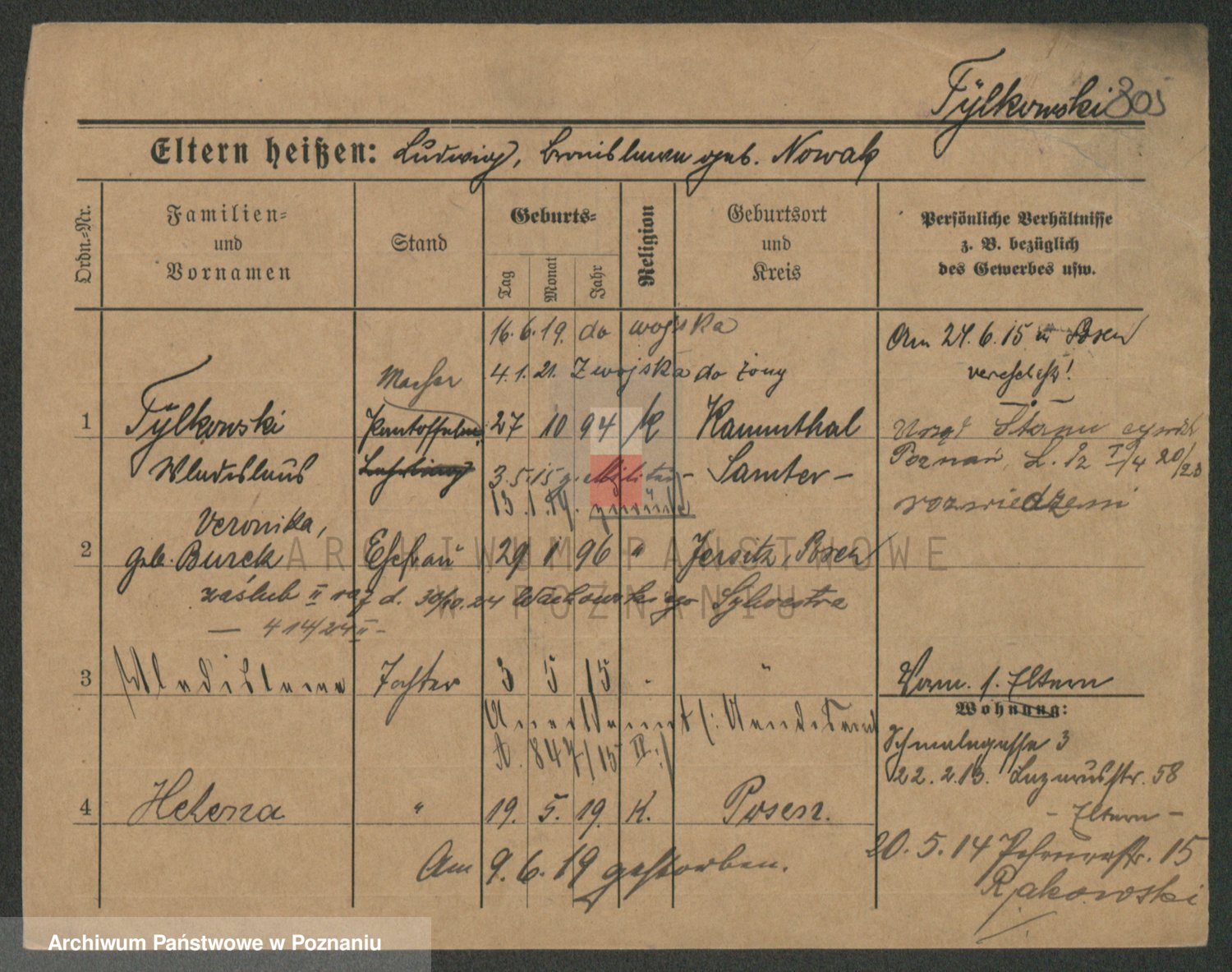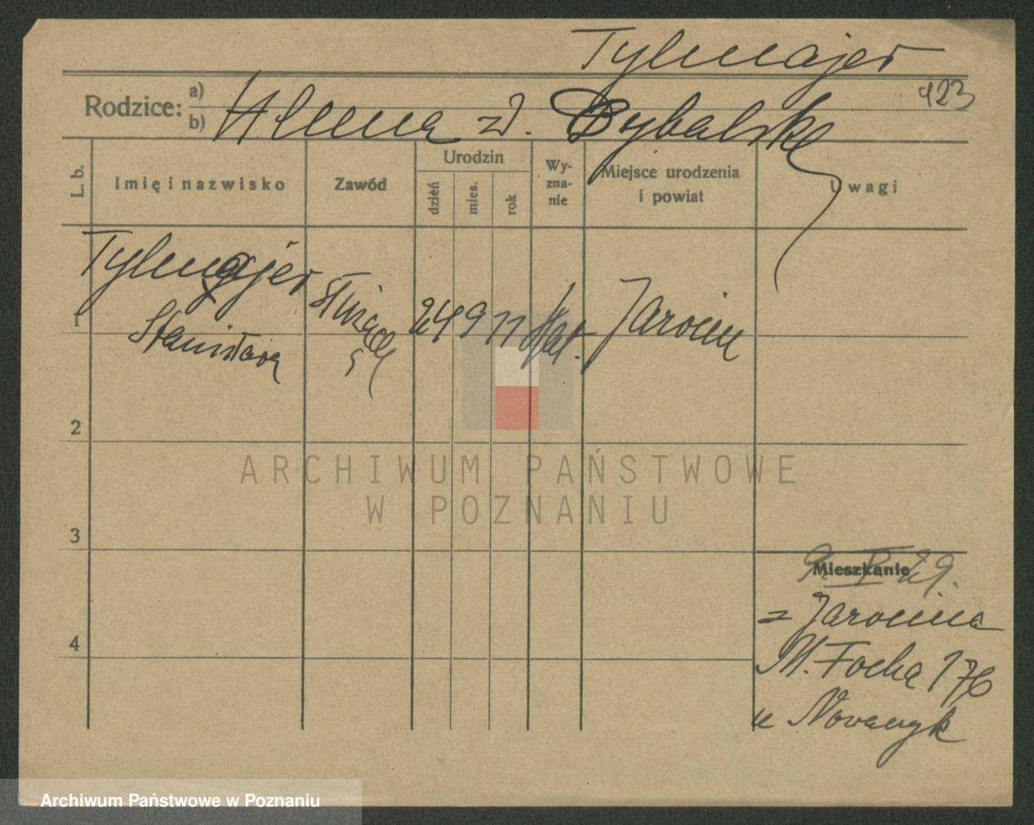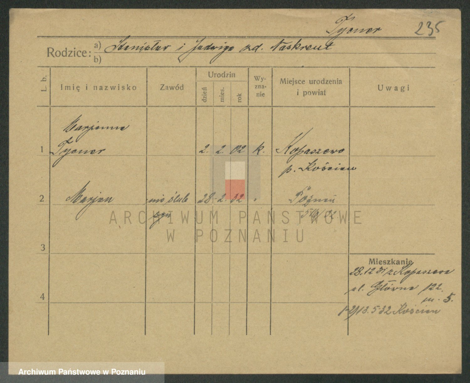 Podgląd karty osobowej dostępny jest po kliknięciu na nazwisko lub ikonkę karty. Można dokonywać powiększenia (ikony na górze) lub przechodzić między kolejnymi skanami (strzałki po bokach).