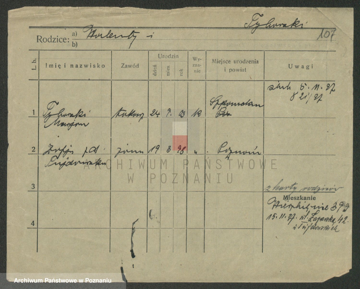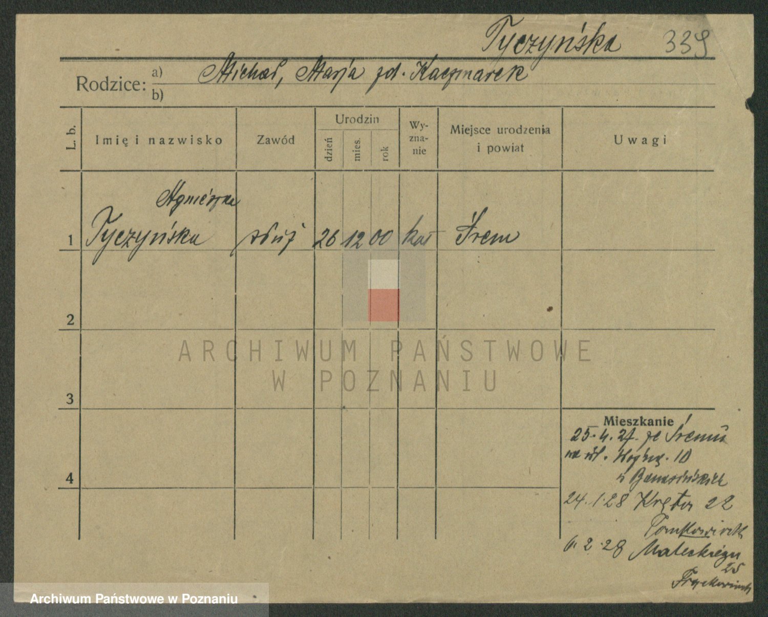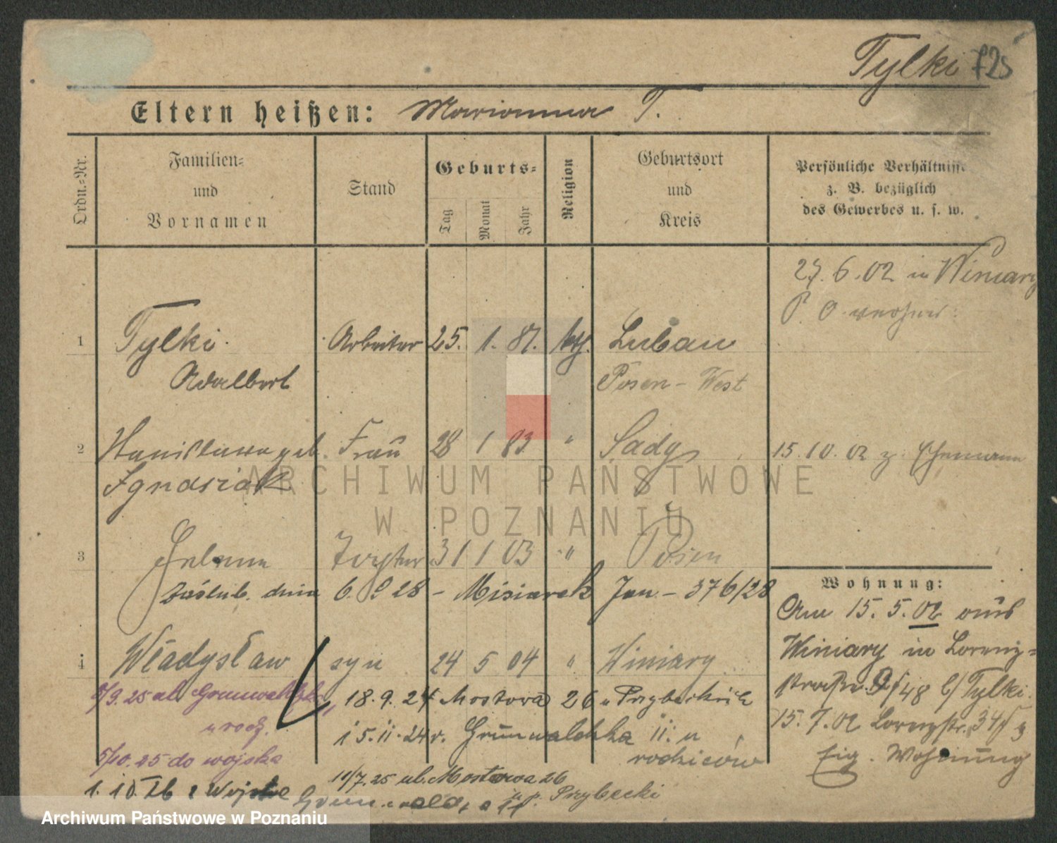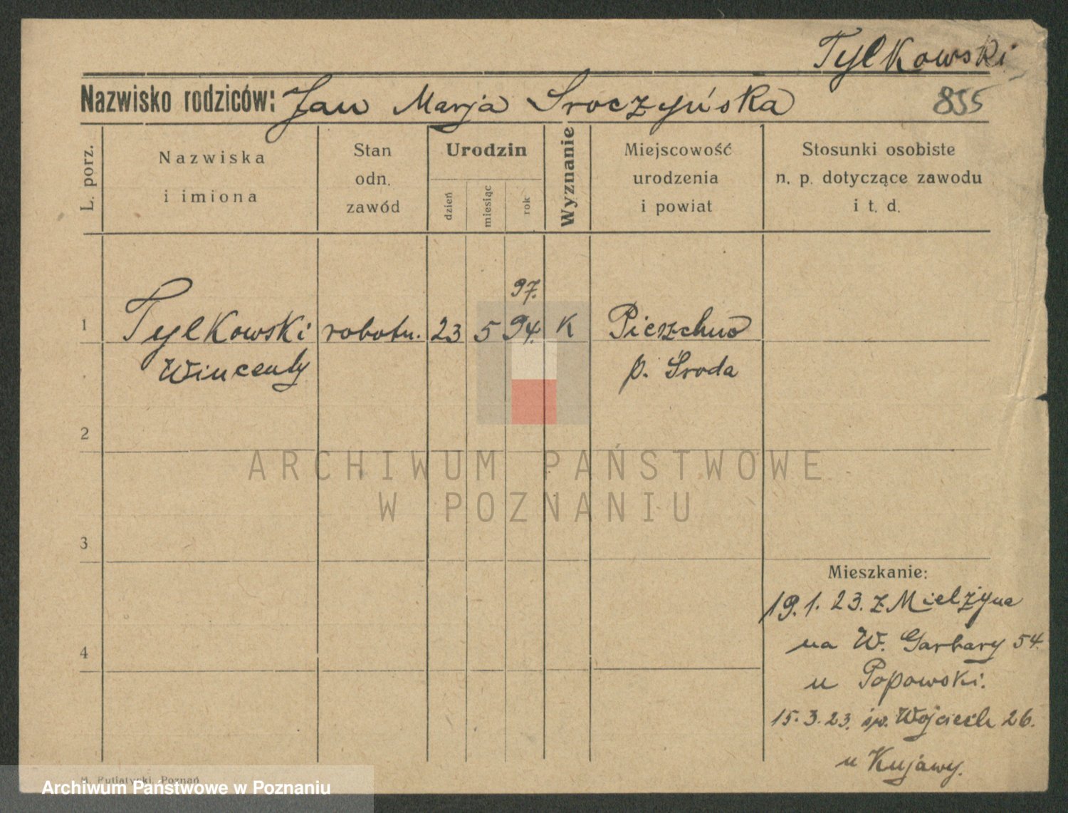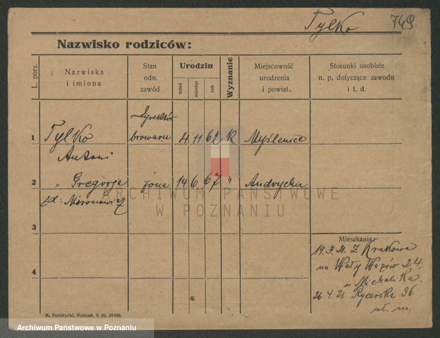 Podgląd karty osobowej dostępny jest po kliknięciu na nazwisko lub ikonkę karty. Można dokonywać powiększenia (ikony na górze) lub przechodzić między kolejnymi skanami (strzałki po bokach).