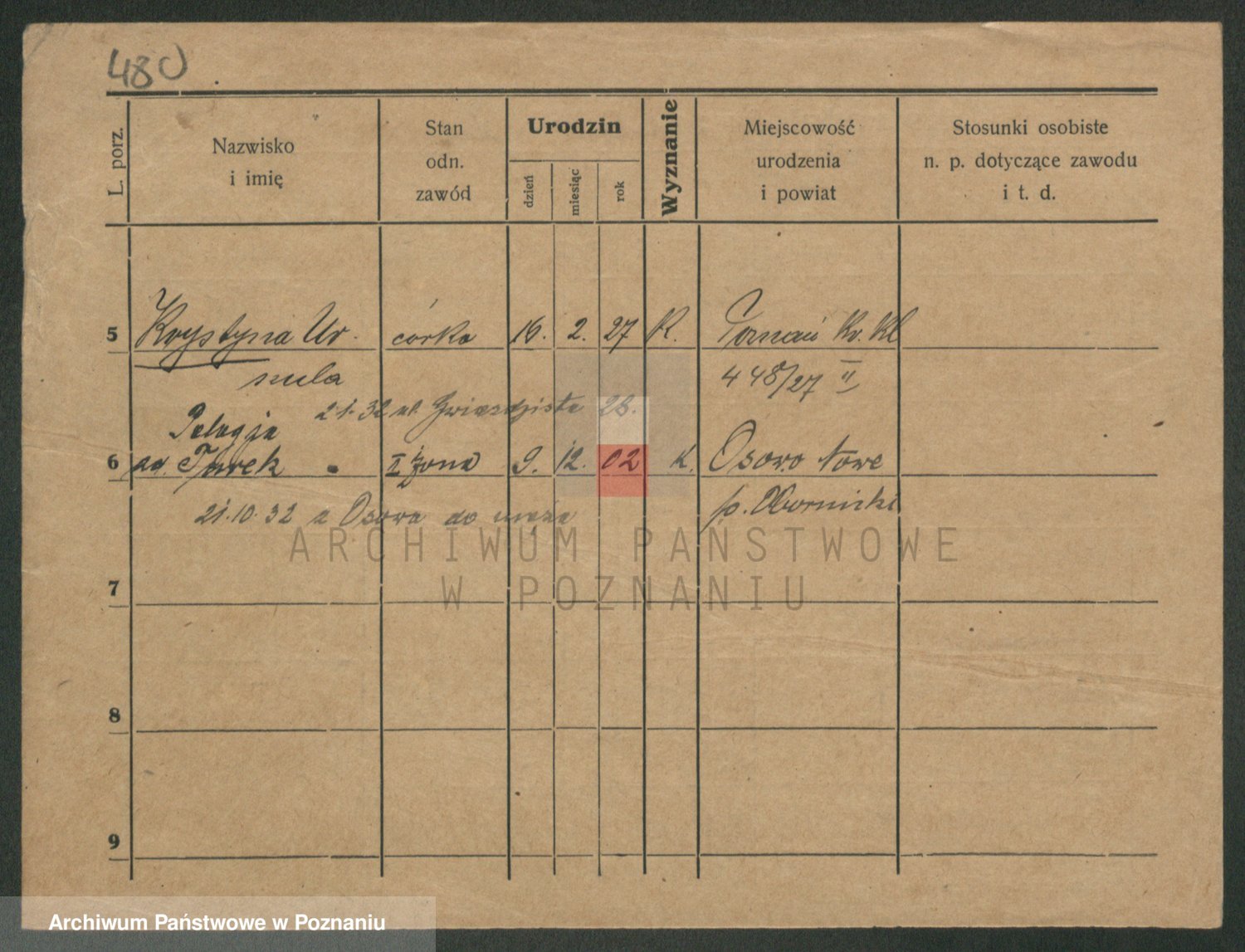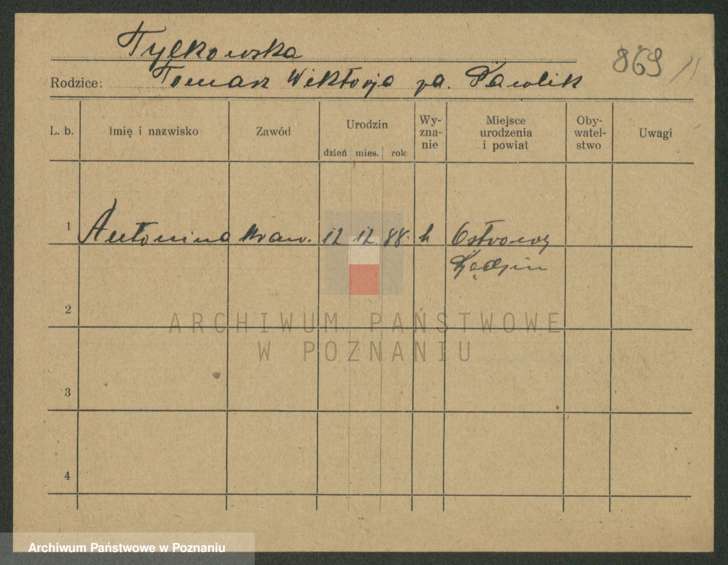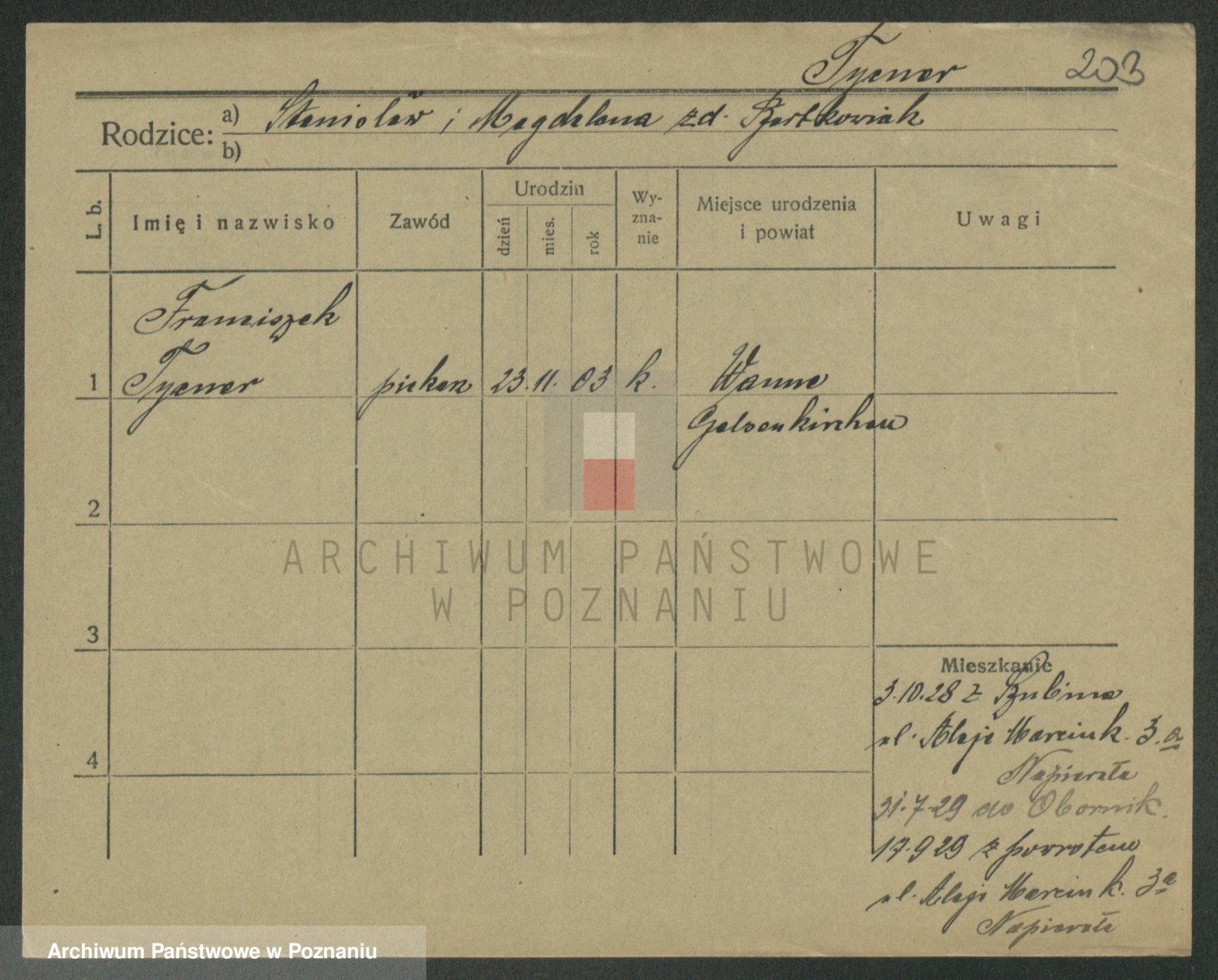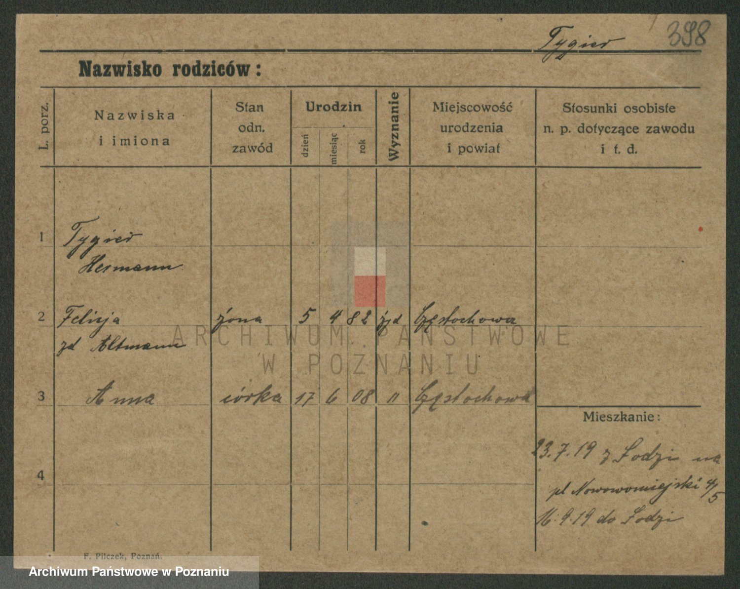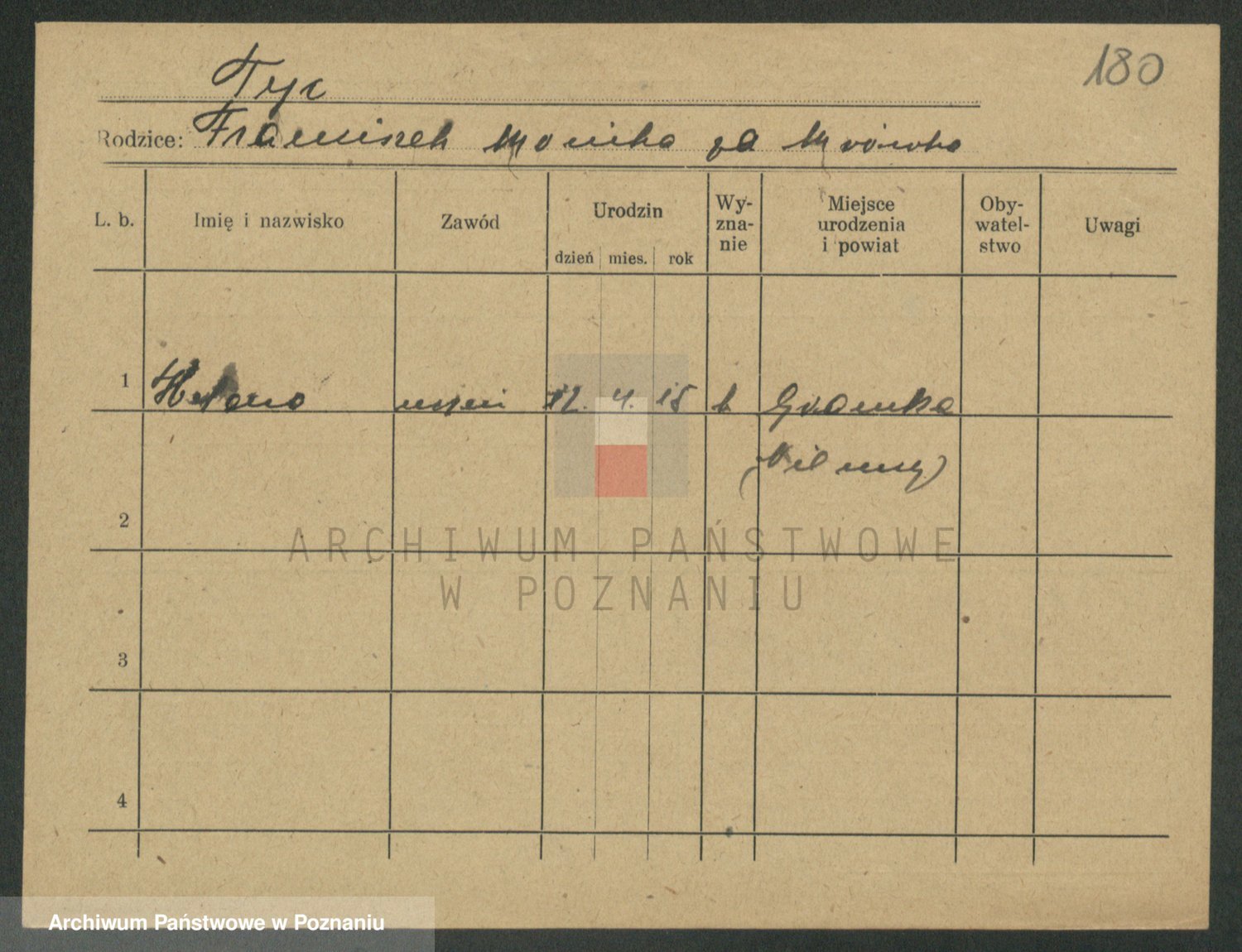 Podgląd karty osobowej dostępny jest po kliknięciu na nazwisko lub ikonkę karty. Można dokonywać powiększenia (ikony na górze) lub przechodzić między kolejnymi skanami (strzałki po bokach).