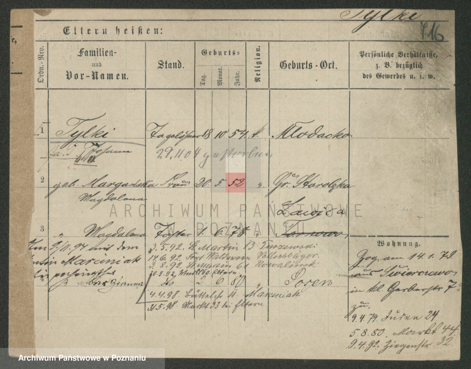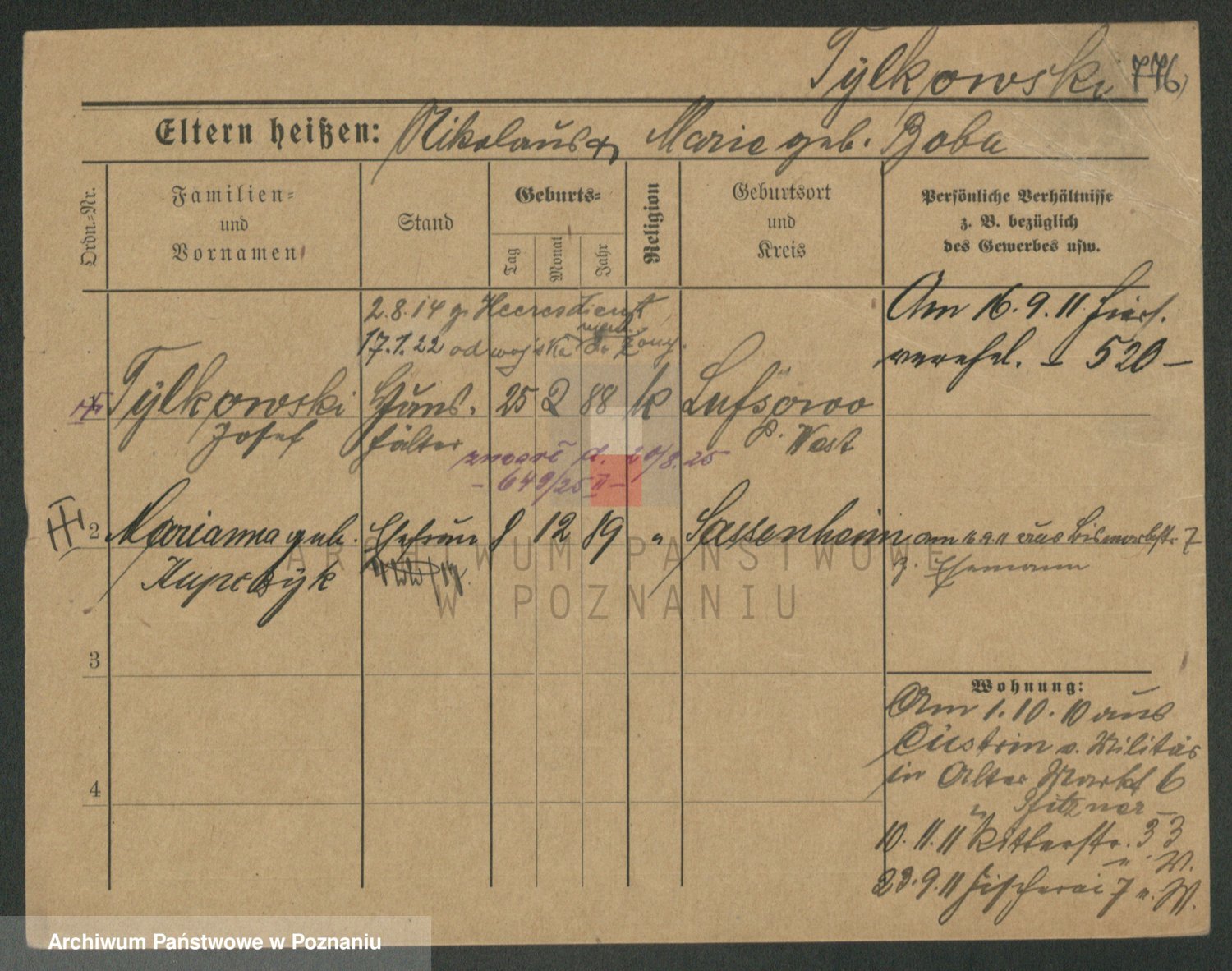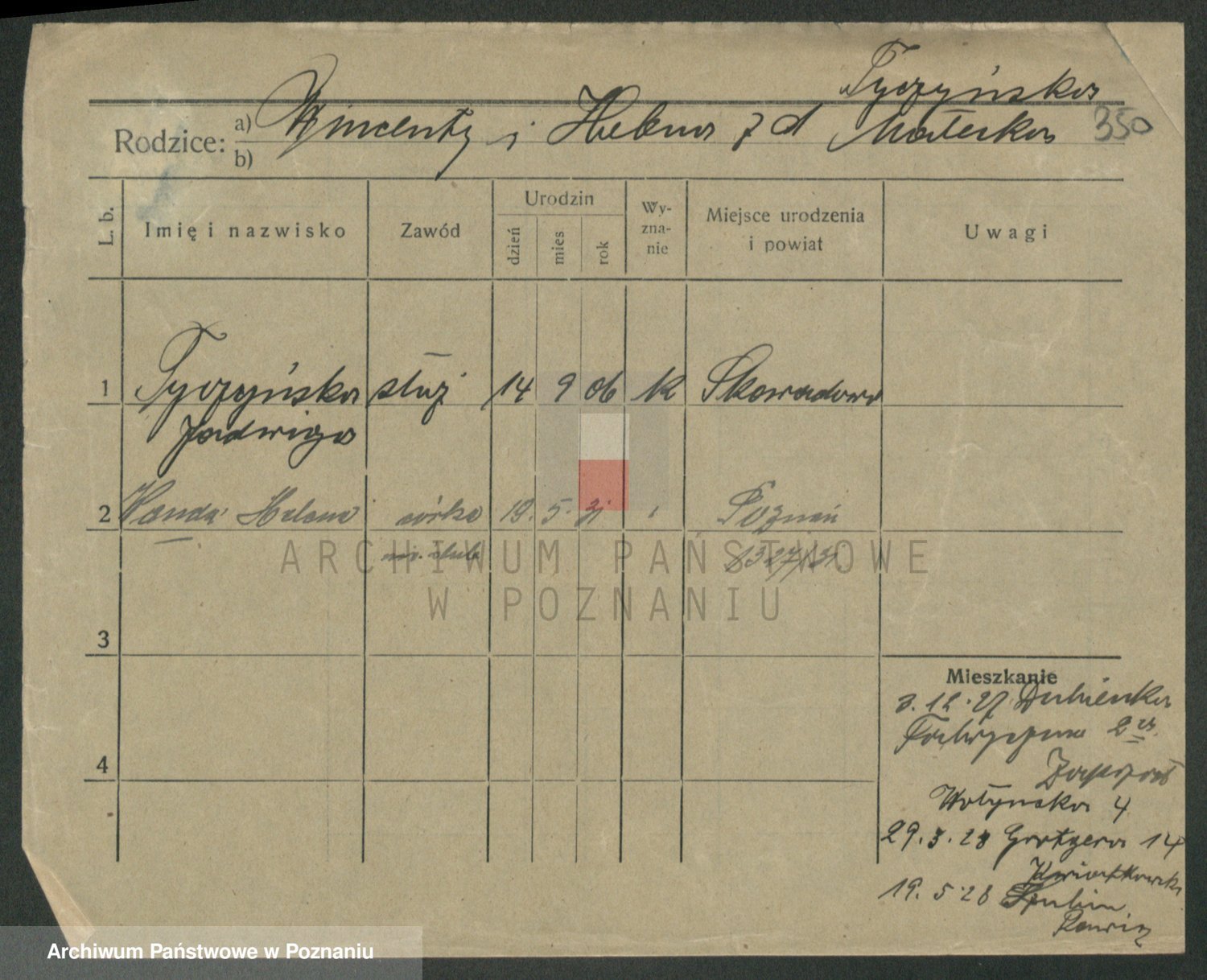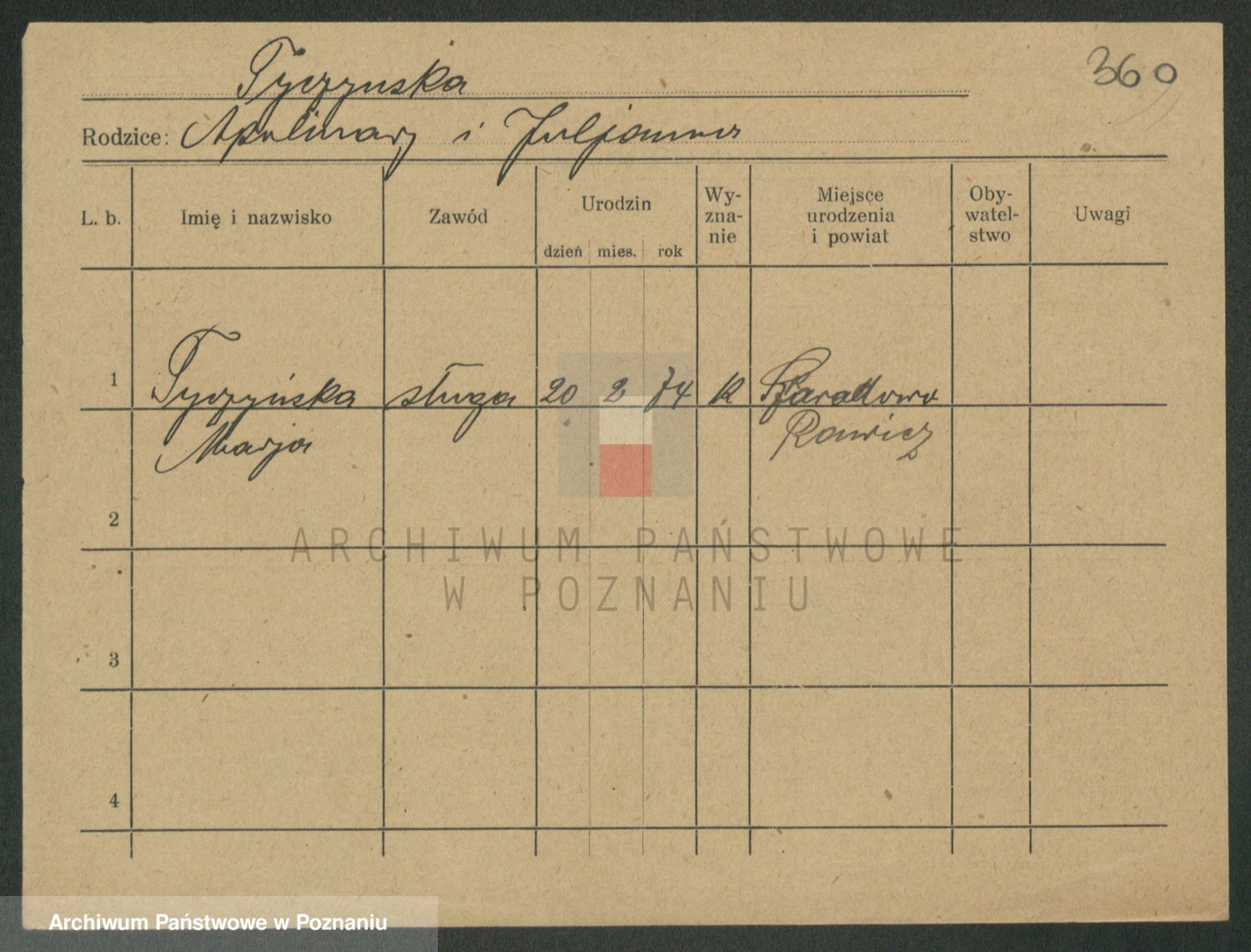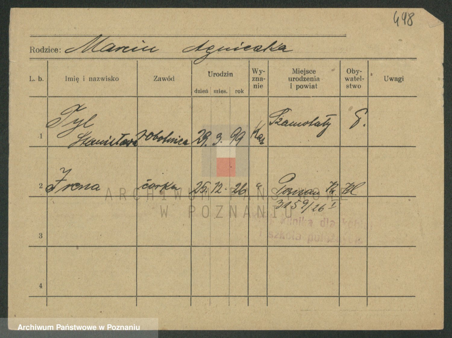 Podgląd karty osobowej dostępny jest po kliknięciu na nazwisko lub ikonkę karty. Można dokonywać powiększenia (ikony na górze) lub przechodzić między kolejnymi skanami (strzałki po bokach).