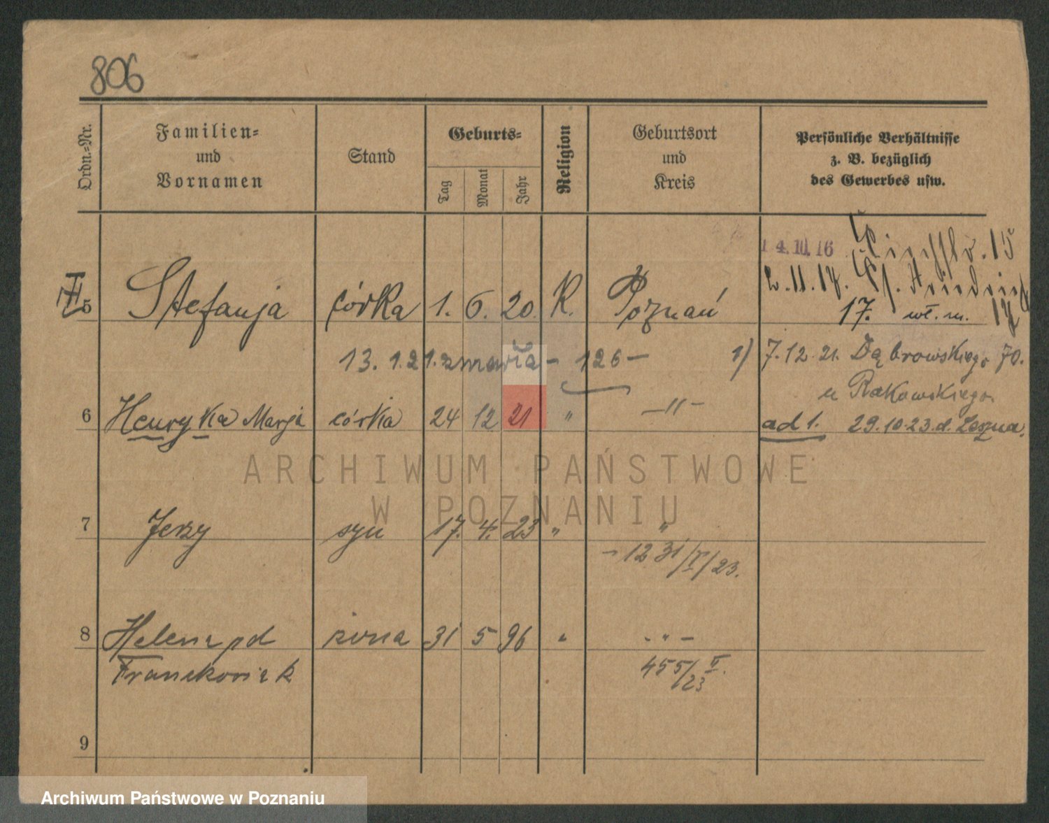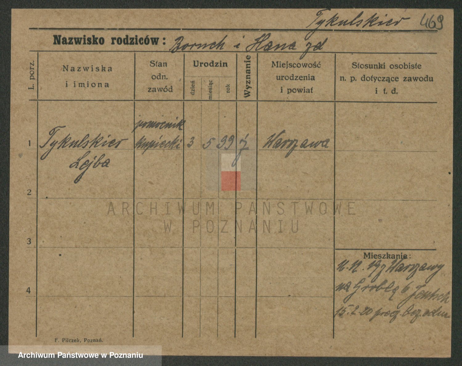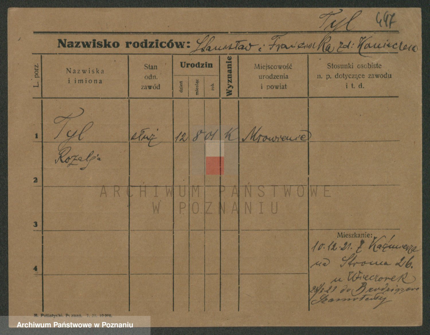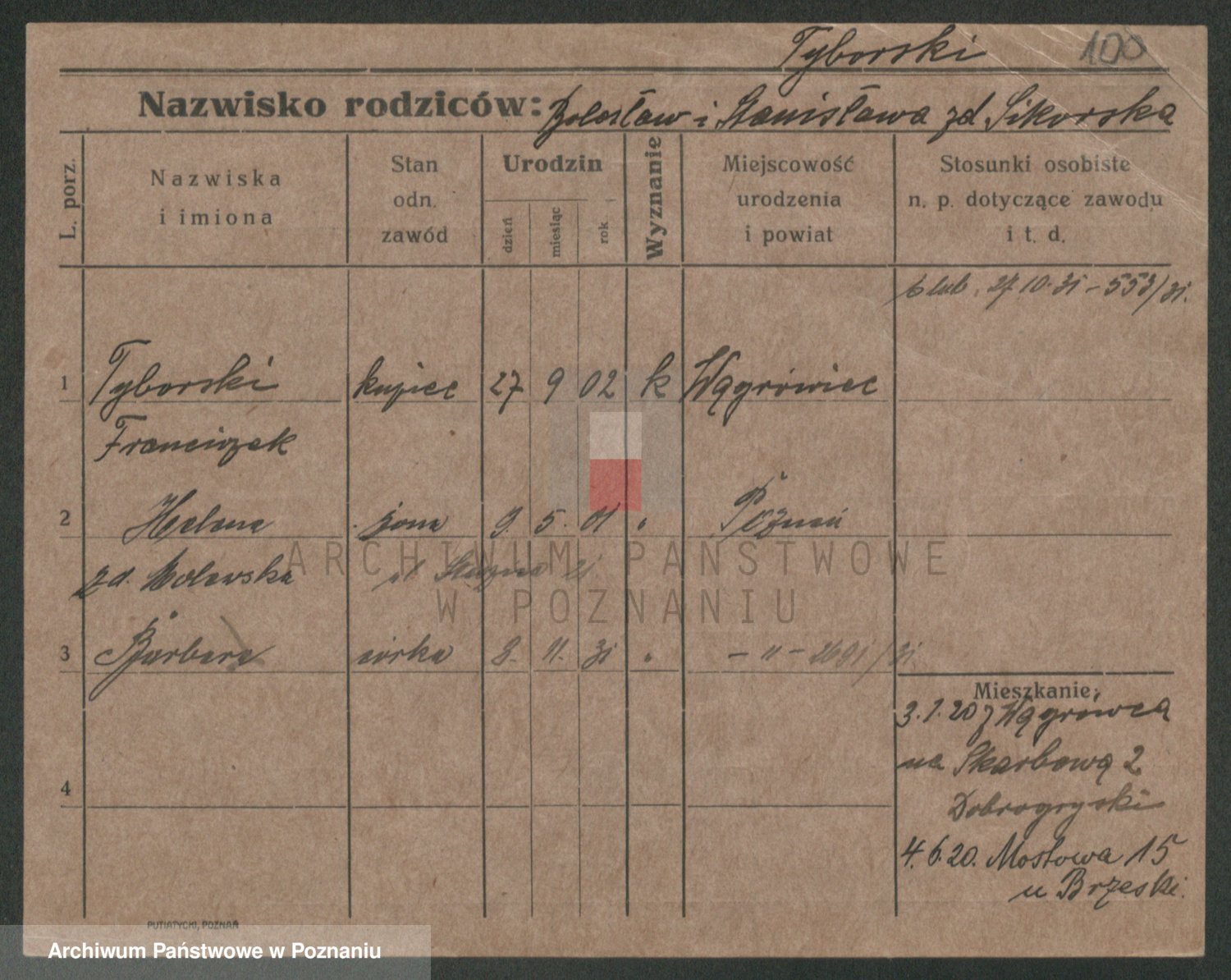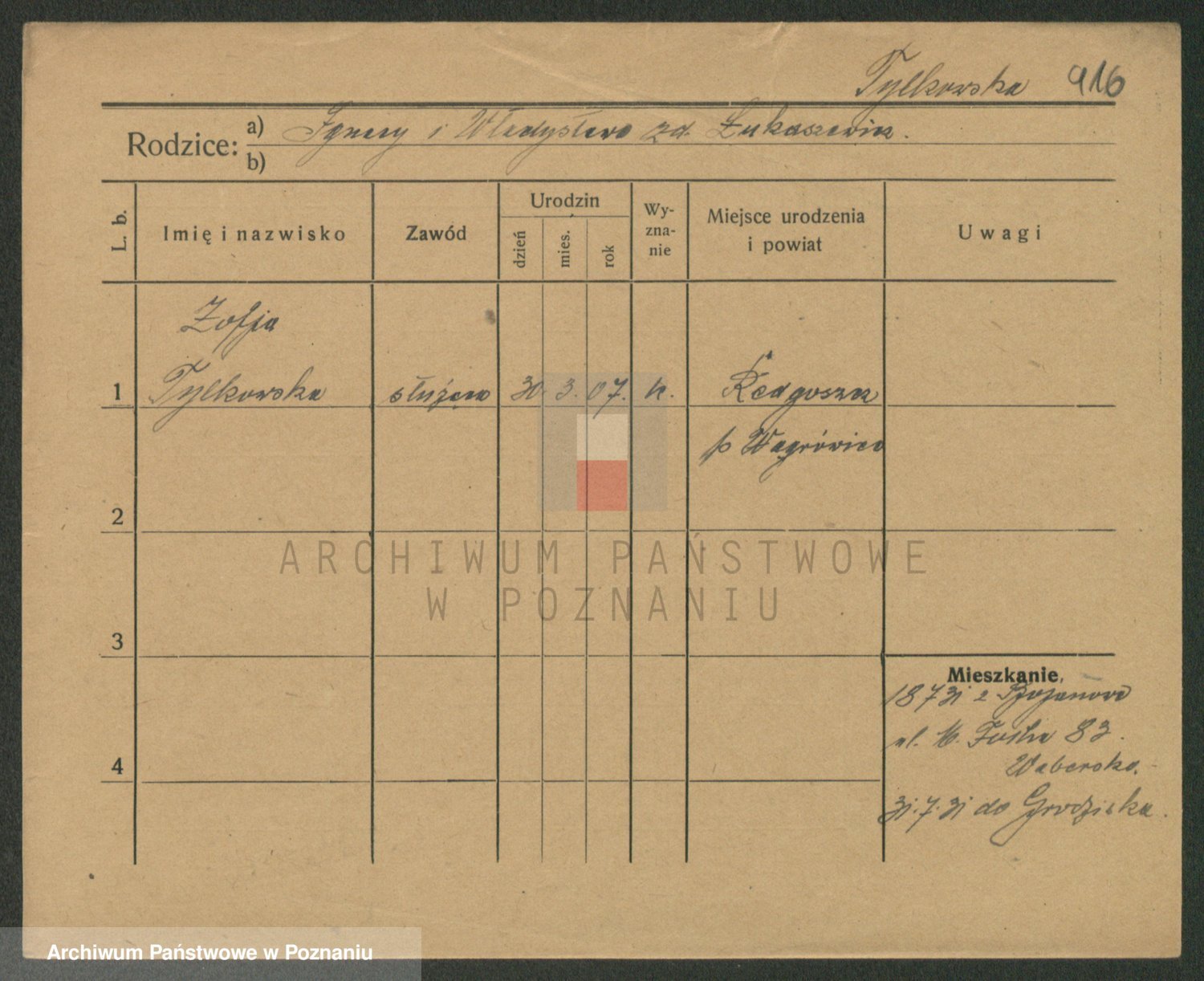 Podgląd karty osobowej dostępny jest po kliknięciu na nazwisko lub ikonkę karty. Można dokonywać powiększenia (ikony na górze) lub przechodzić między kolejnymi skanami (strzałki po bokach).