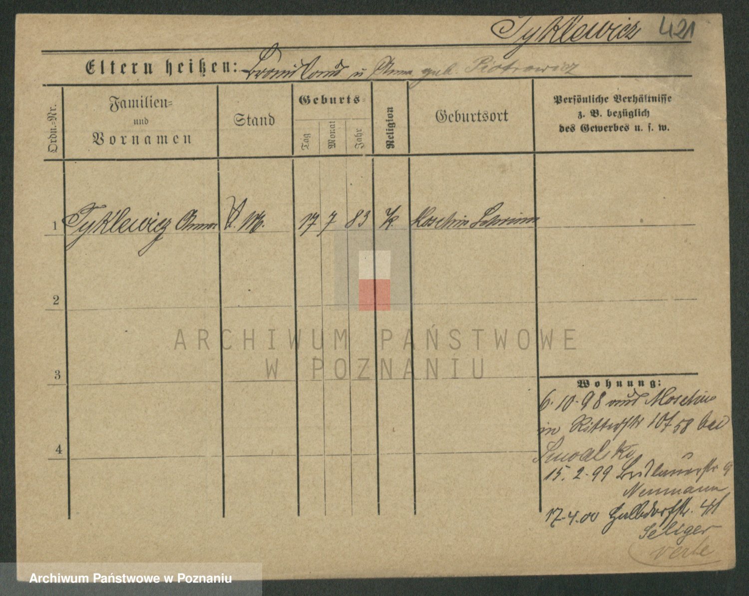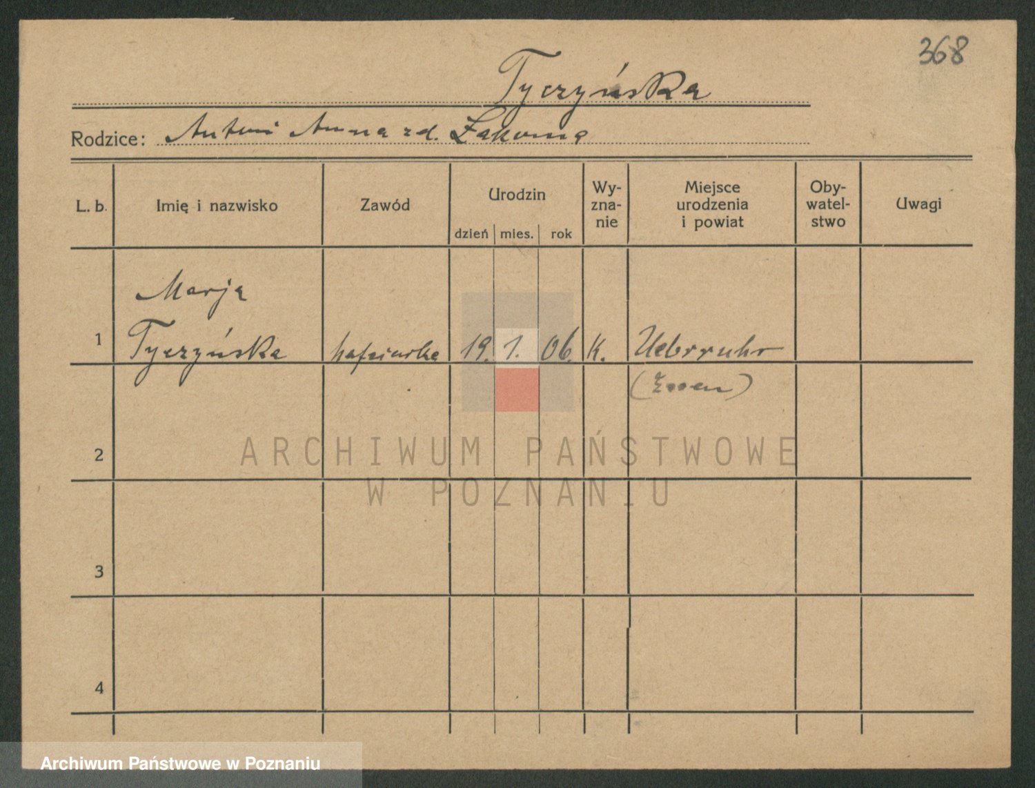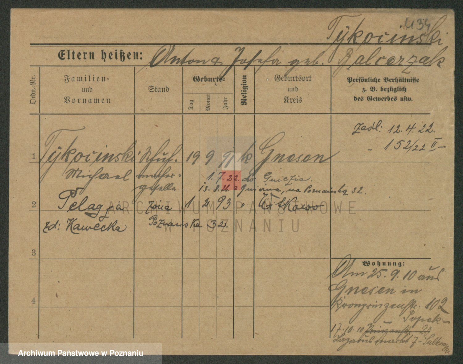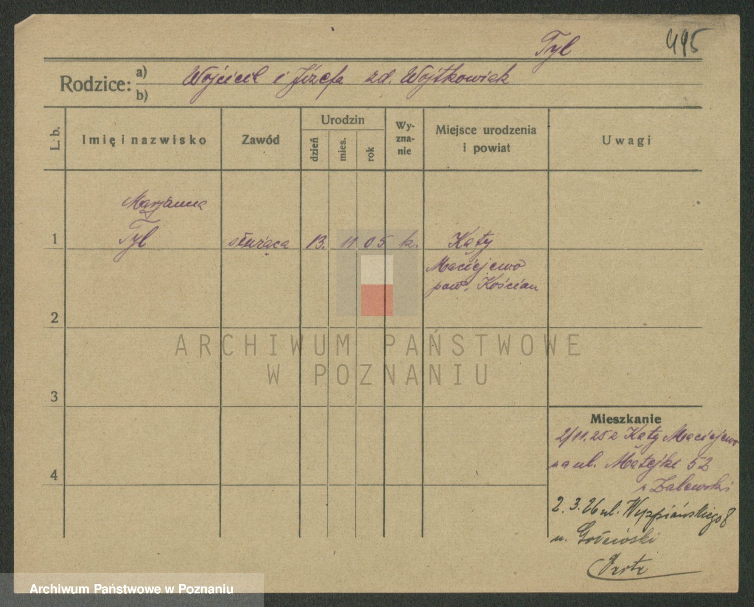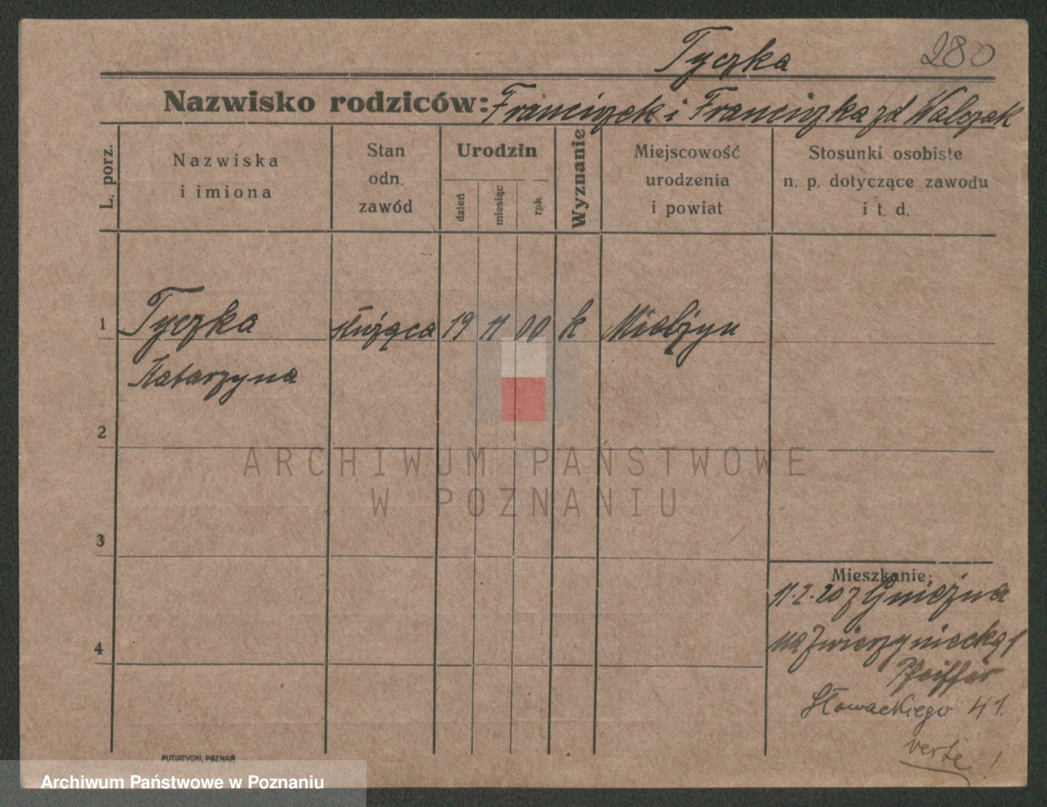Podgląd karty osobowej dostępny jest po kliknięciu na nazwisko lub ikonkę karty. Można dokonywać powiększenia (ikony na górze) lub przechodzić między kolejnymi skanami (strzałki po bokach).