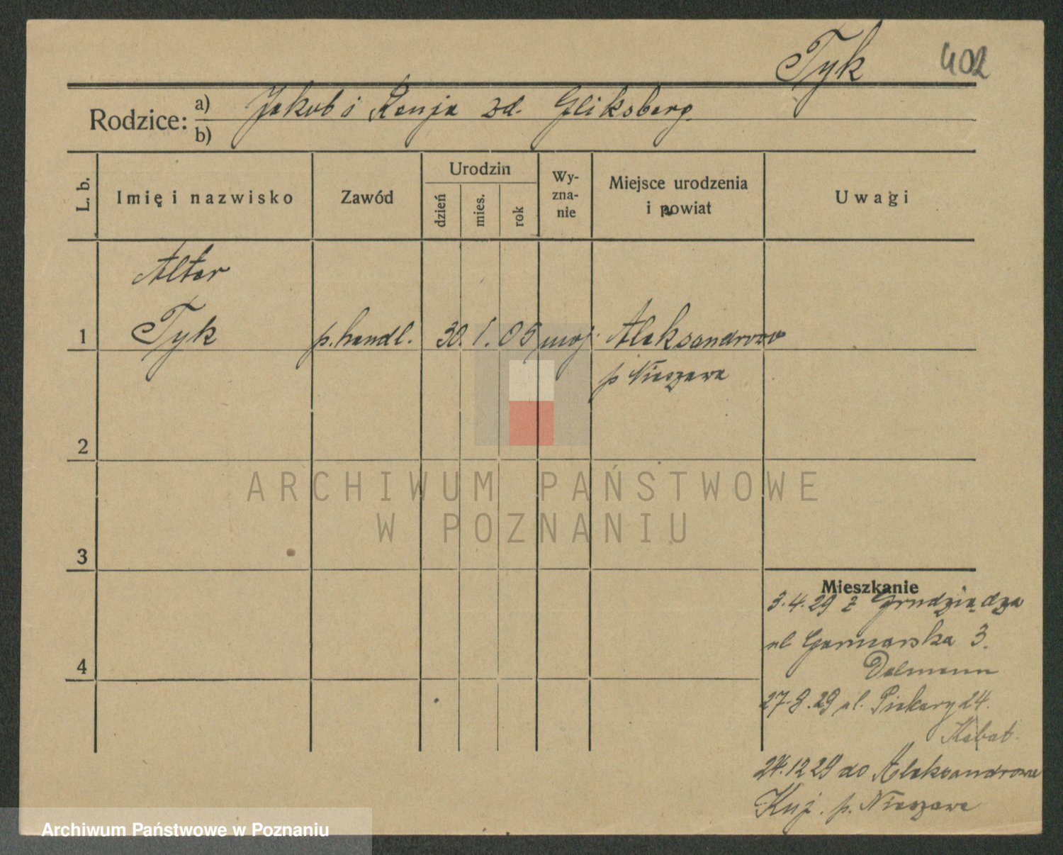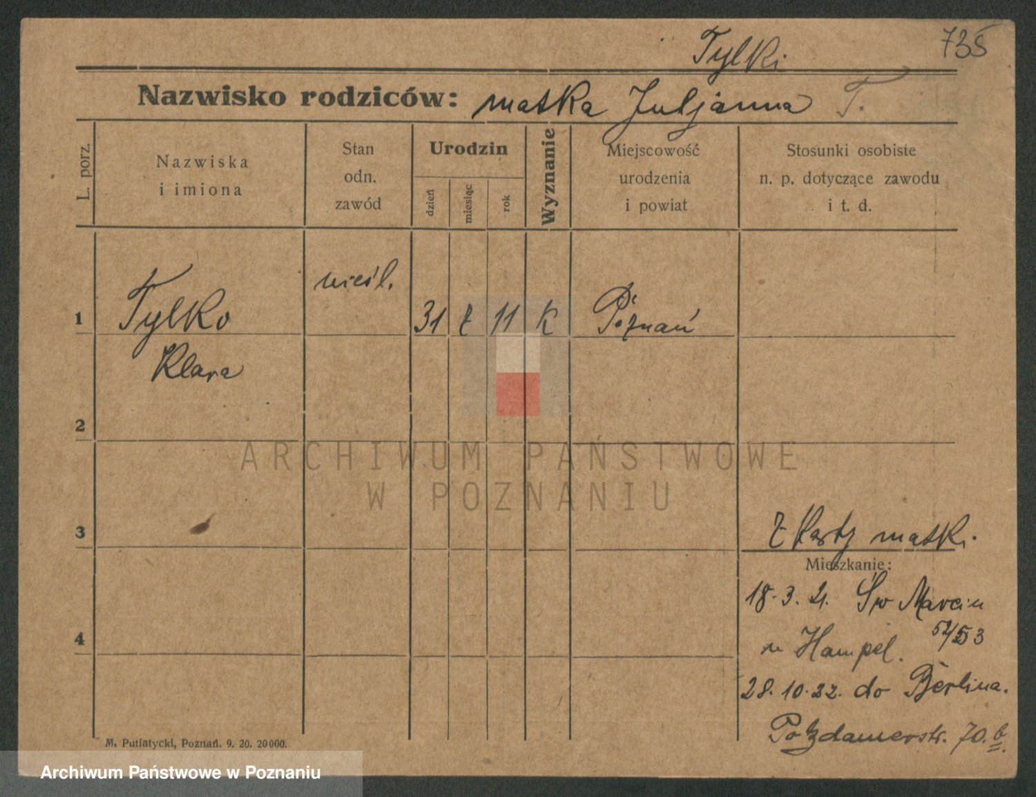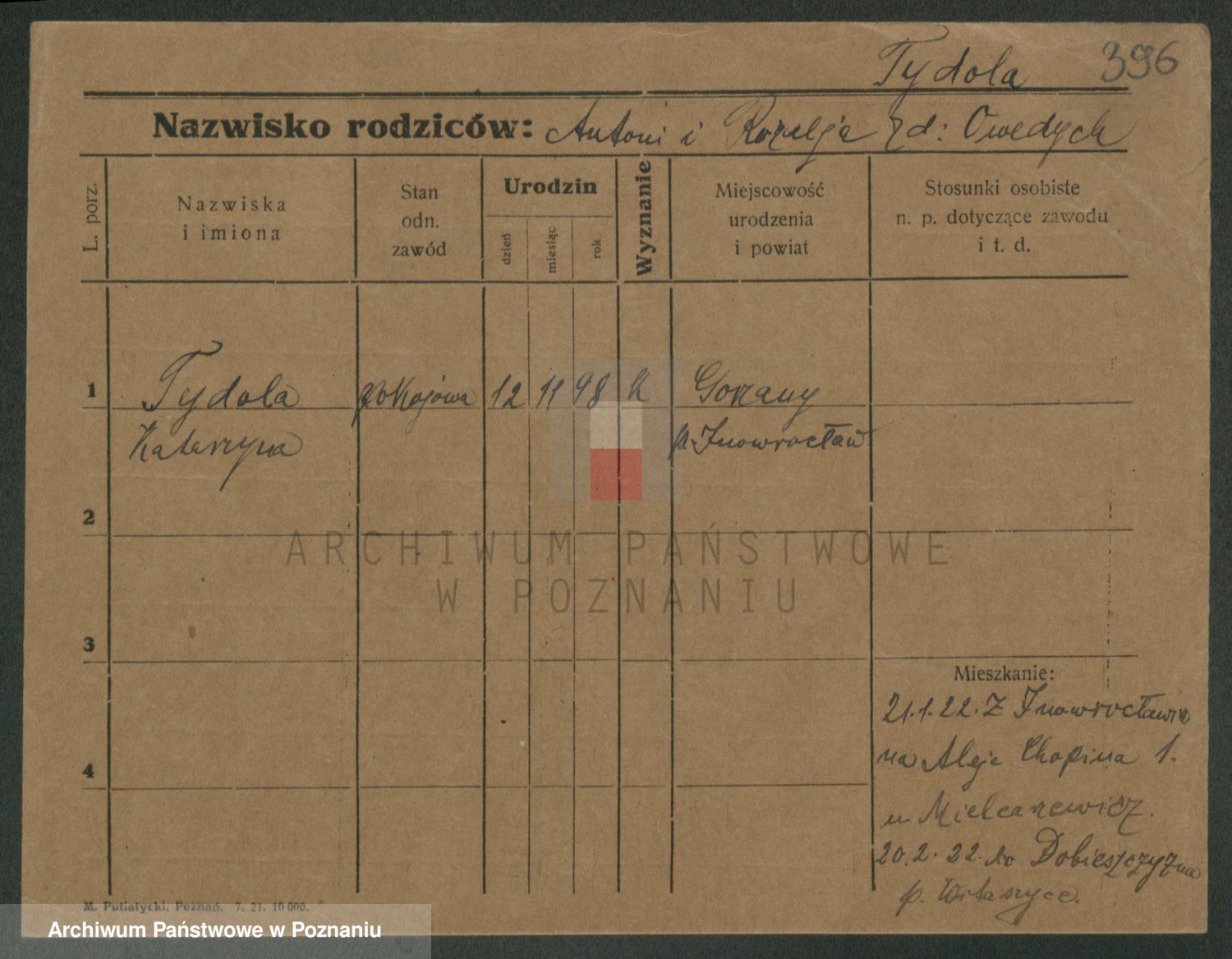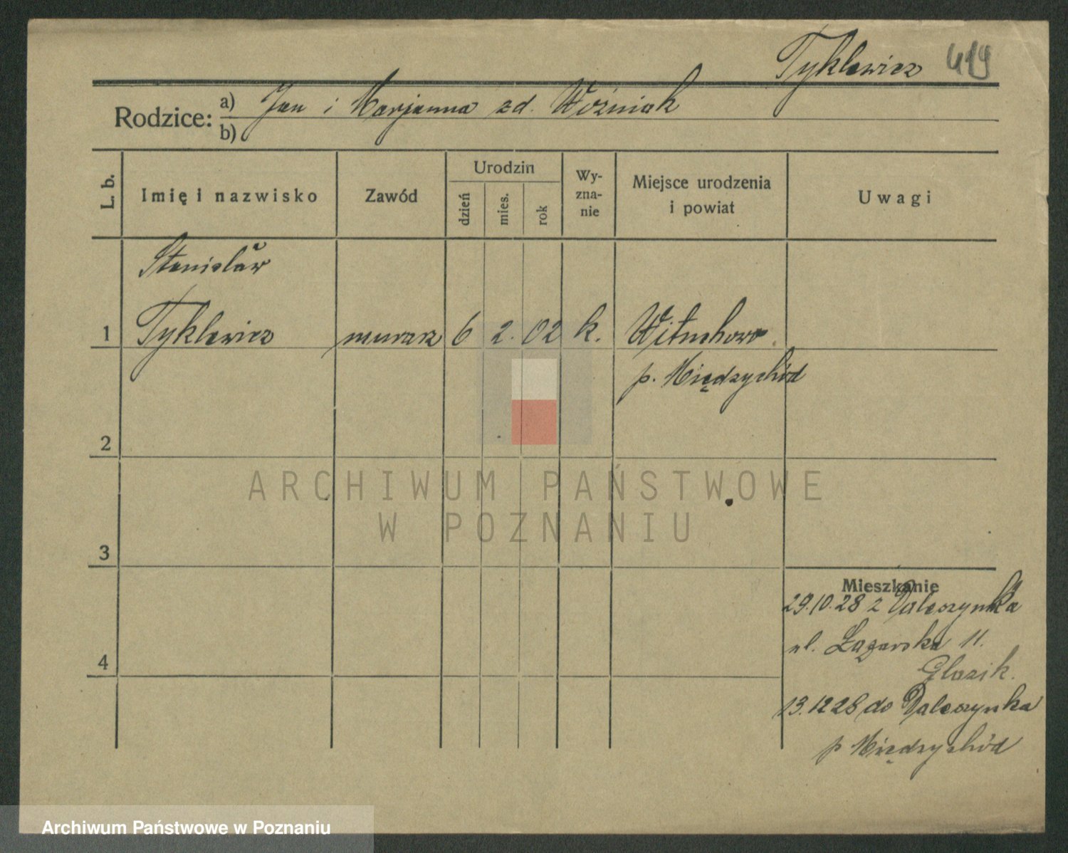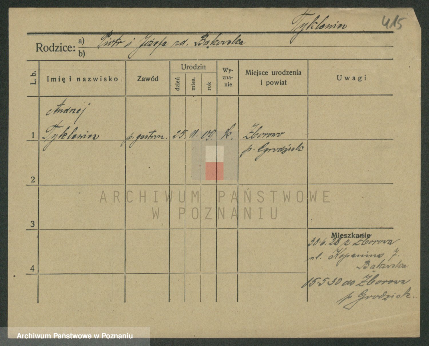 Podgląd karty osobowej dostępny jest po kliknięciu na nazwisko lub ikonkę karty. Można dokonywać powiększenia (ikony na górze) lub przechodzić między kolejnymi skanami (strzałki po bokach).