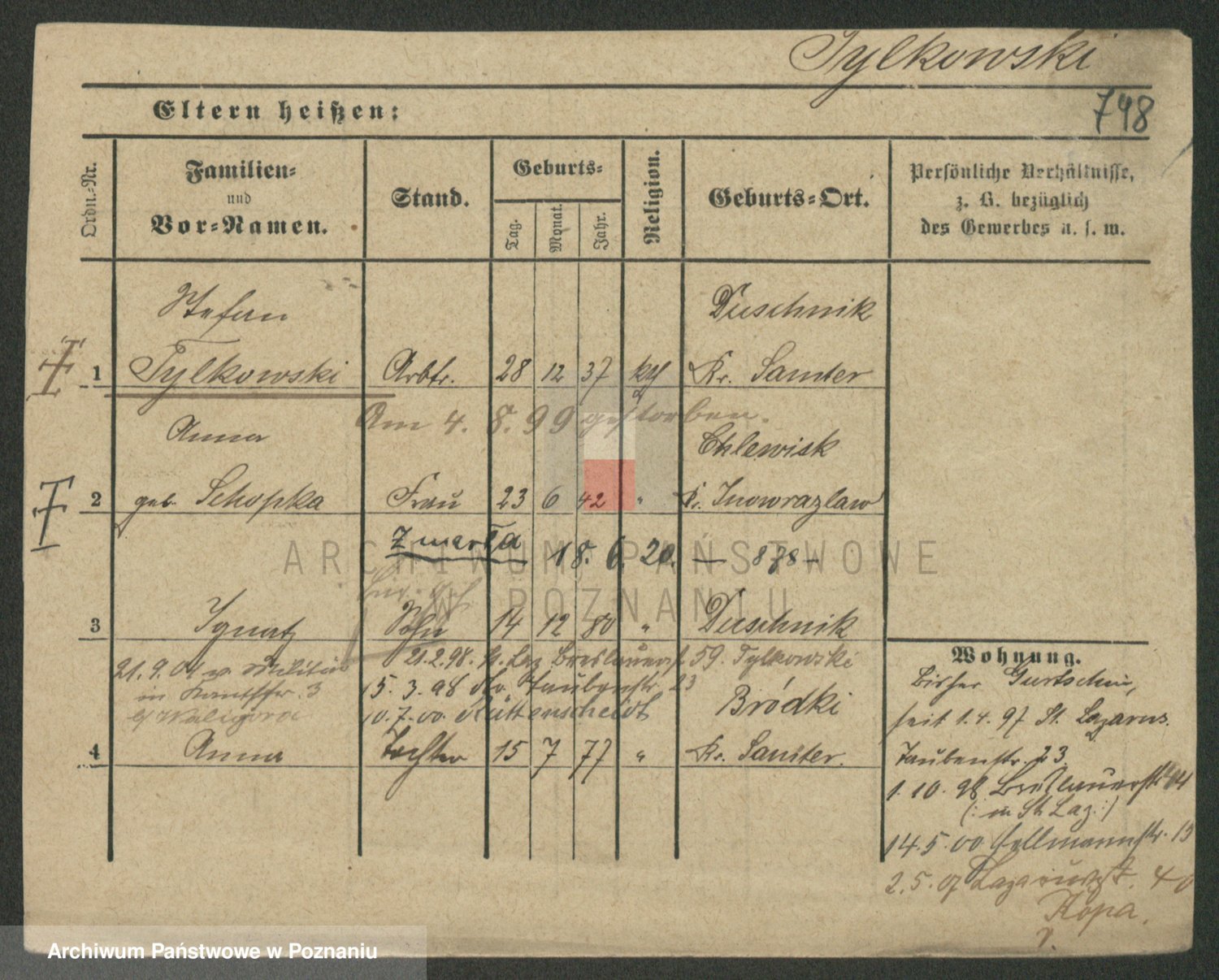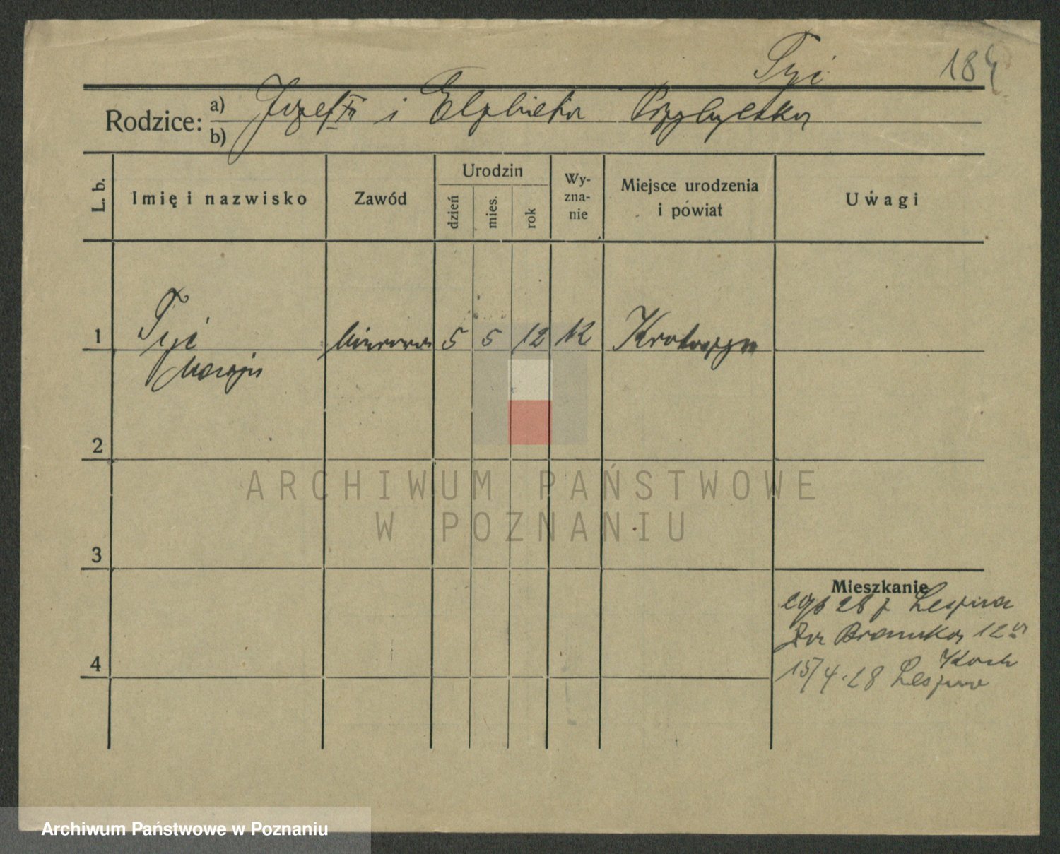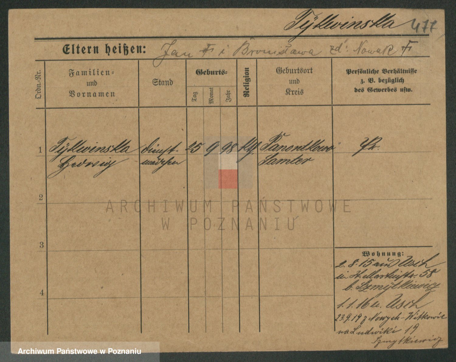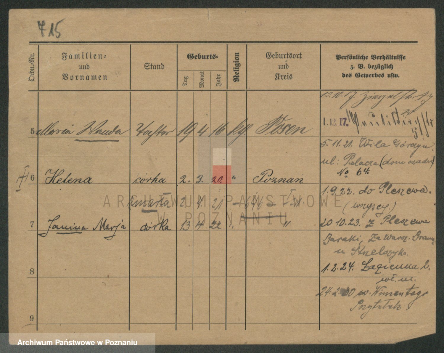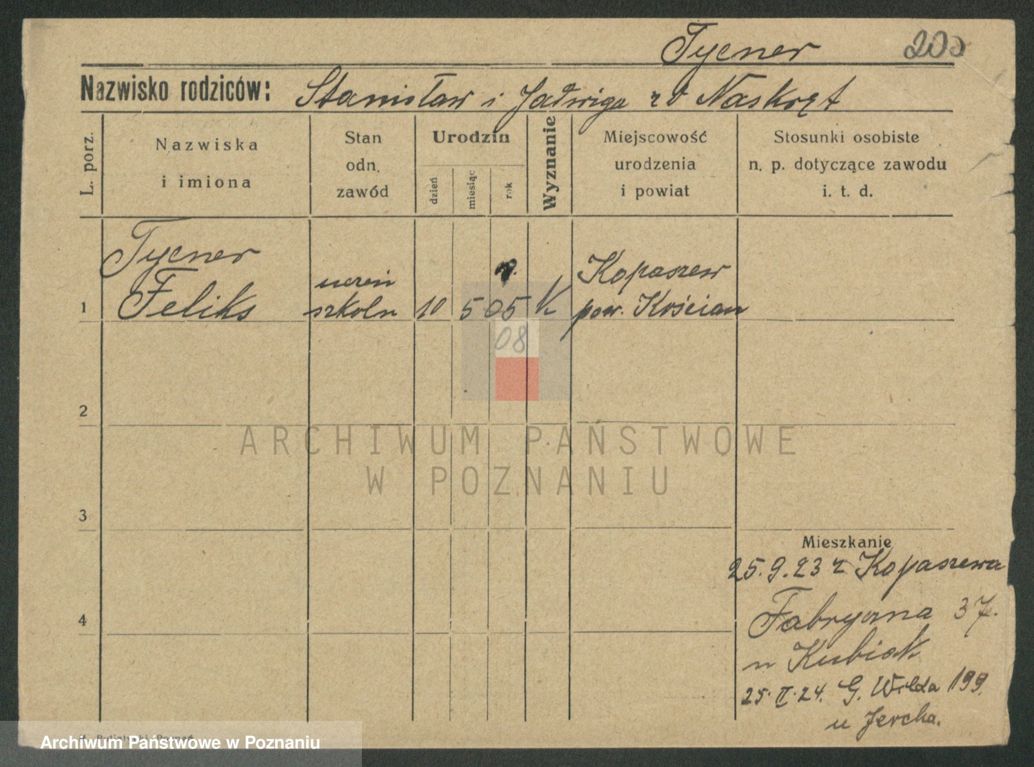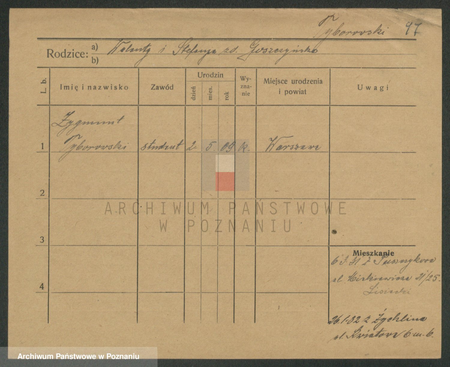 Podgląd karty osobowej dostępny jest po kliknięciu na nazwisko lub ikonkę karty. Można dokonywać powiększenia (ikony na górze) lub przechodzić między kolejnymi skanami (strzałki po bokach).