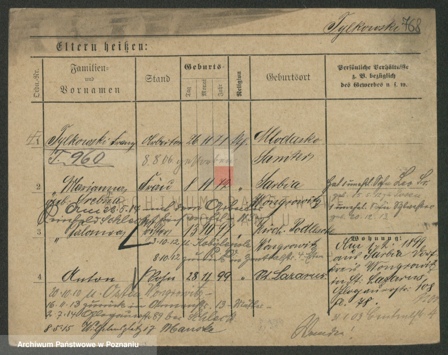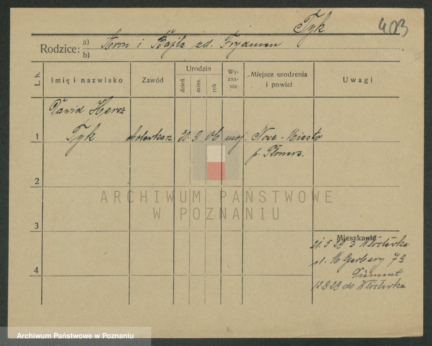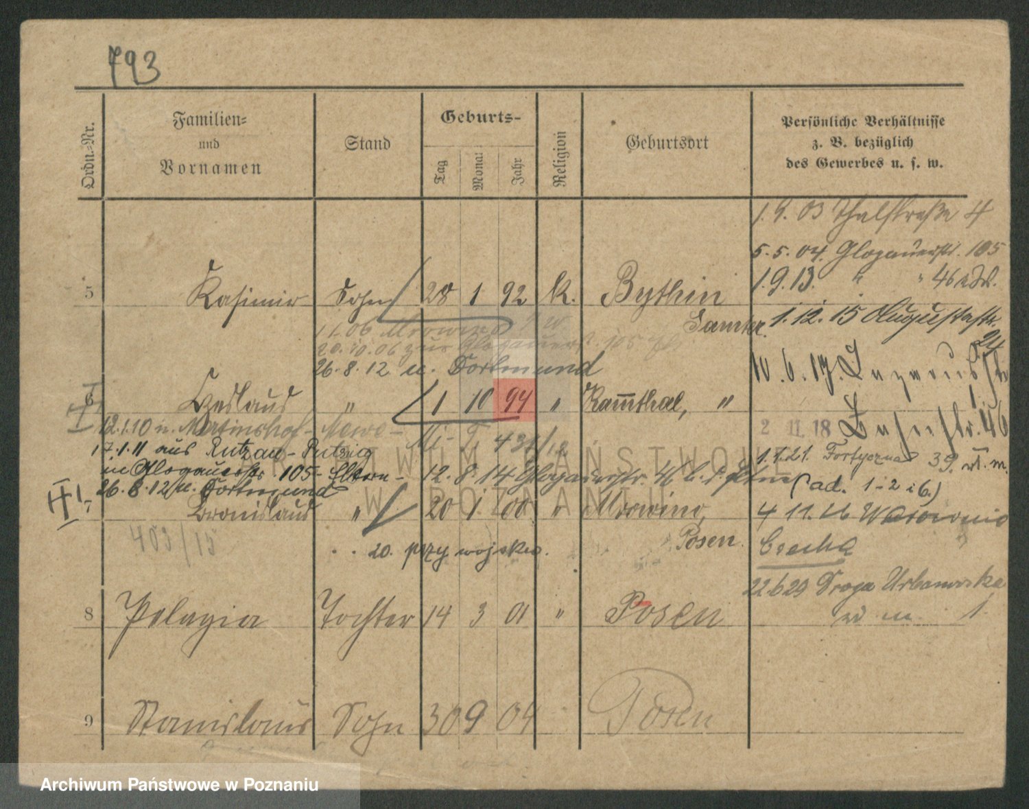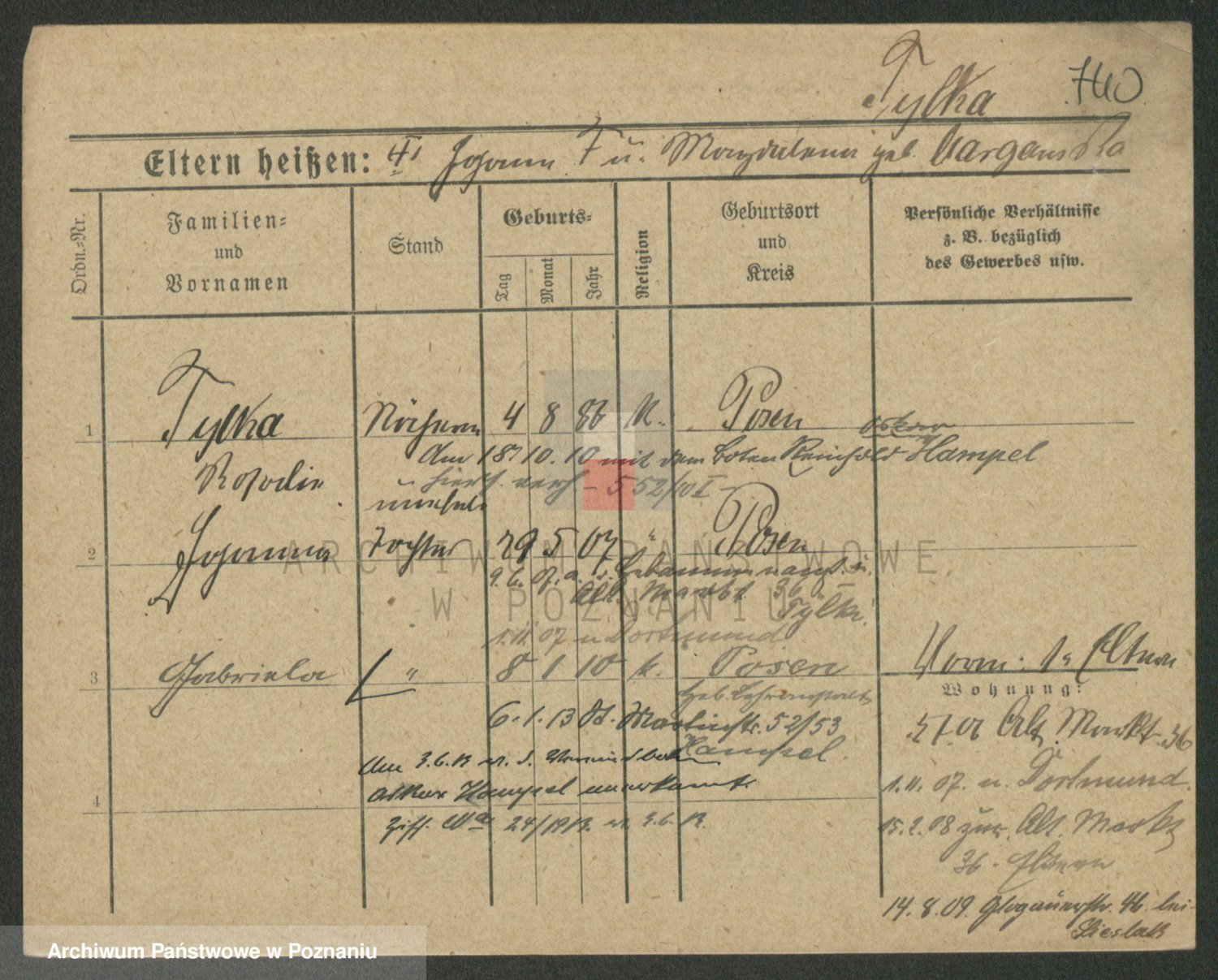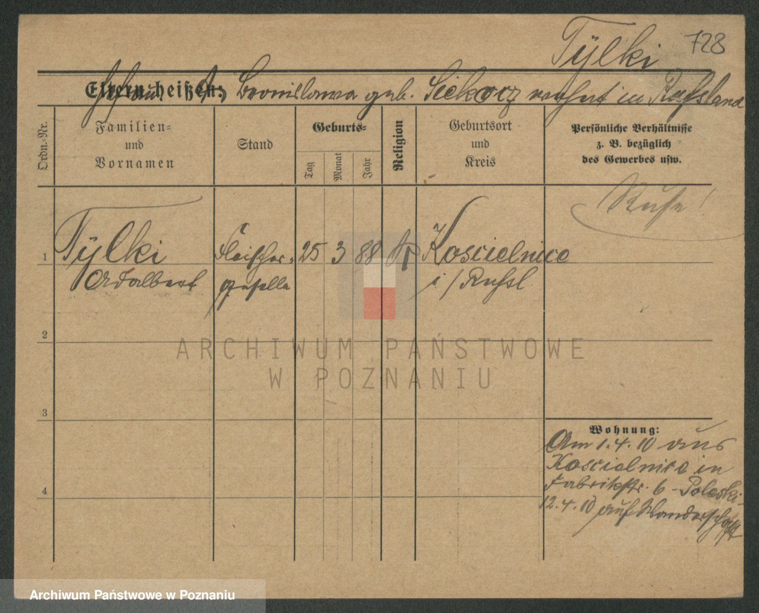 Podgląd karty osobowej dostępny jest po kliknięciu na nazwisko lub ikonkę karty. Można dokonywać powiększenia (ikony na górze) lub przechodzić między kolejnymi skanami (strzałki po bokach).