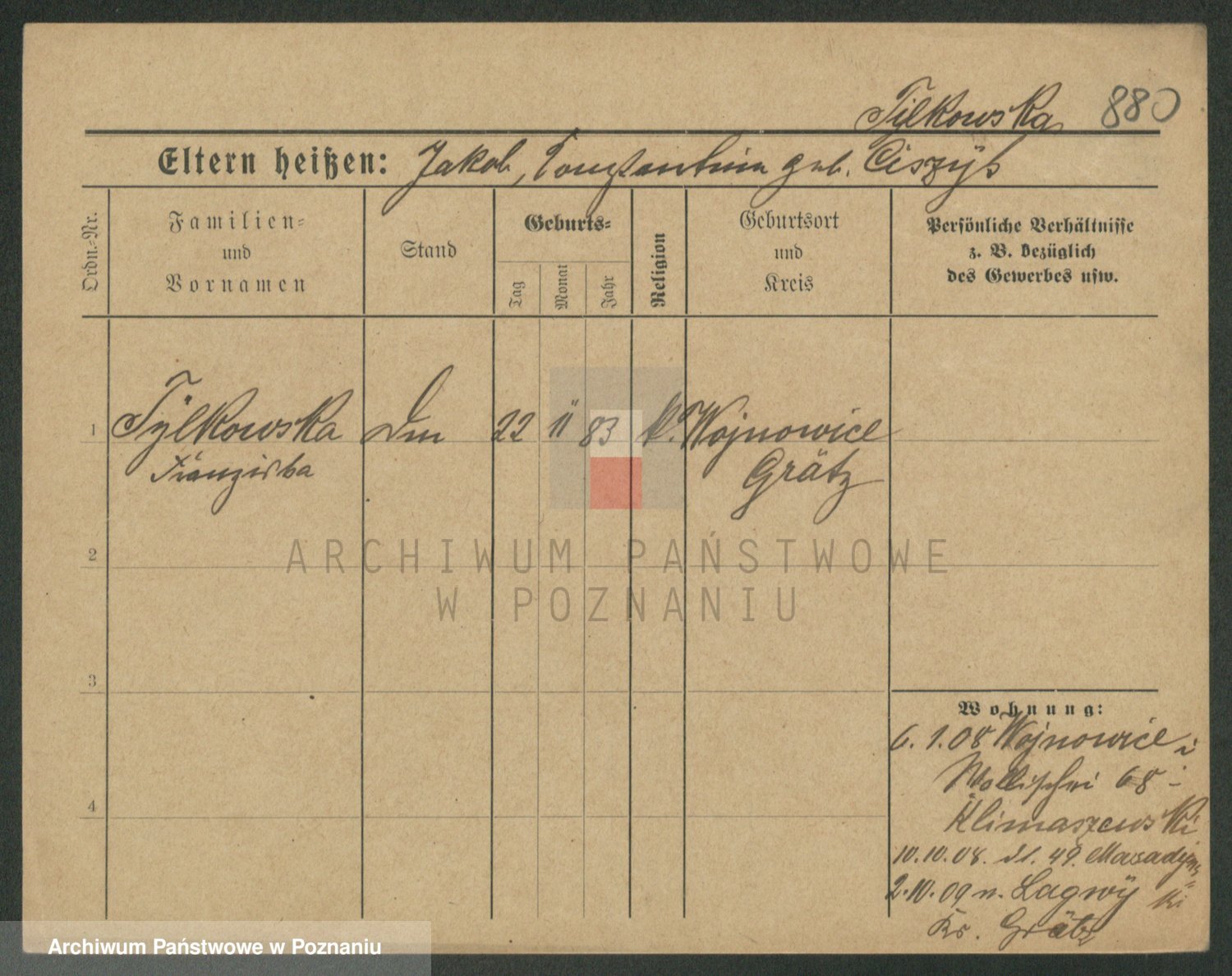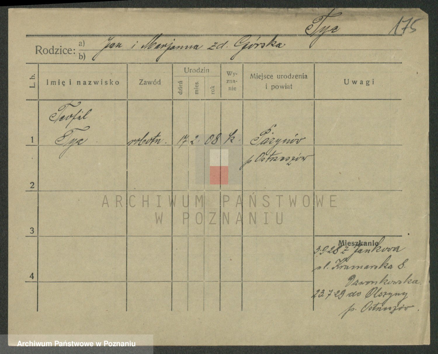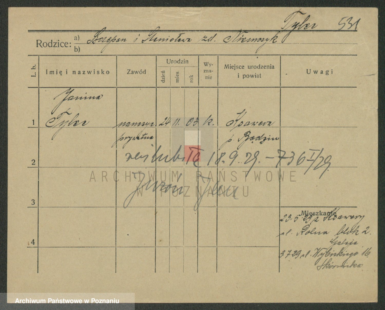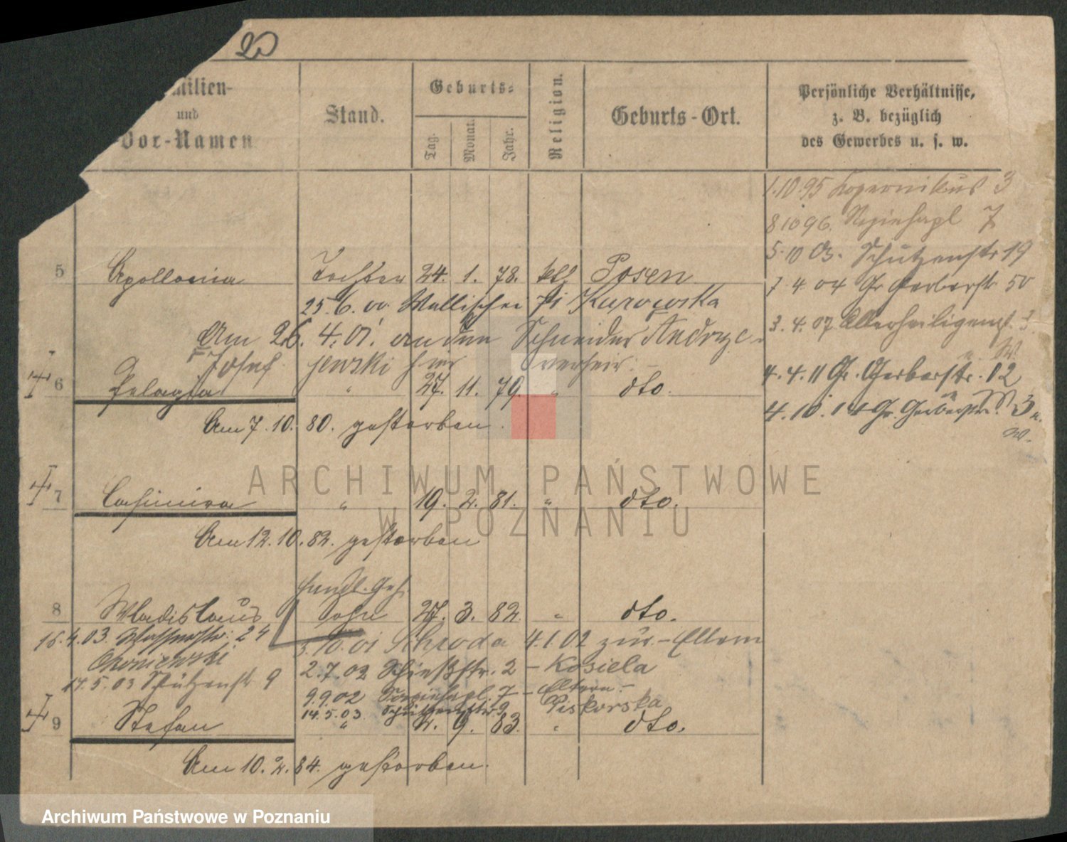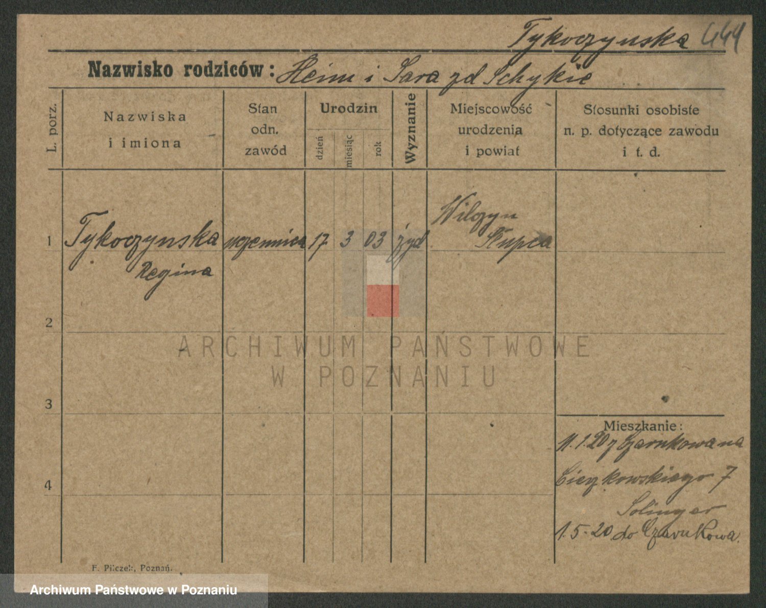 Podgląd karty osobowej dostępny jest po kliknięciu na nazwisko lub ikonkę karty. Można dokonywać powiększenia (ikony na górze) lub przechodzić między kolejnymi skanami (strzałki po bokach).
