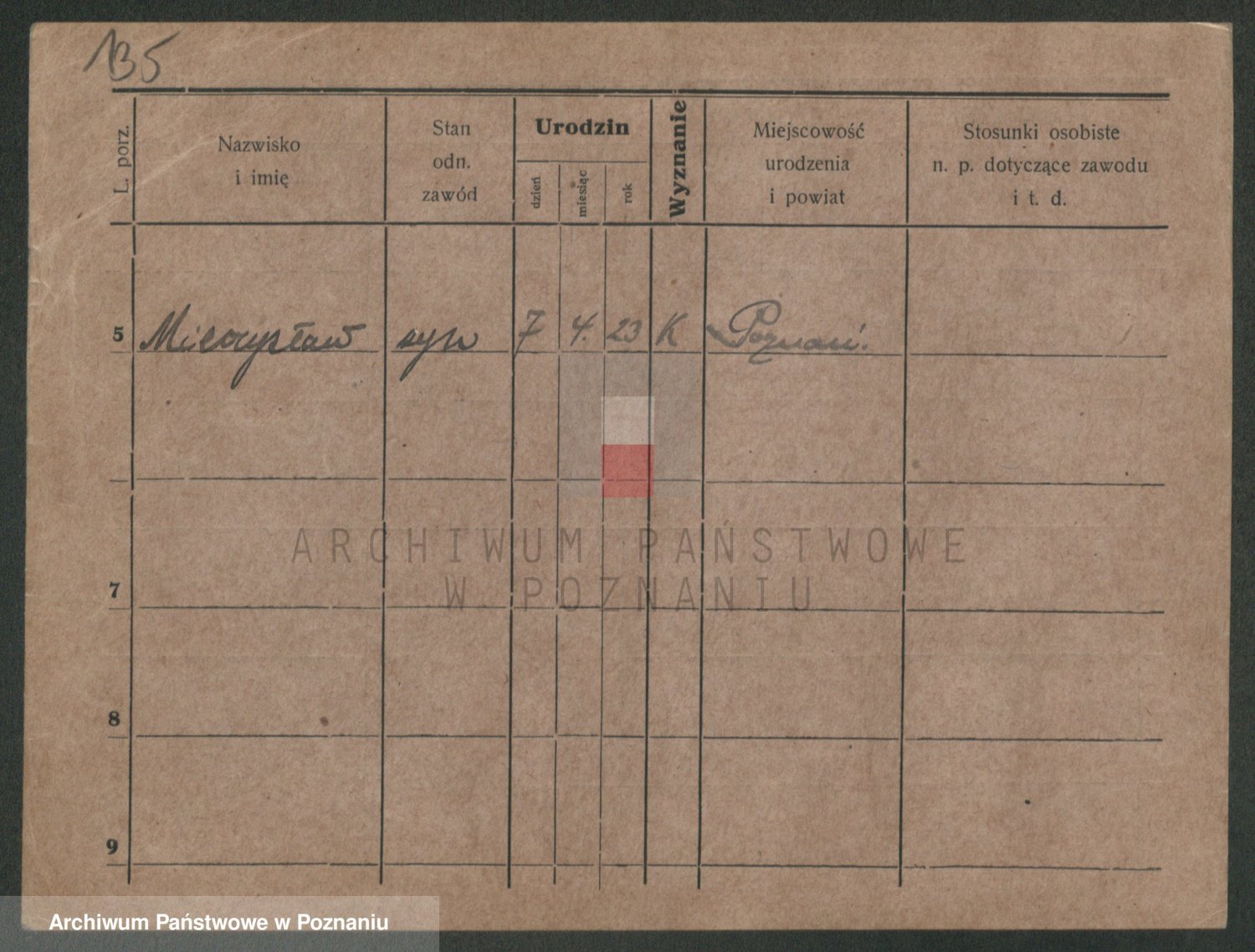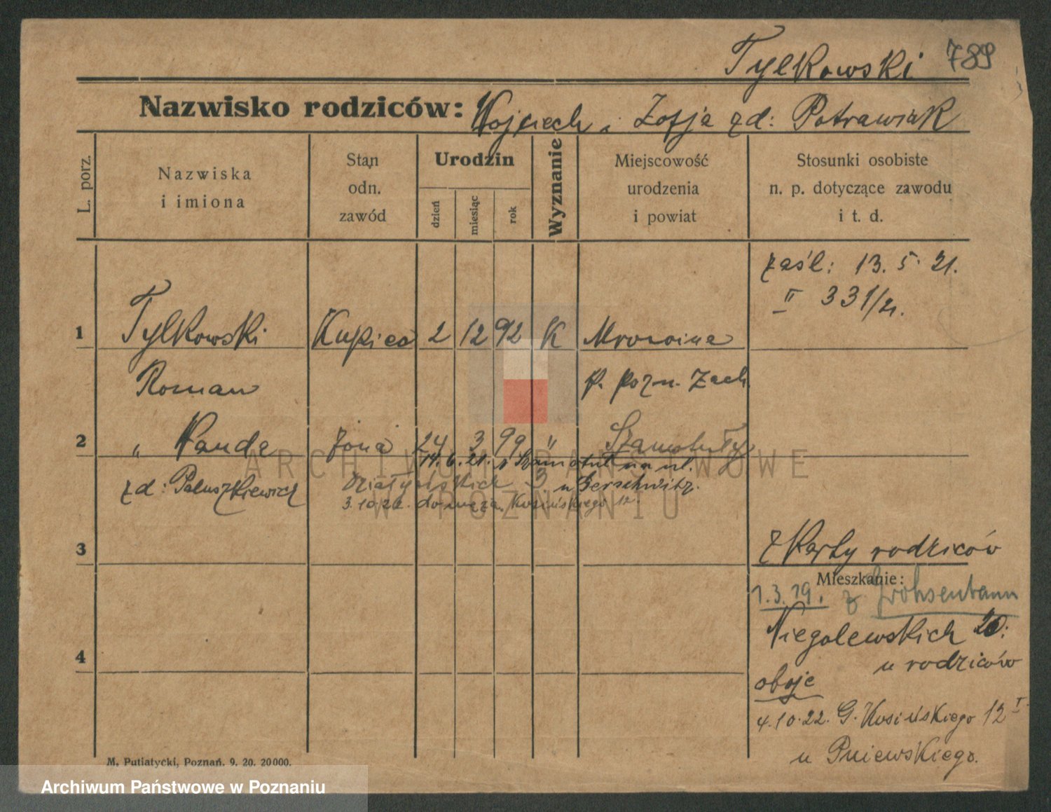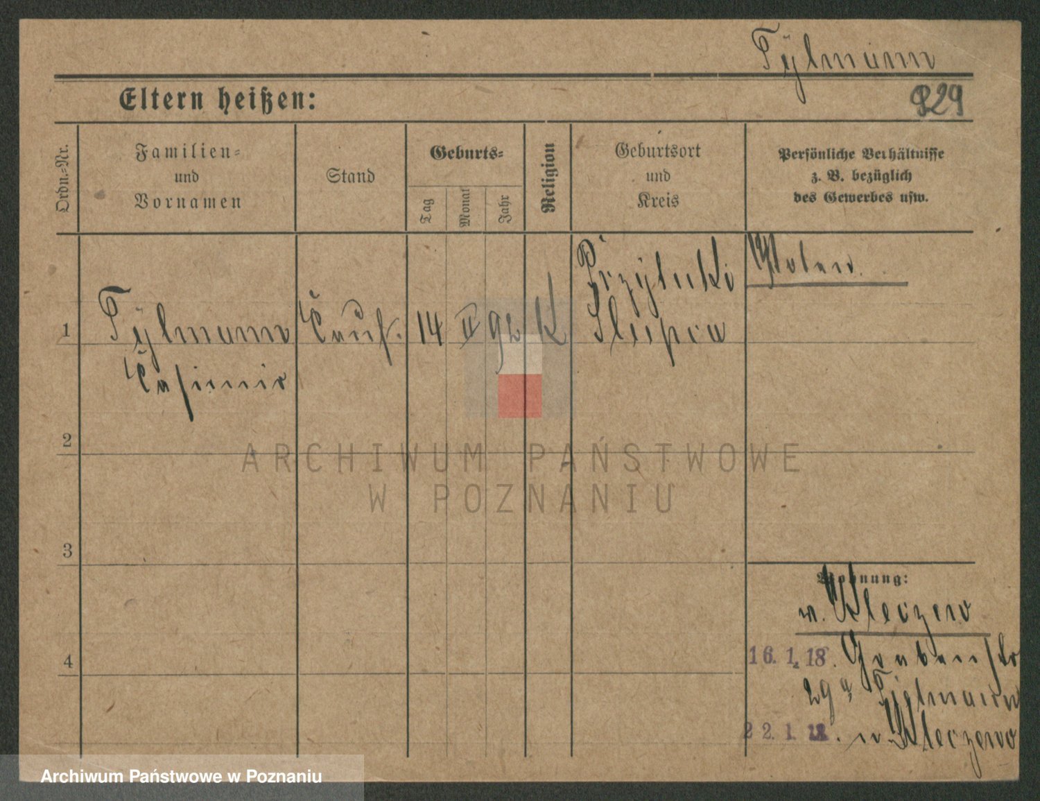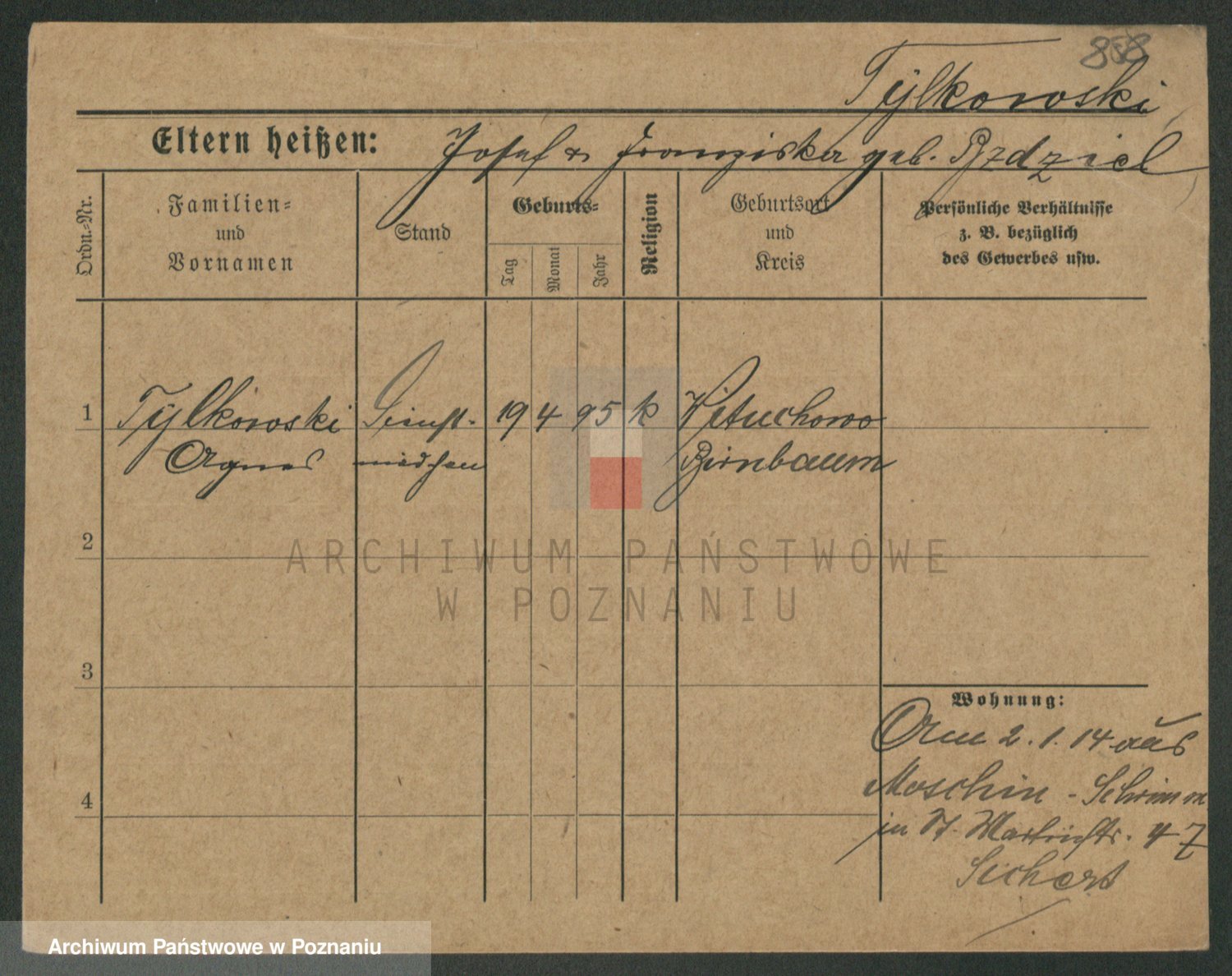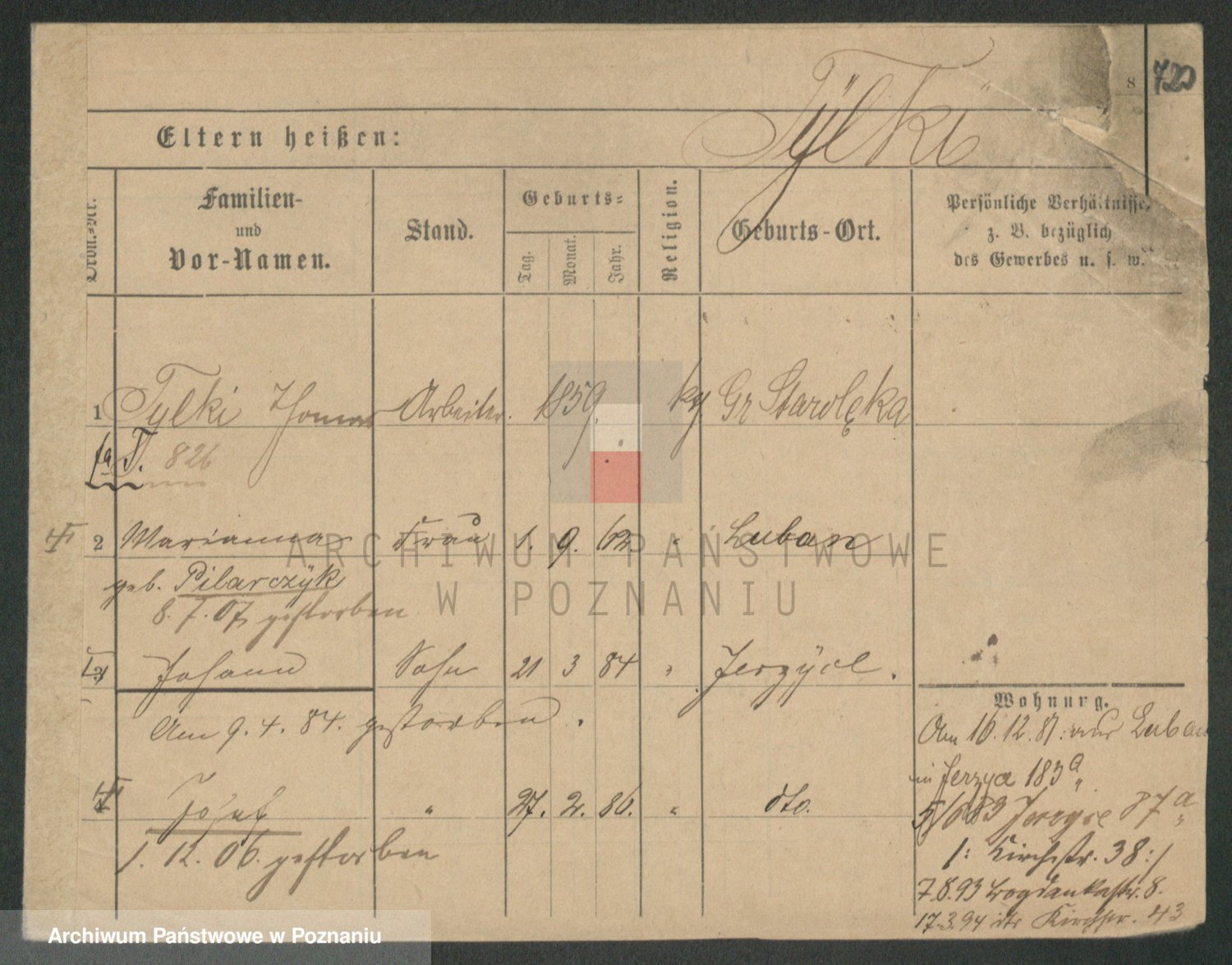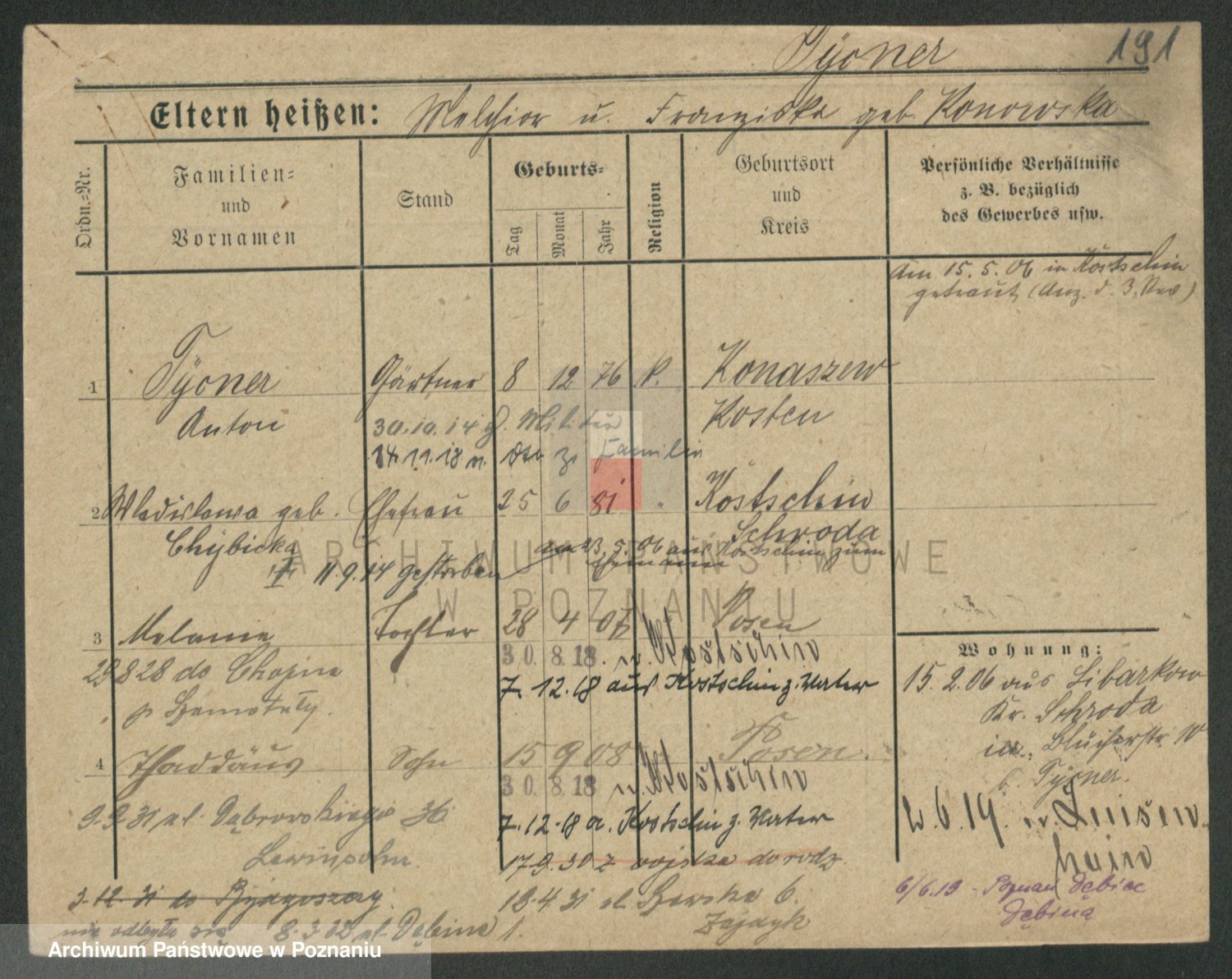 Podgląd karty osobowej dostępny jest po kliknięciu na nazwisko lub ikonkę karty. Można dokonywać powiększenia (ikony na górze) lub przechodzić między kolejnymi skanami (strzałki po bokach).