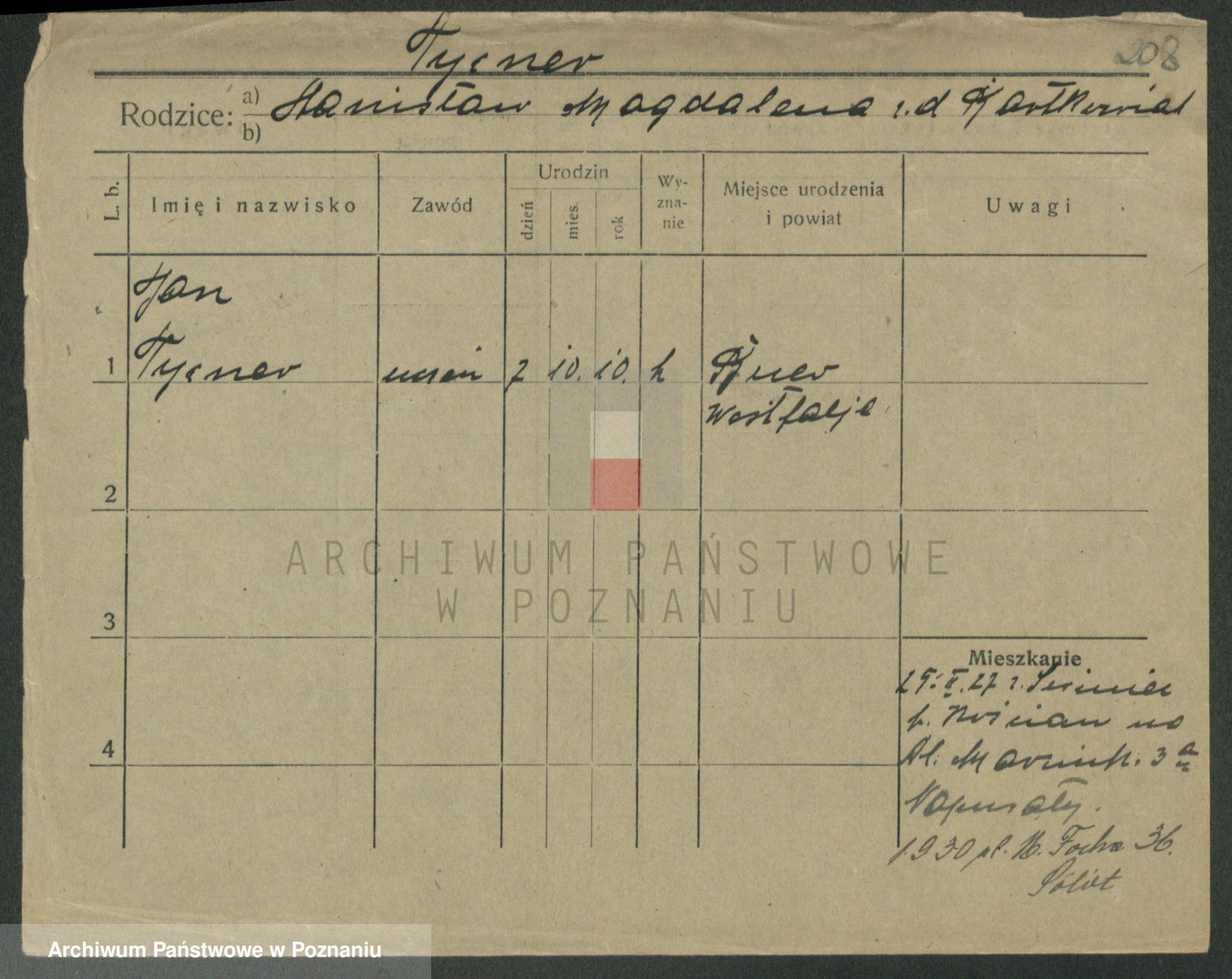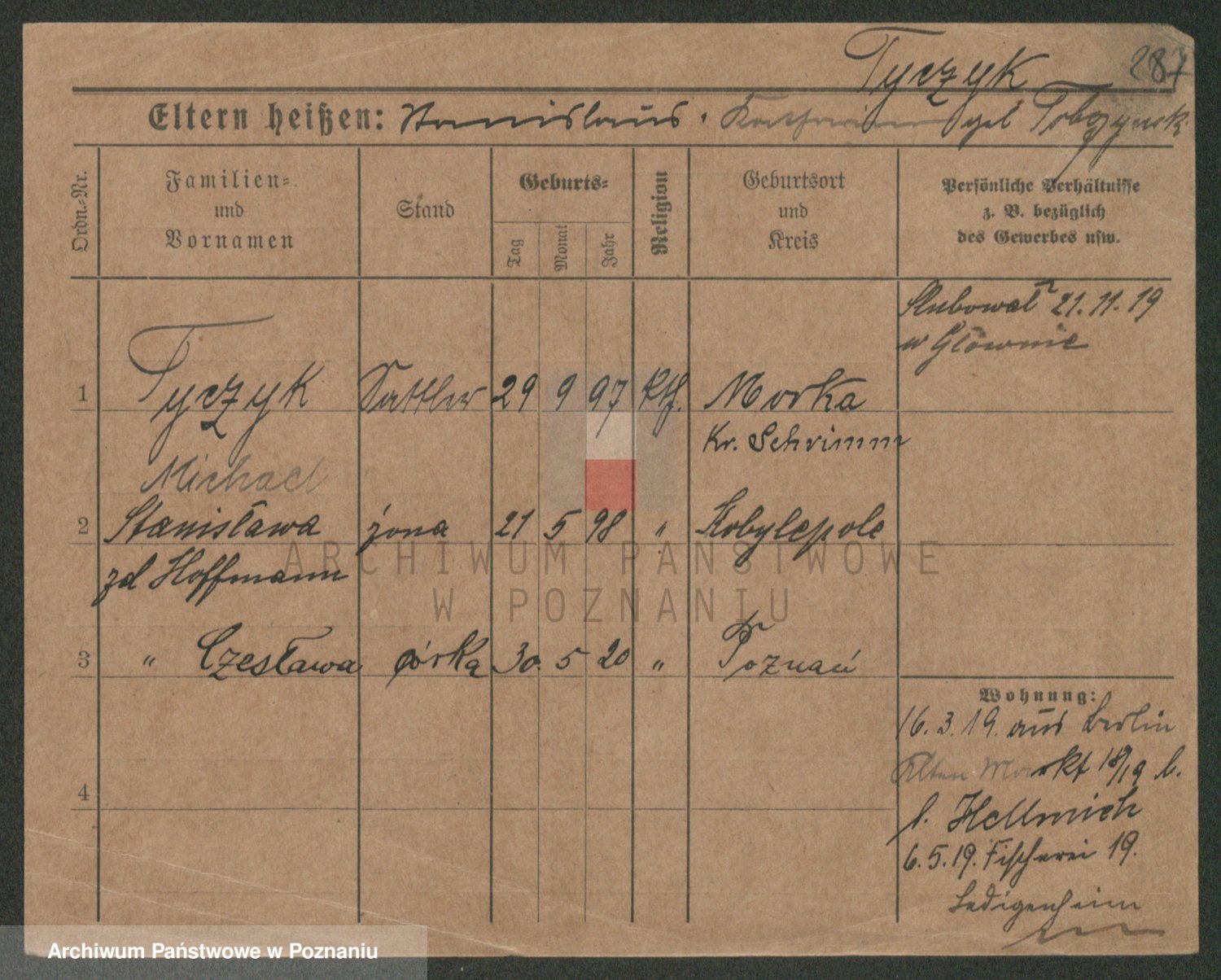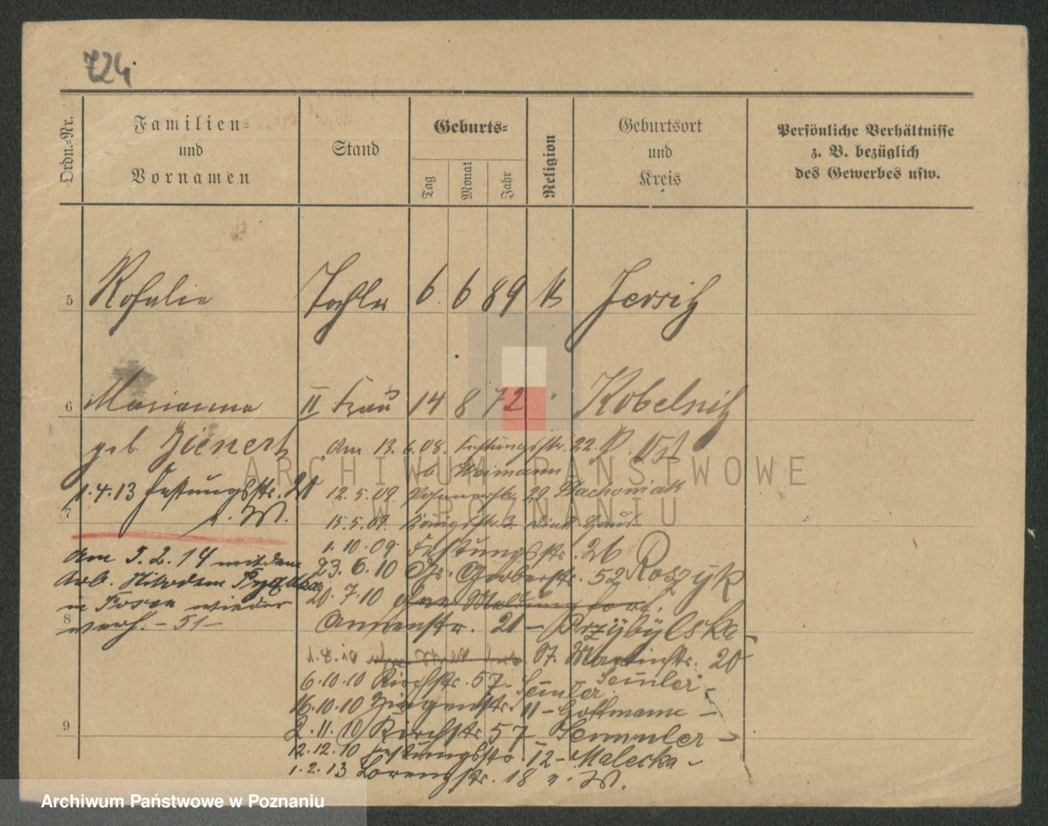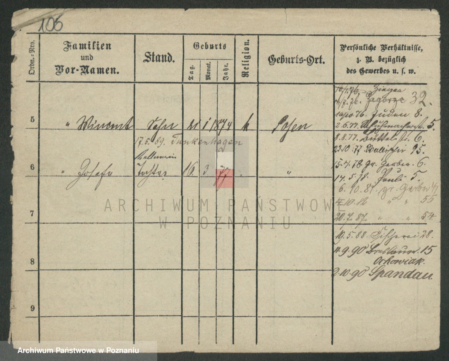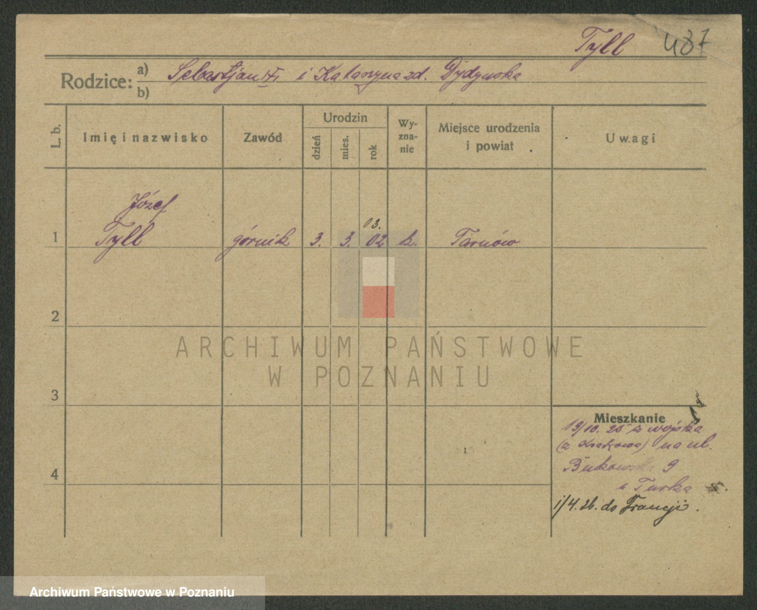 Podgląd karty osobowej dostępny jest po kliknięciu na nazwisko lub ikonkę karty. Można dokonywać powiększenia (ikony na górze) lub przechodzić między kolejnymi skanami (strzałki po bokach).