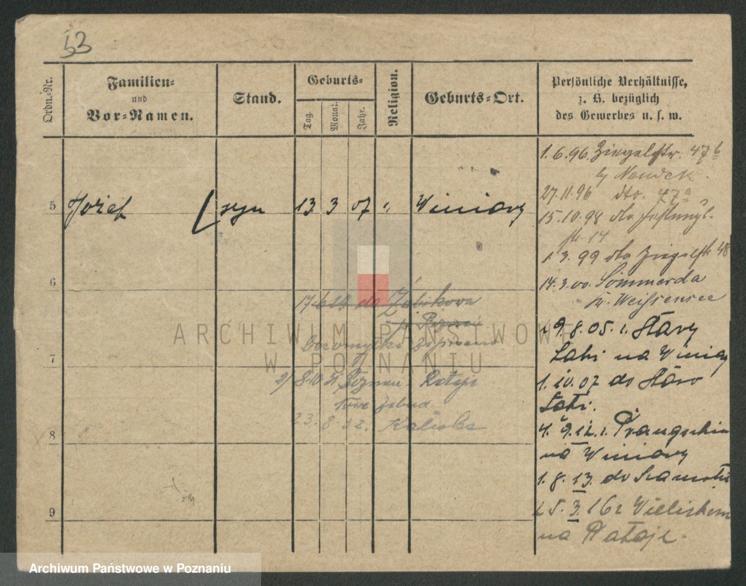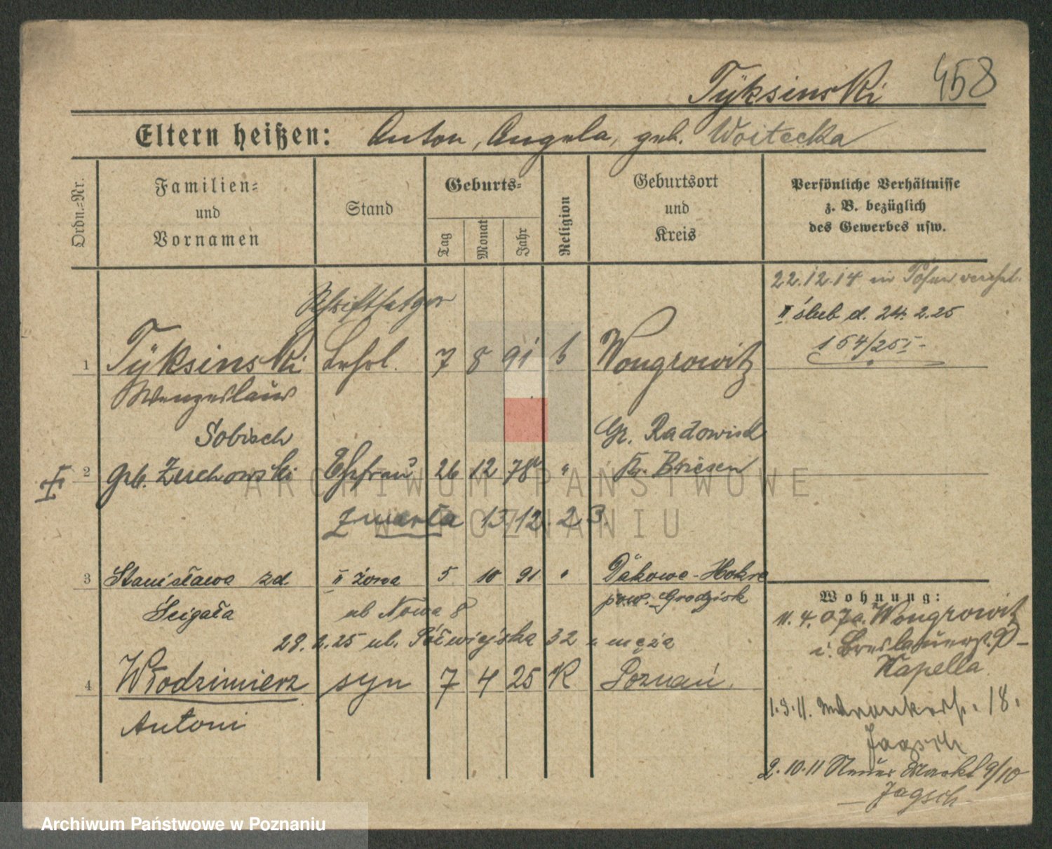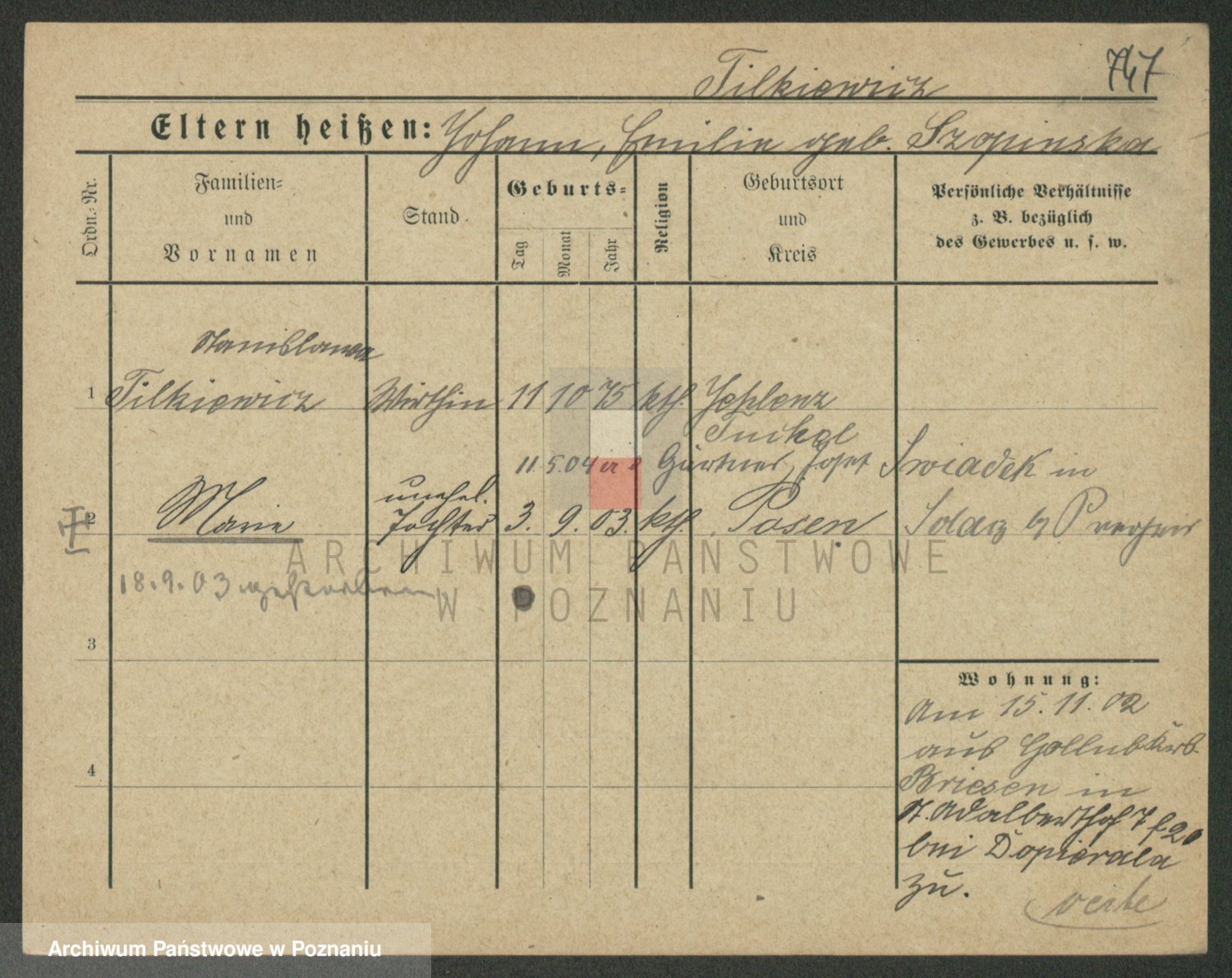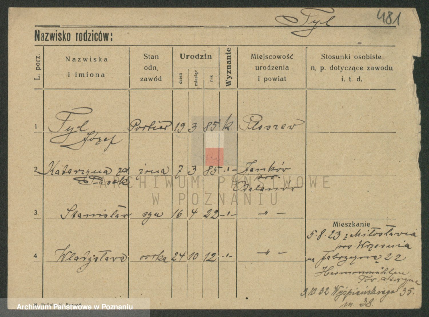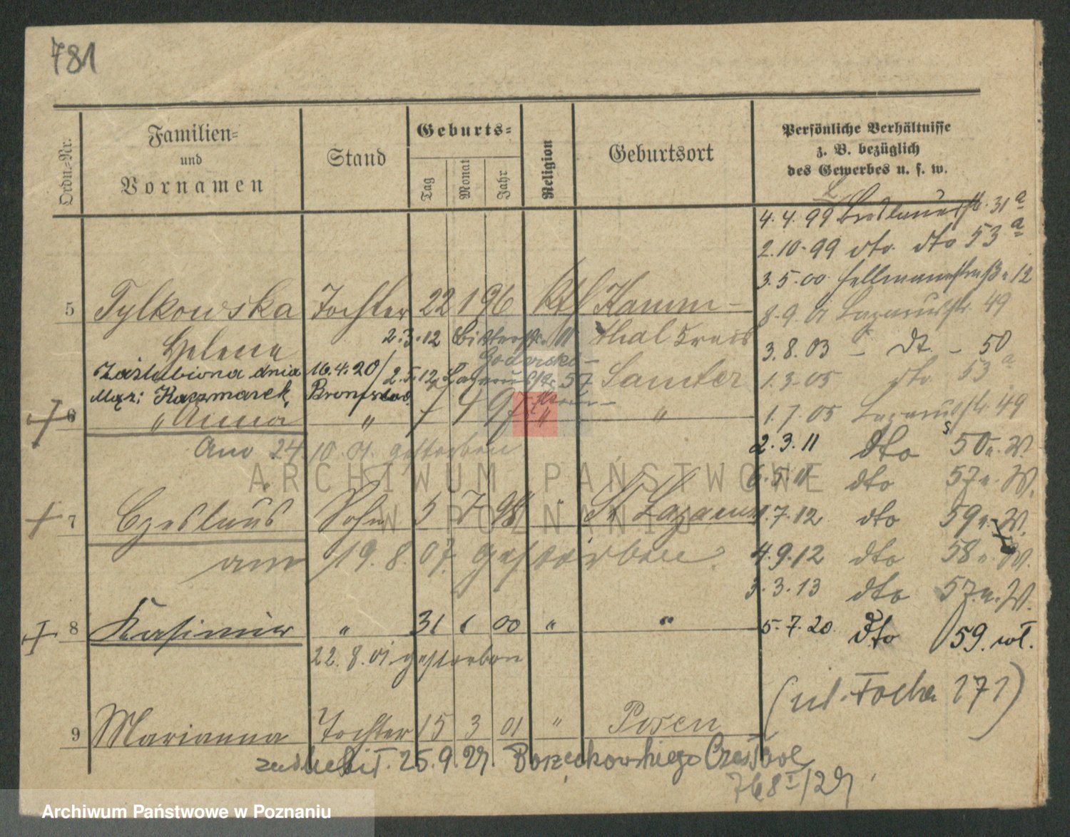 Podgląd karty osobowej dostępny jest po kliknięciu na nazwisko lub ikonkę karty. Można dokonywać powiększenia (ikony na górze) lub przechodzić między kolejnymi skanami (strzałki po bokach).
