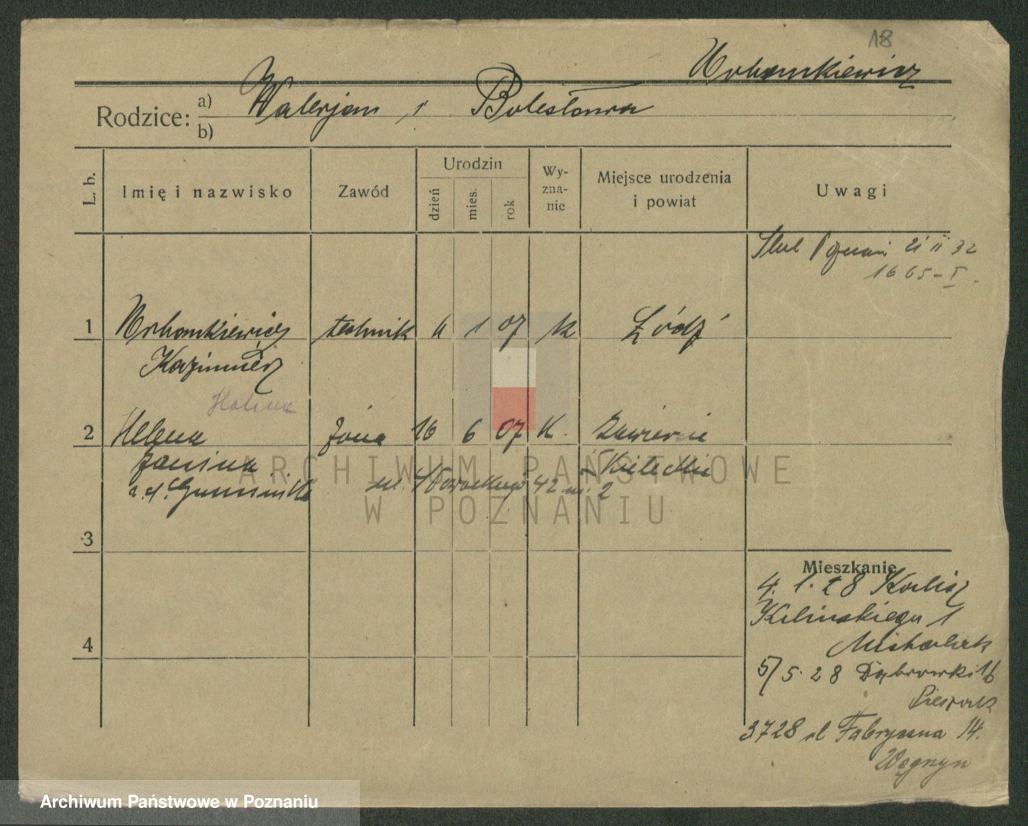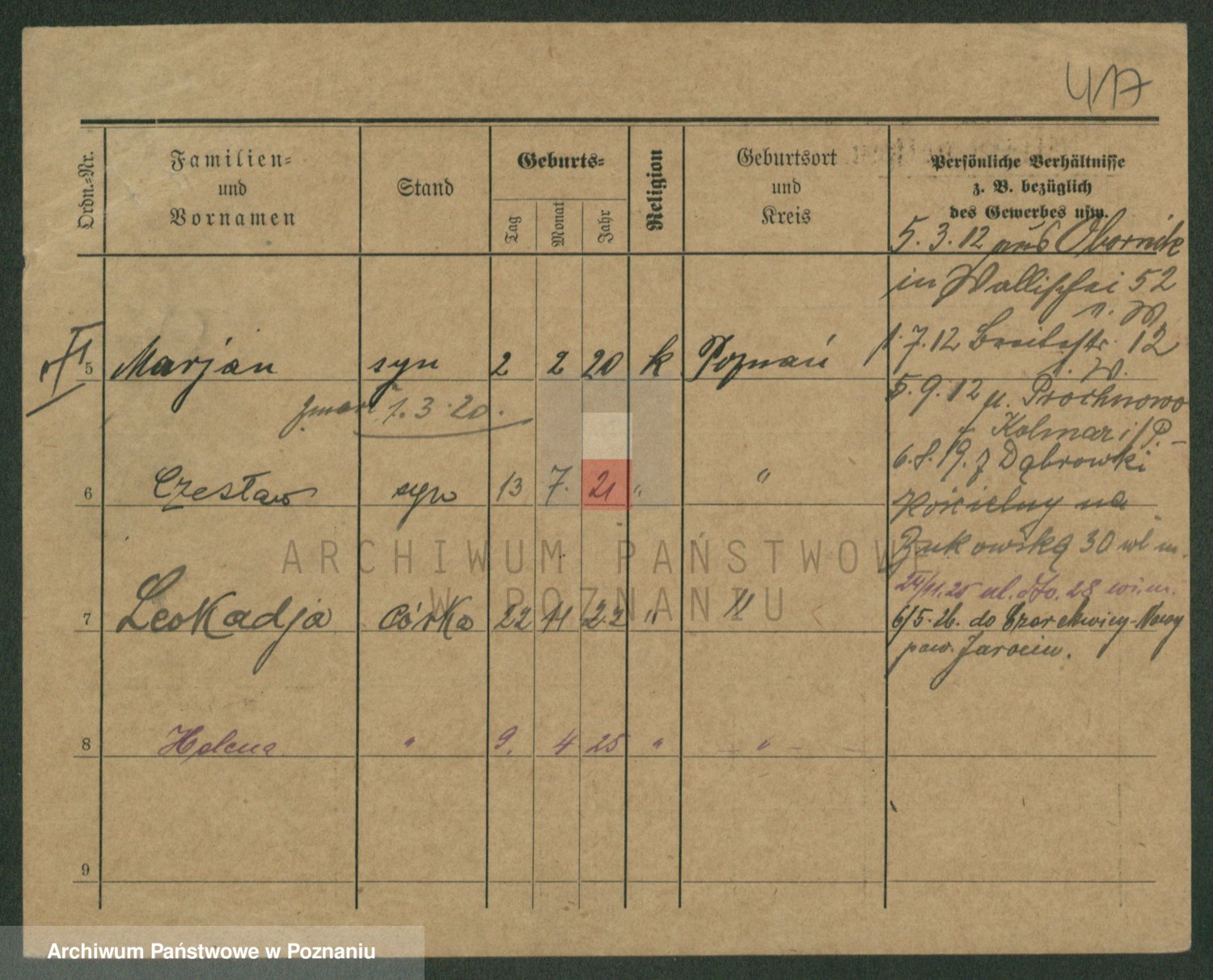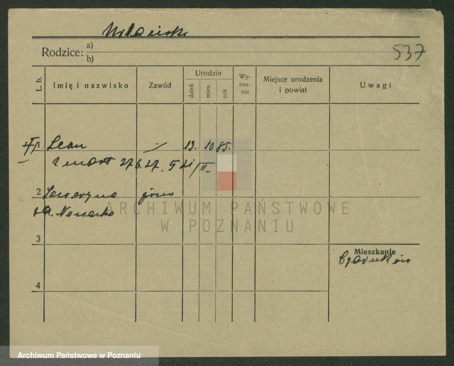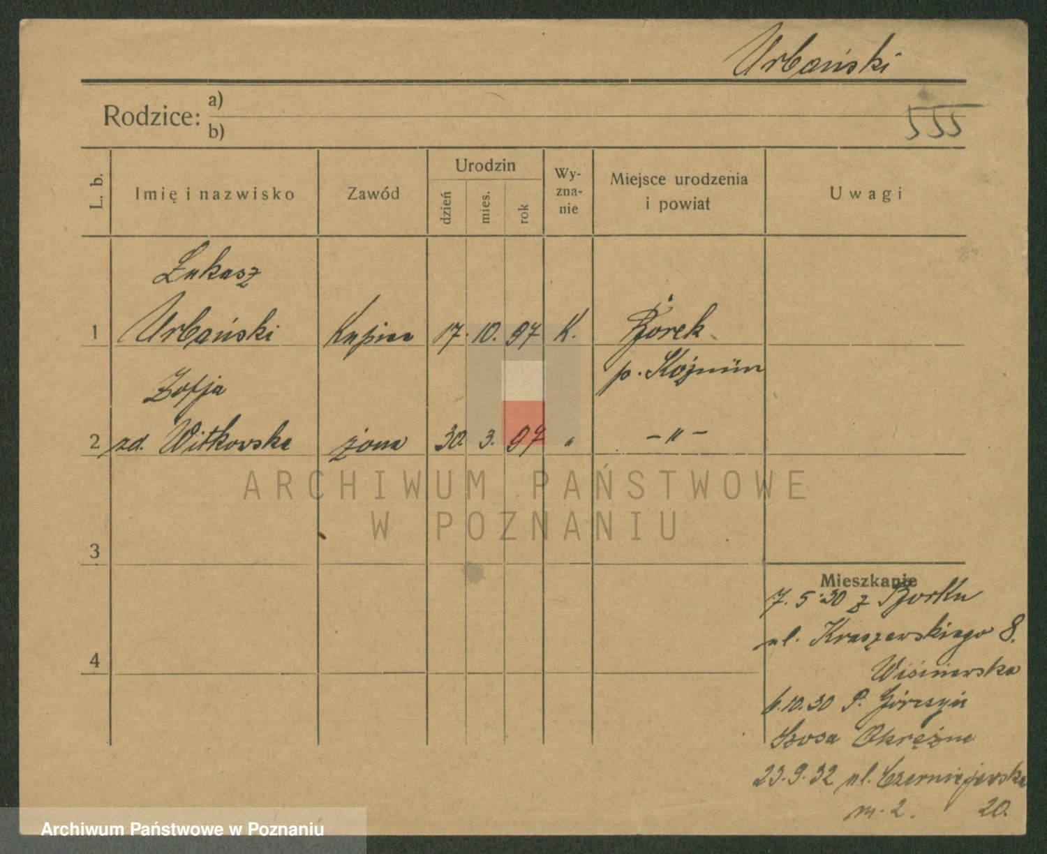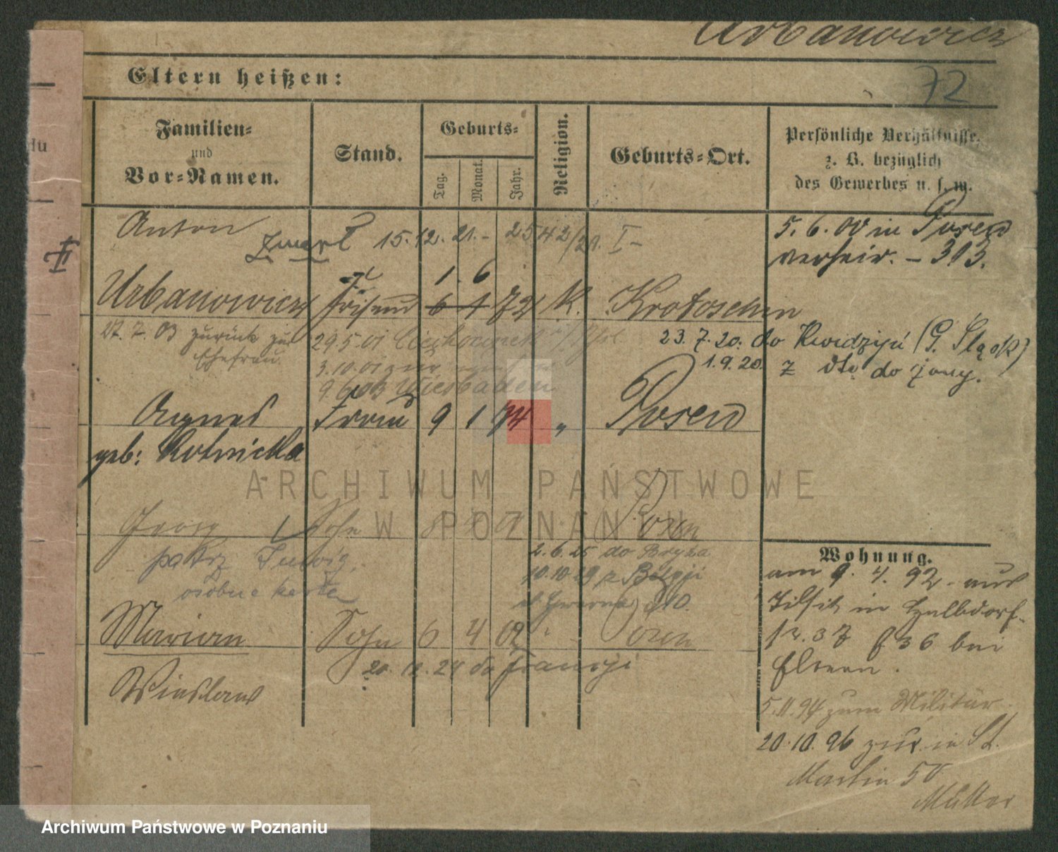 Podgląd karty osobowej dostępny jest po kliknięciu na nazwisko lub ikonkę karty. Można dokonywać powiększenia (ikony na górze) lub przechodzić między kolejnymi skanami (strzałki po bokach).