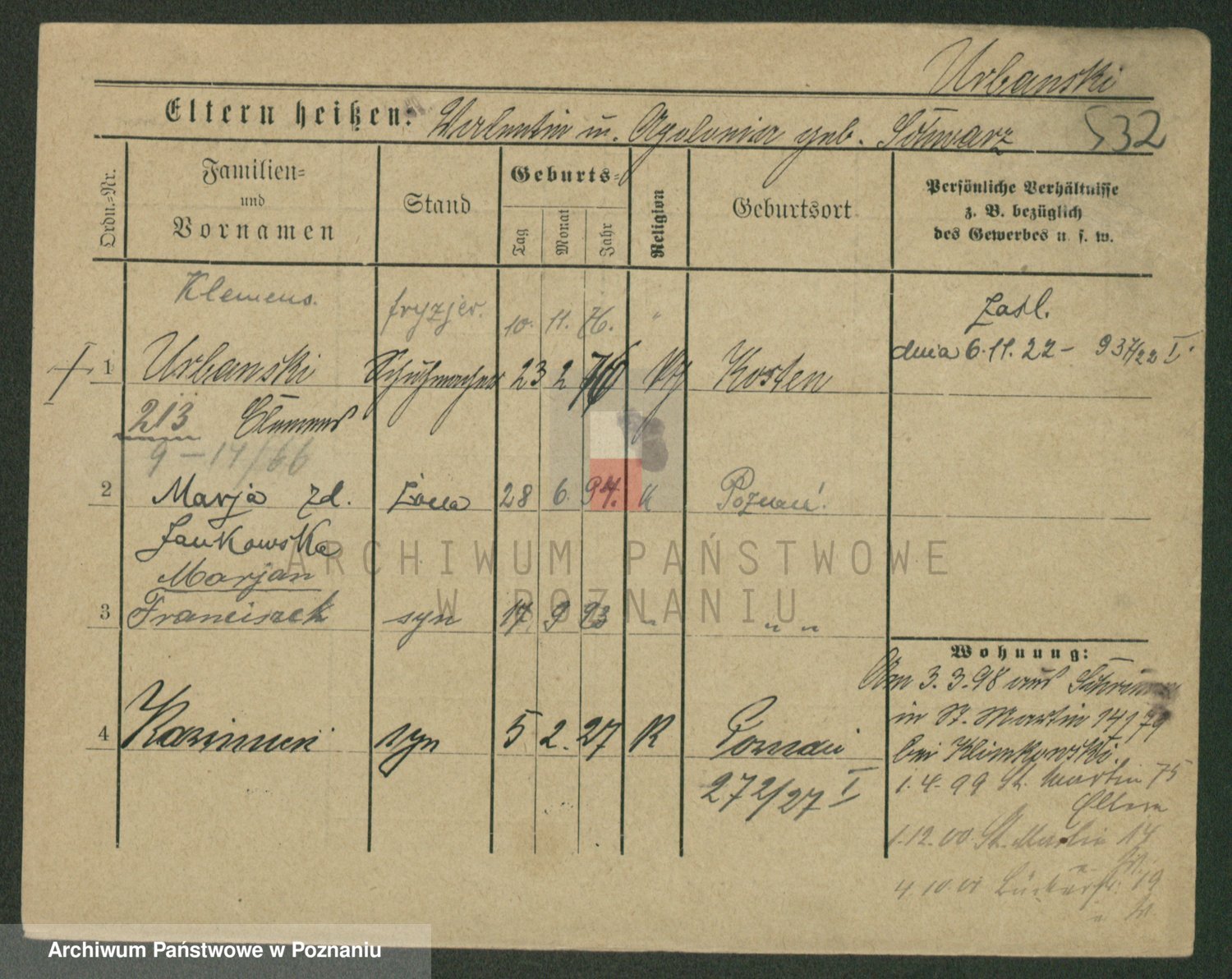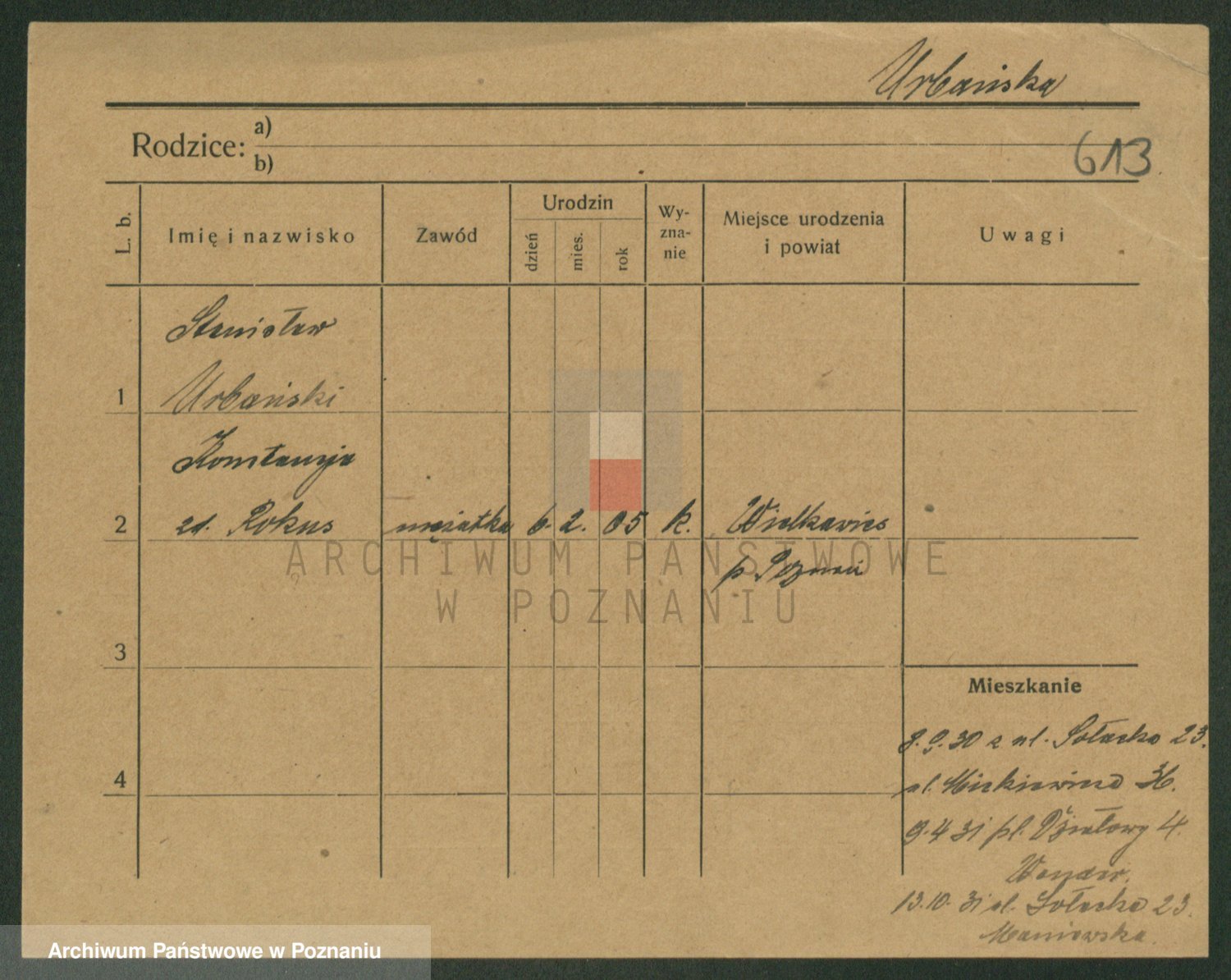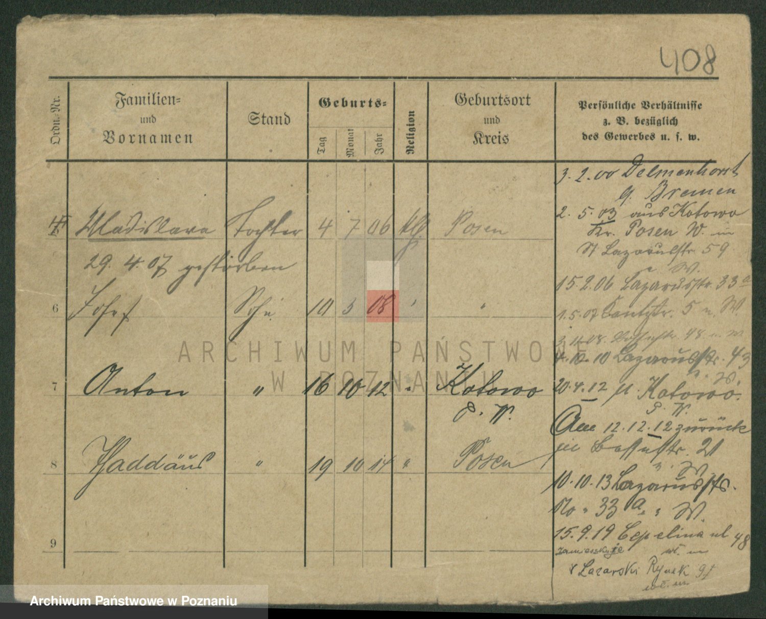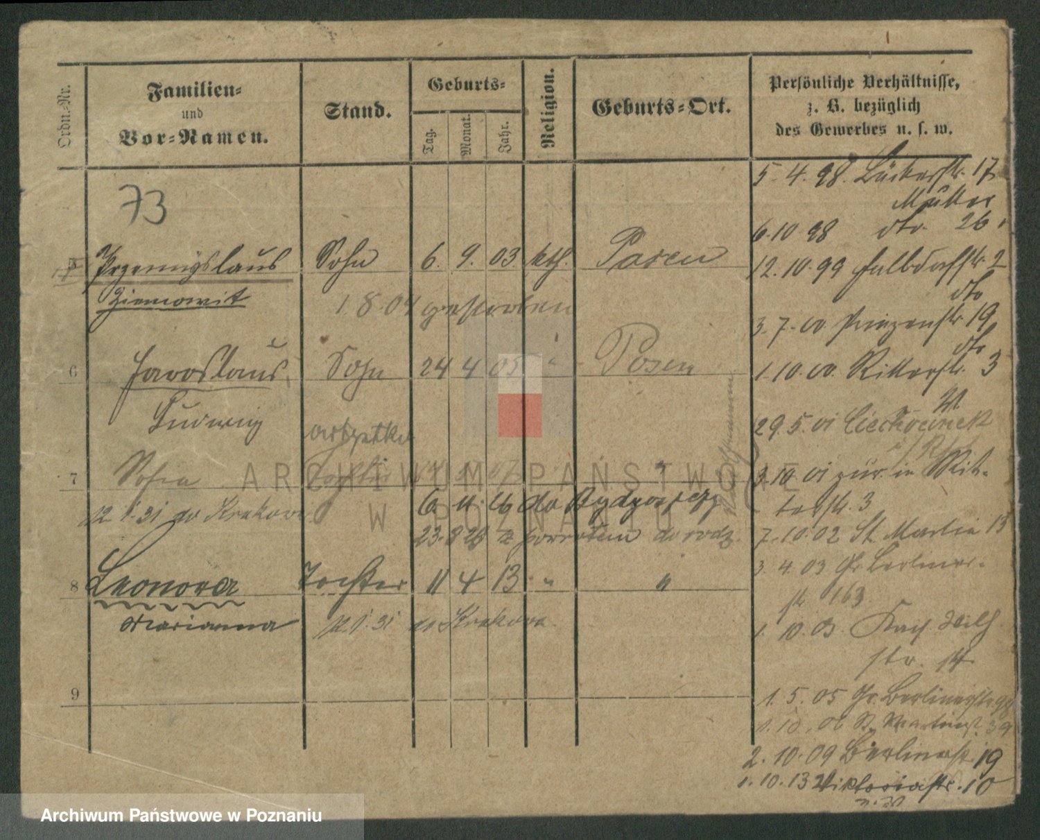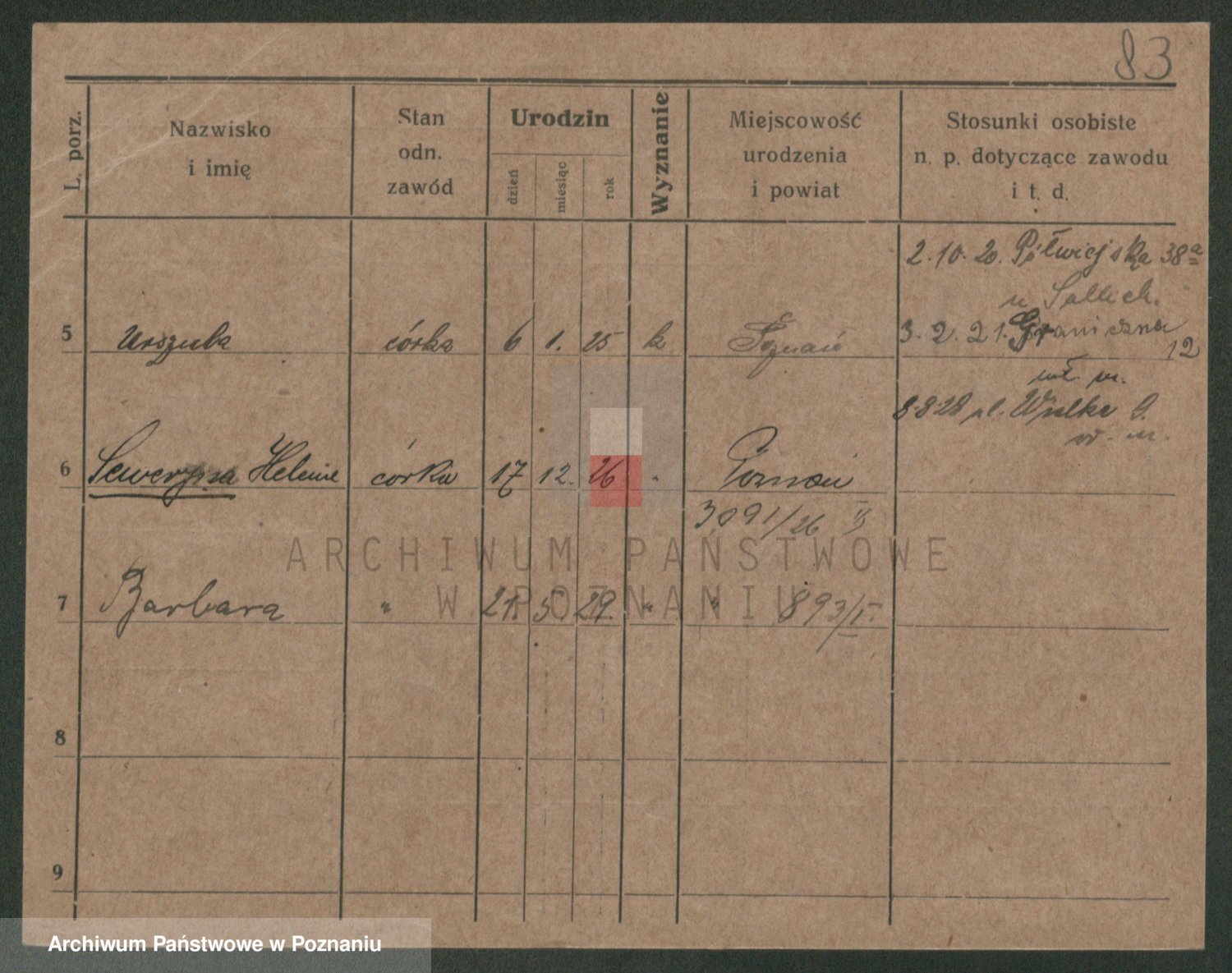 Podgląd karty osobowej dostępny jest po kliknięciu na nazwisko lub ikonkę karty. Można dokonywać powiększenia (ikony na górze) lub przechodzić między kolejnymi skanami (strzałki po bokach).