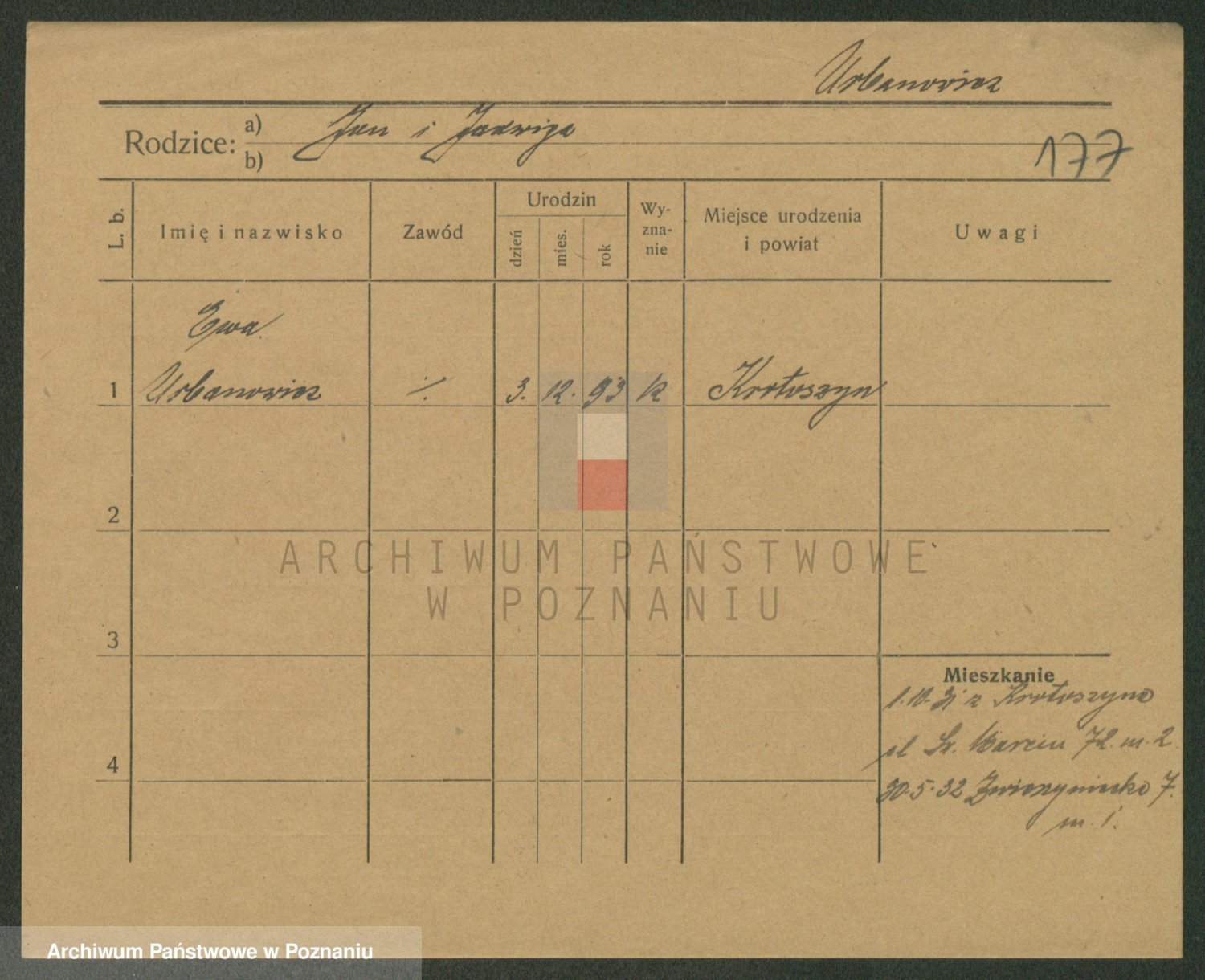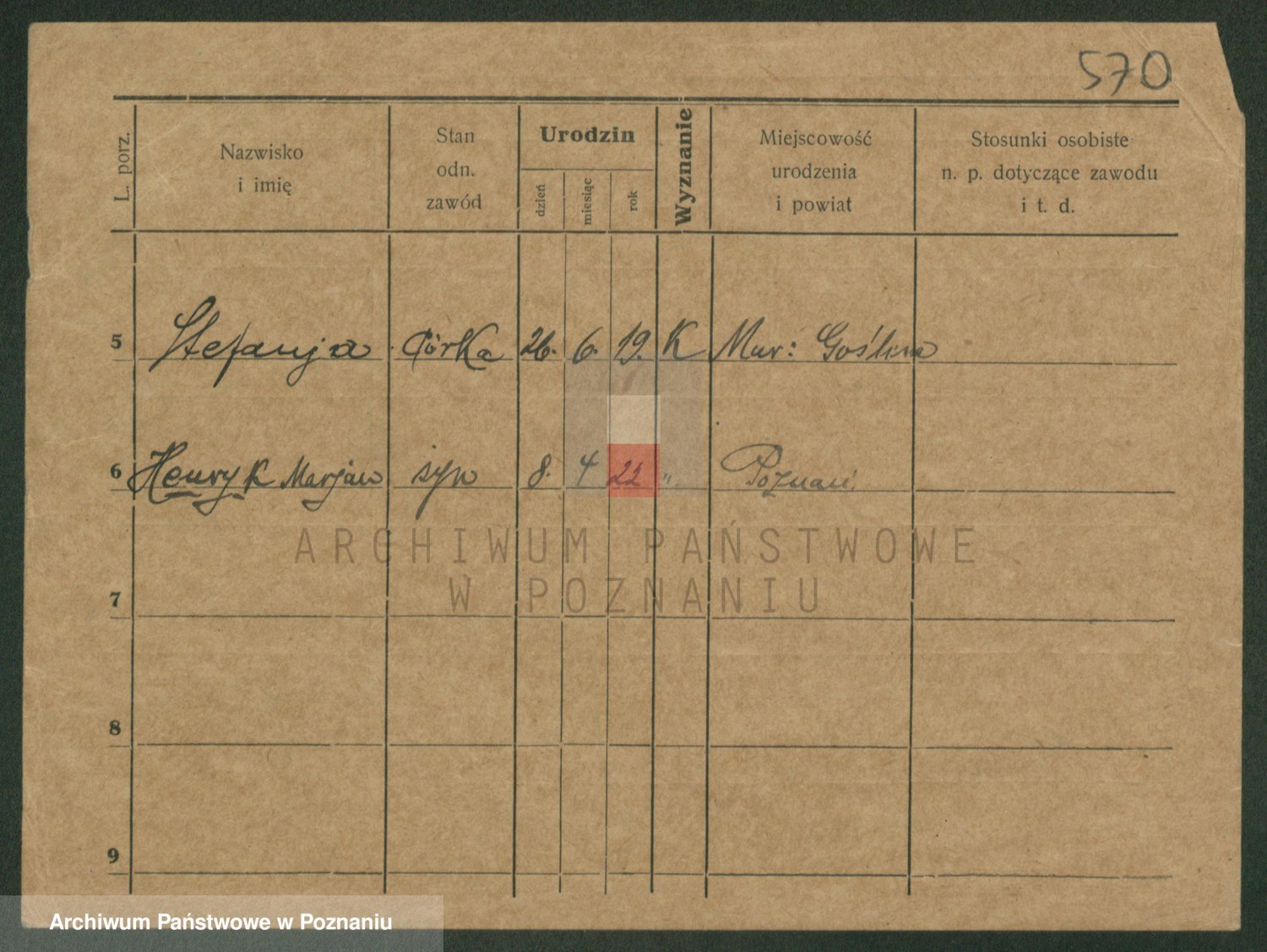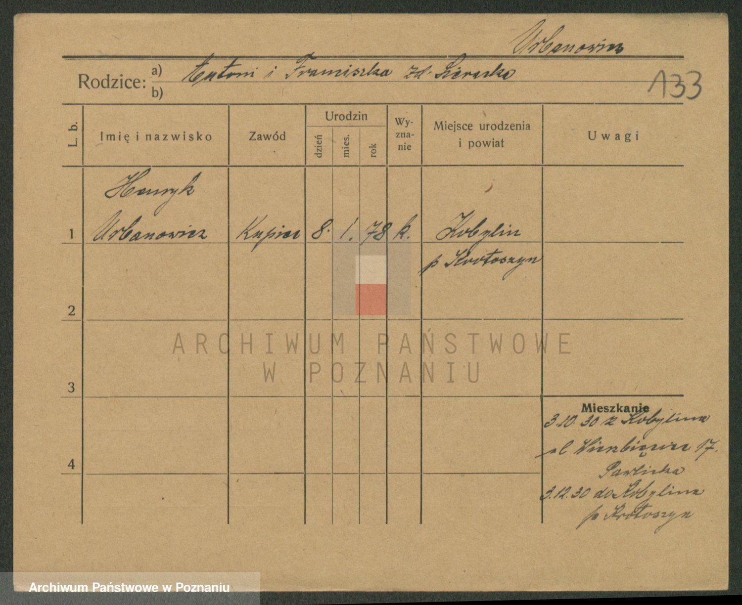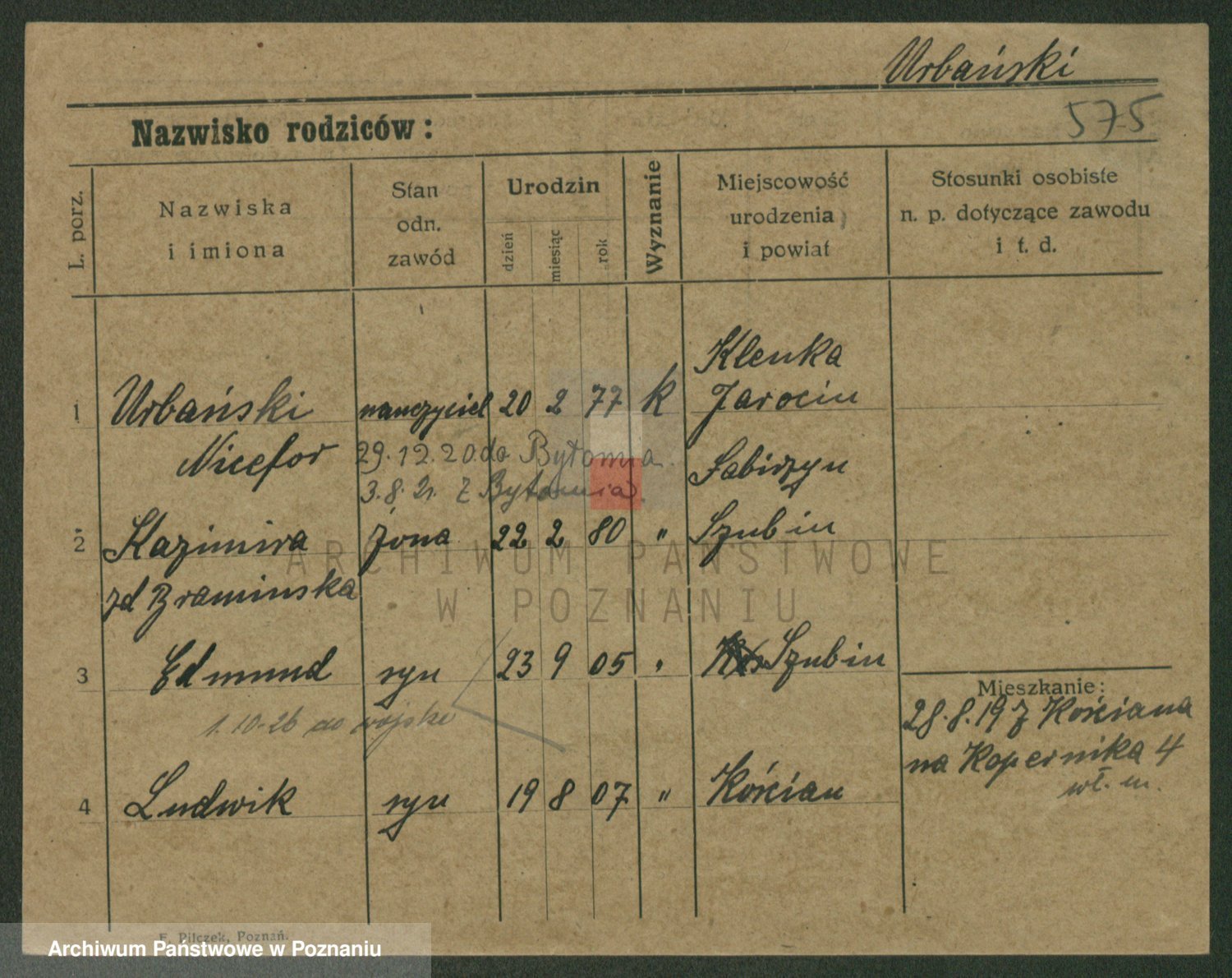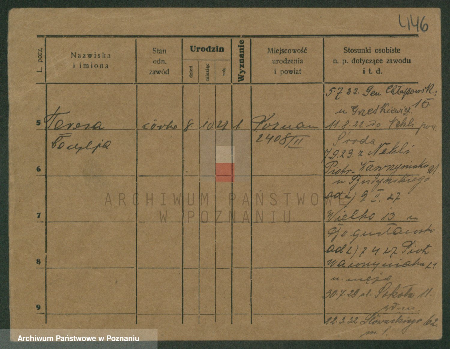 Podgląd karty osobowej dostępny jest po kliknięciu na nazwisko lub ikonkę karty. Można dokonywać powiększenia (ikony na górze) lub przechodzić między kolejnymi skanami (strzałki po bokach).