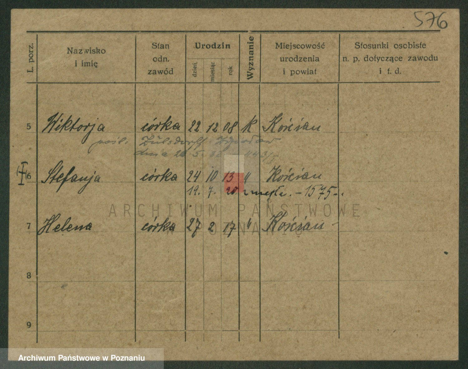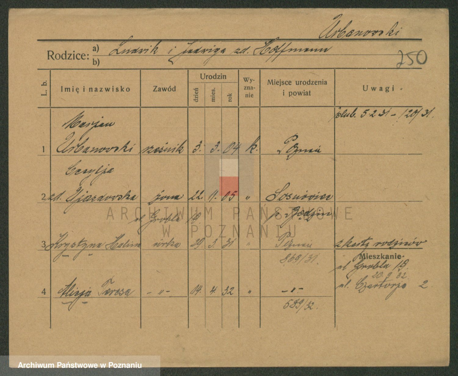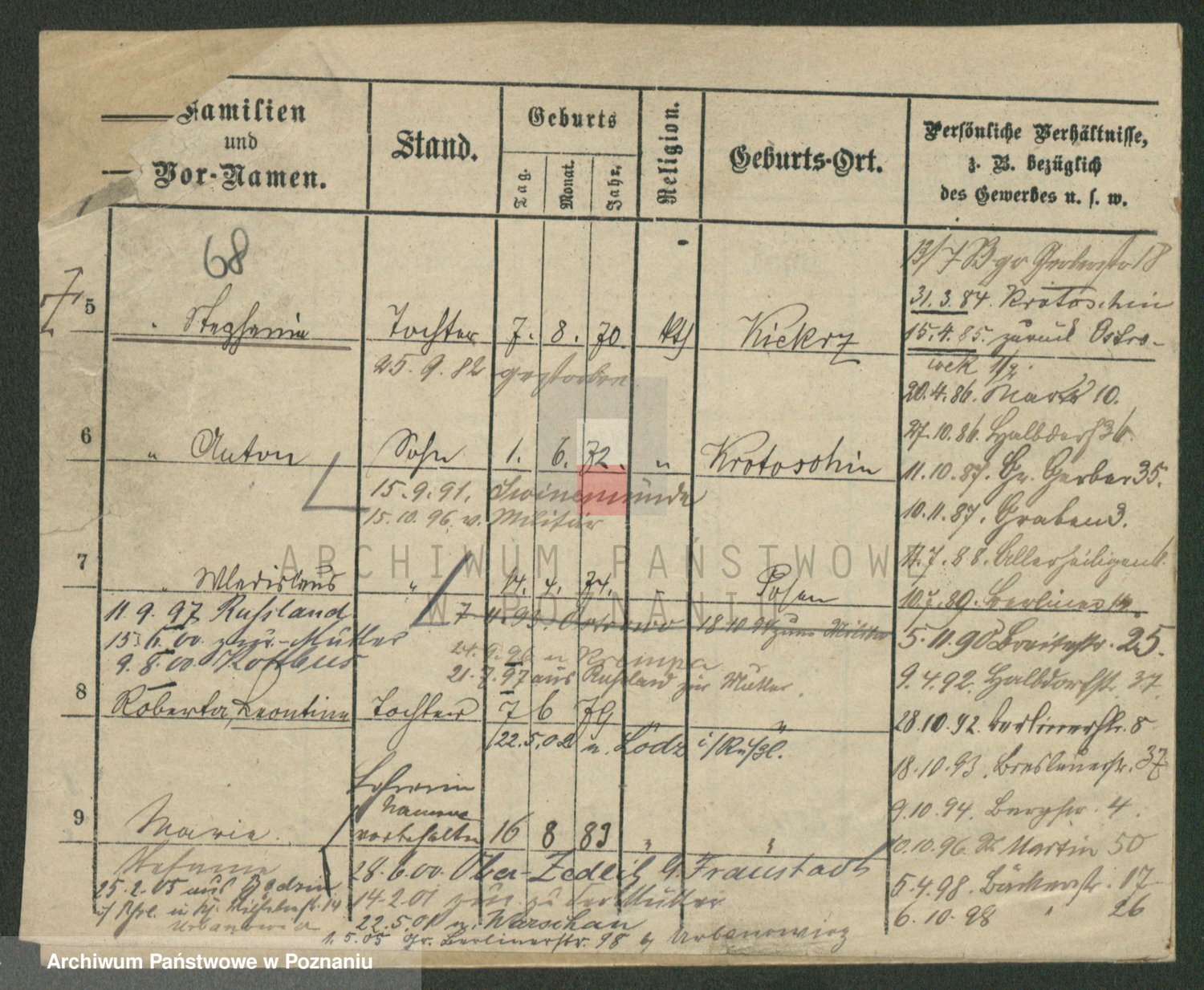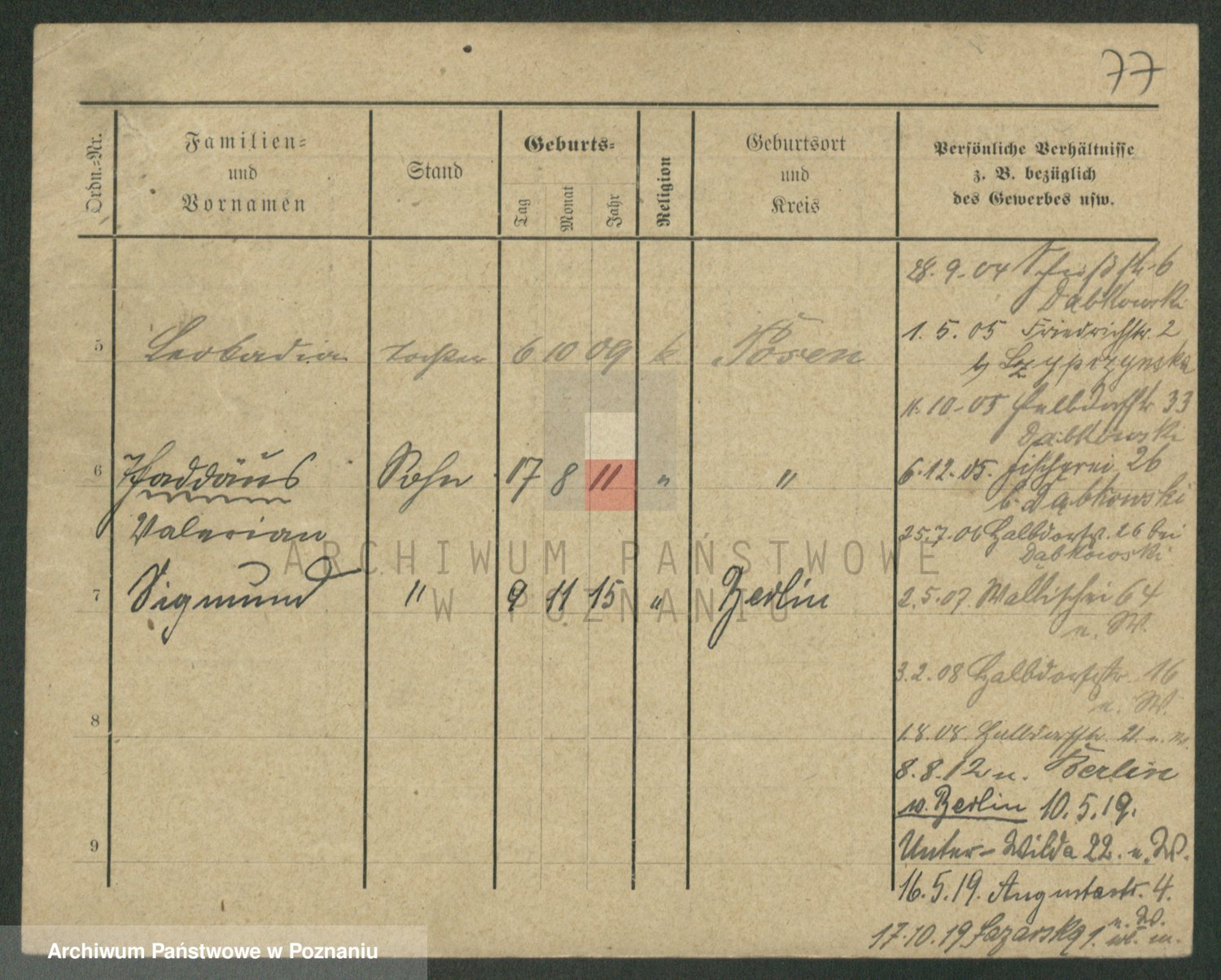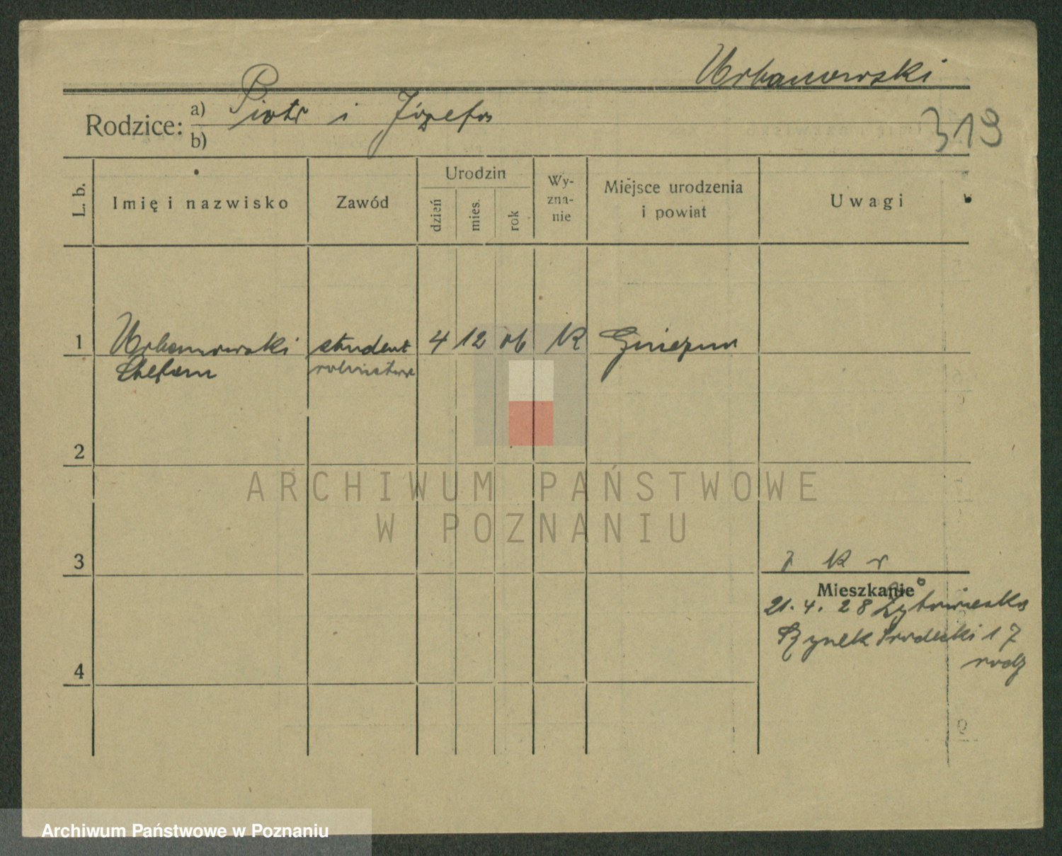 Podgląd karty osobowej dostępny jest po kliknięciu na nazwisko lub ikonkę karty. Można dokonywać powiększenia (ikony na górze) lub przechodzić między kolejnymi skanami (strzałki po bokach).