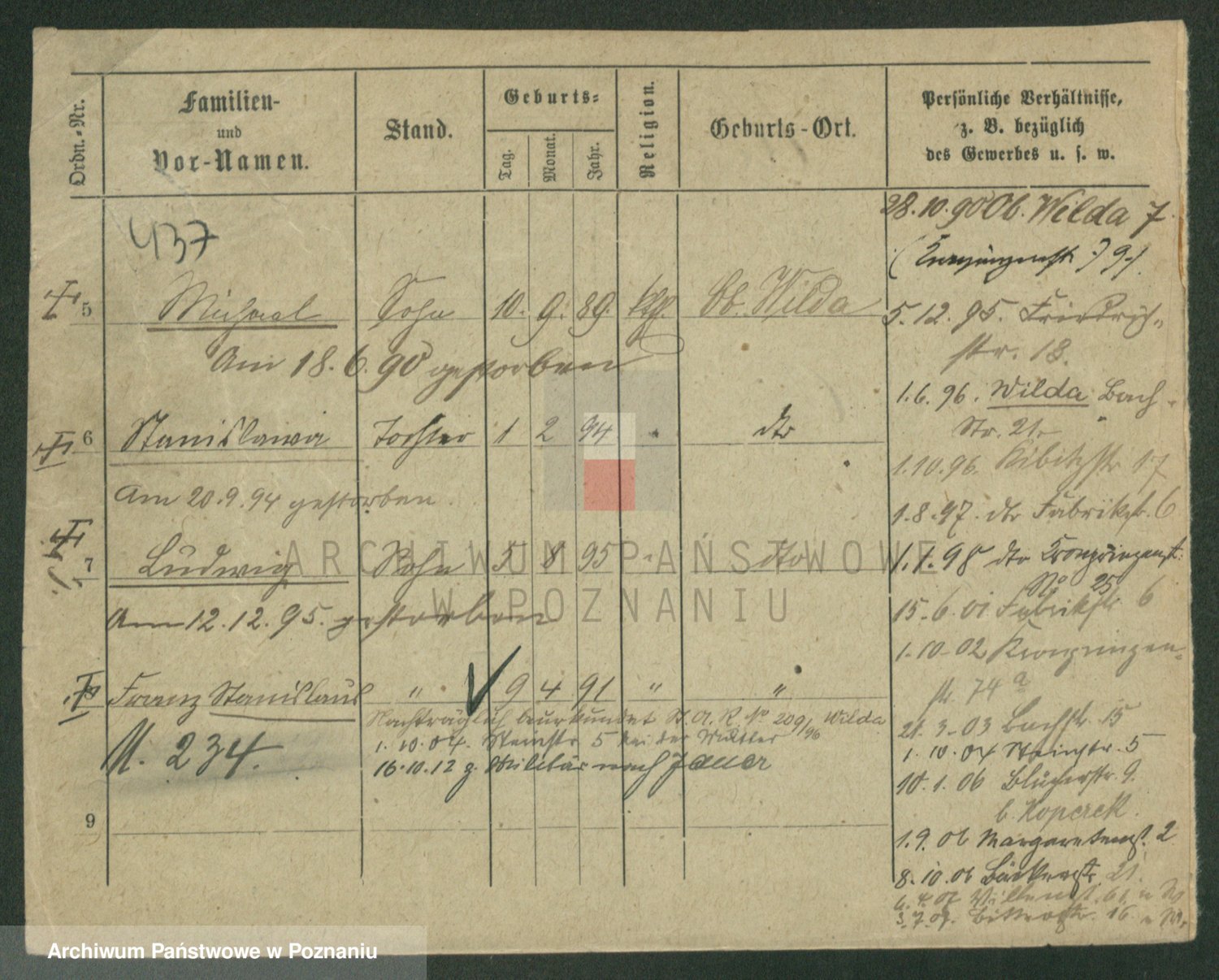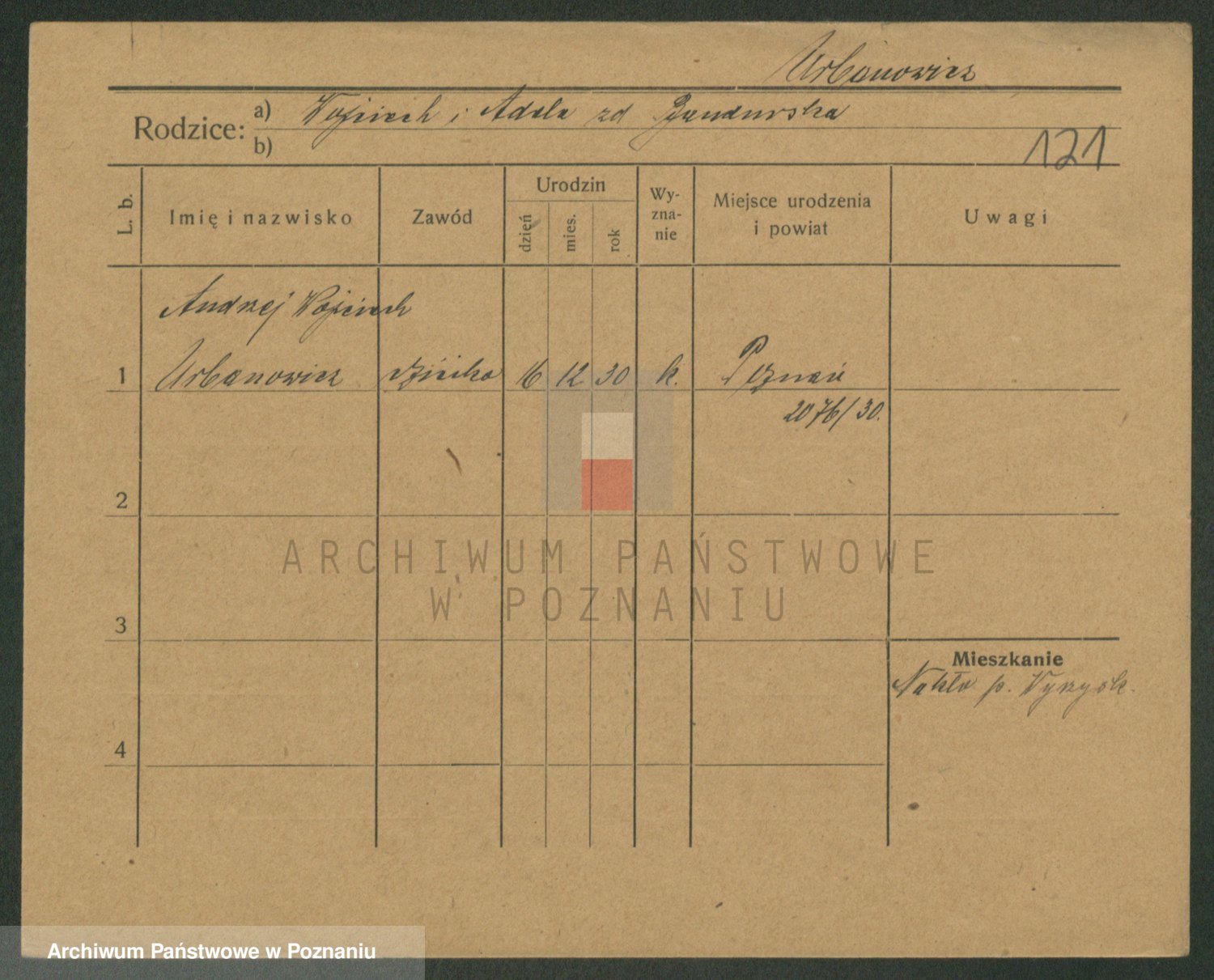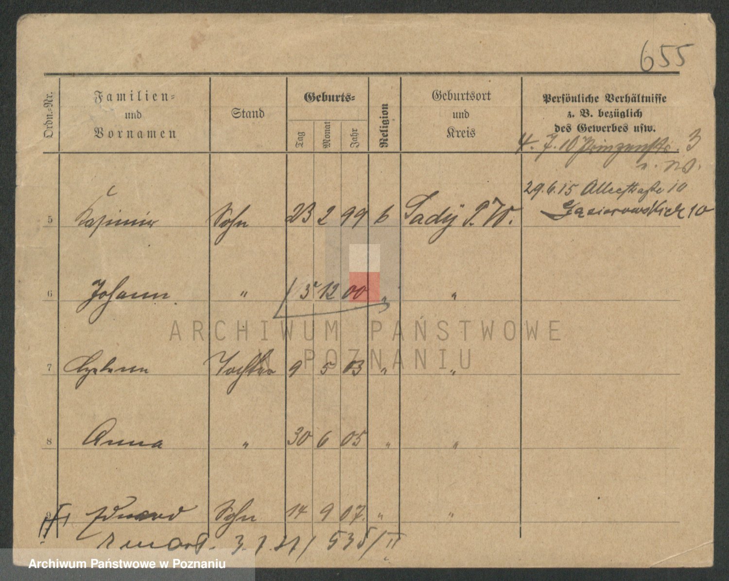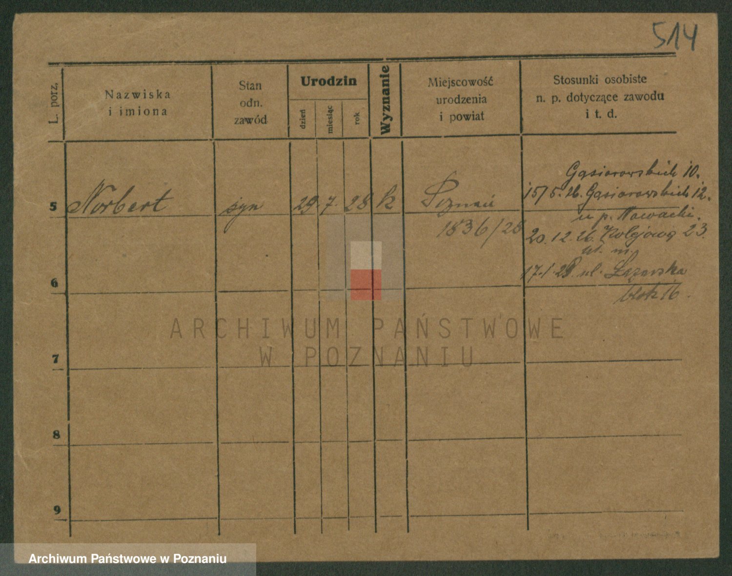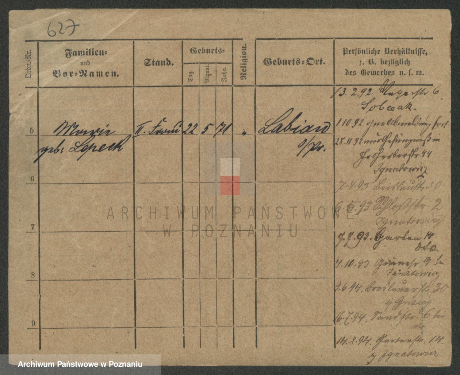 Podgląd karty osobowej dostępny jest po kliknięciu na nazwisko lub ikonkę karty. Można dokonywać powiększenia (ikony na górze) lub przechodzić między kolejnymi skanami (strzałki po bokach).