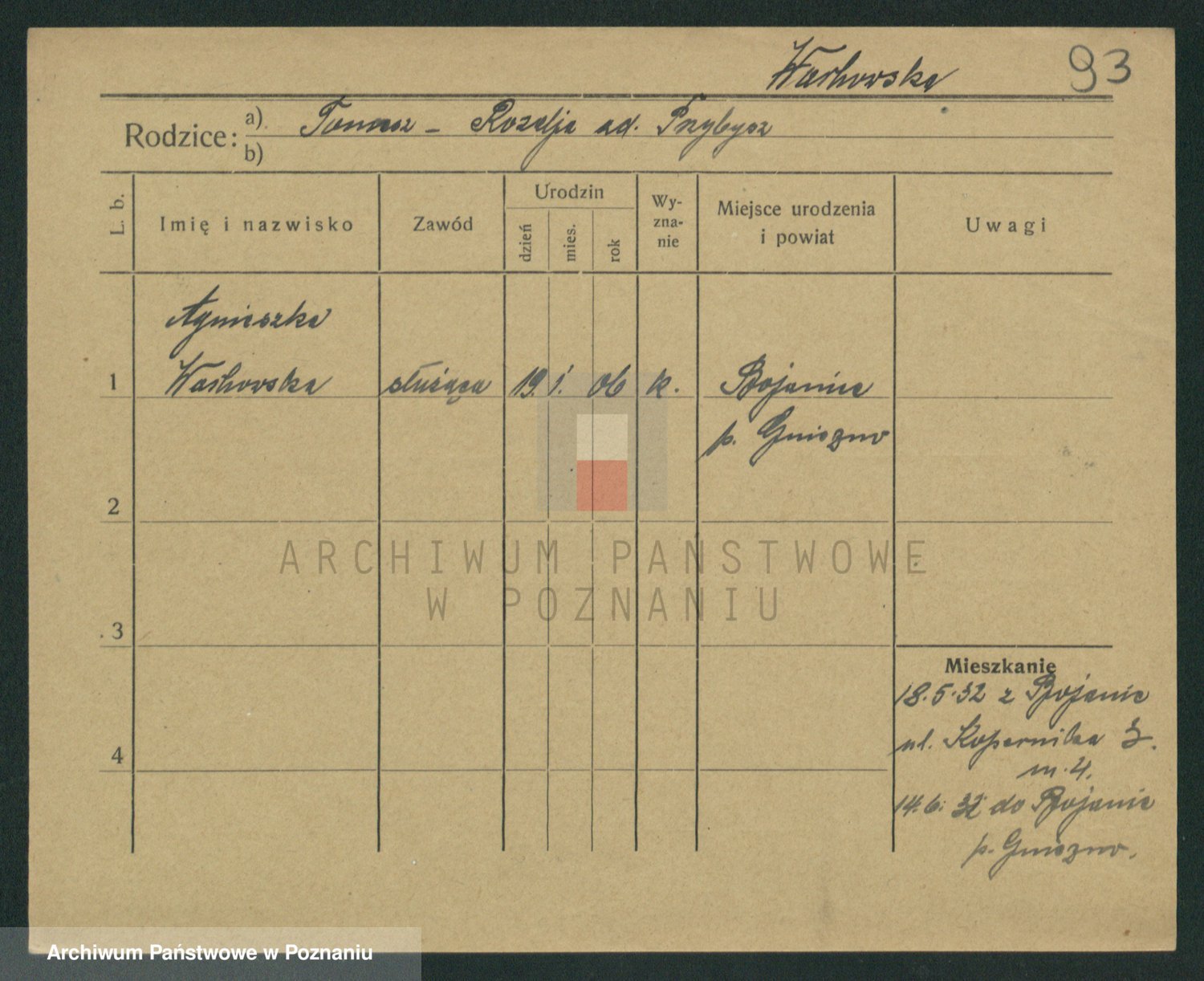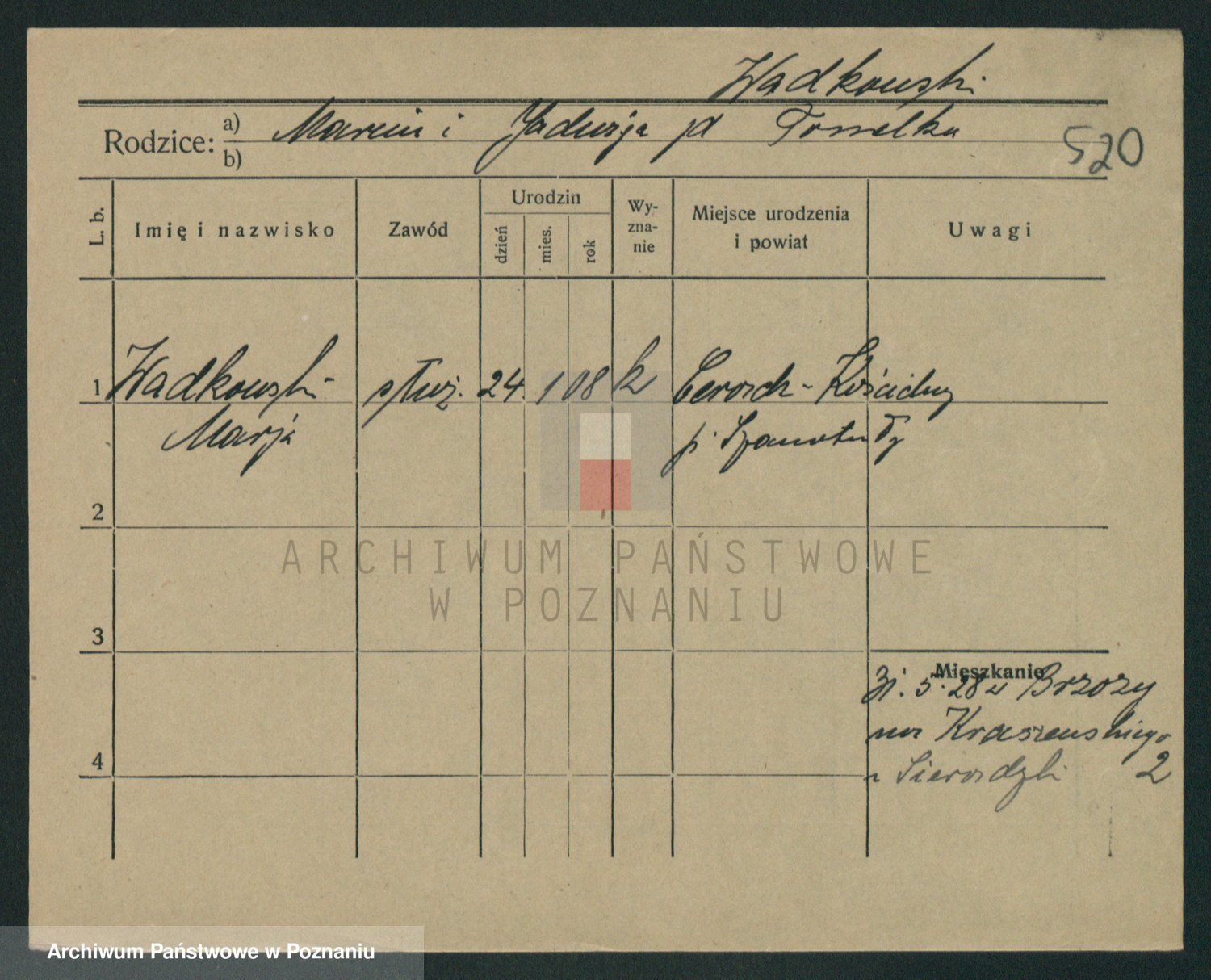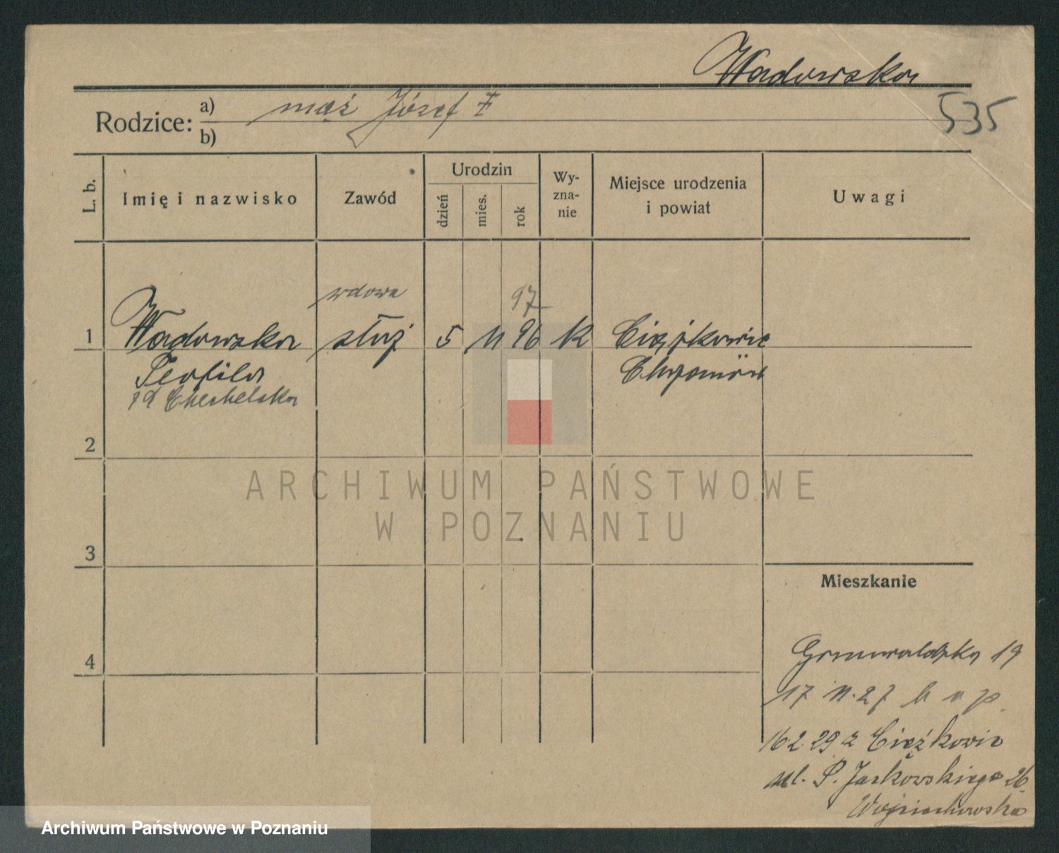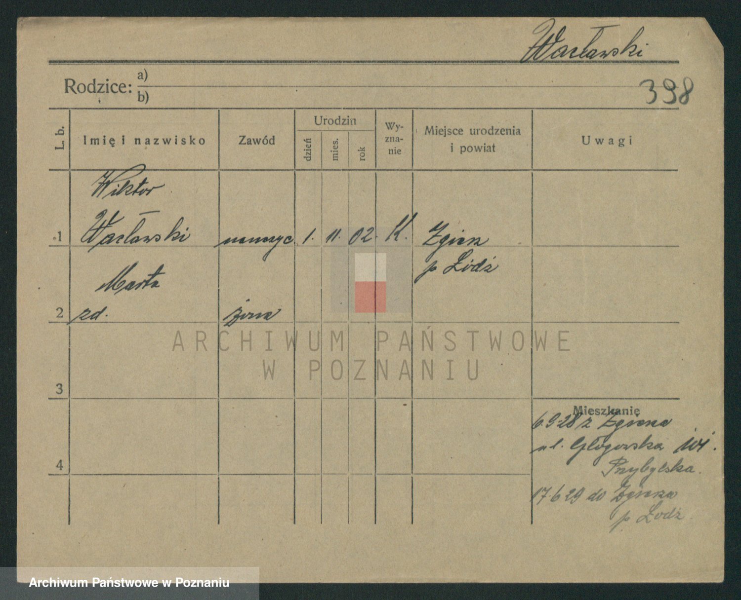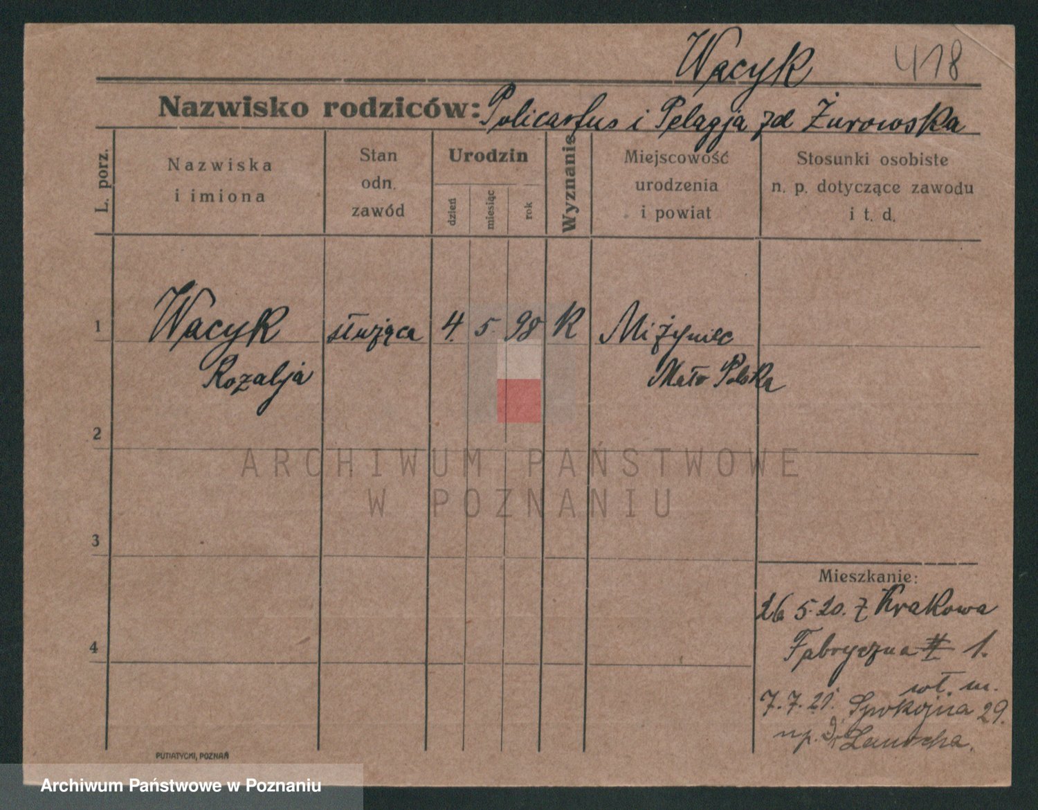 Podgląd karty osobowej dostępny jest po kliknięciu na nazwisko lub ikonkę karty. Można dokonywać powiększenia (ikony na górze) lub przechodzić między kolejnymi skanami (strzałki po bokach).