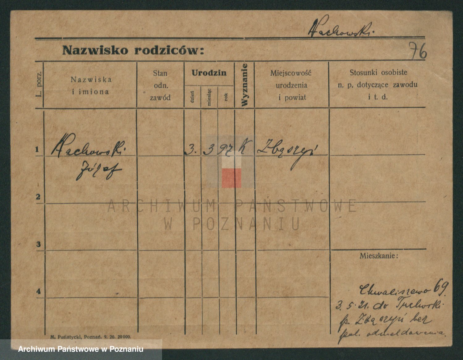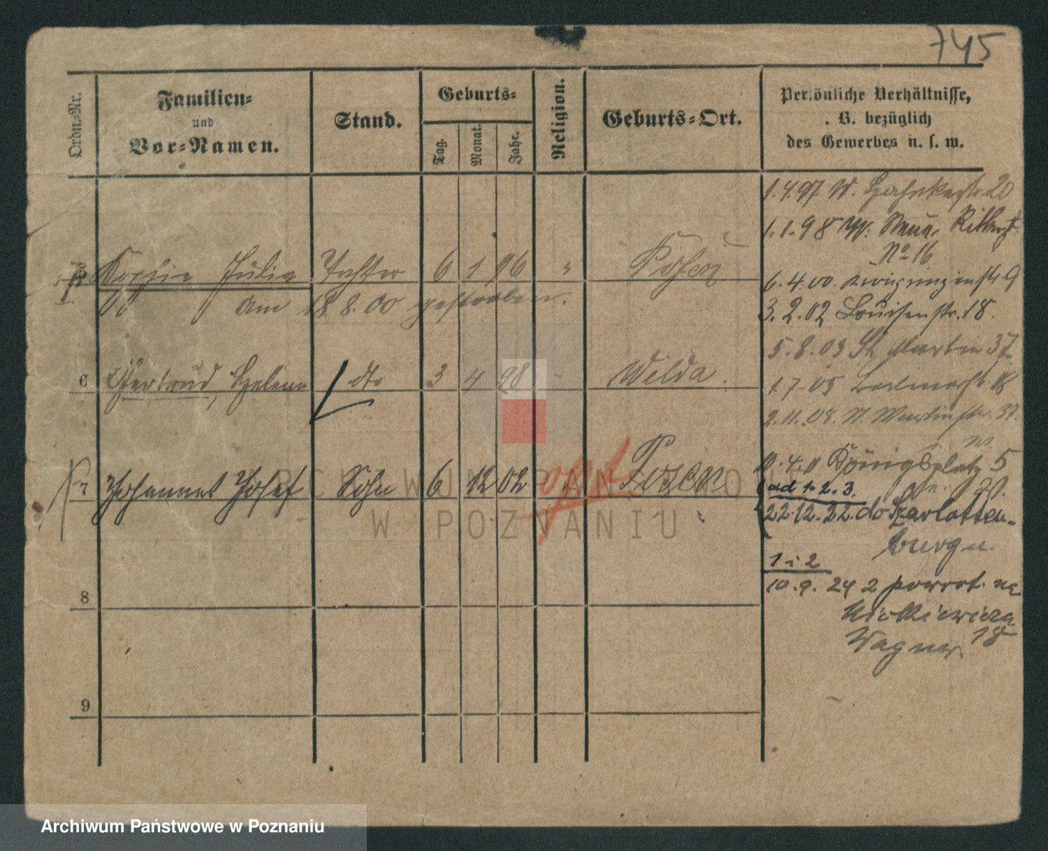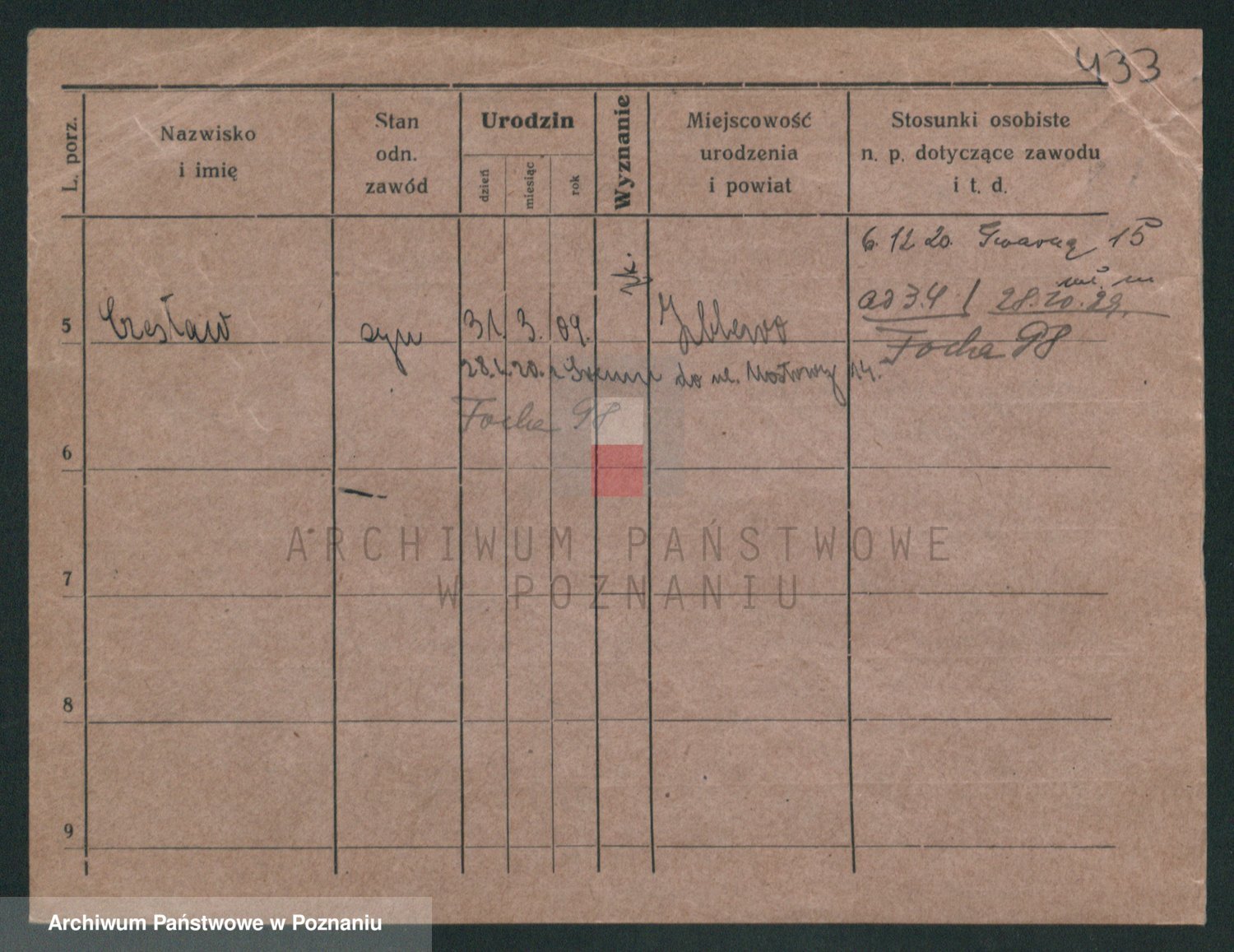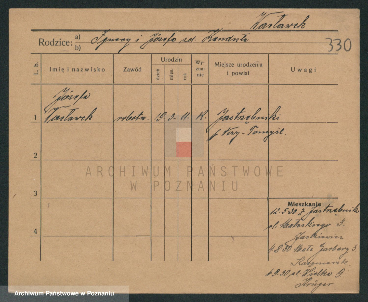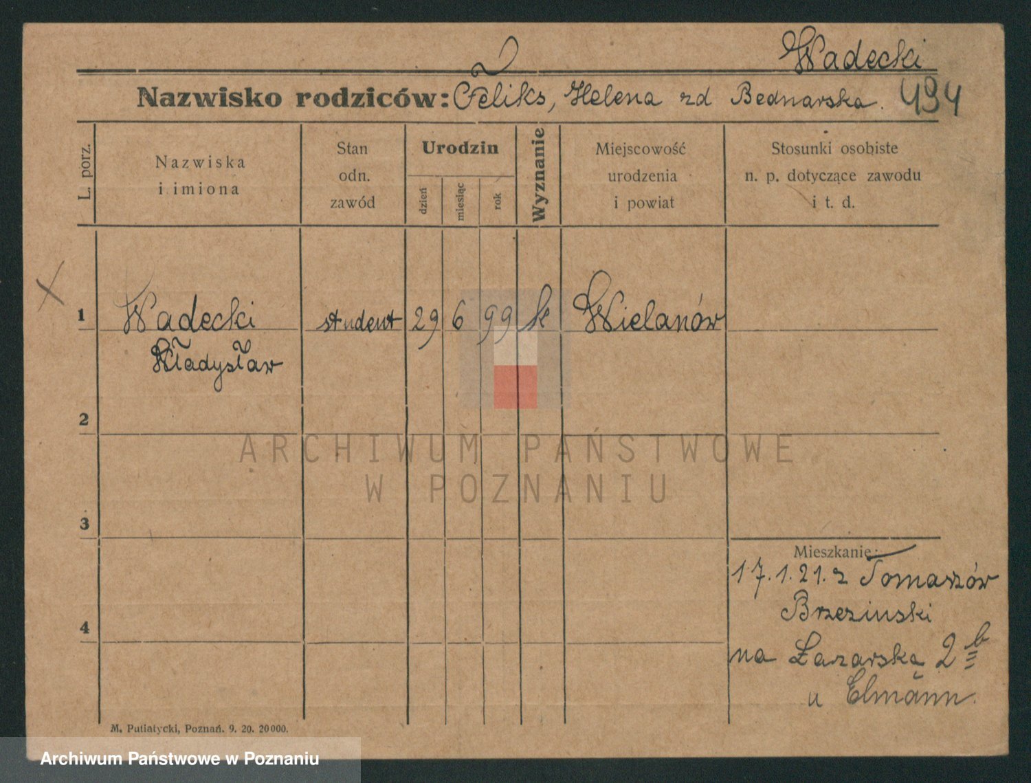 Podgląd karty osobowej dostępny jest po kliknięciu na nazwisko lub ikonkę karty. Można dokonywać powiększenia (ikony na górze) lub przechodzić między kolejnymi skanami (strzałki po bokach).