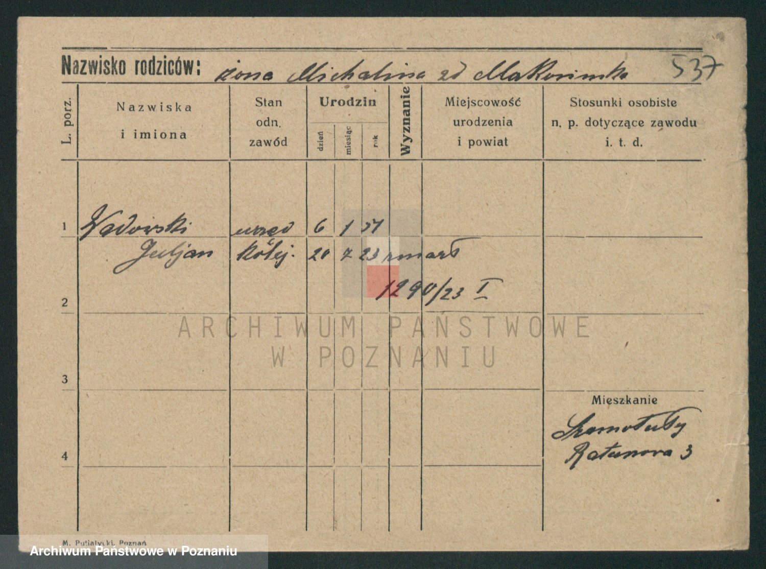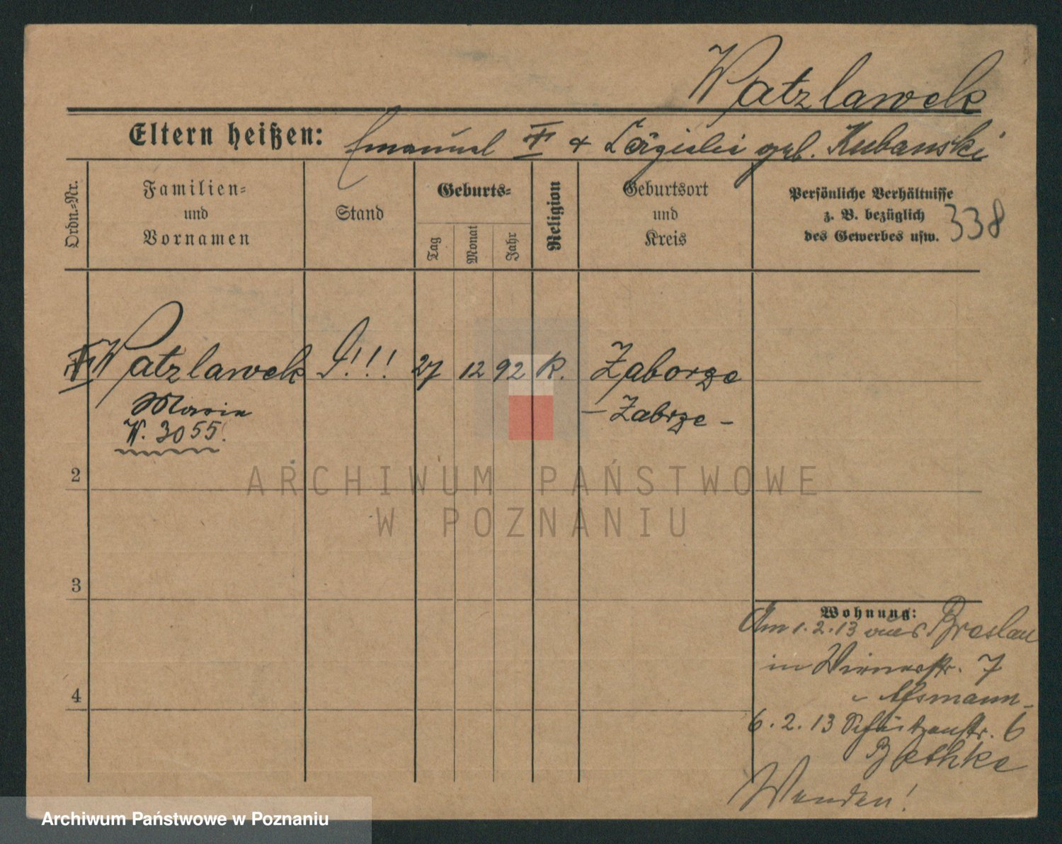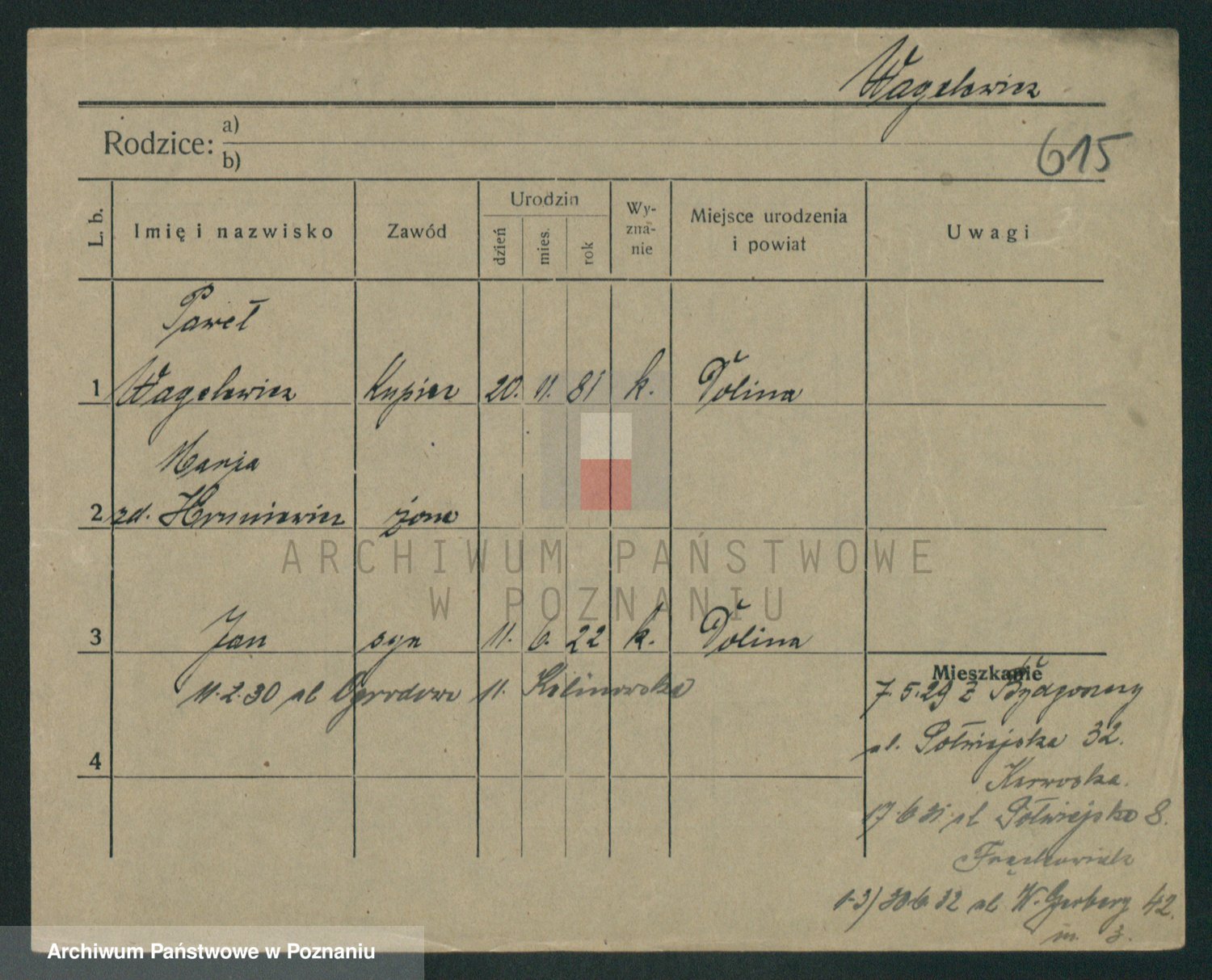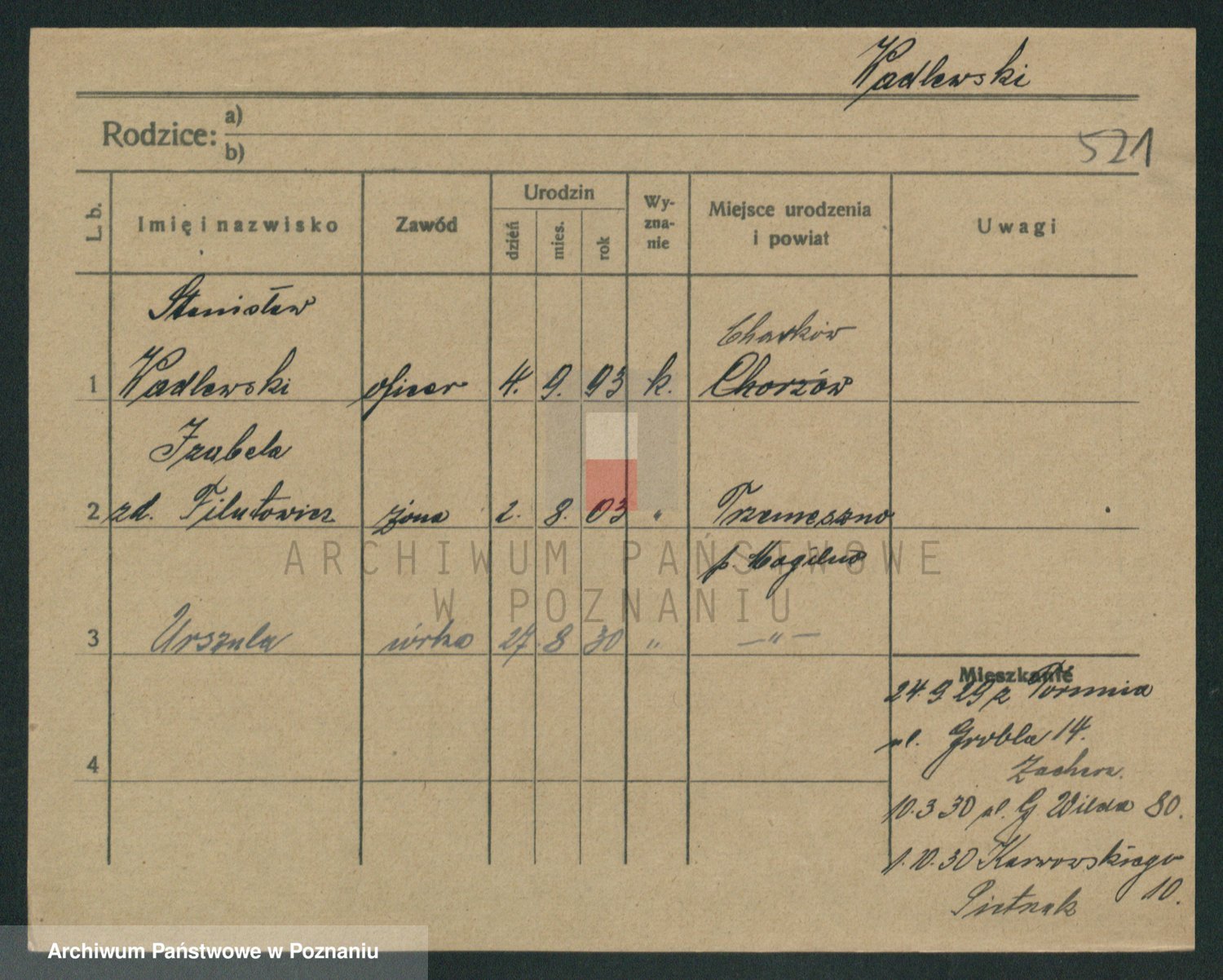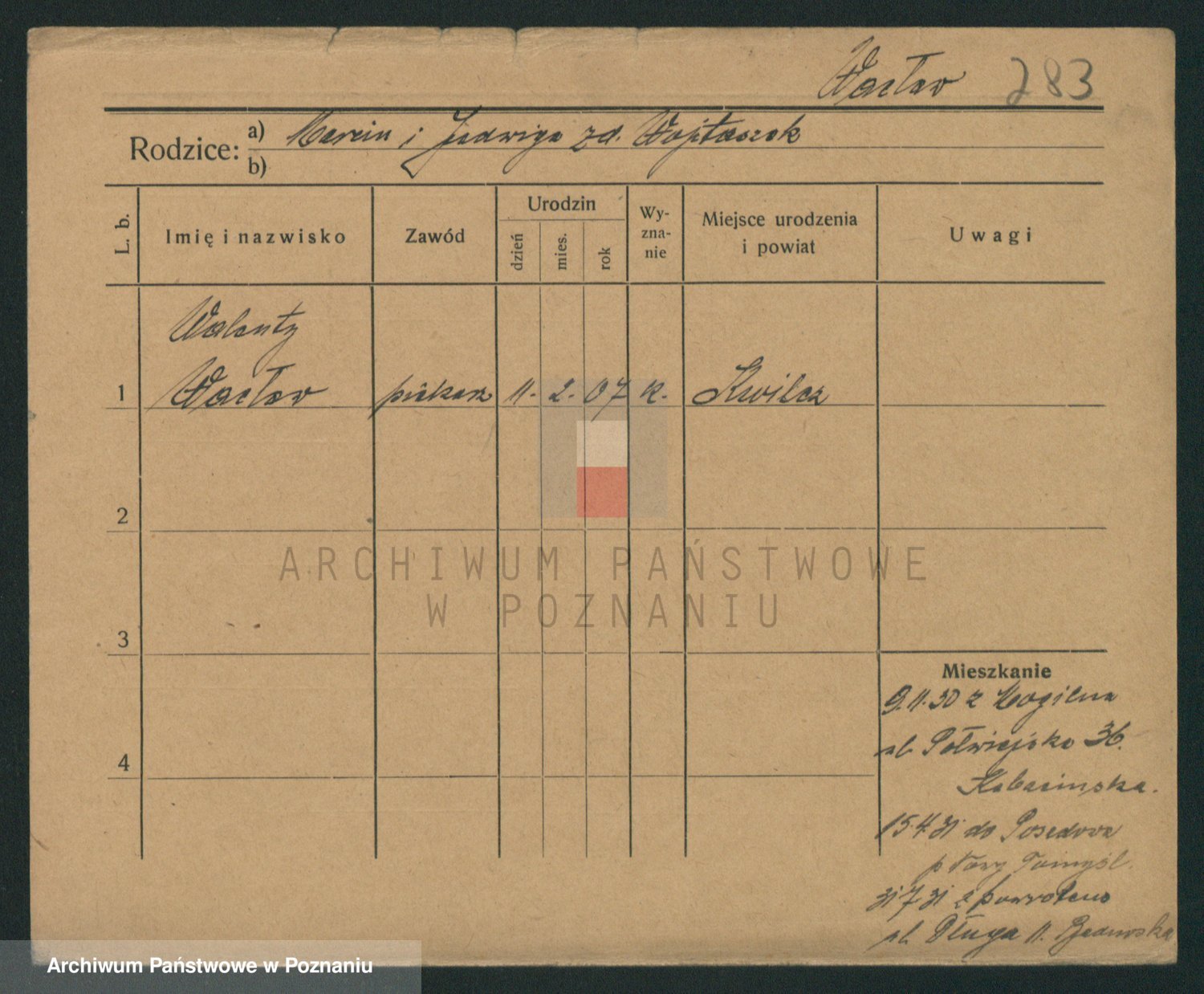 Podgląd karty osobowej dostępny jest po kliknięciu na nazwisko lub ikonkę karty. Można dokonywać powiększenia (ikony na górze) lub przechodzić między kolejnymi skanami (strzałki po bokach).