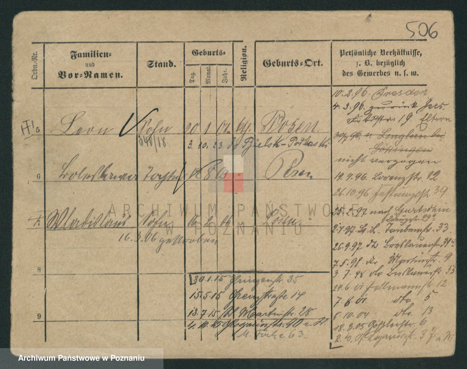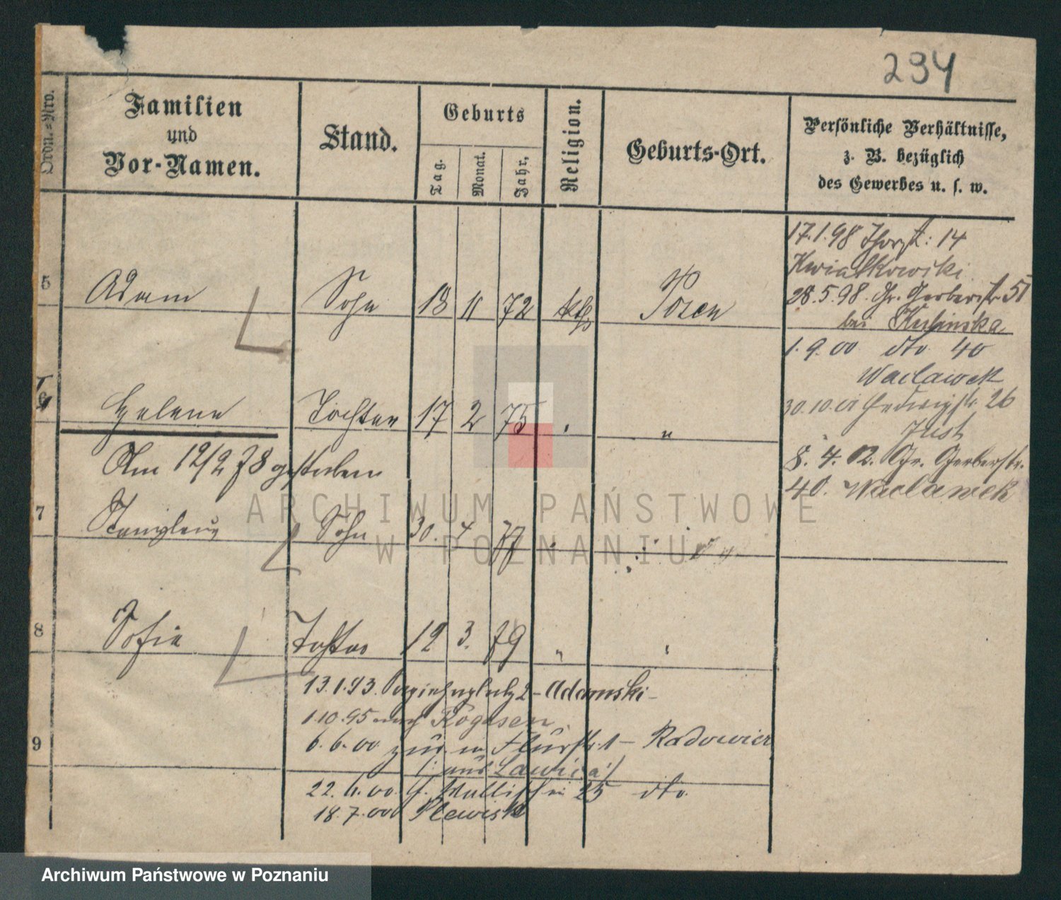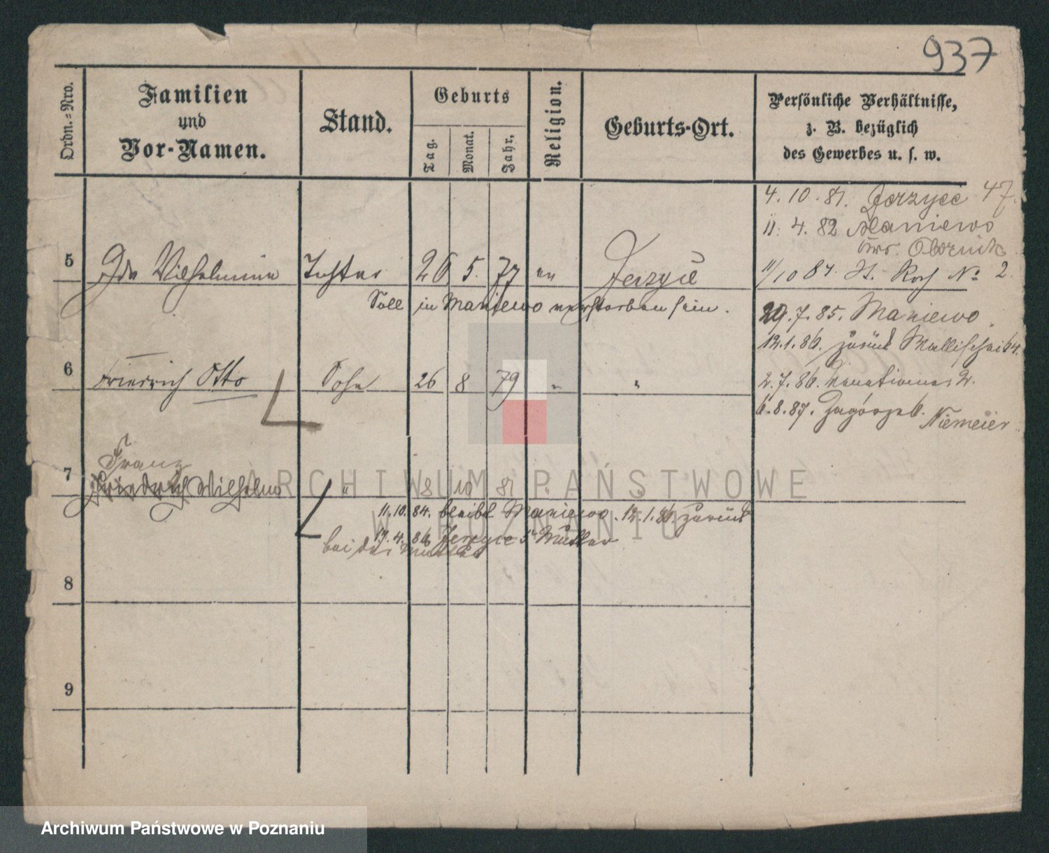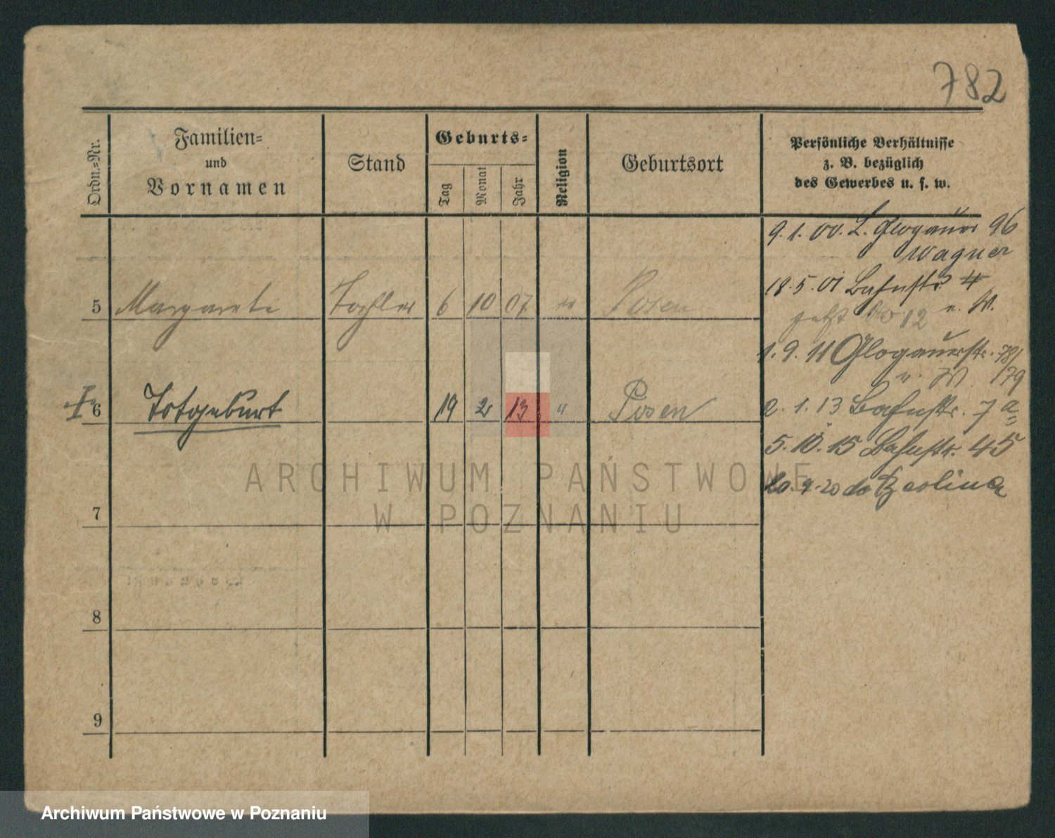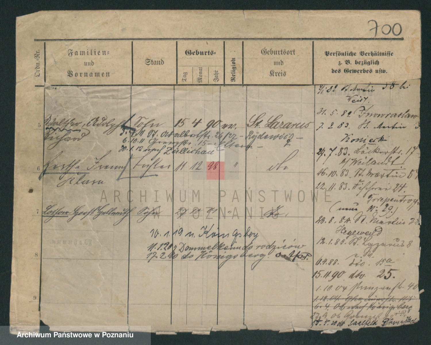 Podgląd karty osobowej dostępny jest po kliknięciu na nazwisko lub ikonkę karty. Można dokonywać powiększenia (ikony na górze) lub przechodzić między kolejnymi skanami (strzałki po bokach).