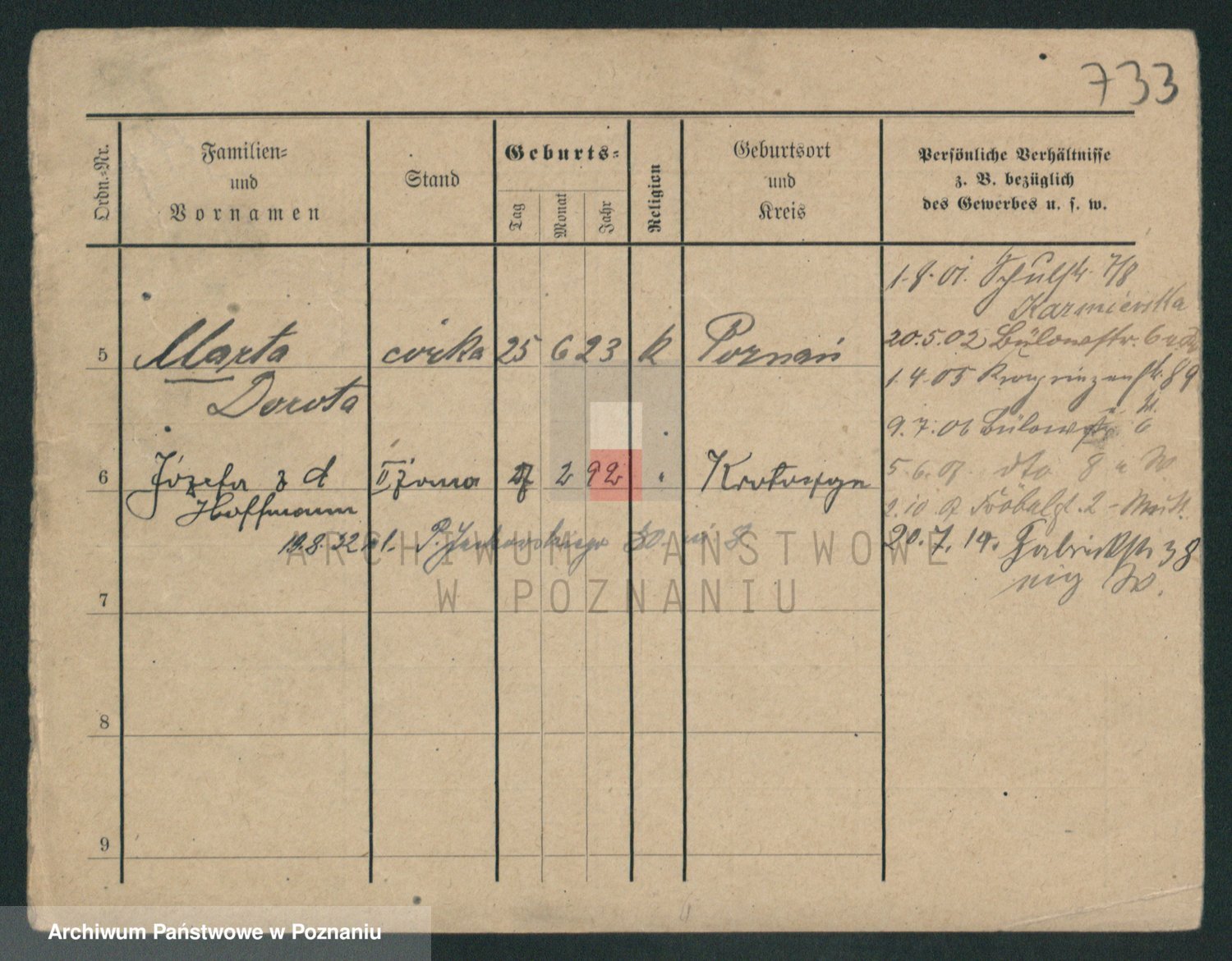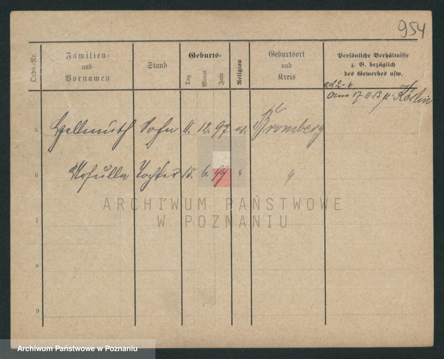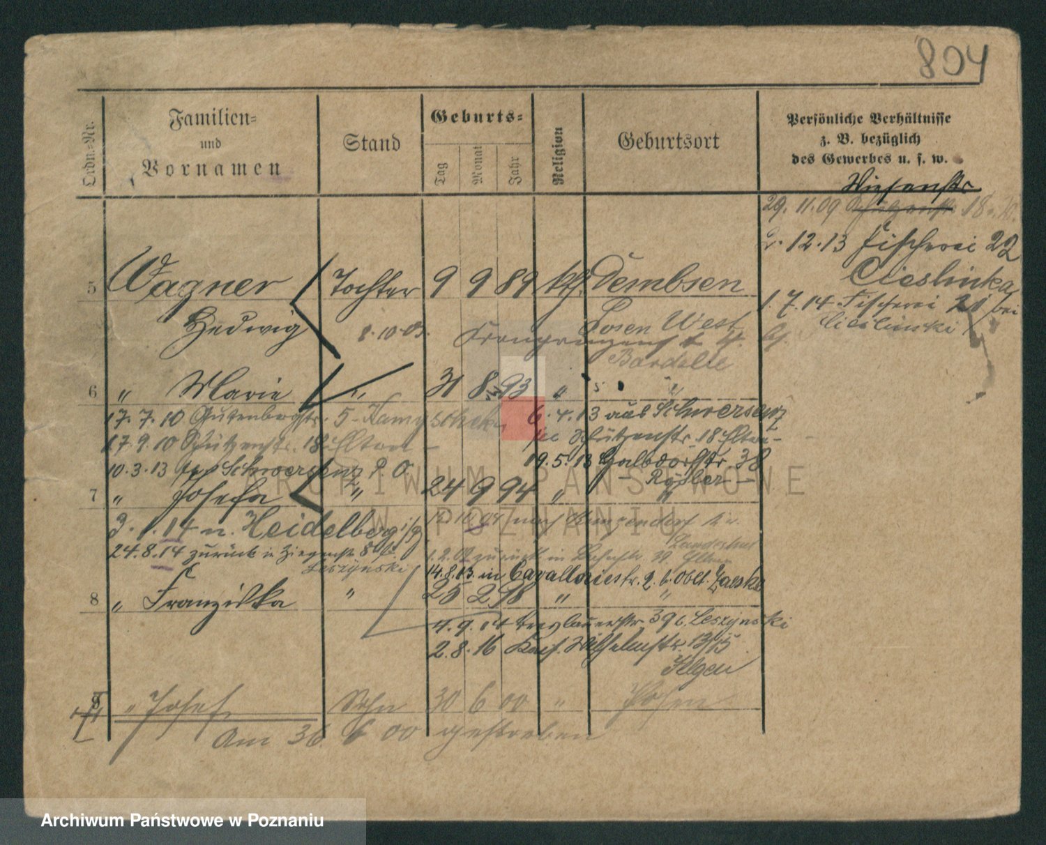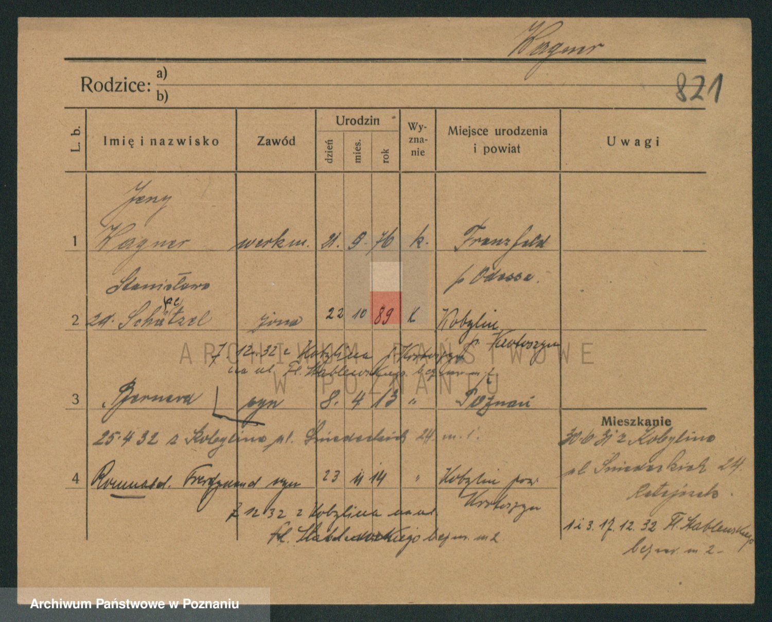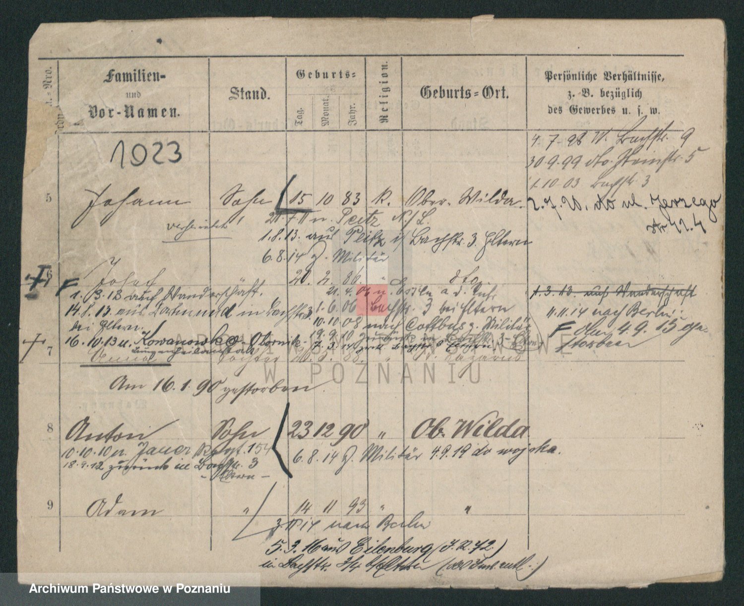 Podgląd karty osobowej dostępny jest po kliknięciu na nazwisko lub ikonkę karty. Można dokonywać powiększenia (ikony na górze) lub przechodzić między kolejnymi skanami (strzałki po bokach).