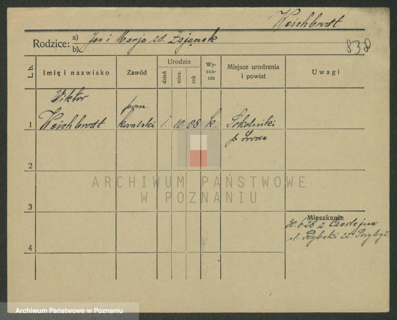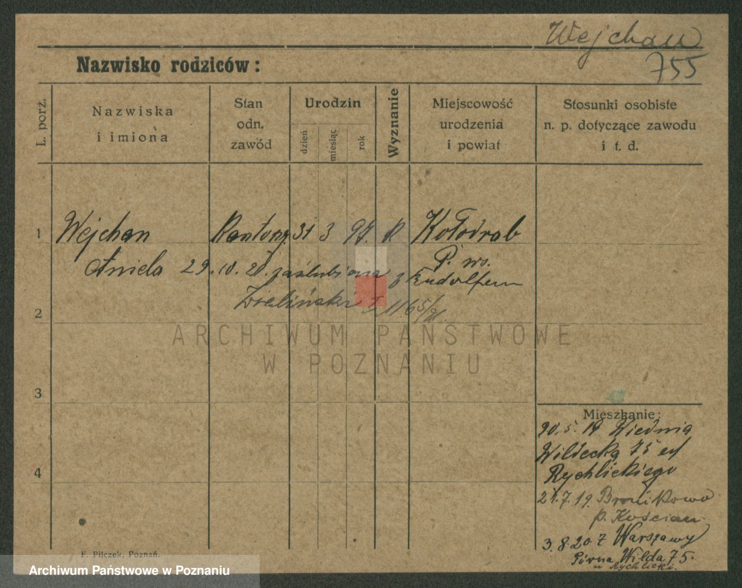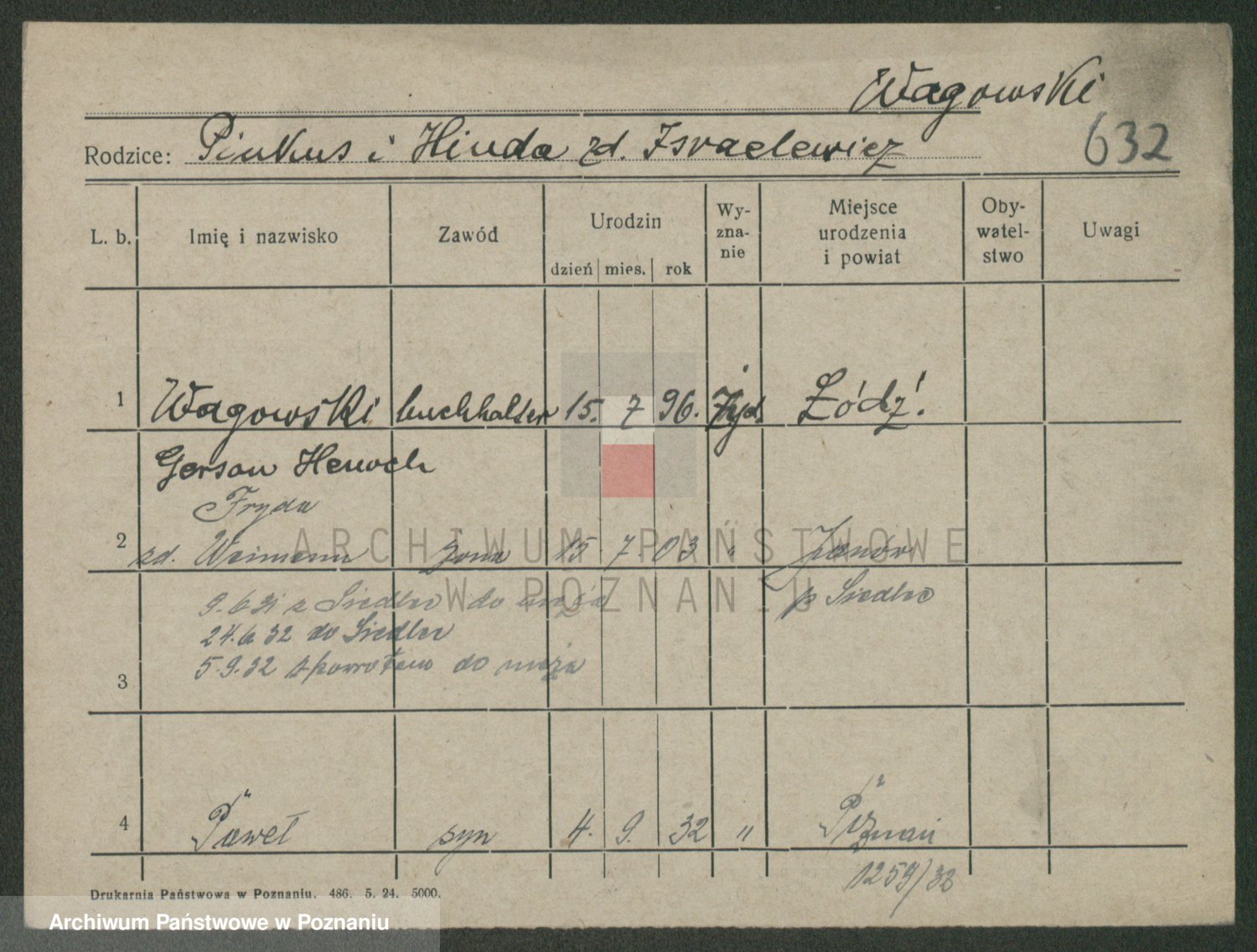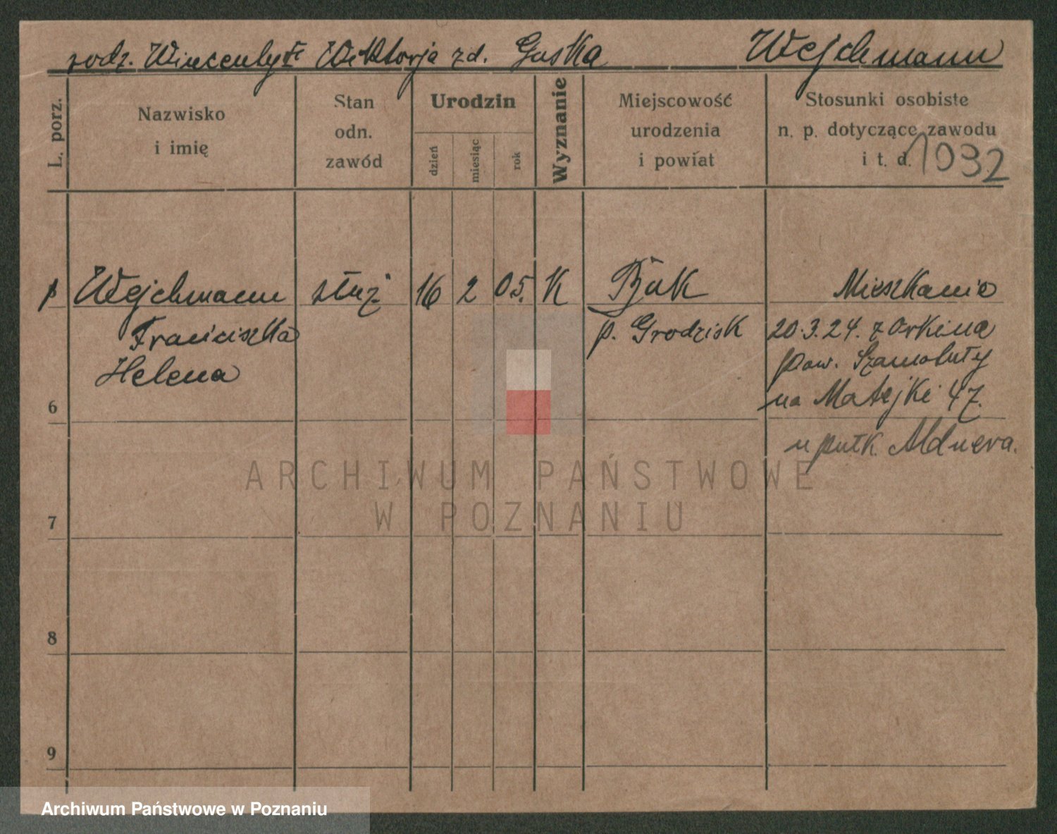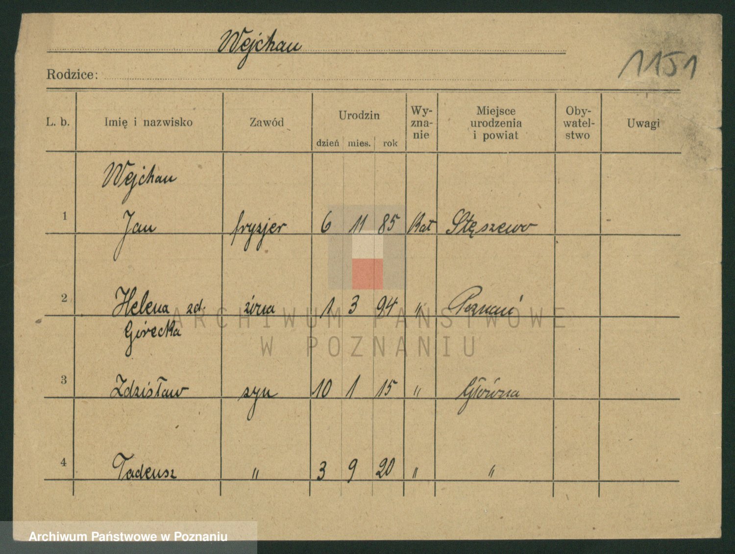 Podgląd karty osobowej dostępny jest po kliknięciu na nazwisko lub ikonkę karty. Można dokonywać powiększenia (ikony na górze) lub przechodzić między kolejnymi skanami (strzałki po bokach).