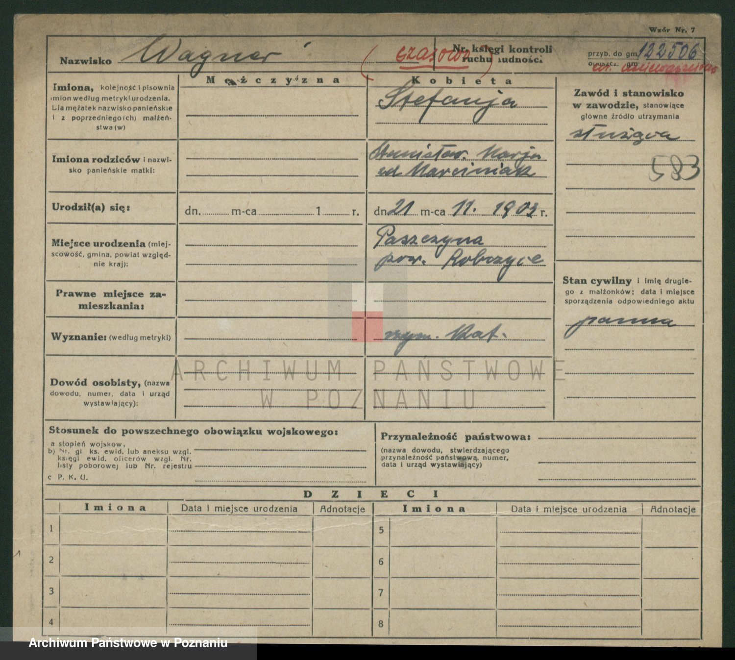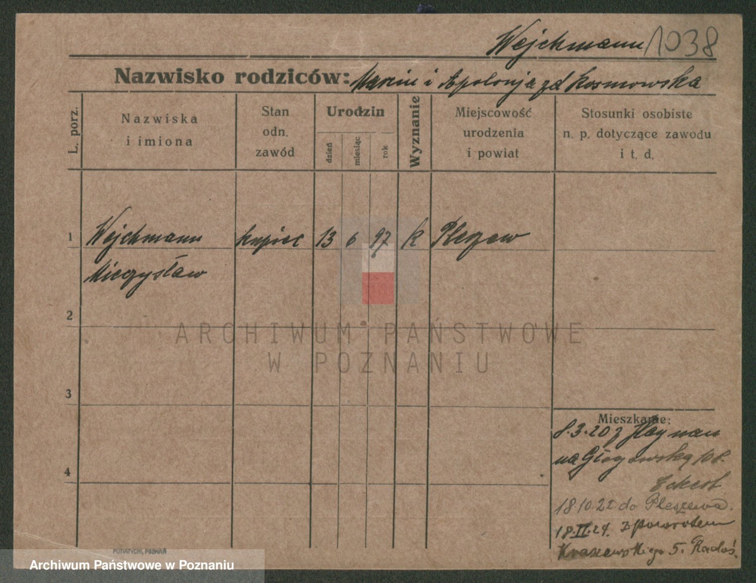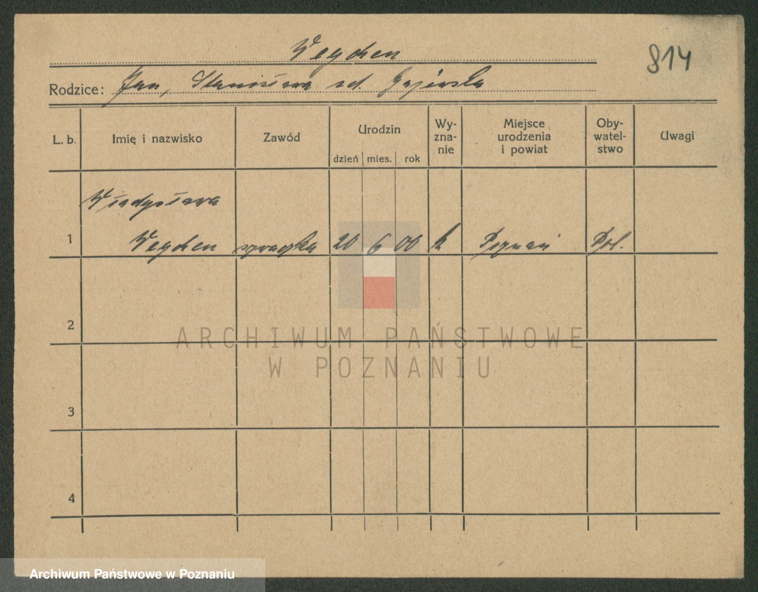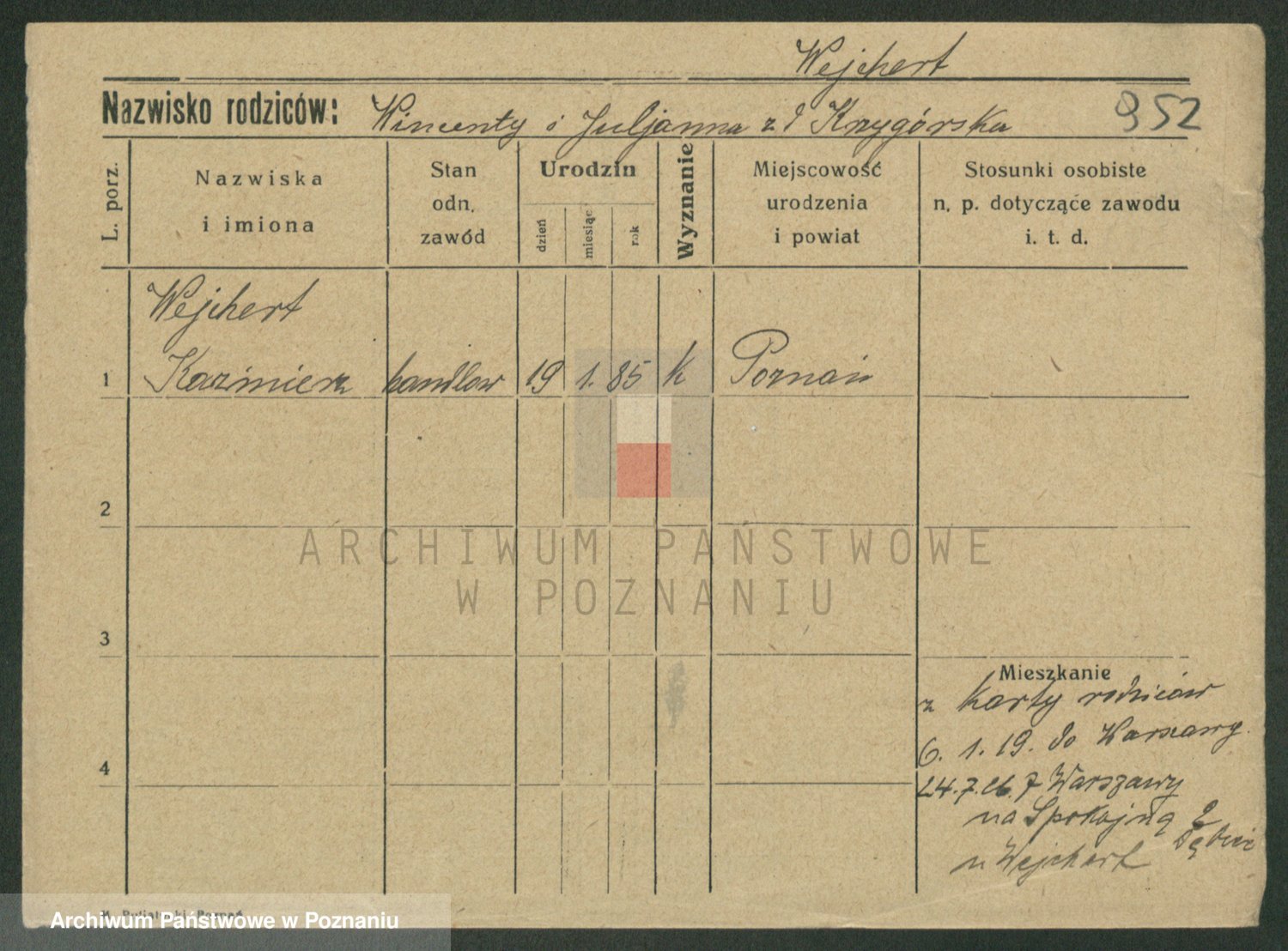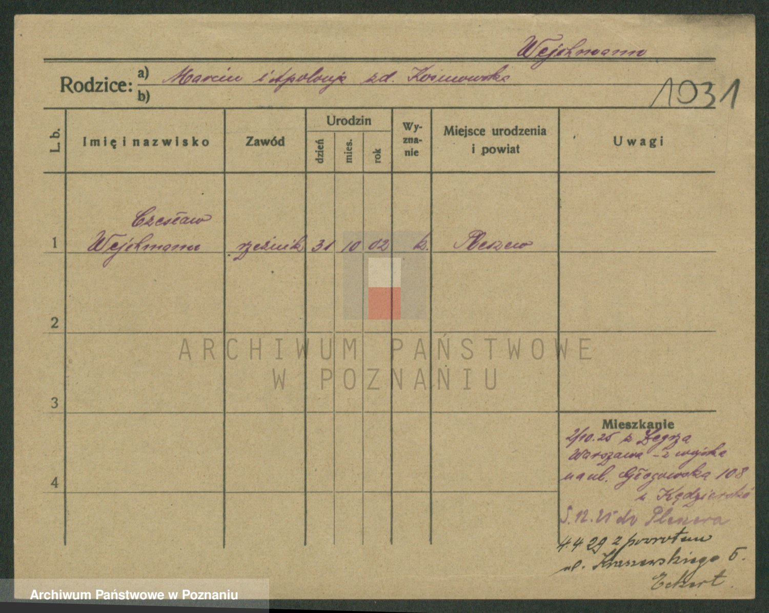 Podgląd karty osobowej dostępny jest po kliknięciu na nazwisko lub ikonkę karty. Można dokonywać powiększenia (ikony na górze) lub przechodzić między kolejnymi skanami (strzałki po bokach).