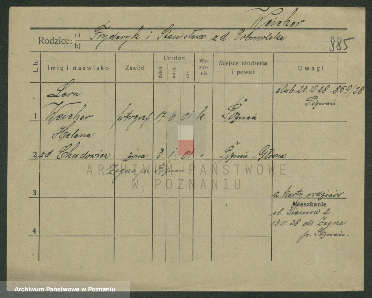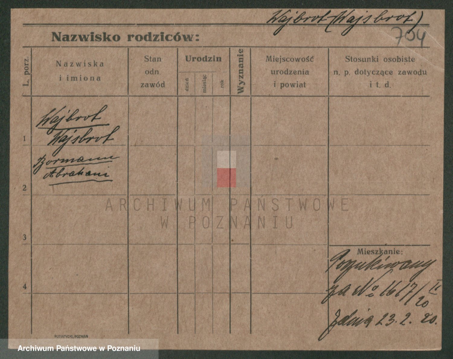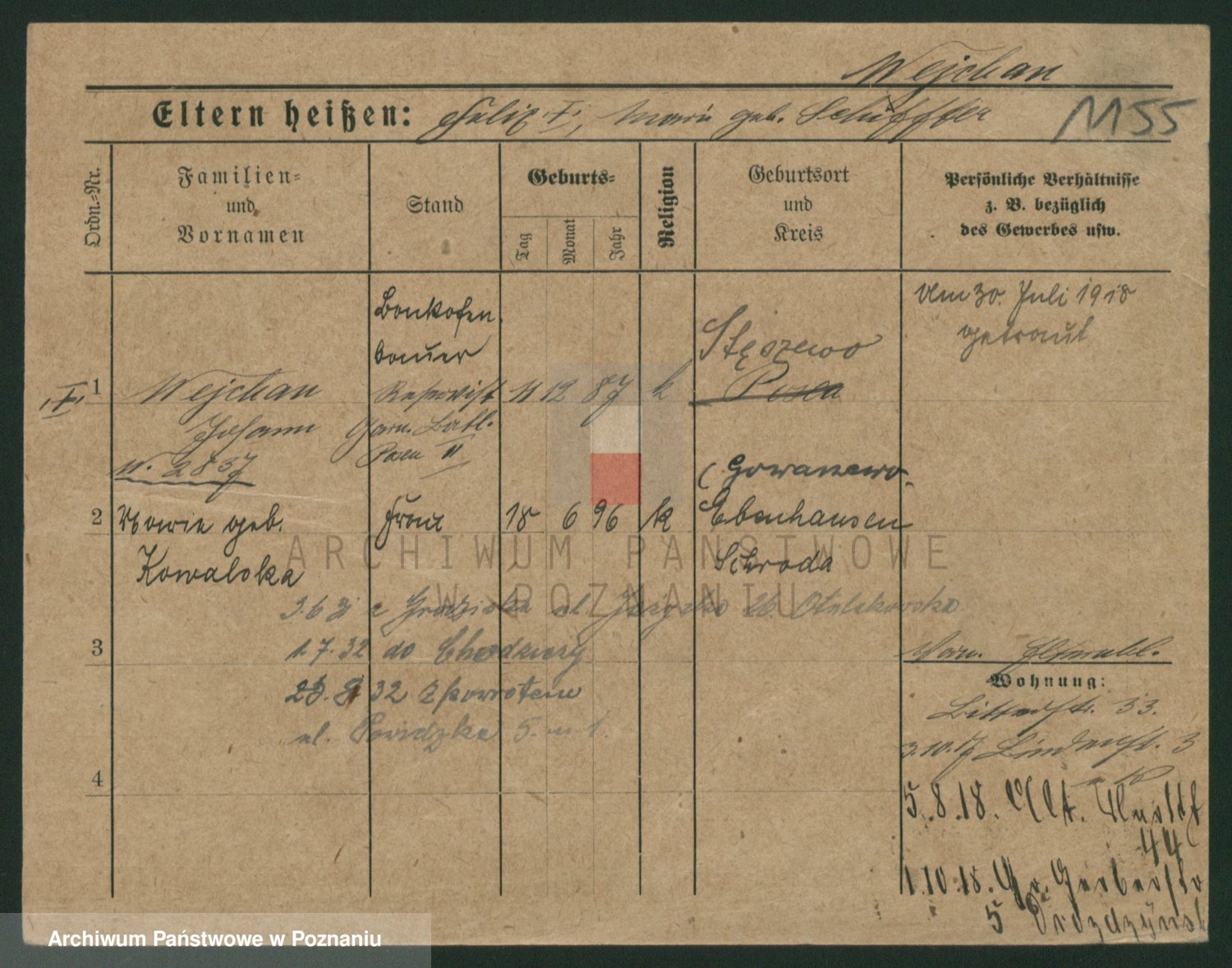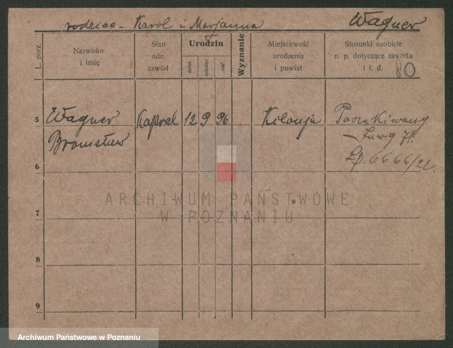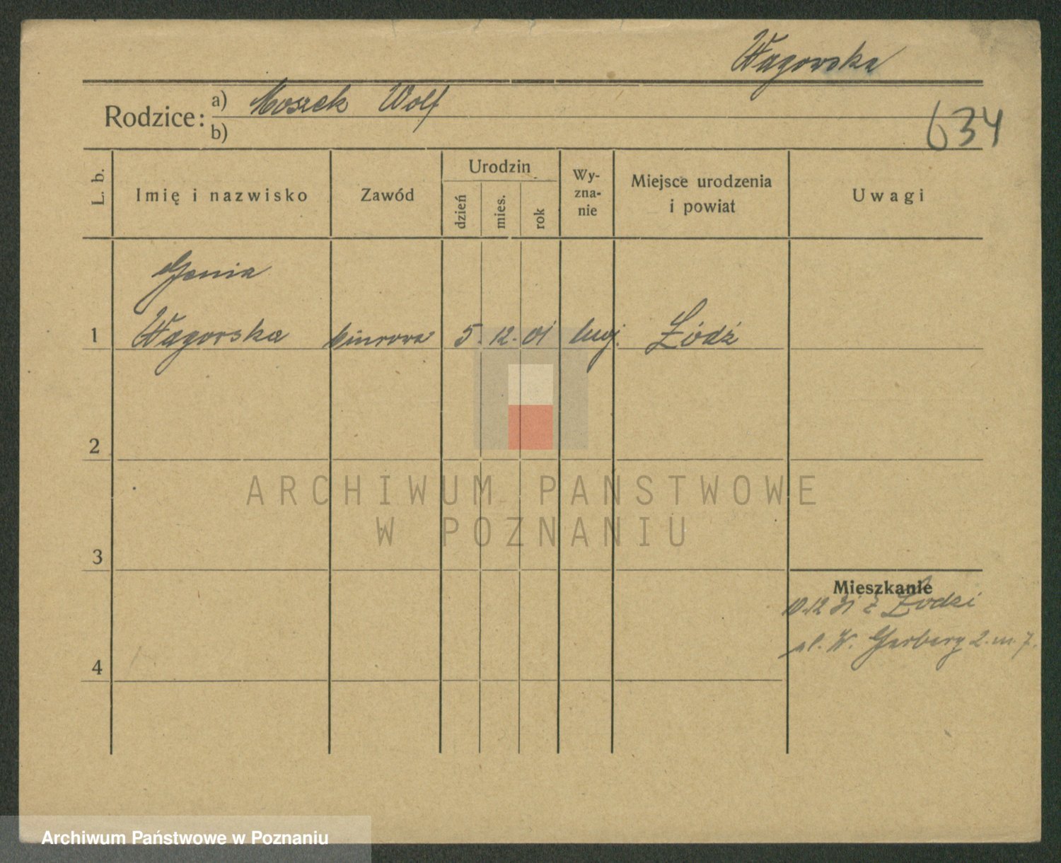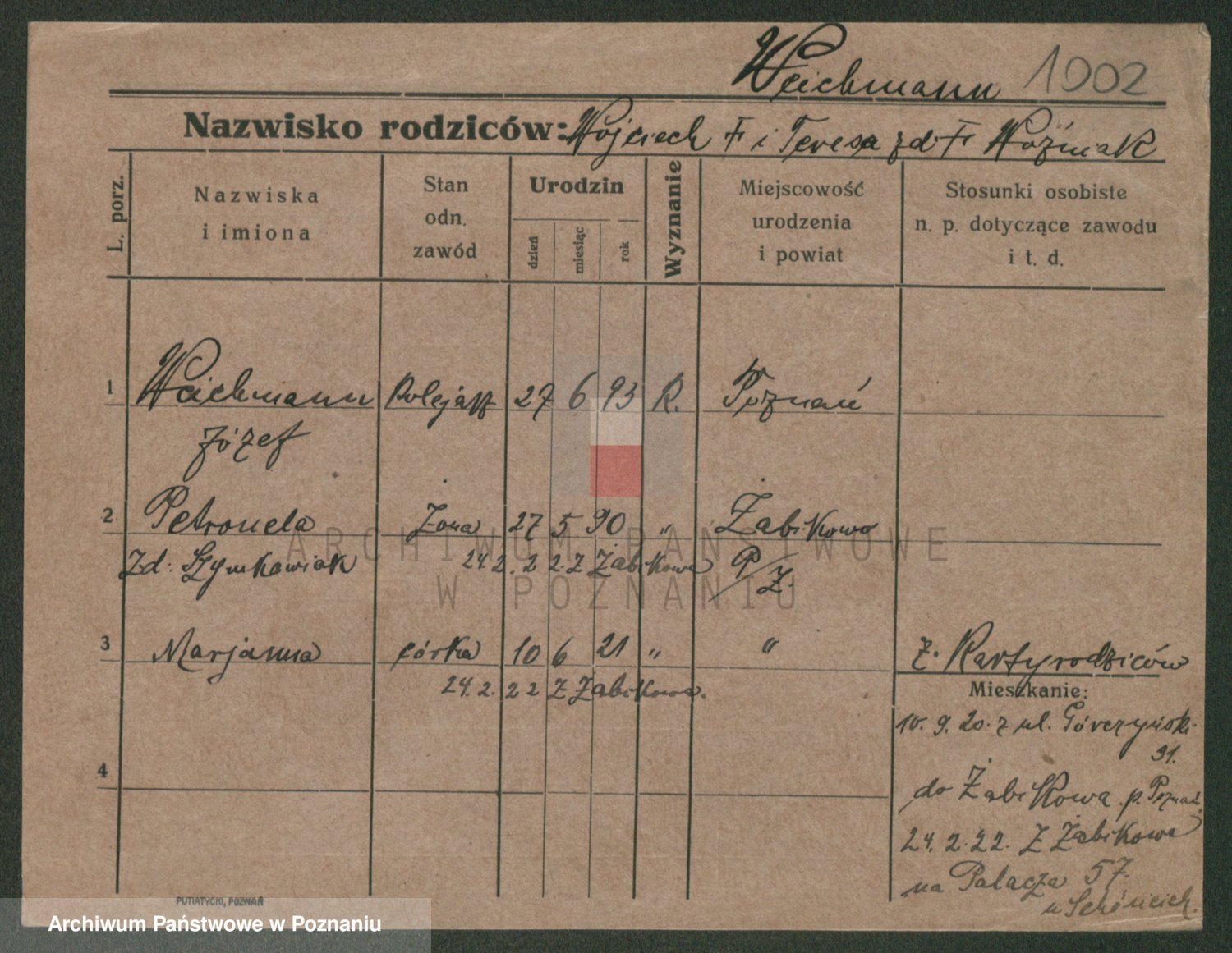 Podgląd karty osobowej dostępny jest po kliknięciu na nazwisko lub ikonkę karty. Można dokonywać powiększenia (ikony na górze) lub przechodzić między kolejnymi skanami (strzałki po bokach).