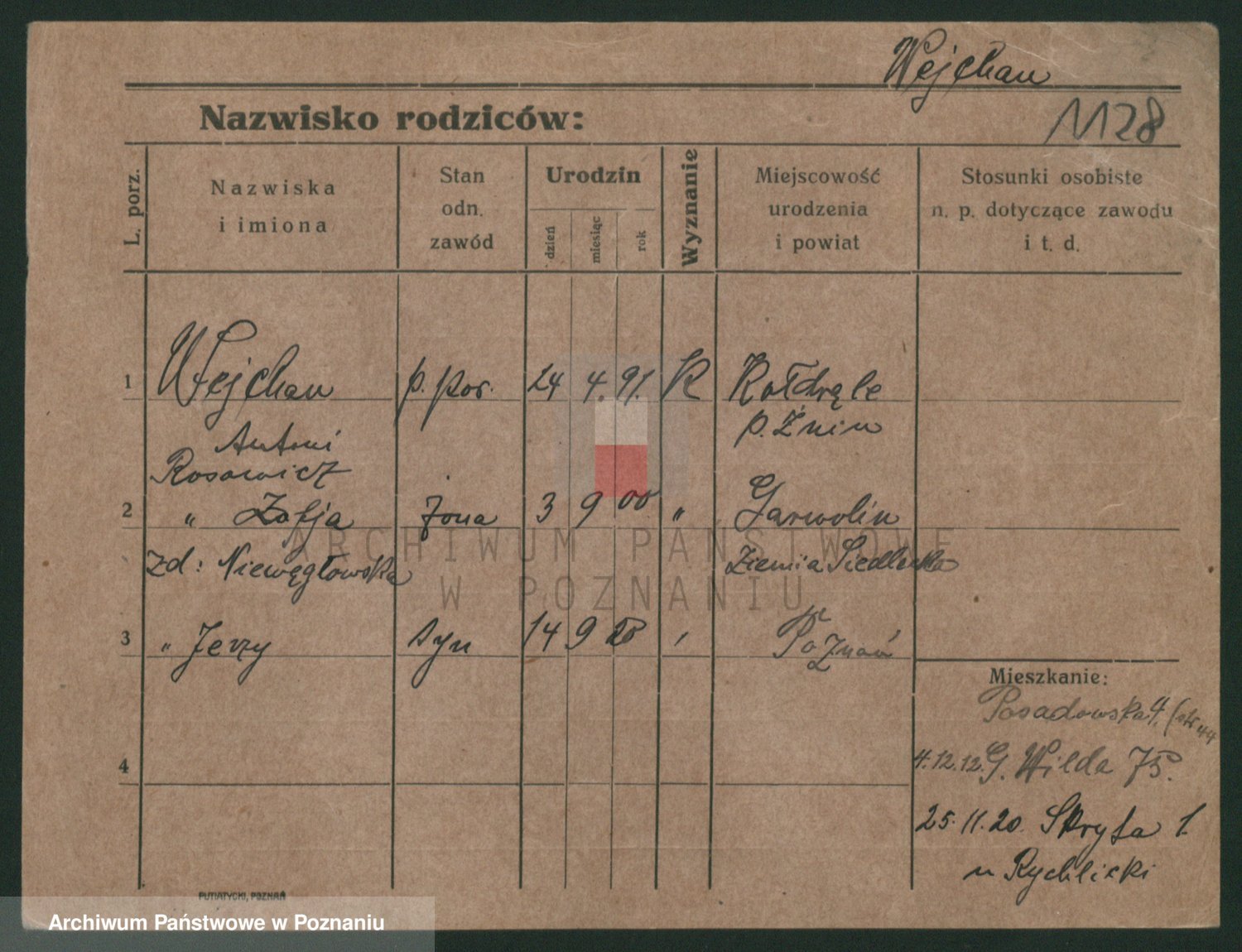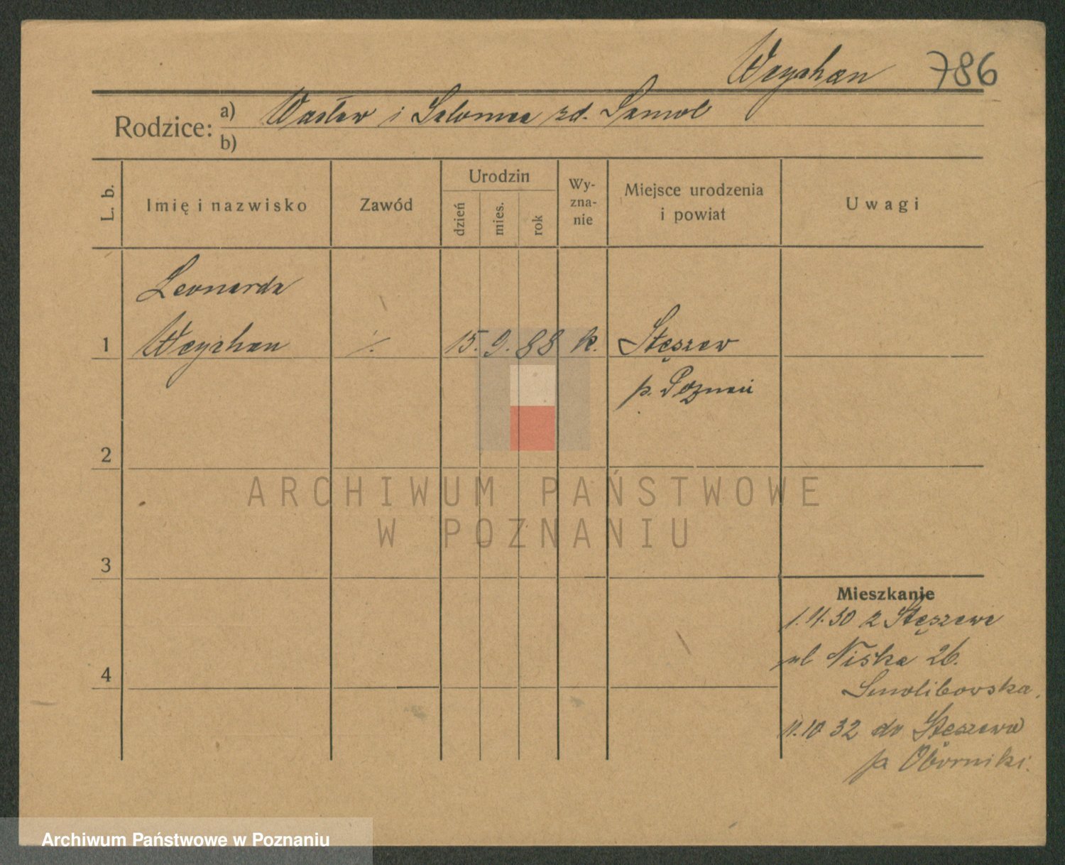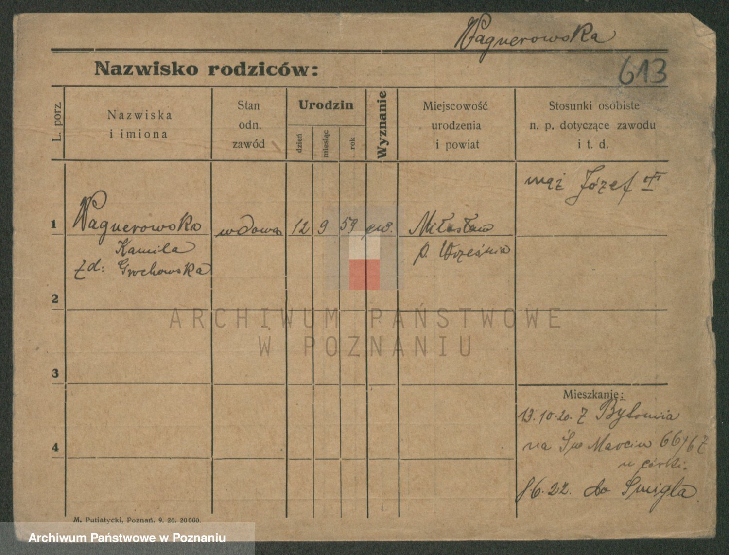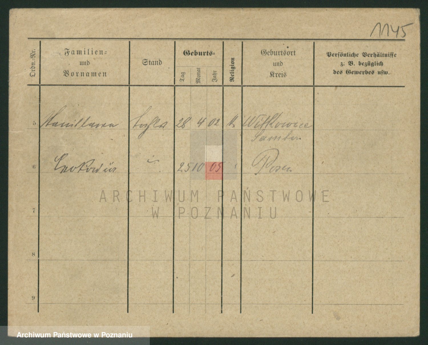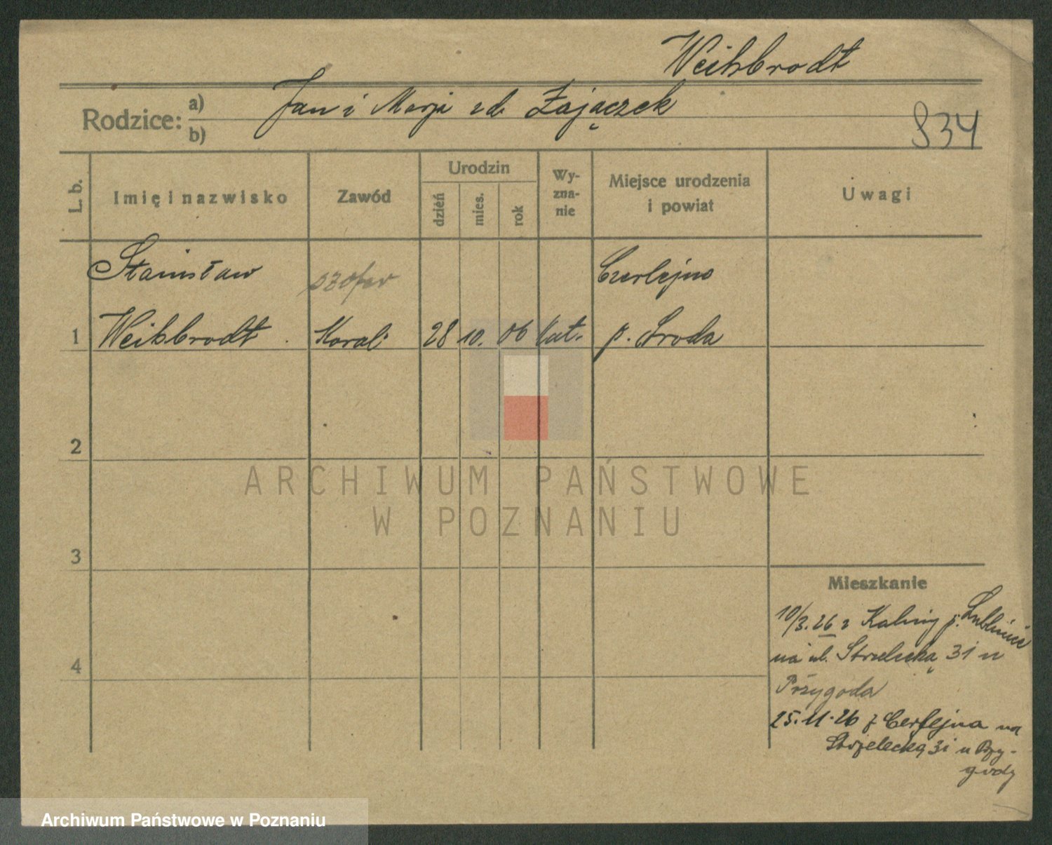 Podgląd karty osobowej dostępny jest po kliknięciu na nazwisko lub ikonkę karty. Można dokonywać powiększenia (ikony na górze) lub przechodzić między kolejnymi skanami (strzałki po bokach).