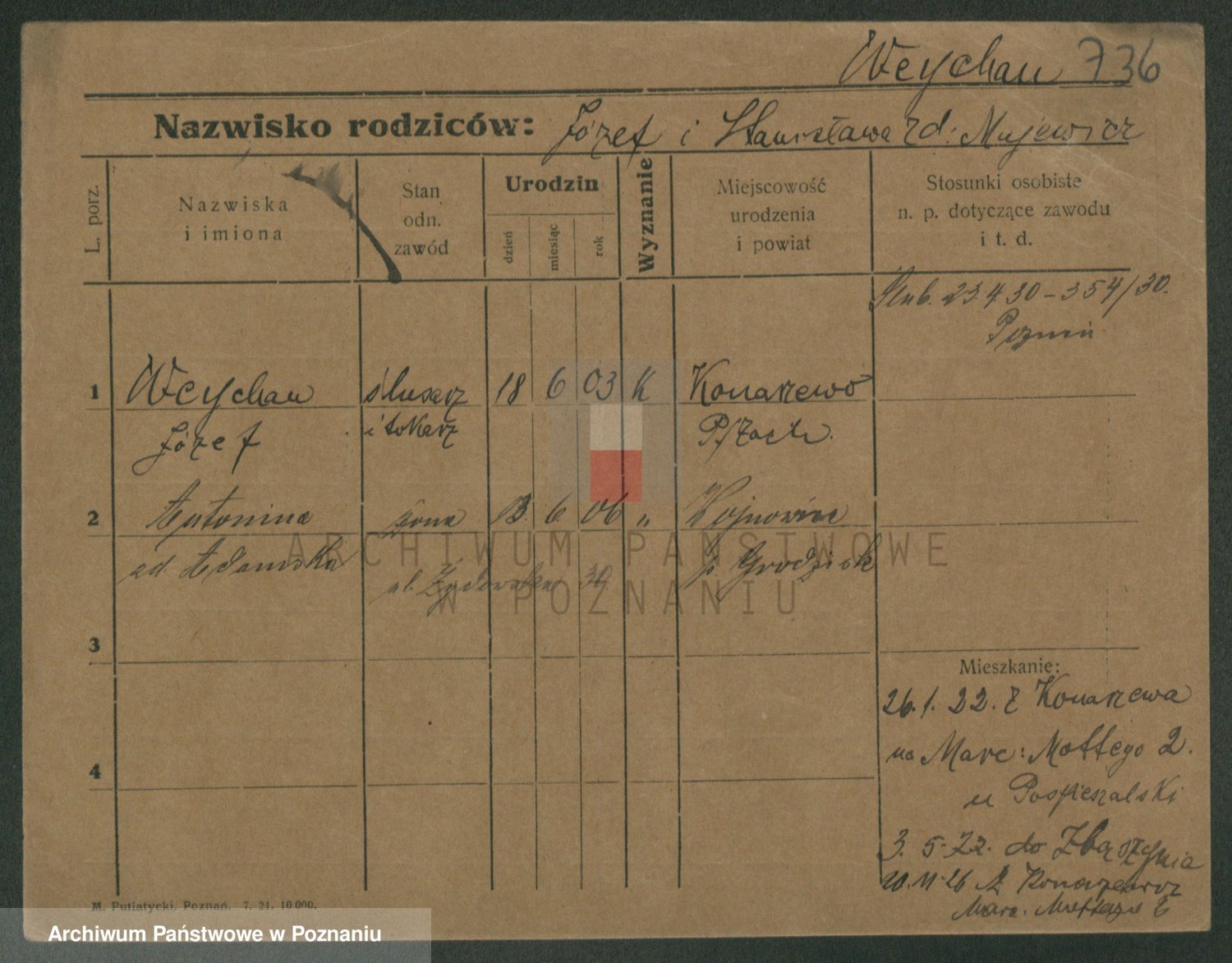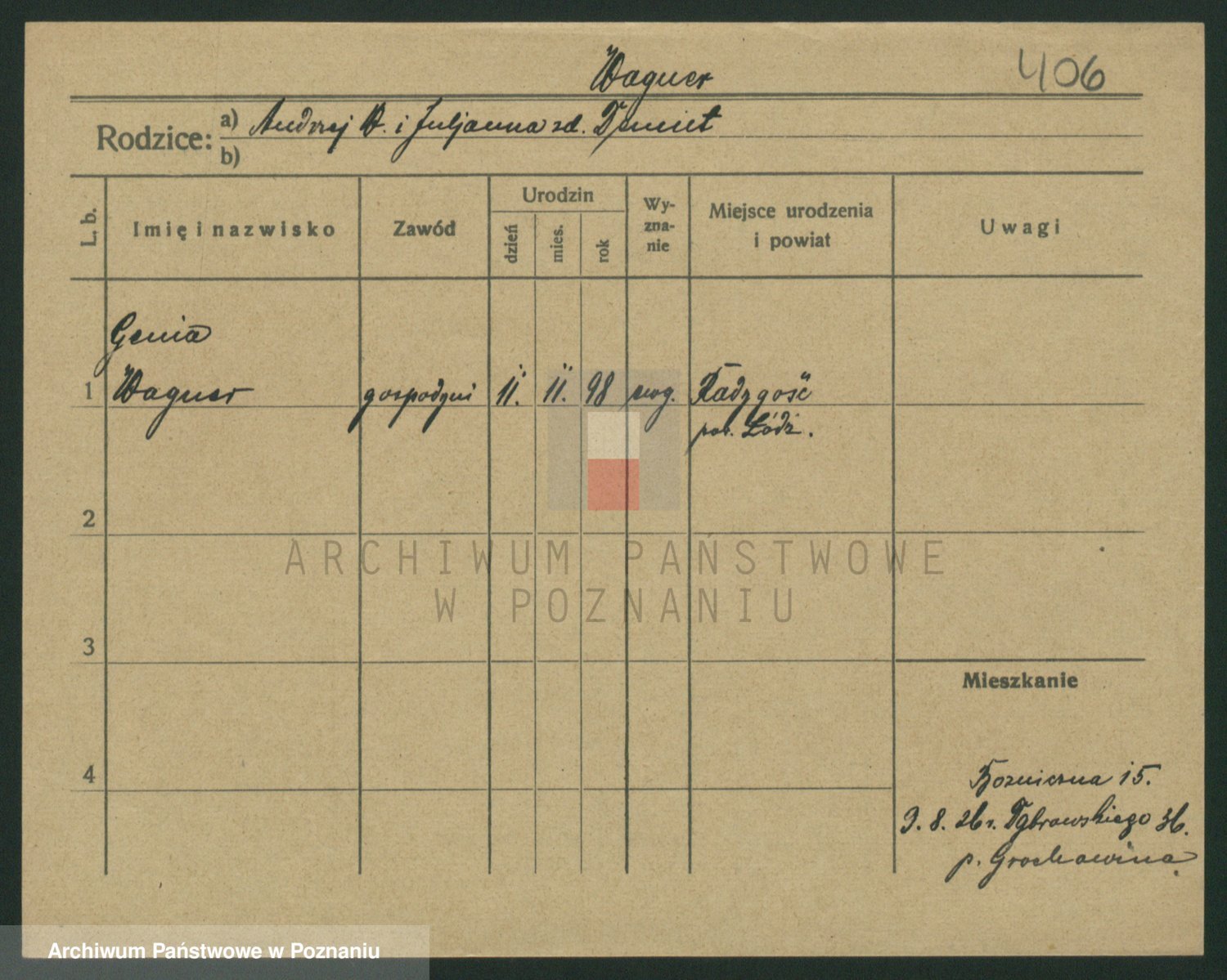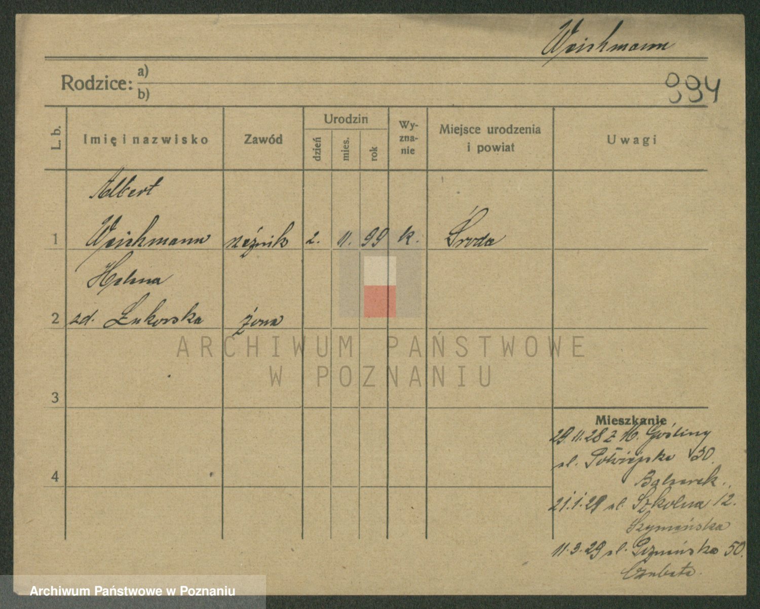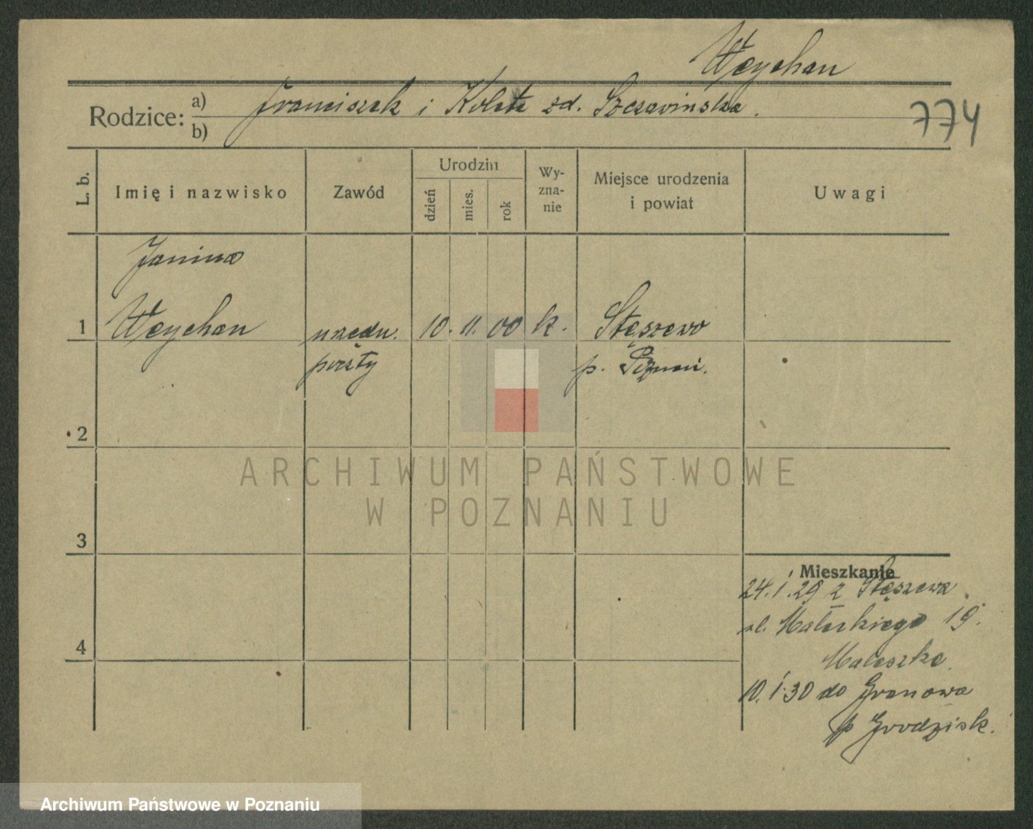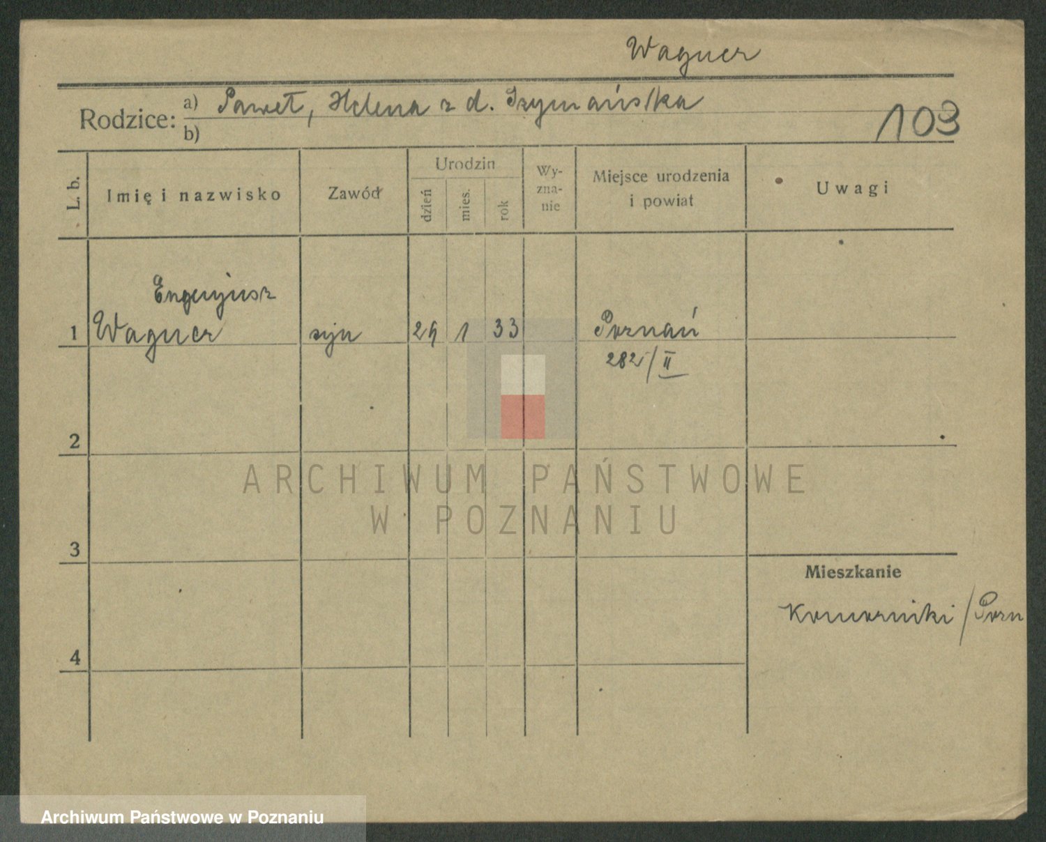 Podgląd karty osobowej dostępny jest po kliknięciu na nazwisko lub ikonkę karty. Można dokonywać powiększenia (ikony na górze) lub przechodzić między kolejnymi skanami (strzałki po bokach).