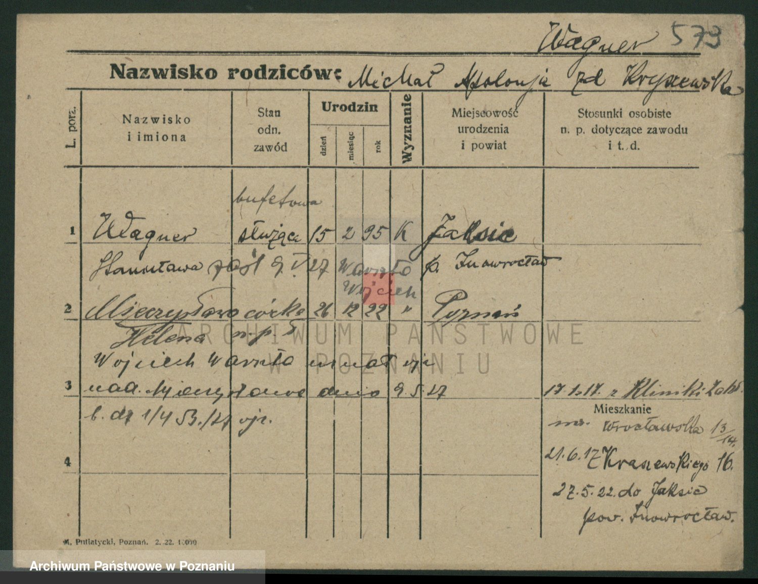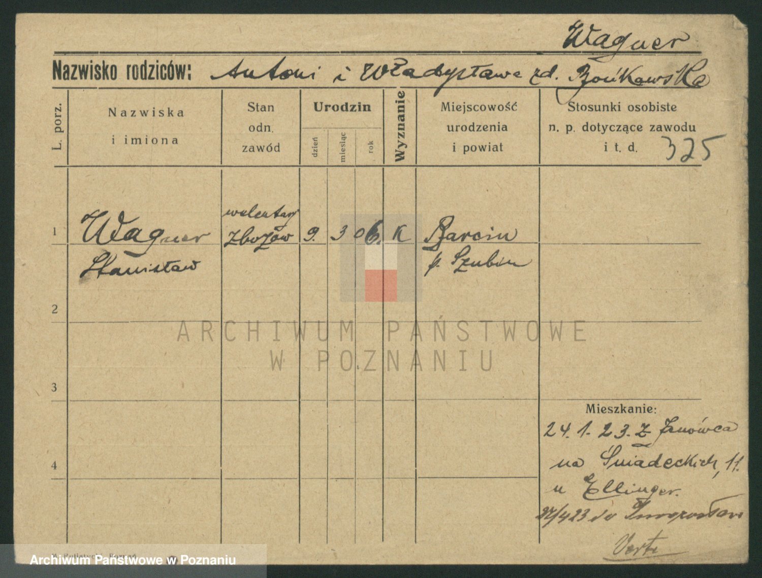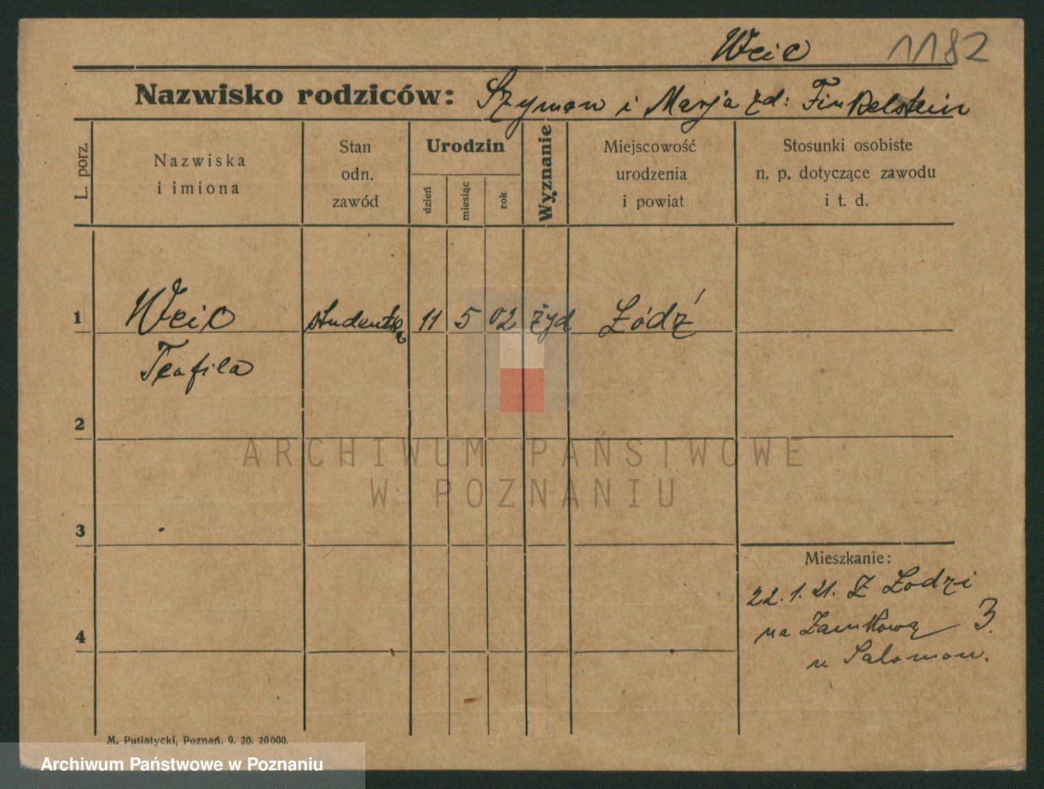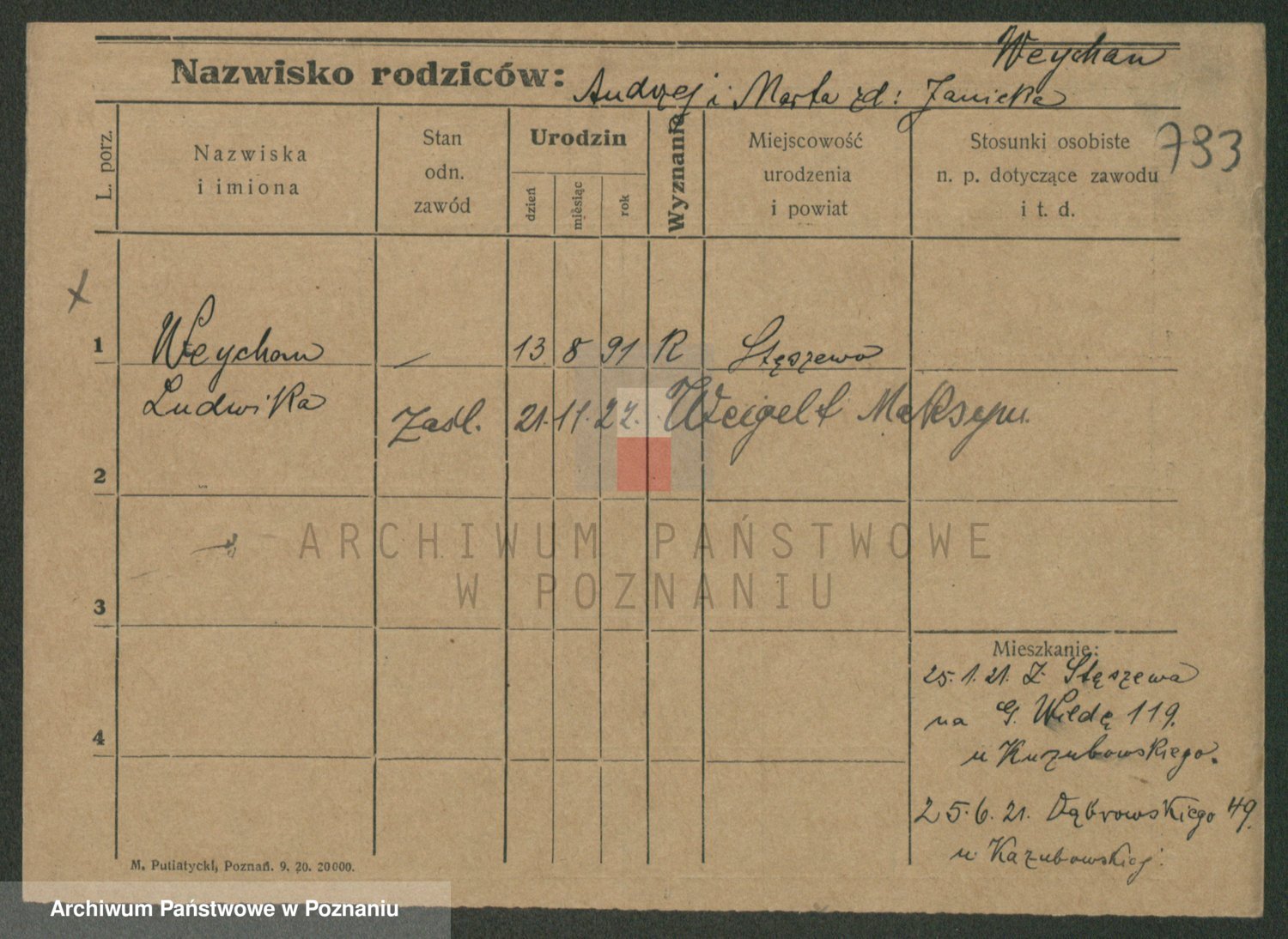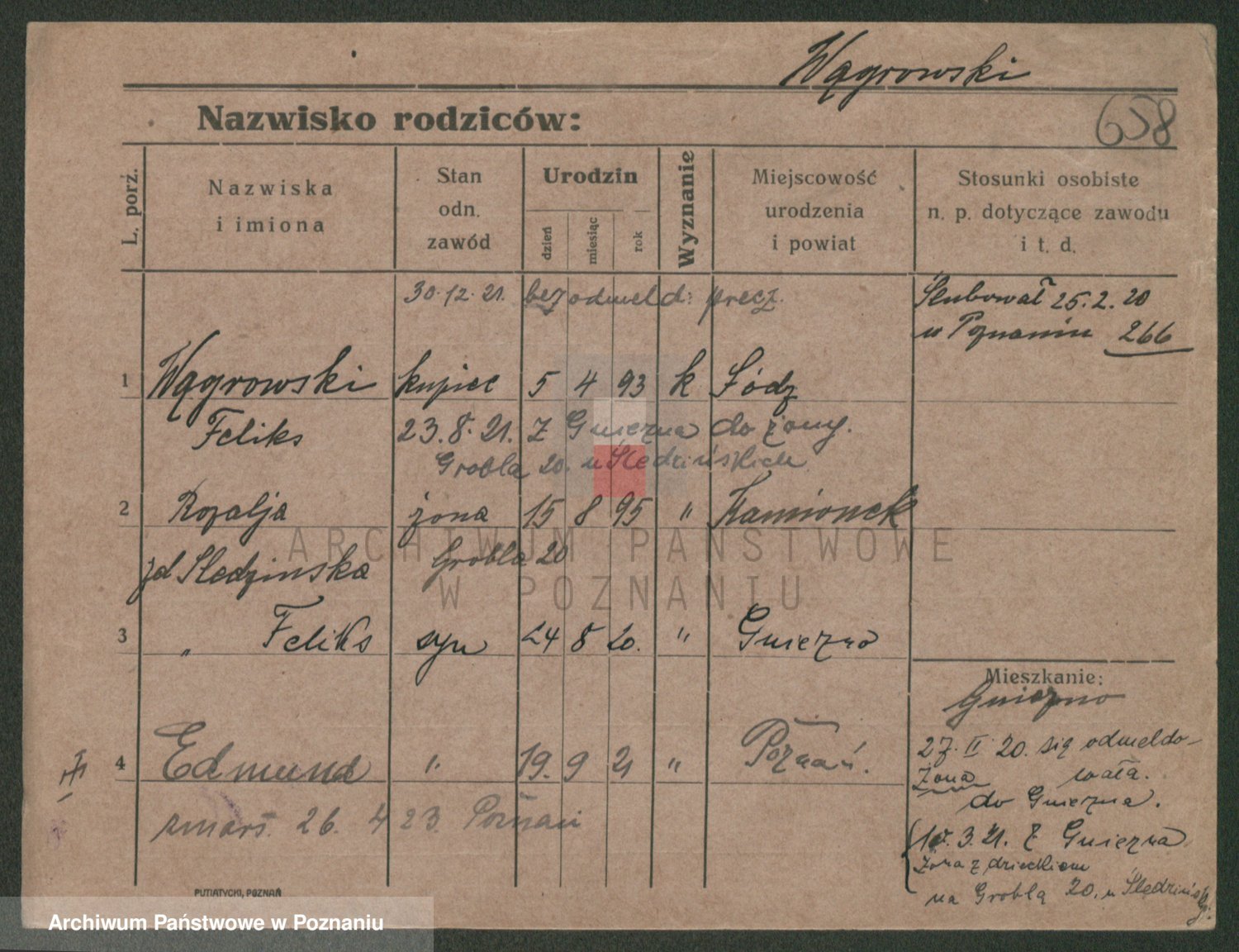 Podgląd karty osobowej dostępny jest po kliknięciu na nazwisko lub ikonkę karty. Można dokonywać powiększenia (ikony na górze) lub przechodzić między kolejnymi skanami (strzałki po bokach).
