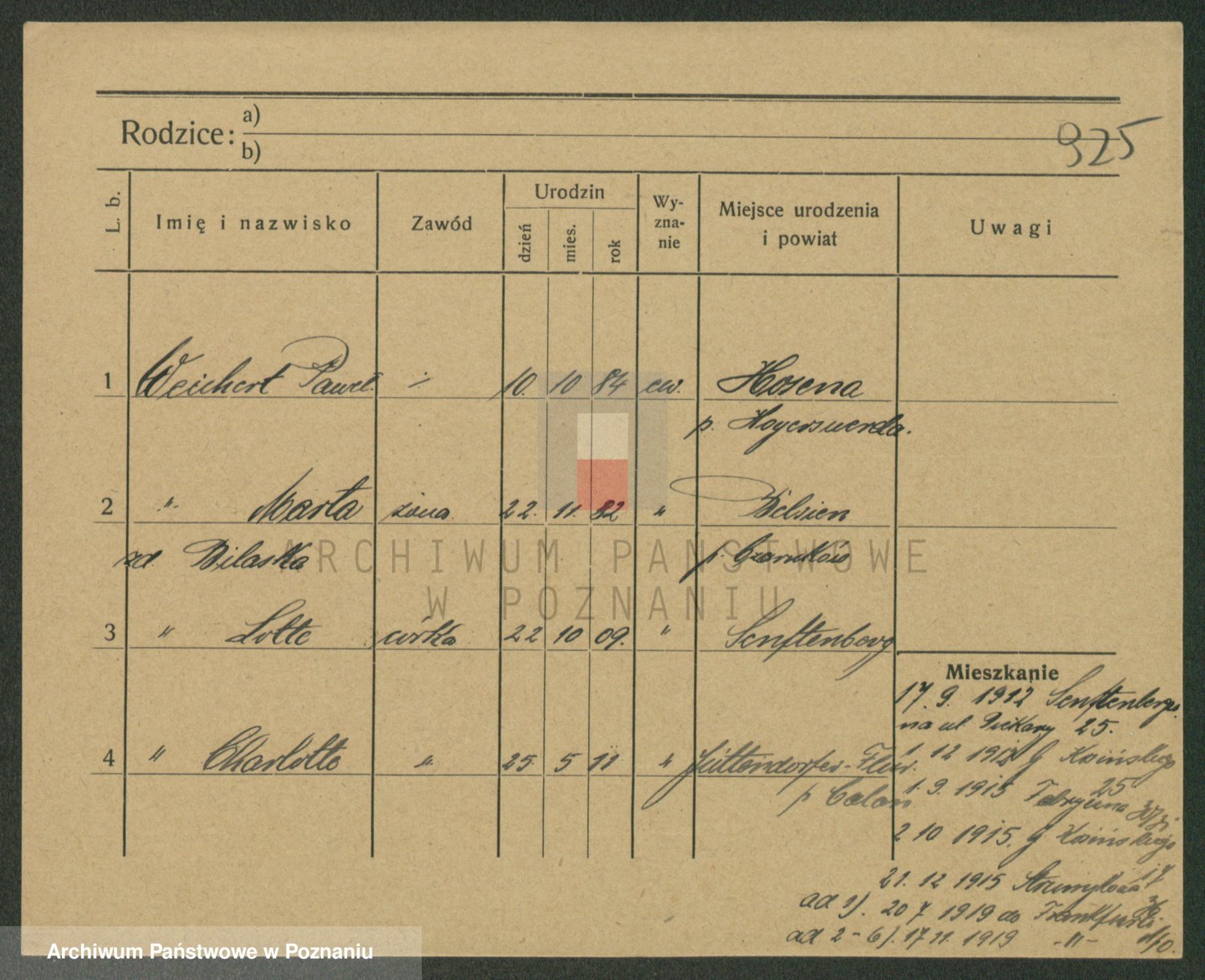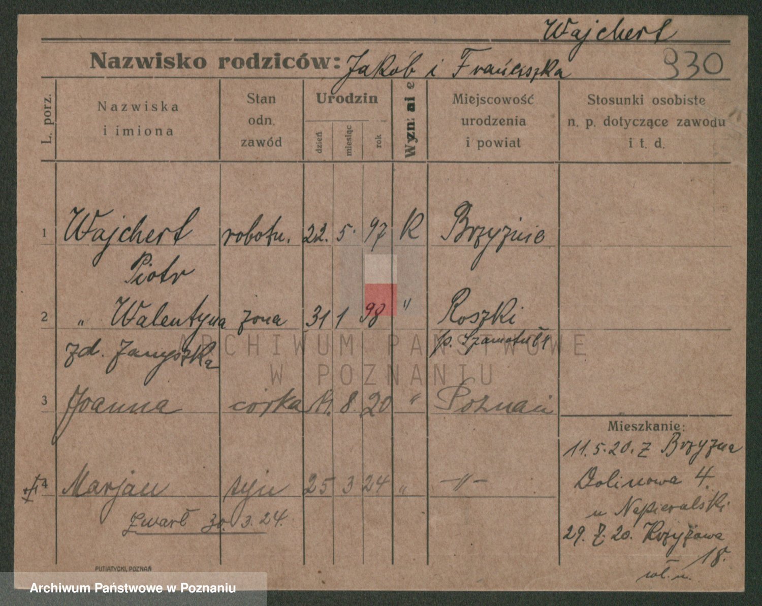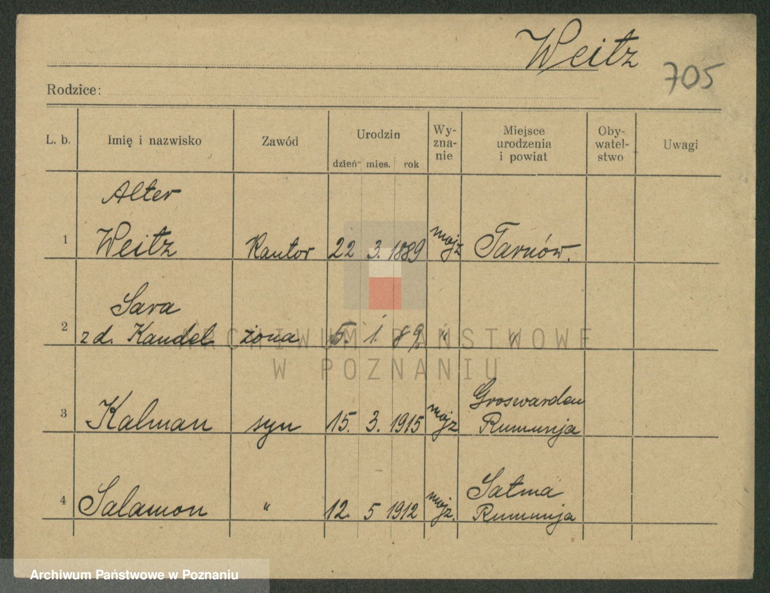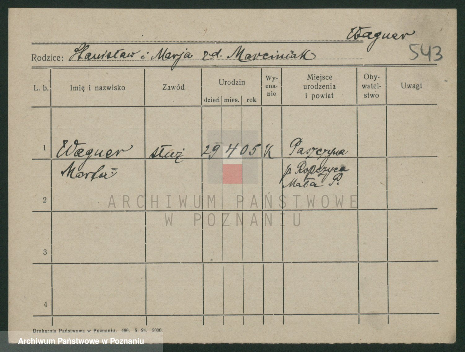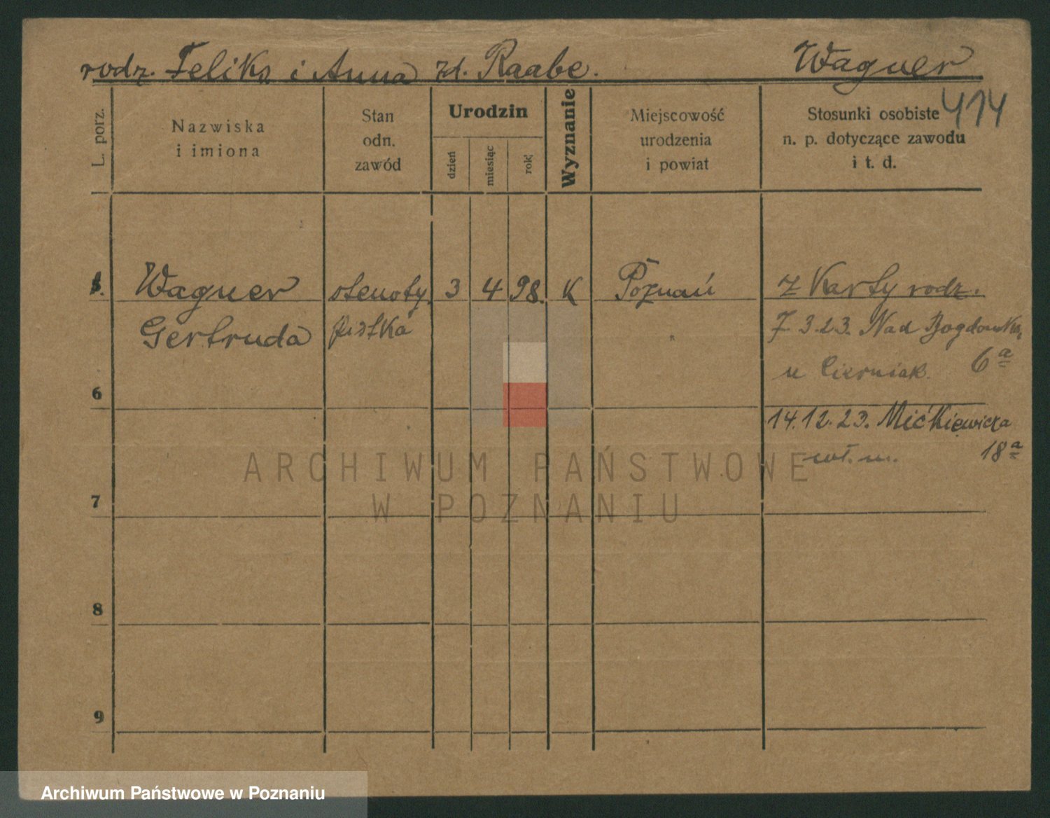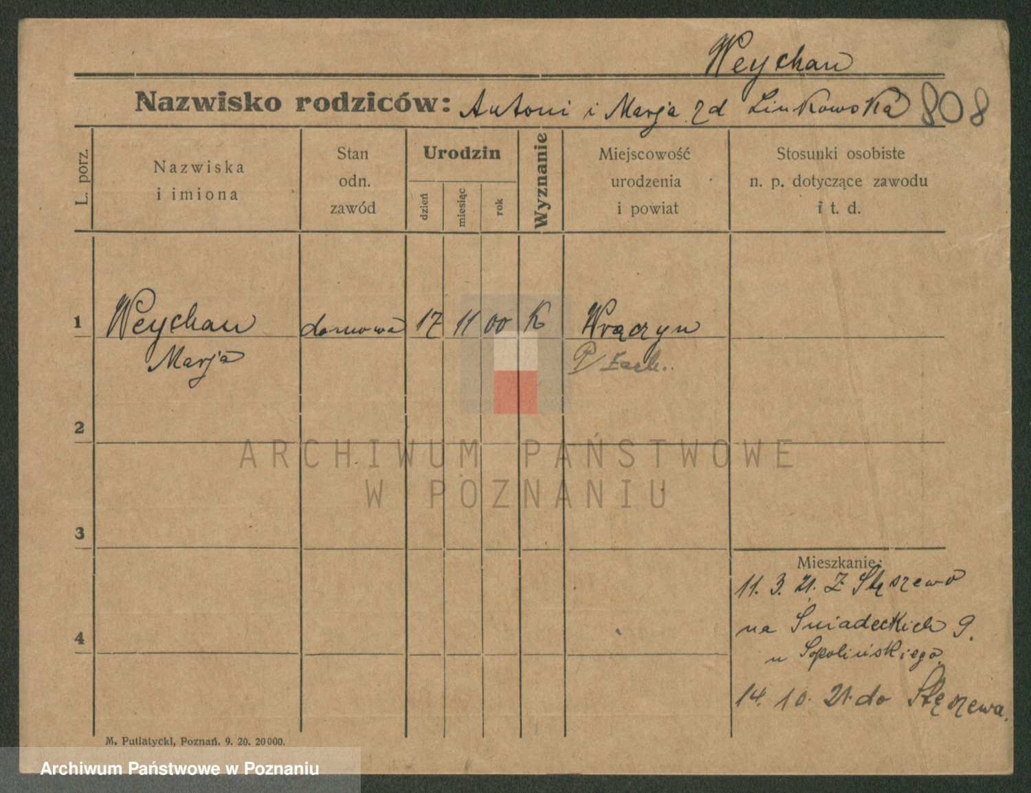 Podgląd karty osobowej dostępny jest po kliknięciu na nazwisko lub ikonkę karty. Można dokonywać powiększenia (ikony na górze) lub przechodzić między kolejnymi skanami (strzałki po bokach).