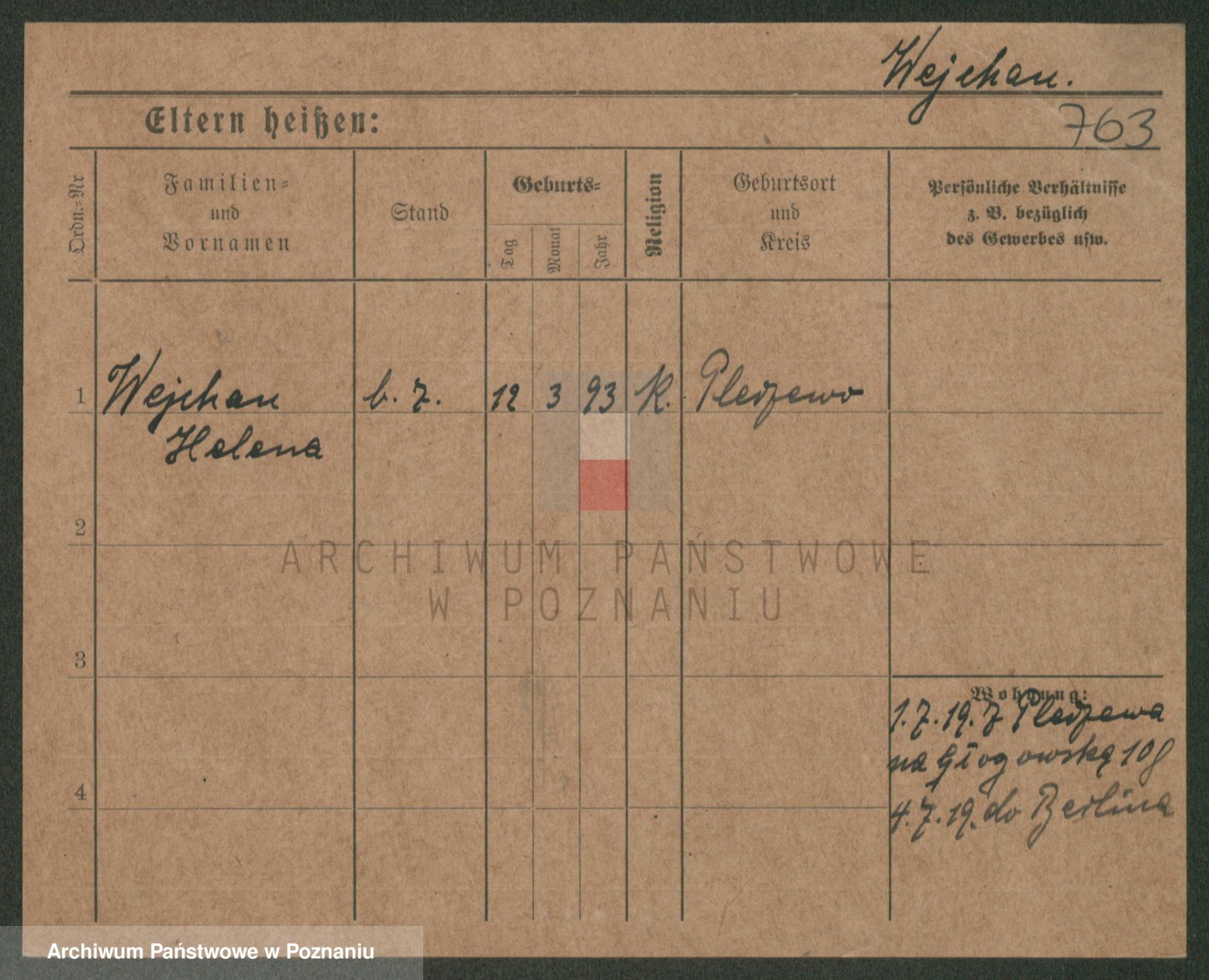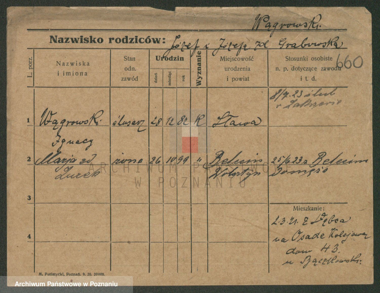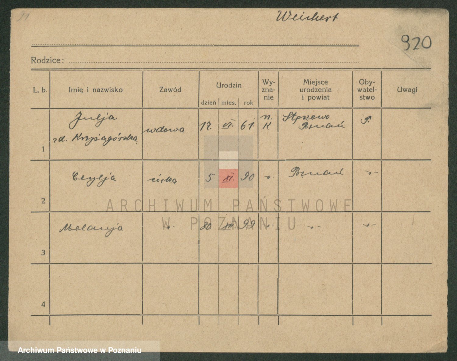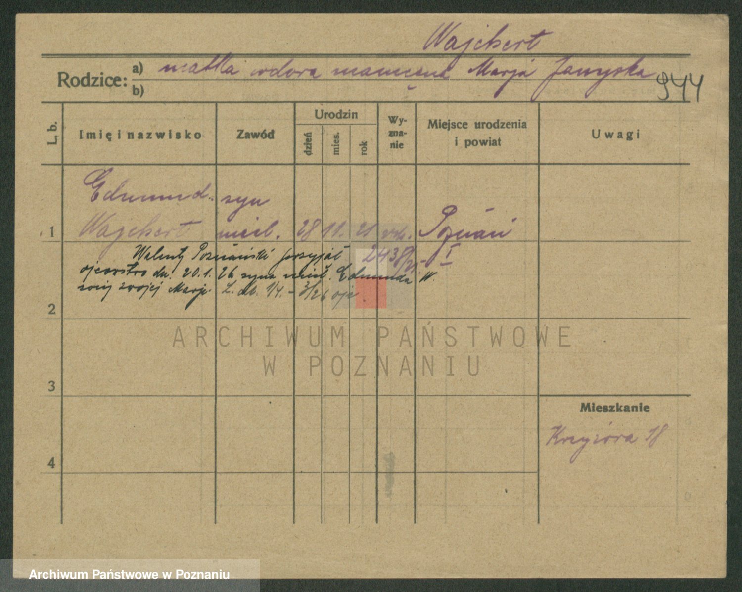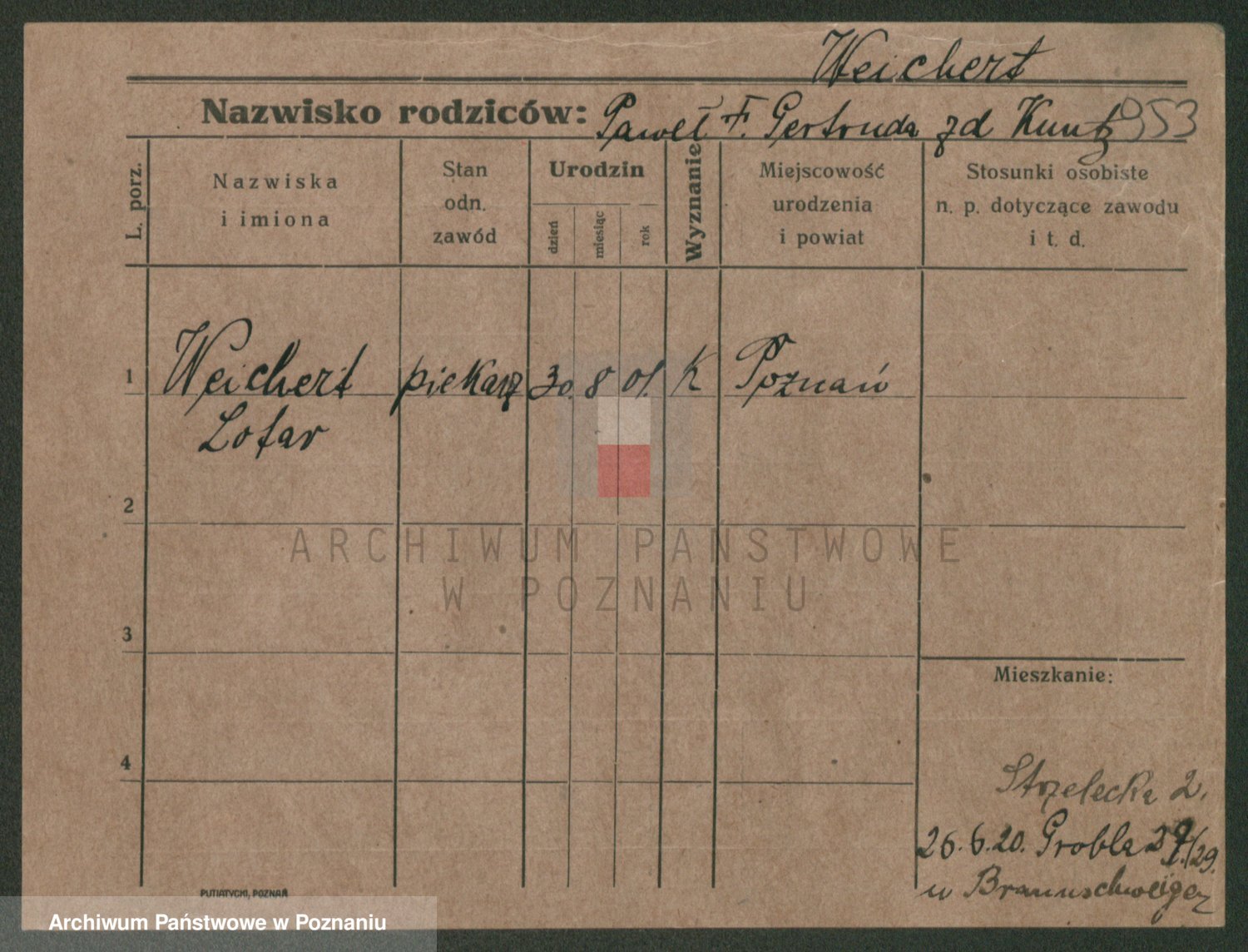 Podgląd karty osobowej dostępny jest po kliknięciu na nazwisko lub ikonkę karty. Można dokonywać powiększenia (ikony na górze) lub przechodzić między kolejnymi skanami (strzałki po bokach).