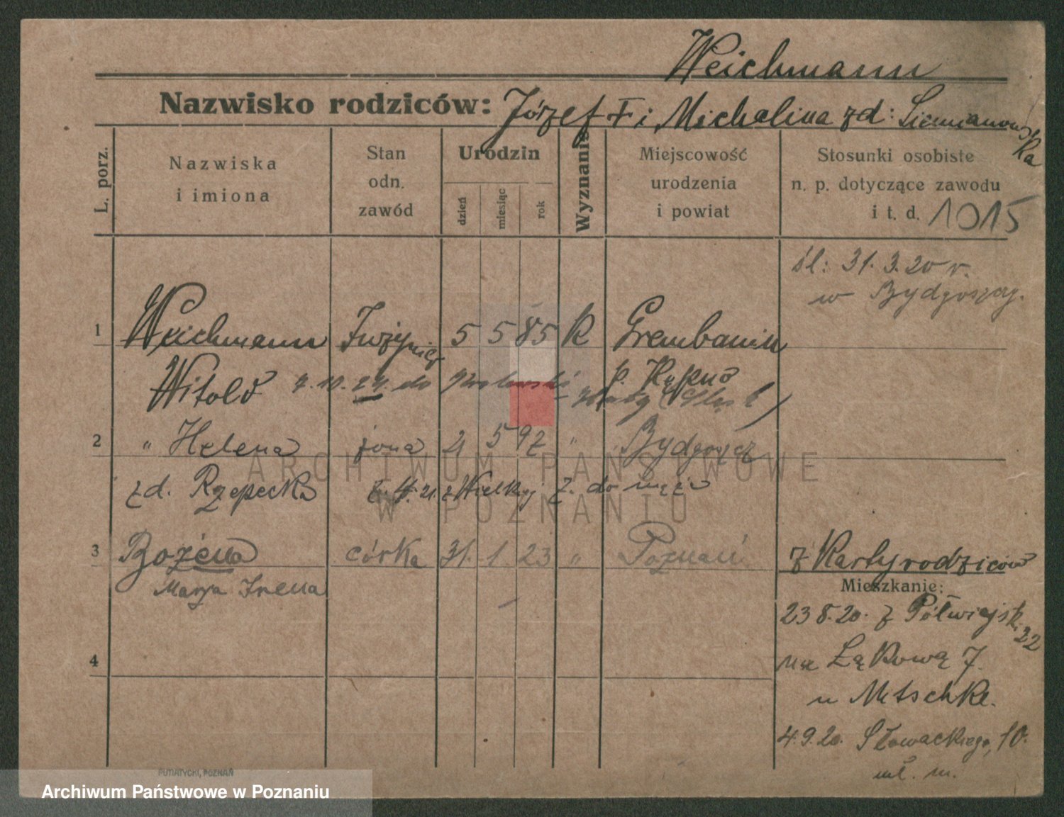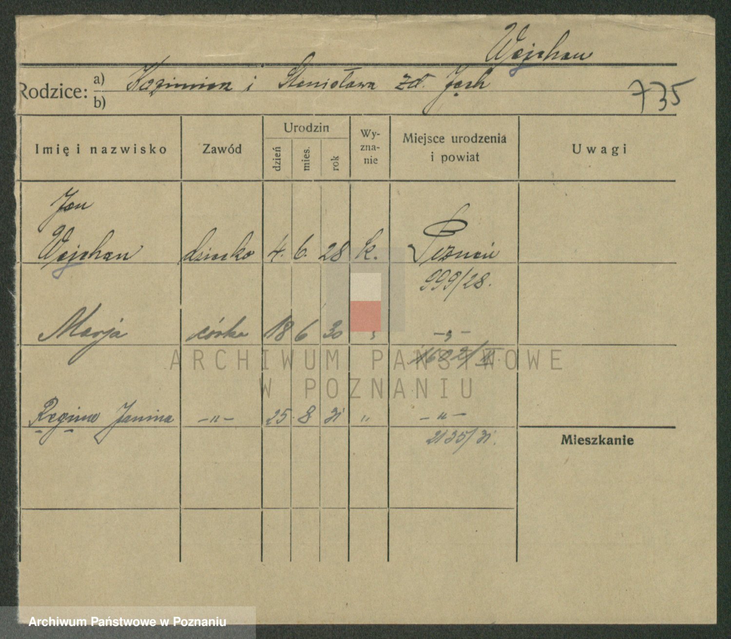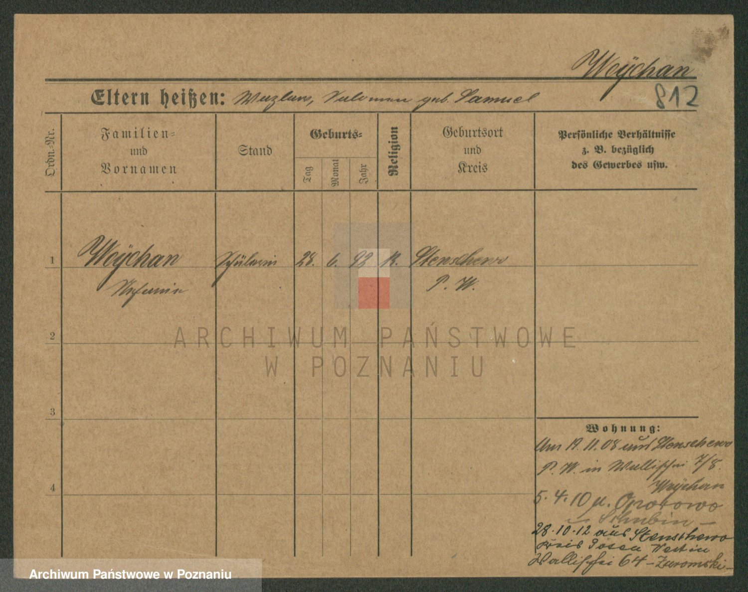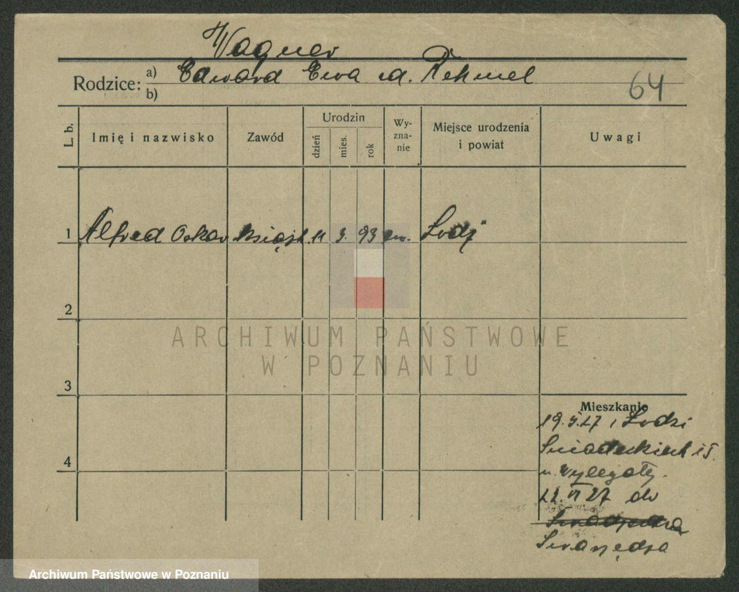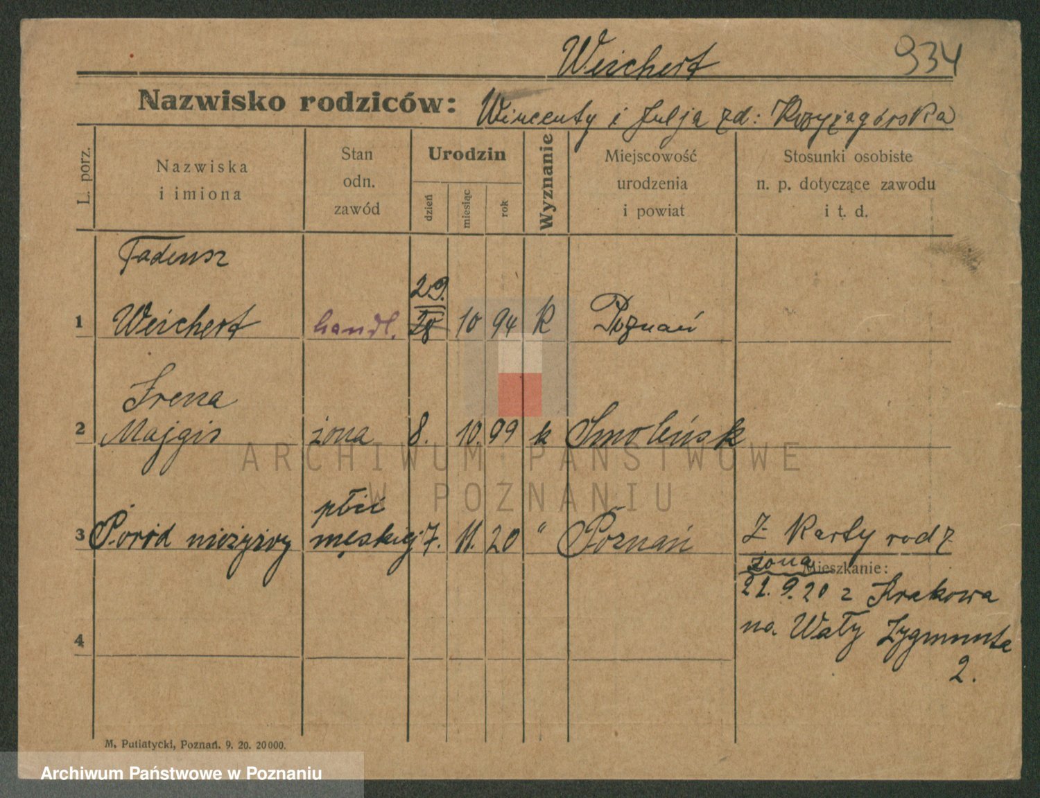 Podgląd karty osobowej dostępny jest po kliknięciu na nazwisko lub ikonkę karty. Można dokonywać powiększenia (ikony na górze) lub przechodzić między kolejnymi skanami (strzałki po bokach).