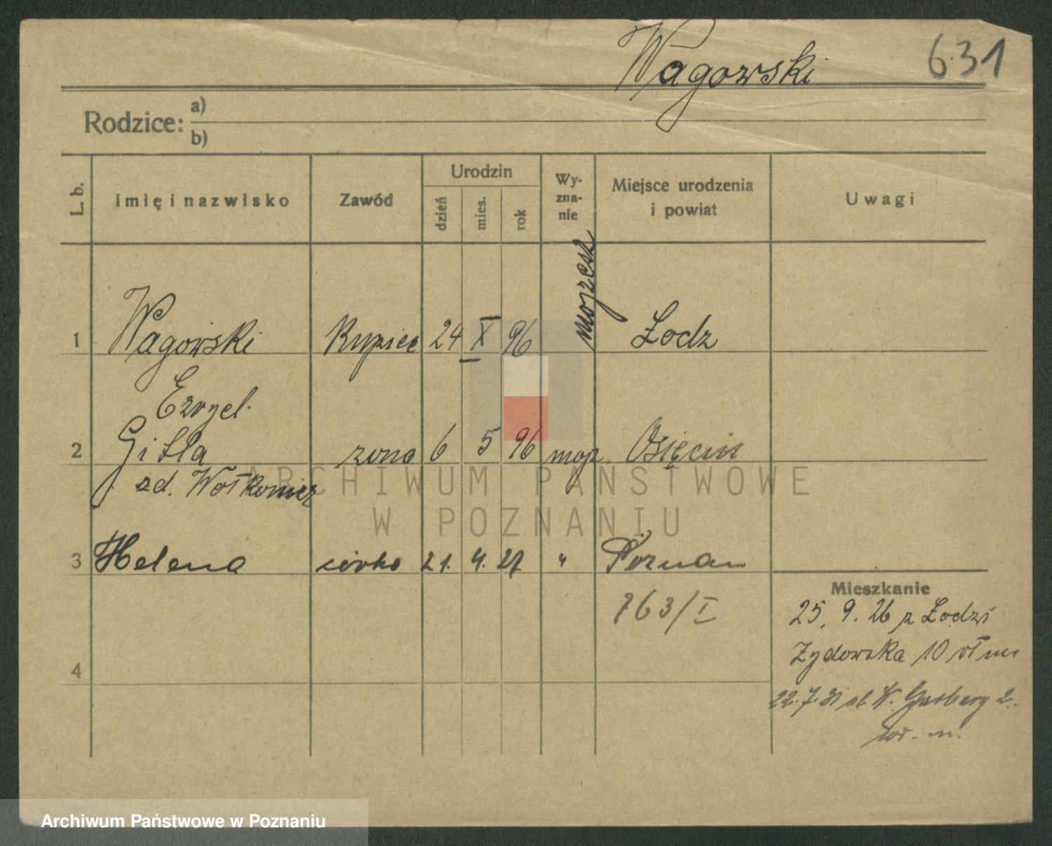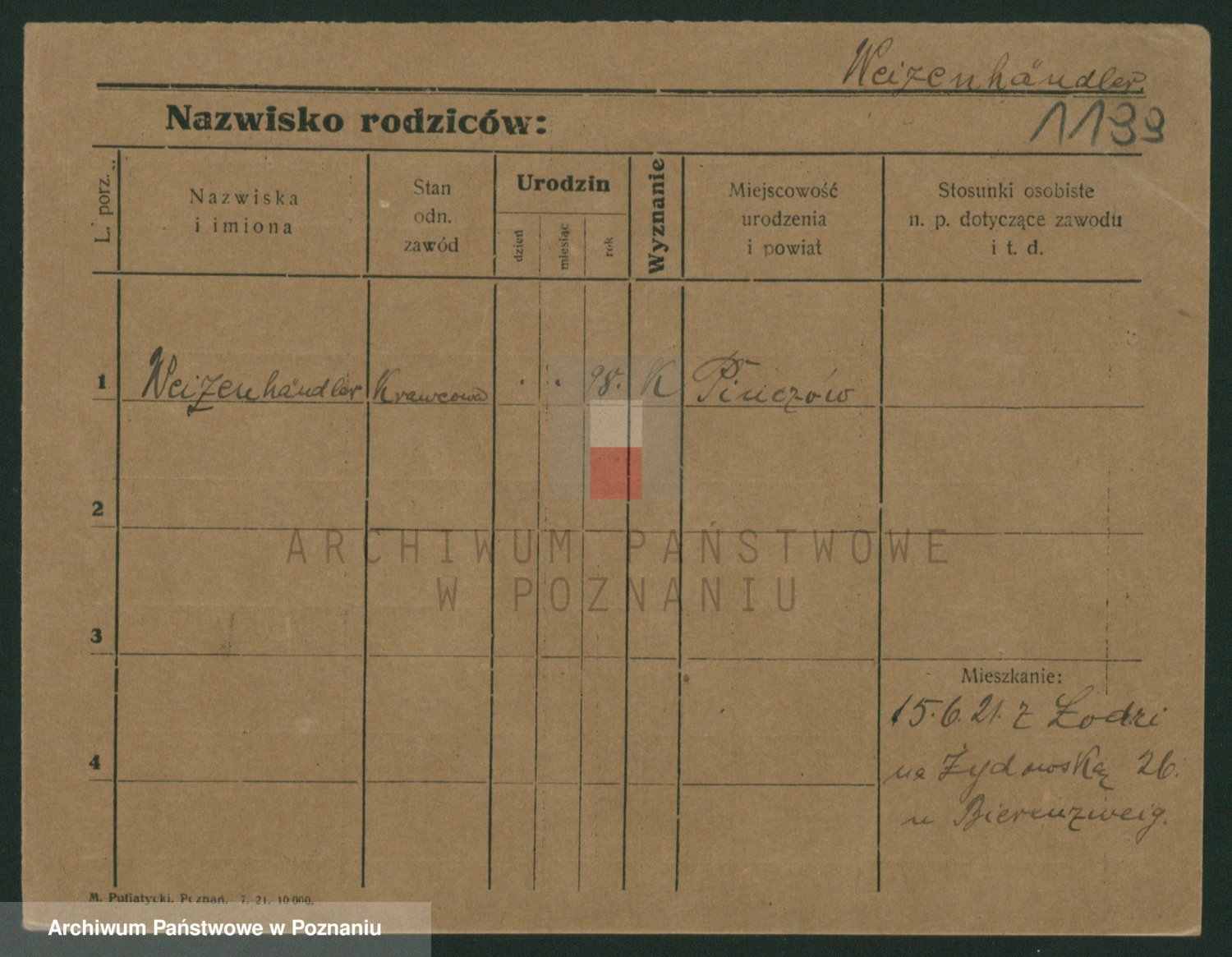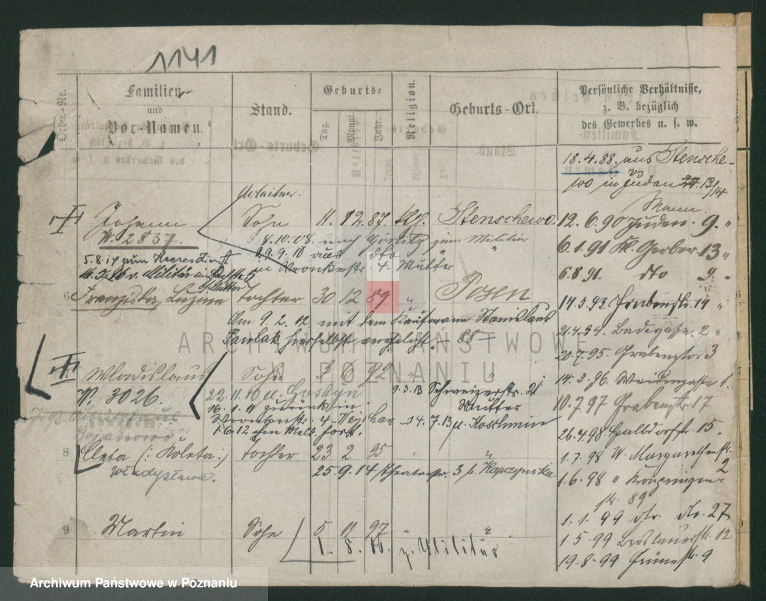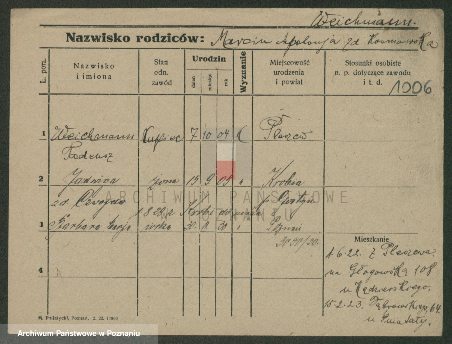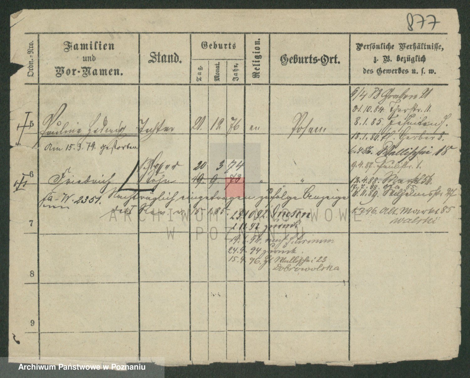 Podgląd karty osobowej dostępny jest po kliknięciu na nazwisko lub ikonkę karty. Można dokonywać powiększenia (ikony na górze) lub przechodzić między kolejnymi skanami (strzałki po bokach).