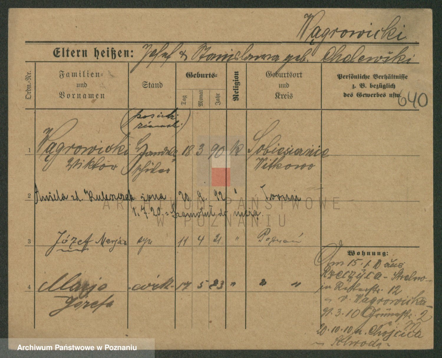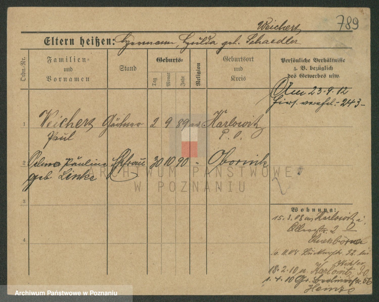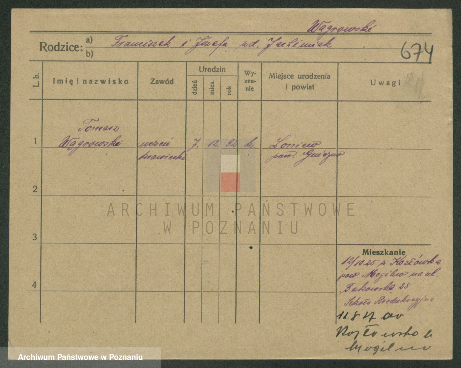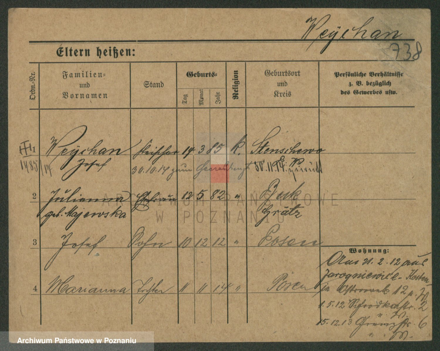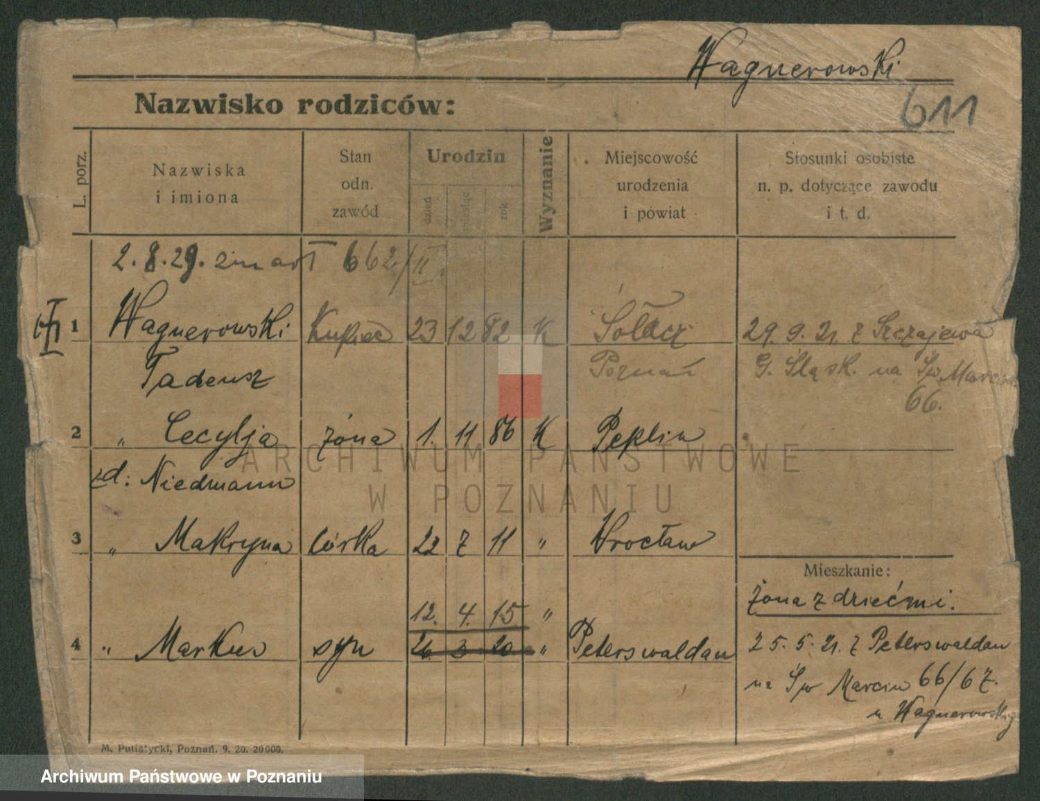 Podgląd karty osobowej dostępny jest po kliknięciu na nazwisko lub ikonkę karty. Można dokonywać powiększenia (ikony na górze) lub przechodzić między kolejnymi skanami (strzałki po bokach).