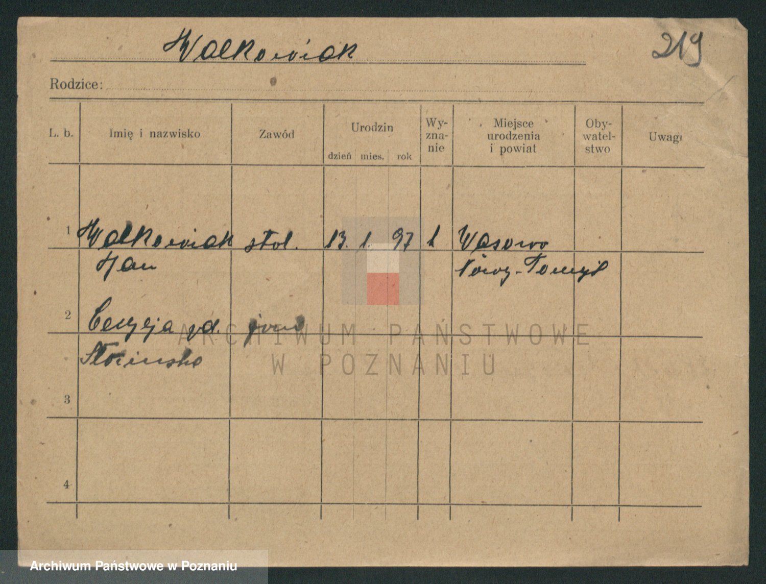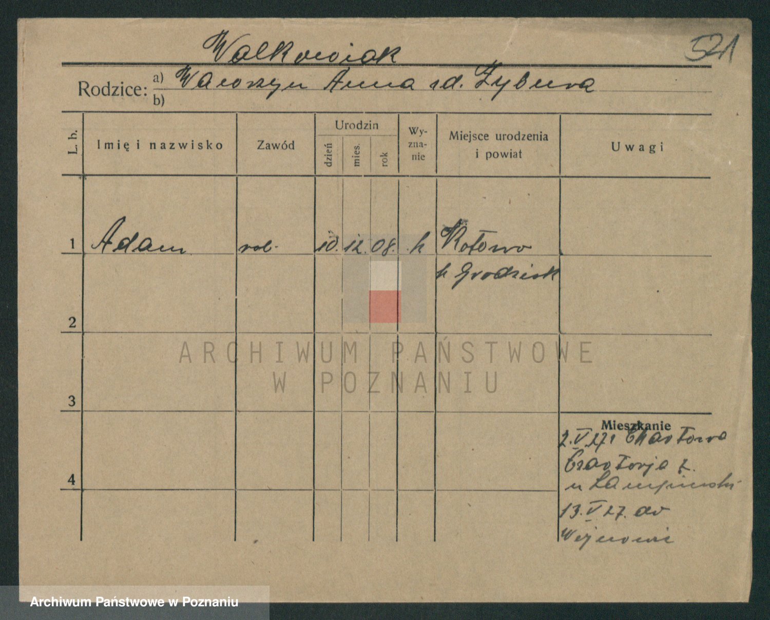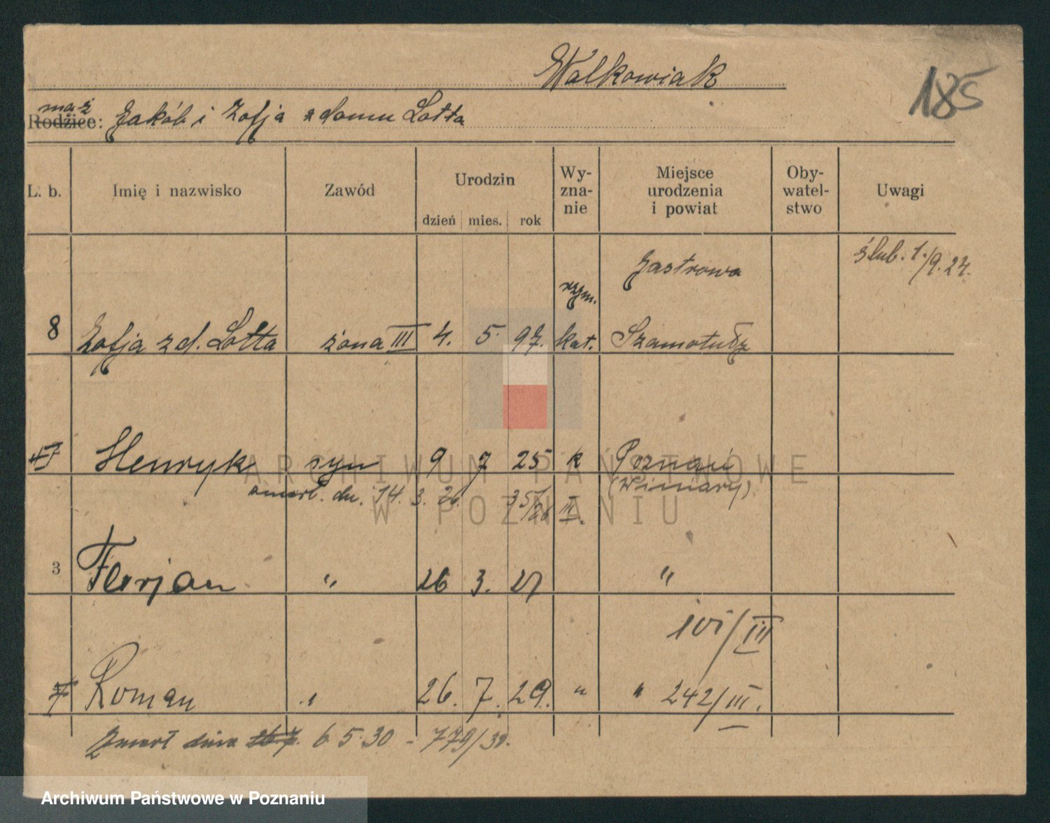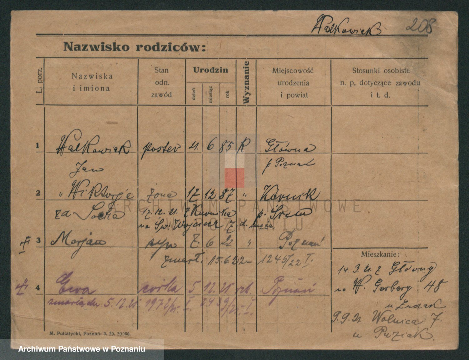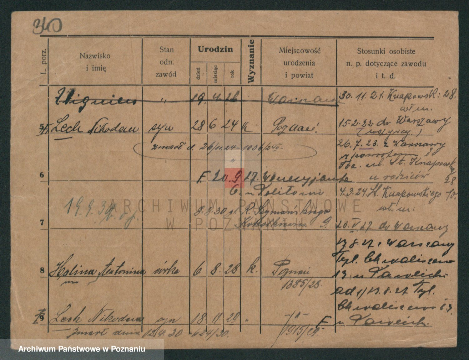 Podgląd karty osobowej dostępny jest po kliknięciu na nazwisko lub ikonkę karty. Można dokonywać powiększenia (ikony na górze) lub przechodzić między kolejnymi skanami (strzałki po bokach).