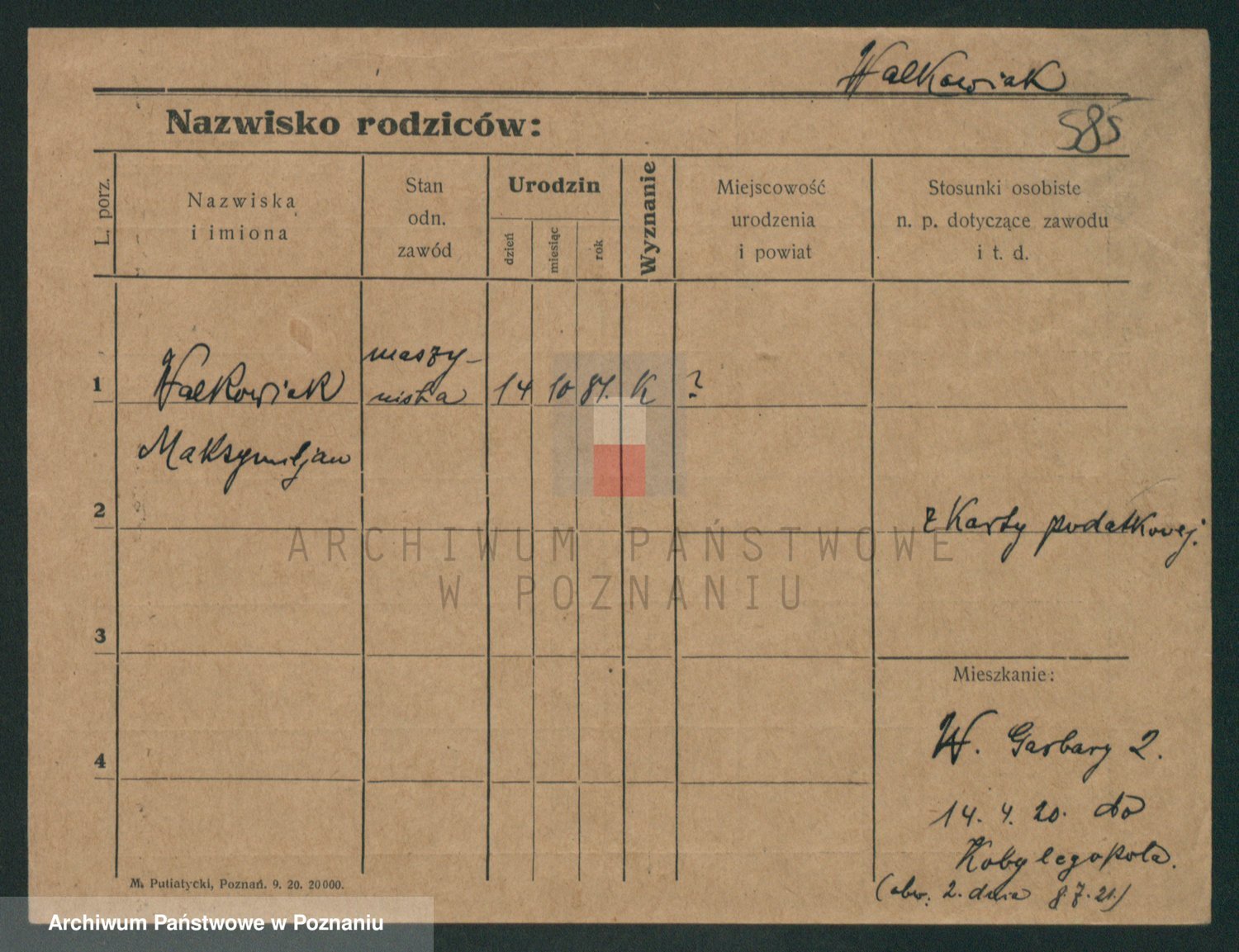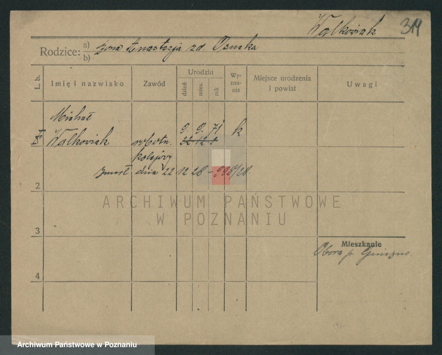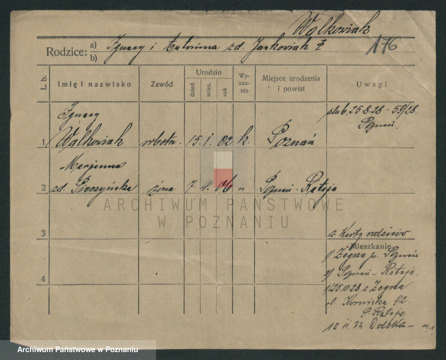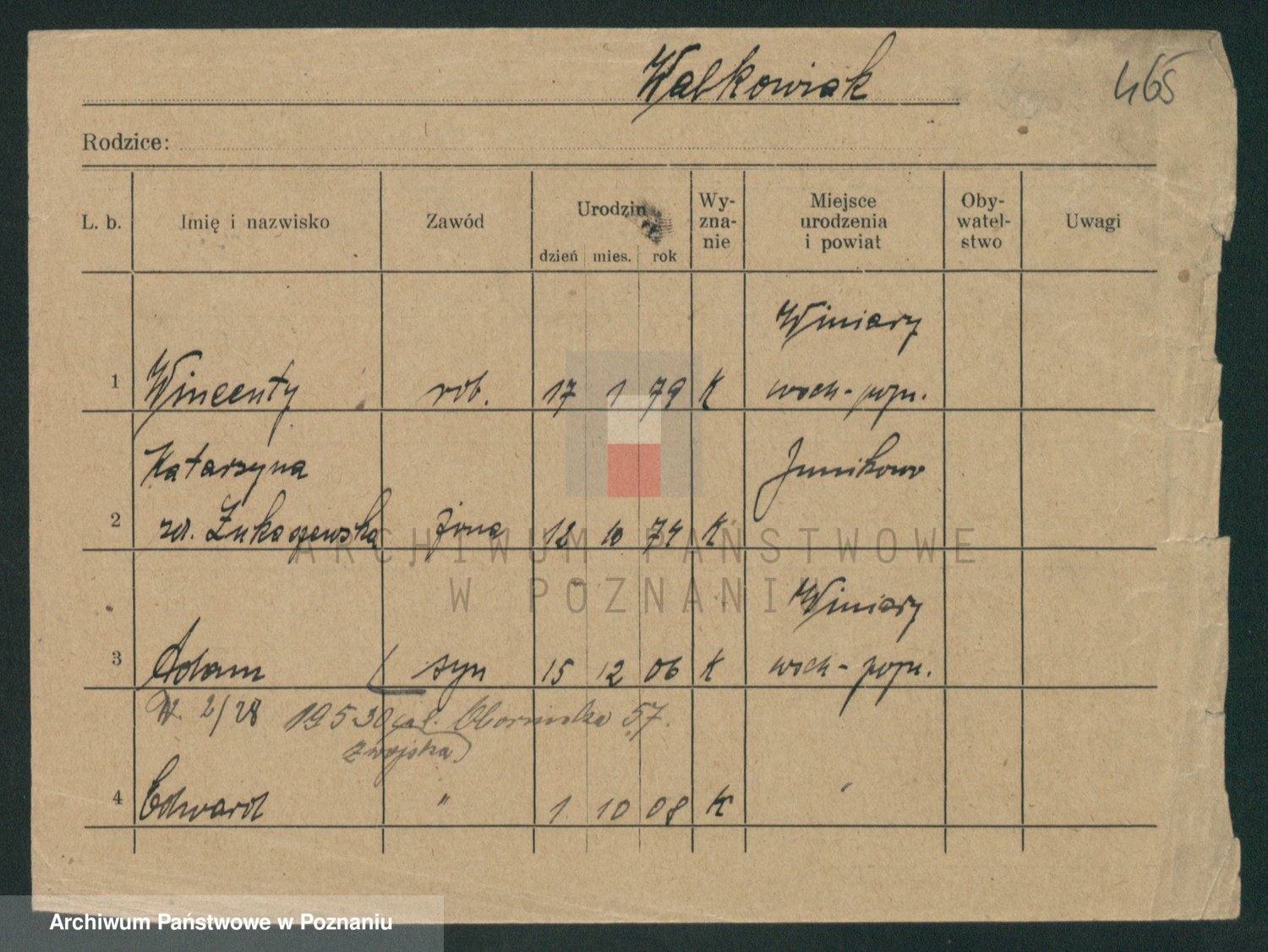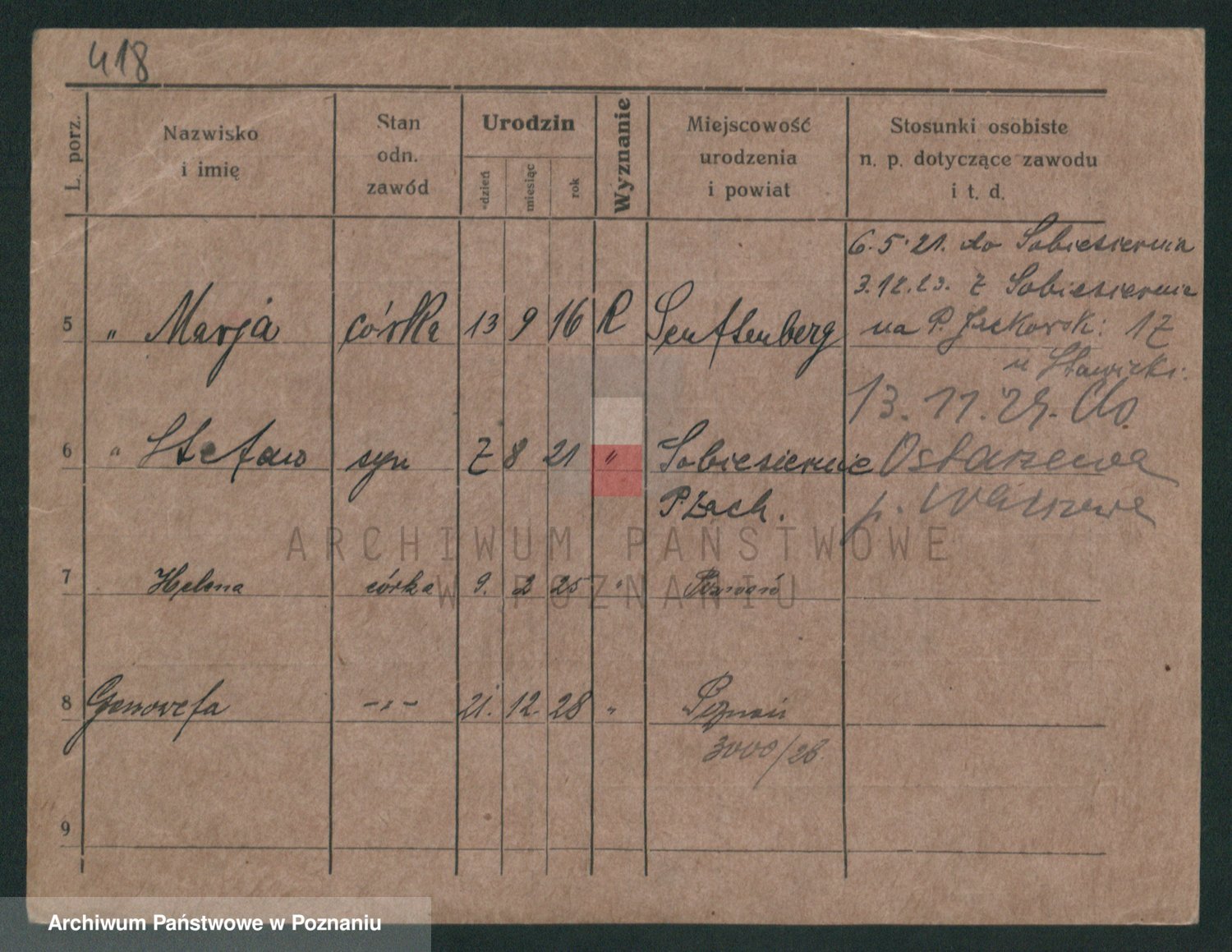 Podgląd karty osobowej dostępny jest po kliknięciu na nazwisko lub ikonkę karty. Można dokonywać powiększenia (ikony na górze) lub przechodzić między kolejnymi skanami (strzałki po bokach).