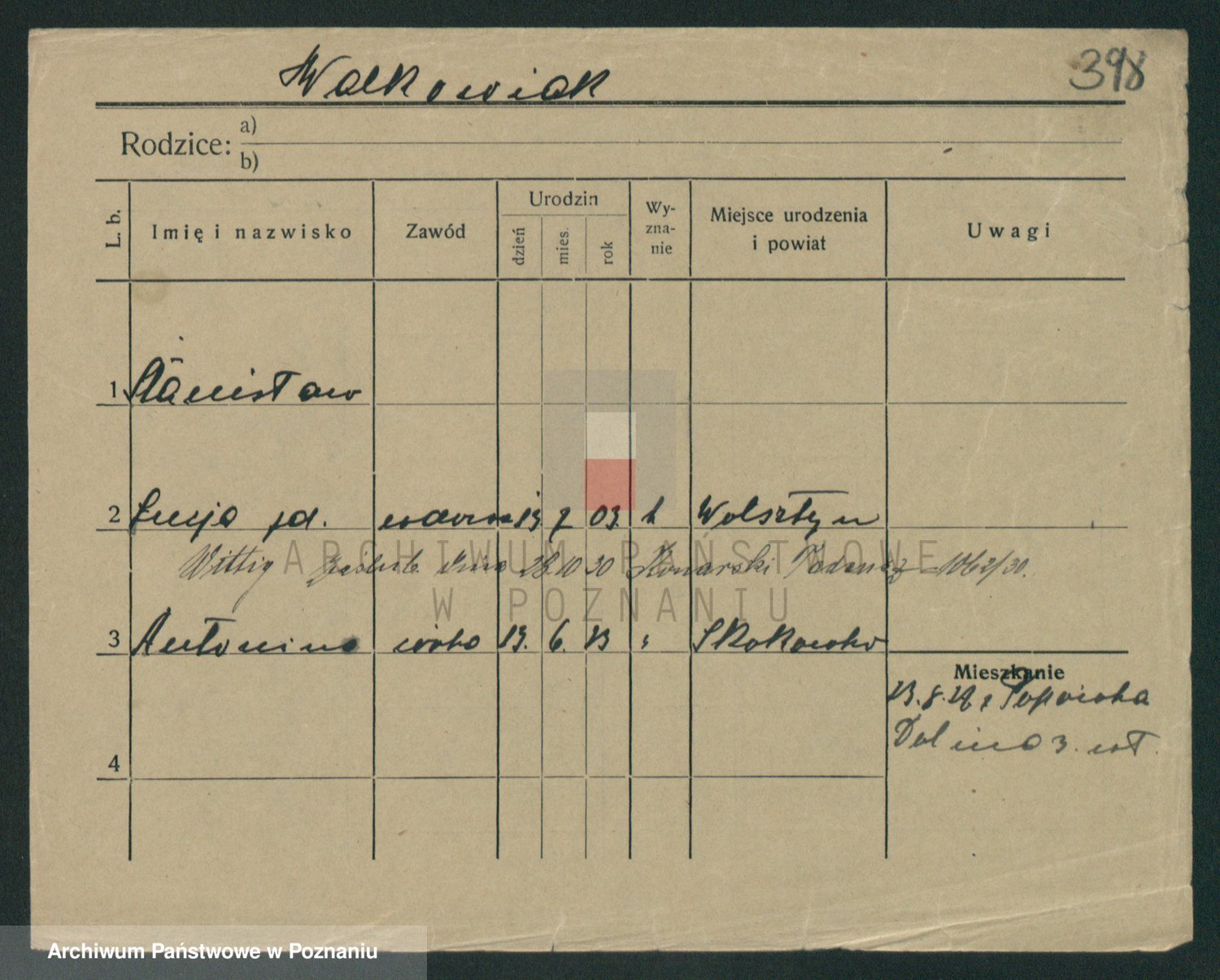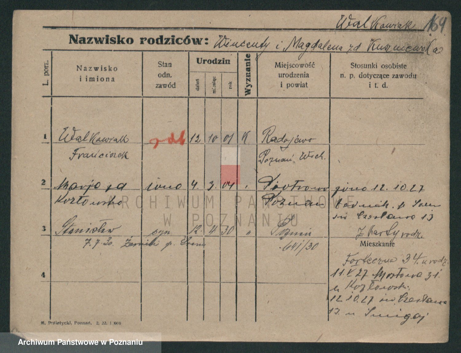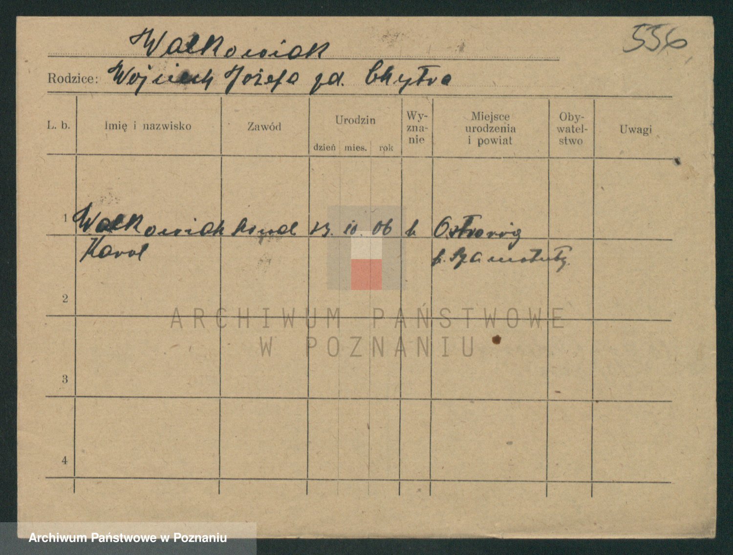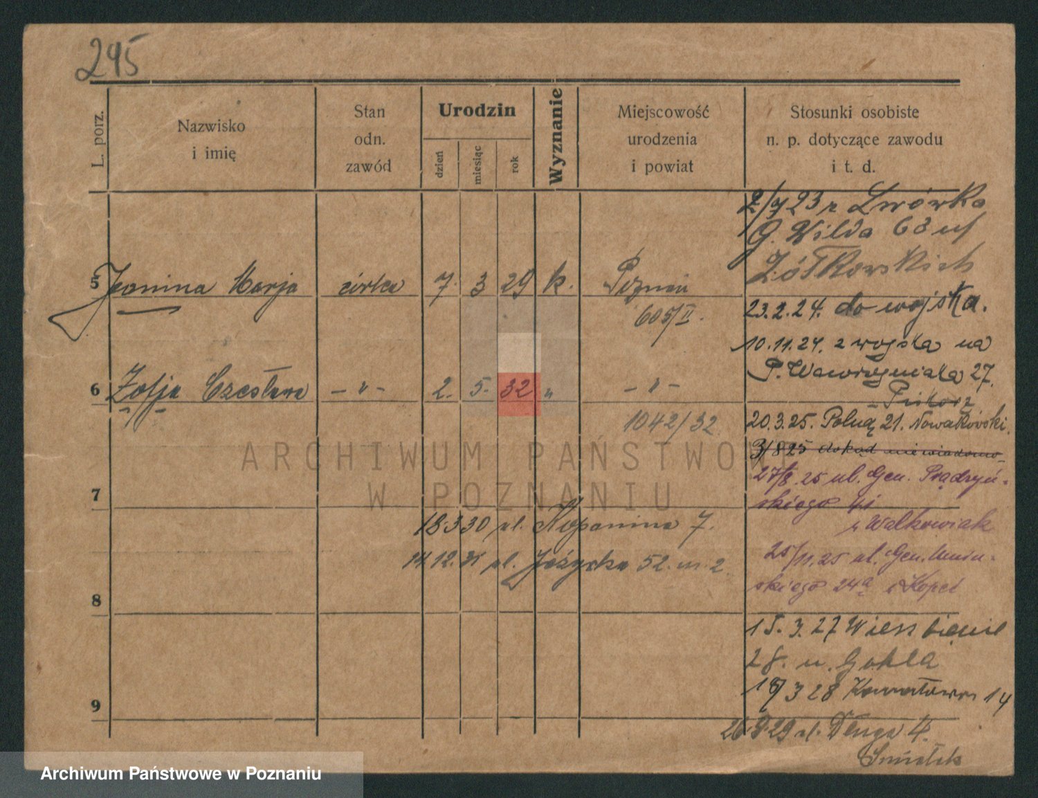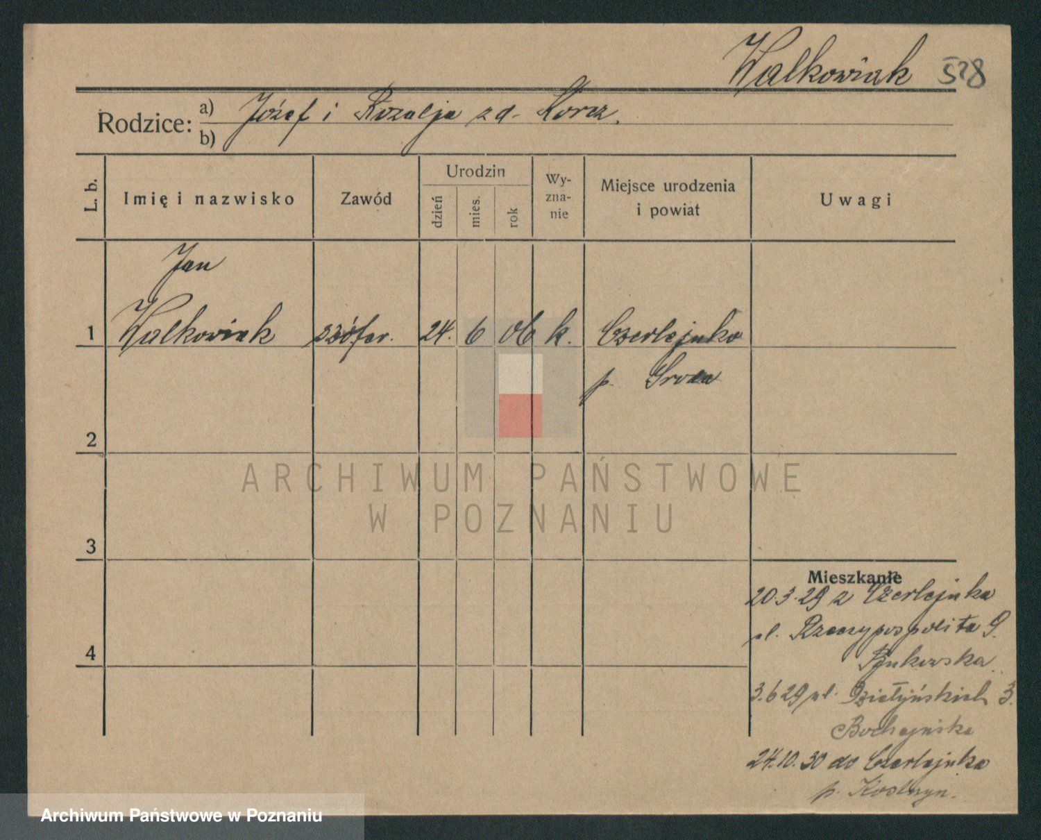 Podgląd karty osobowej dostępny jest po kliknięciu na nazwisko lub ikonkę karty. Można dokonywać powiększenia (ikony na górze) lub przechodzić między kolejnymi skanami (strzałki po bokach).
