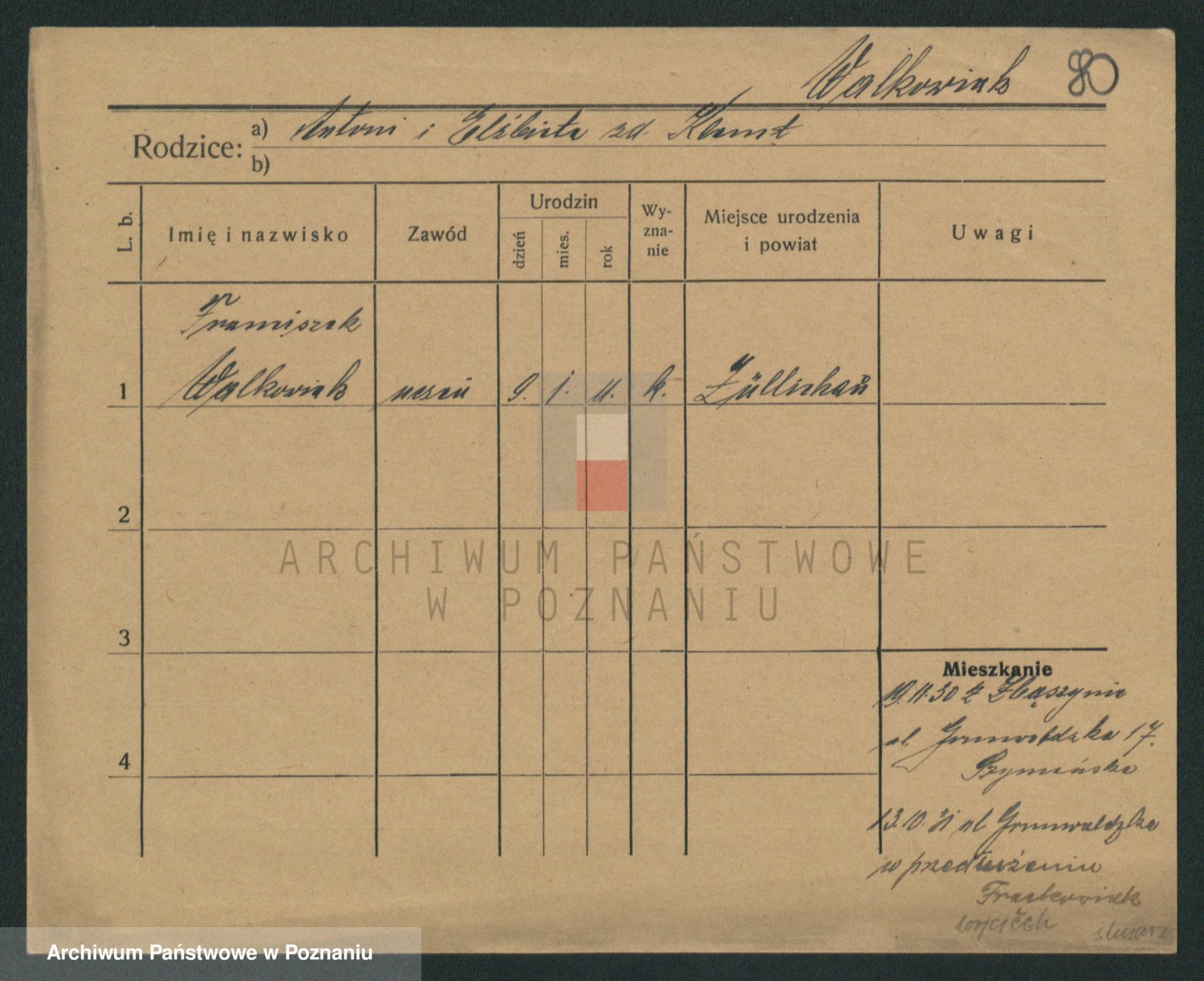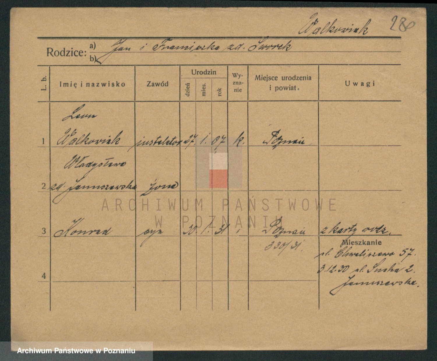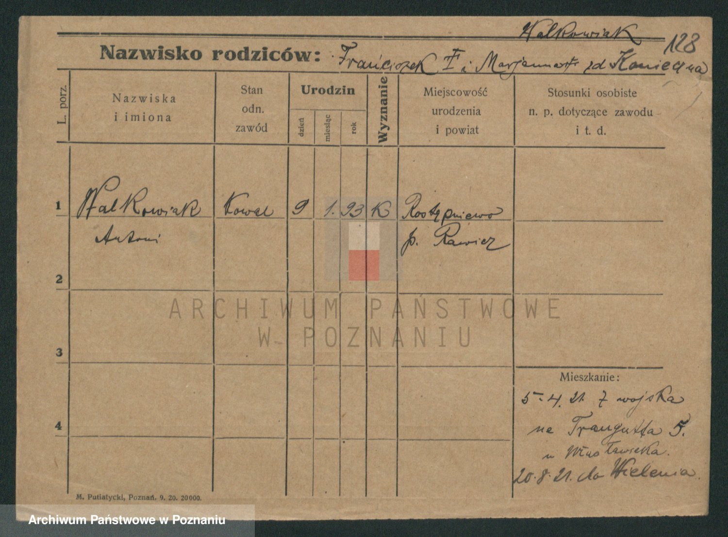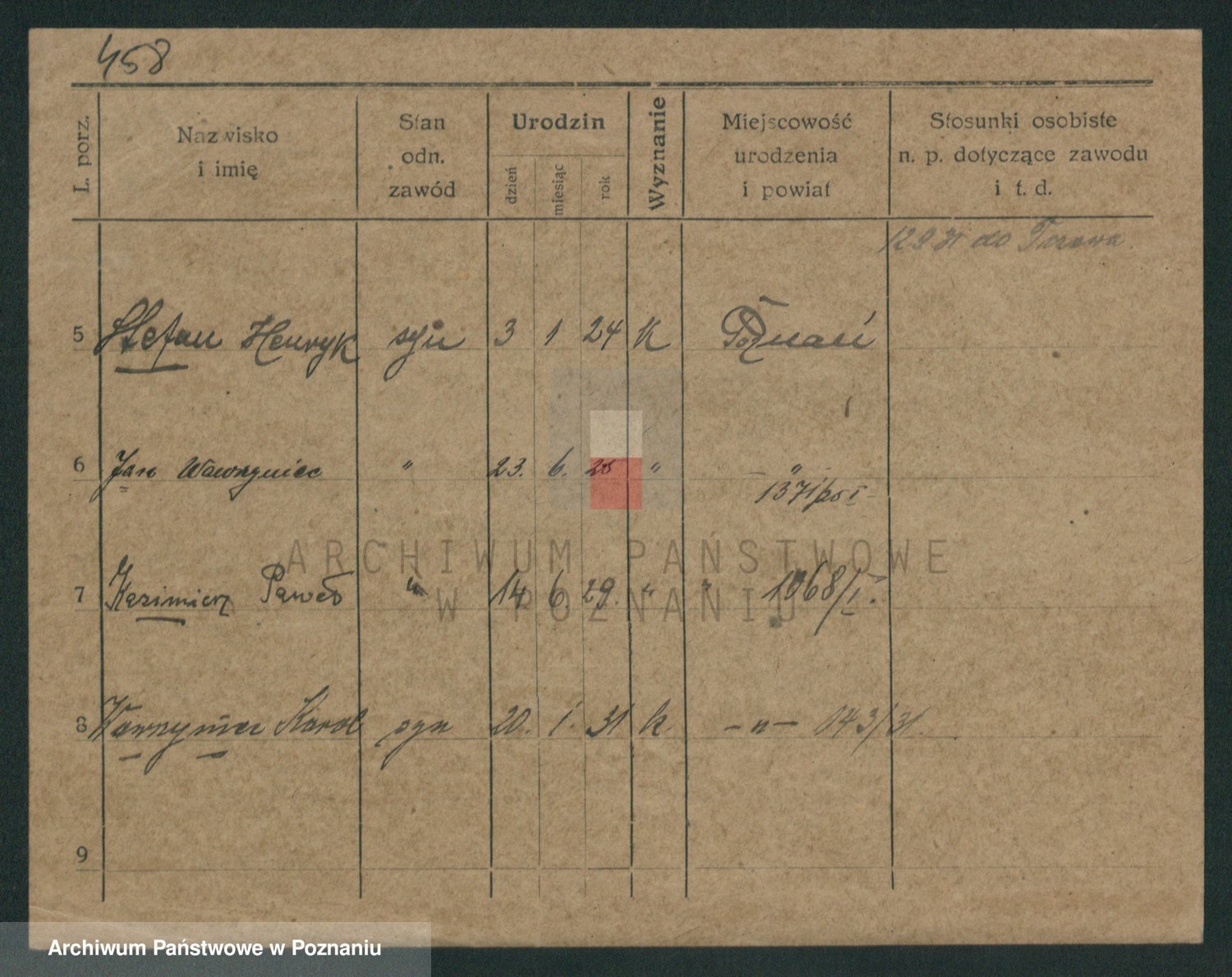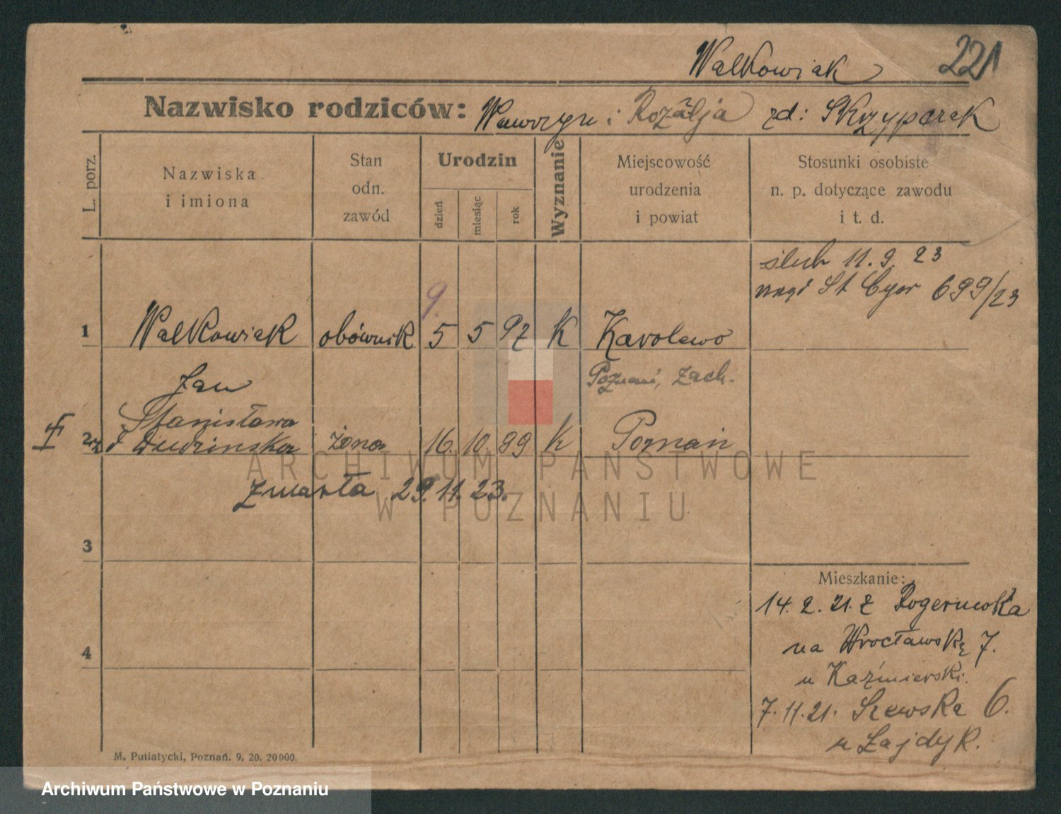 Podgląd karty osobowej dostępny jest po kliknięciu na nazwisko lub ikonkę karty. Można dokonywać powiększenia (ikony na górze) lub przechodzić między kolejnymi skanami (strzałki po bokach).