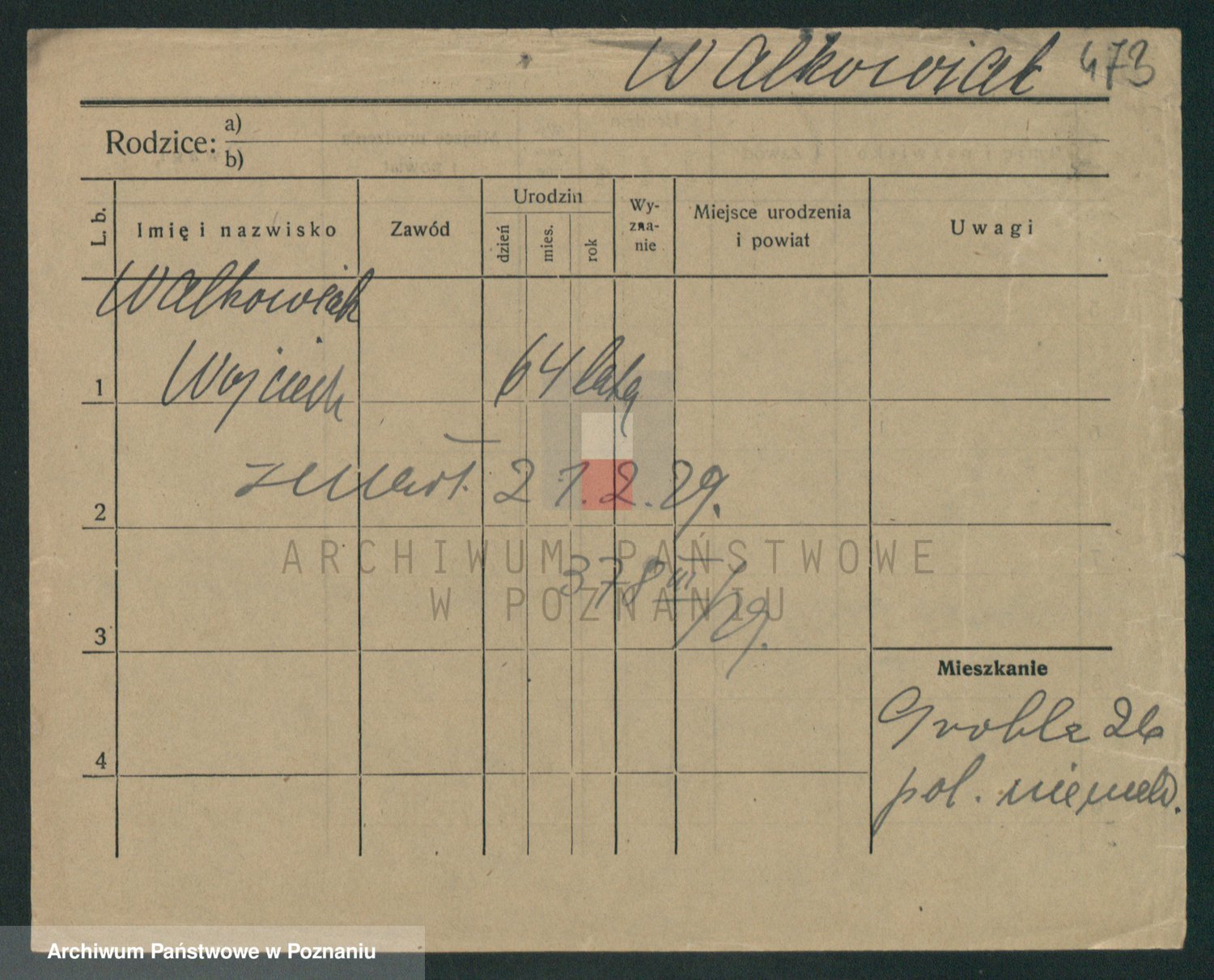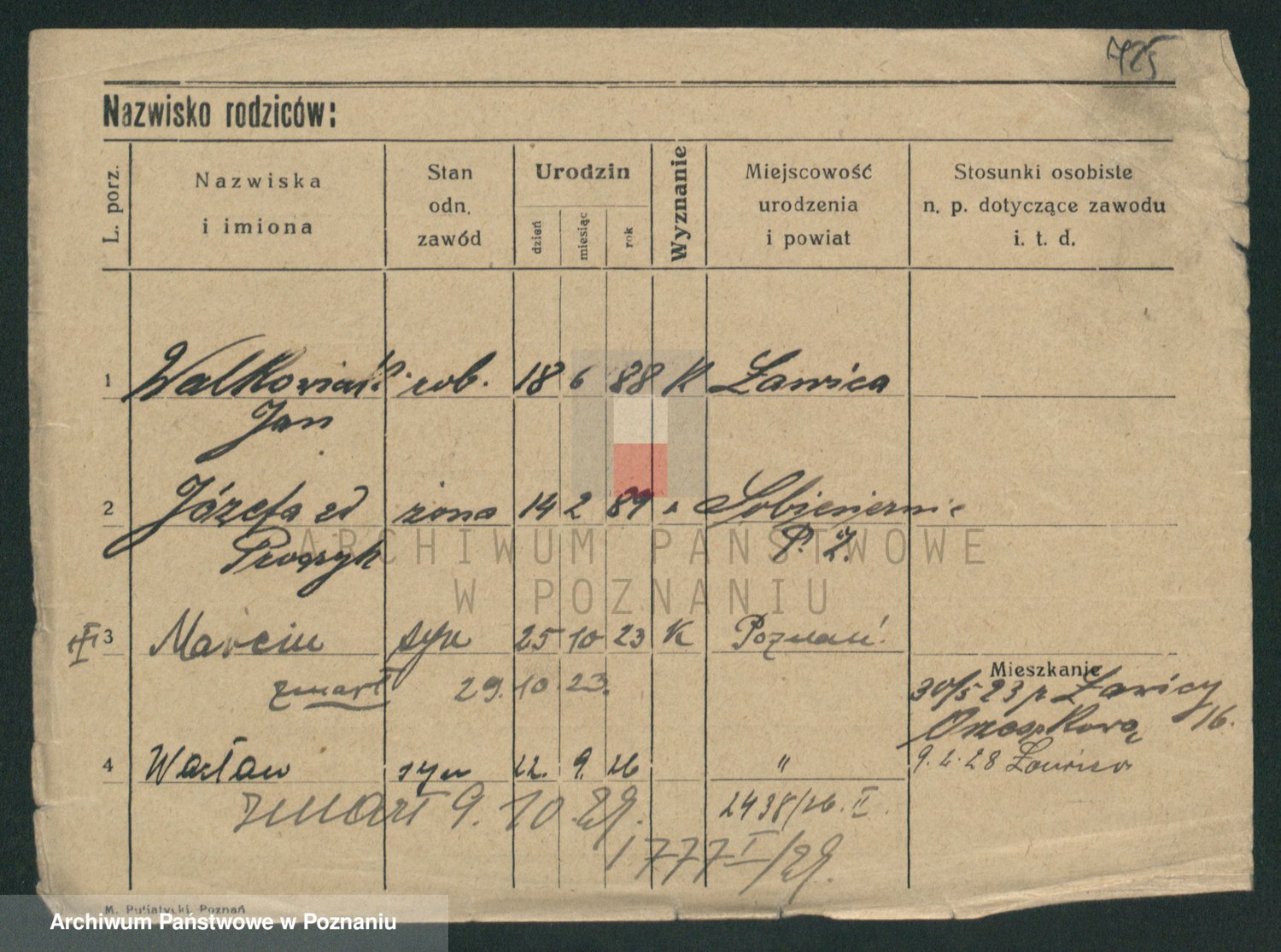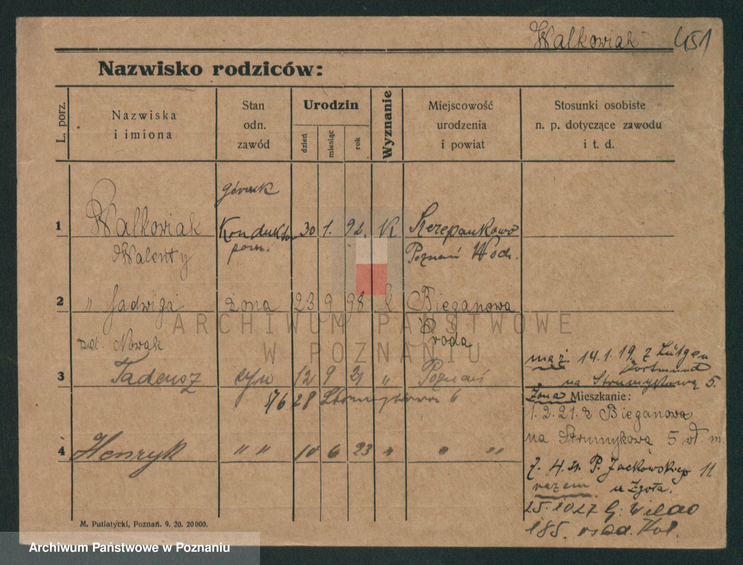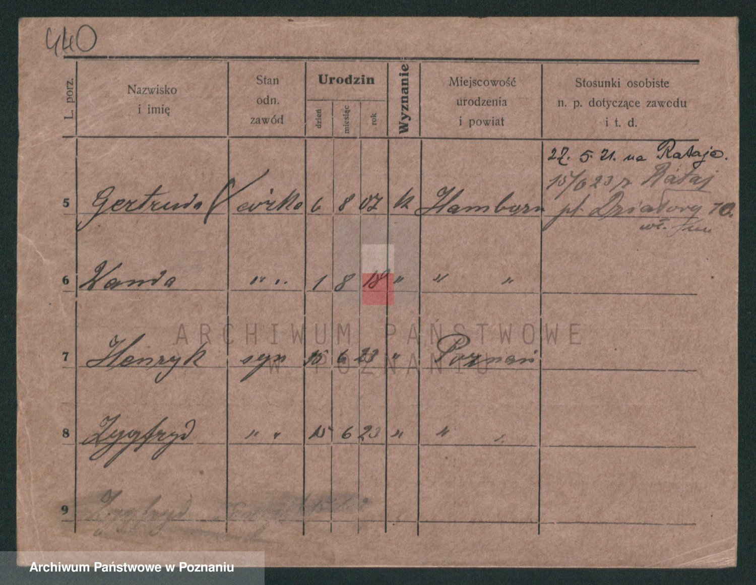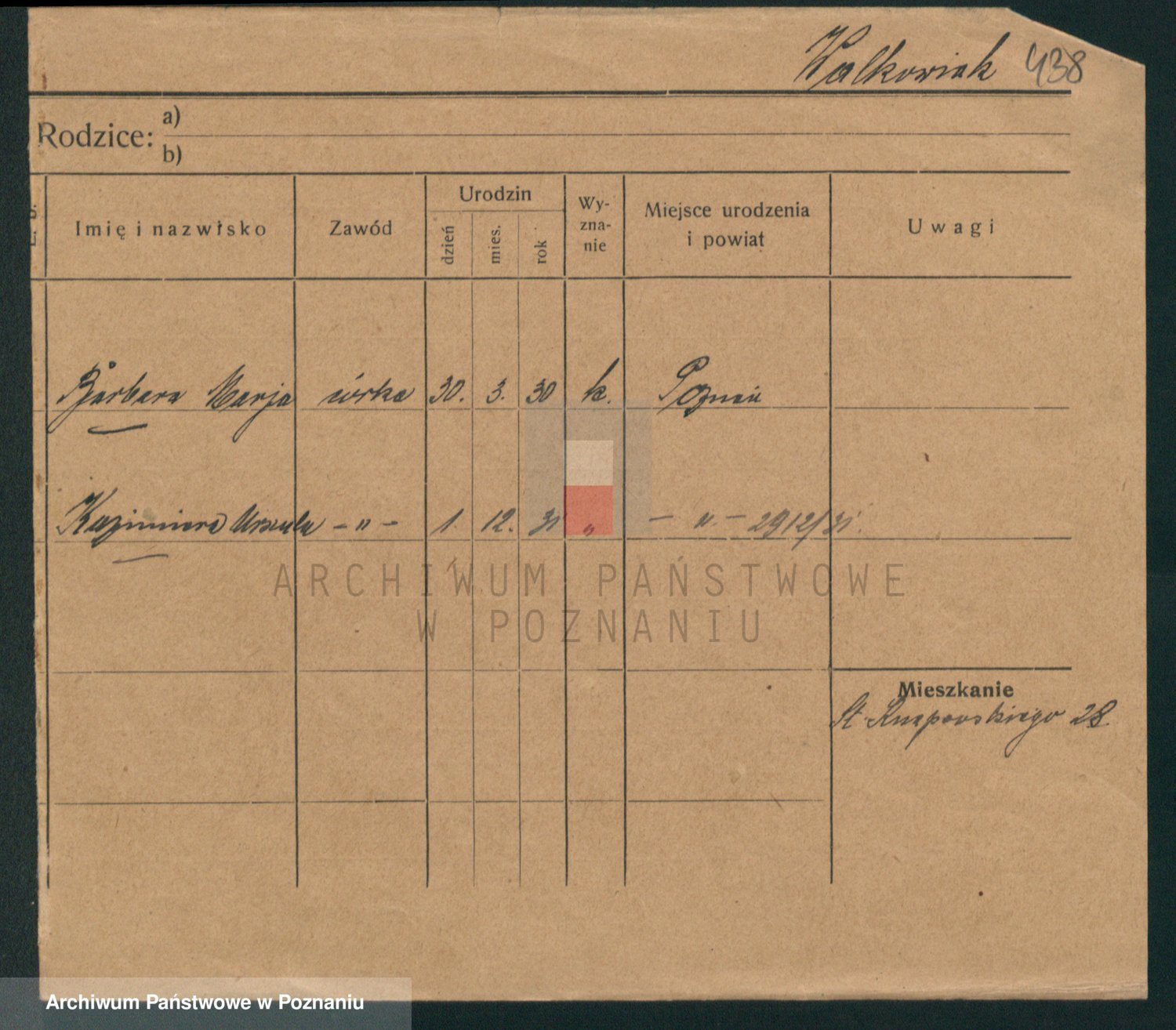 Podgląd karty osobowej dostępny jest po kliknięciu na nazwisko lub ikonkę karty. Można dokonywać powiększenia (ikony na górze) lub przechodzić między kolejnymi skanami (strzałki po bokach).