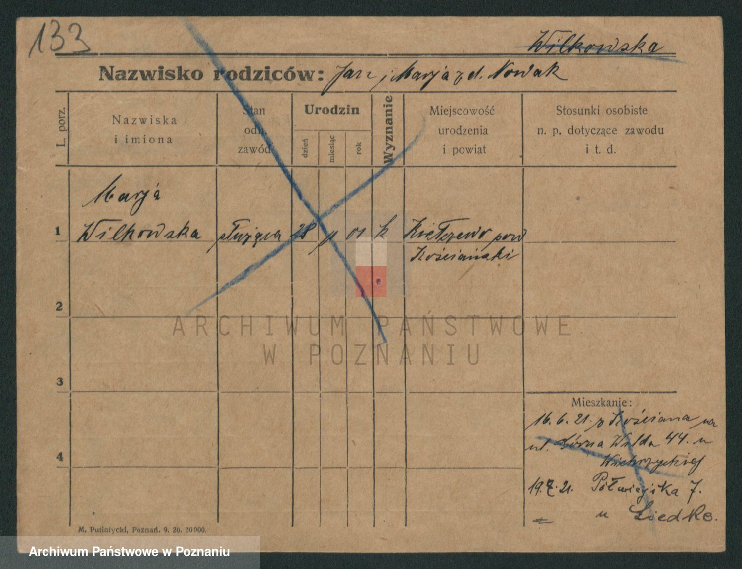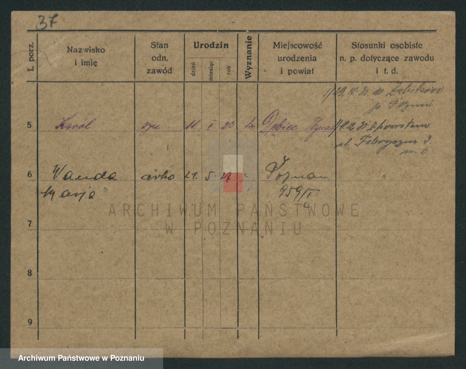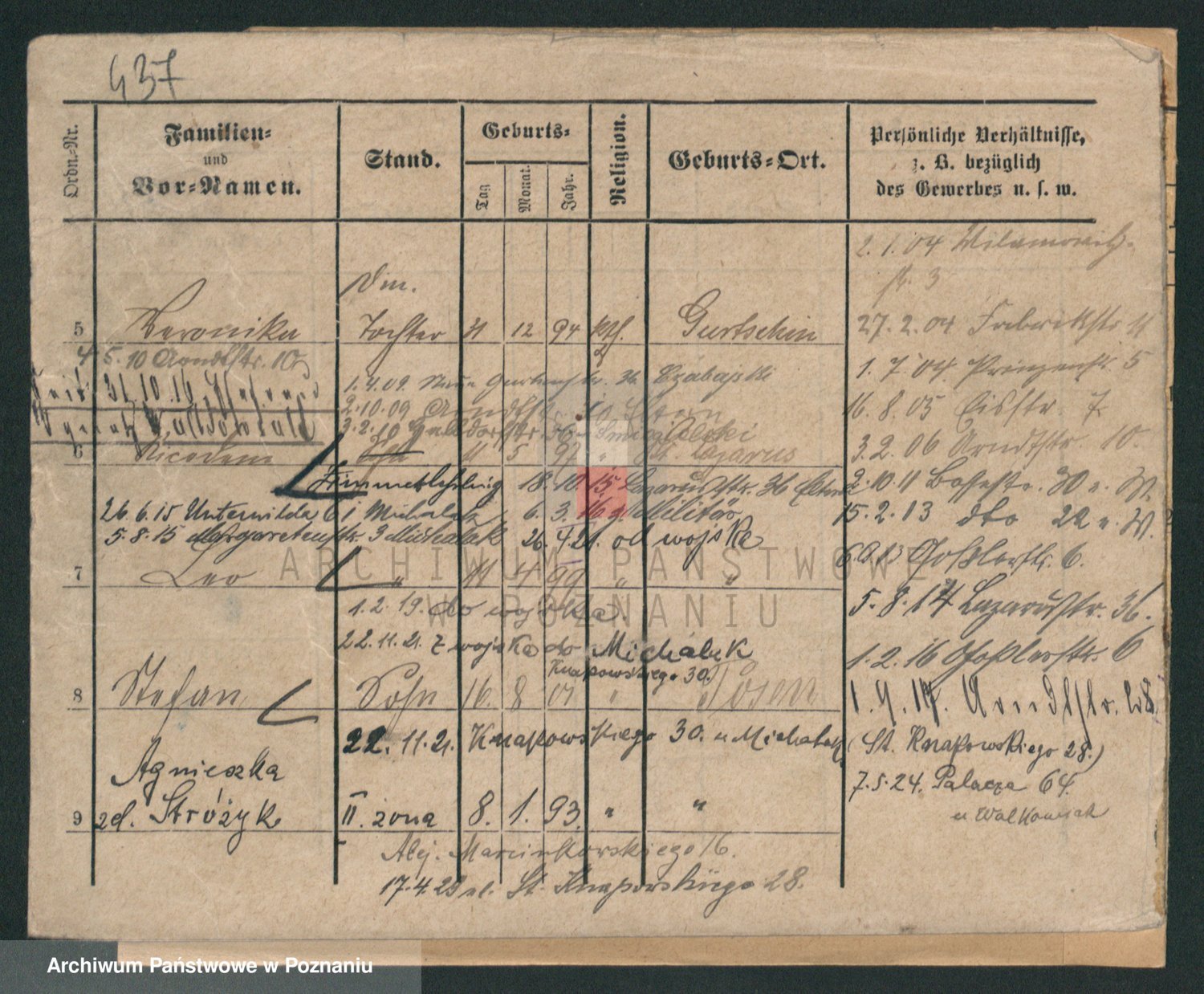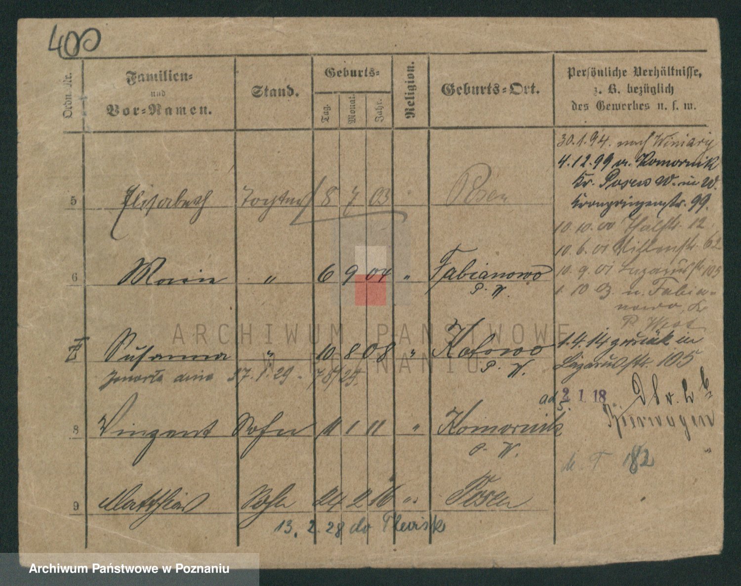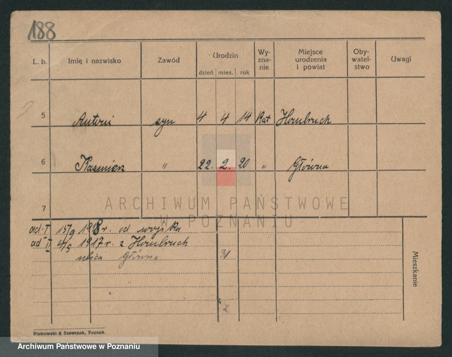 Podgląd karty osobowej dostępny jest po kliknięciu na nazwisko lub ikonkę karty. Można dokonywać powiększenia (ikony na górze) lub przechodzić między kolejnymi skanami (strzałki po bokach).
