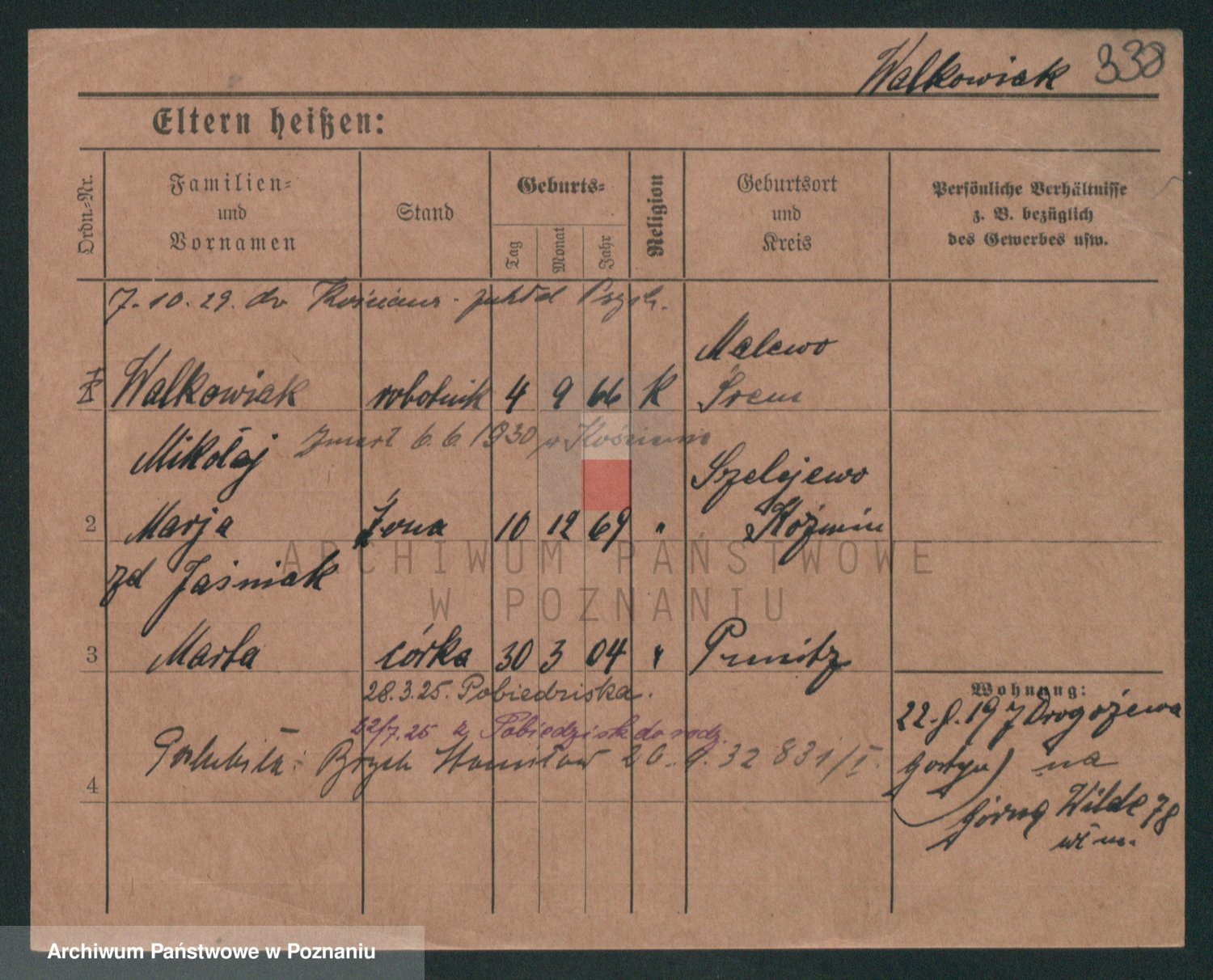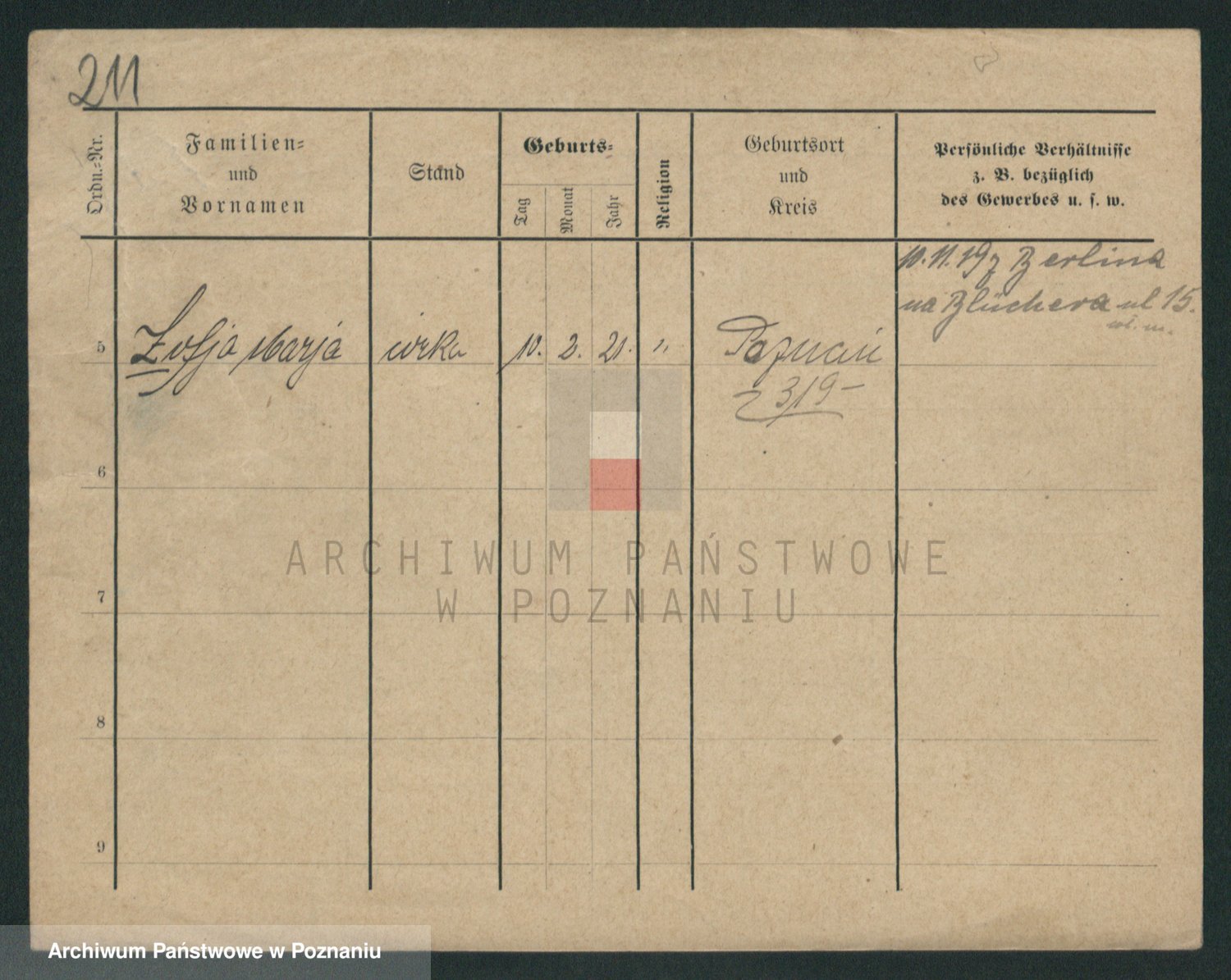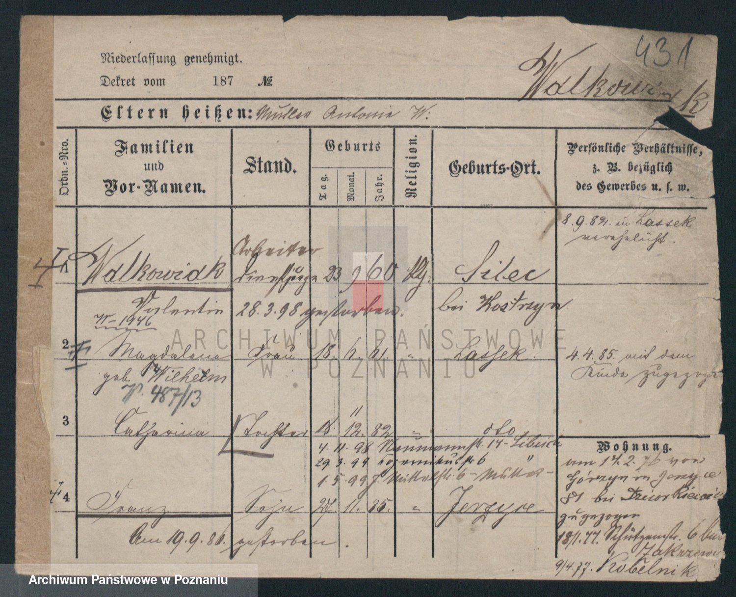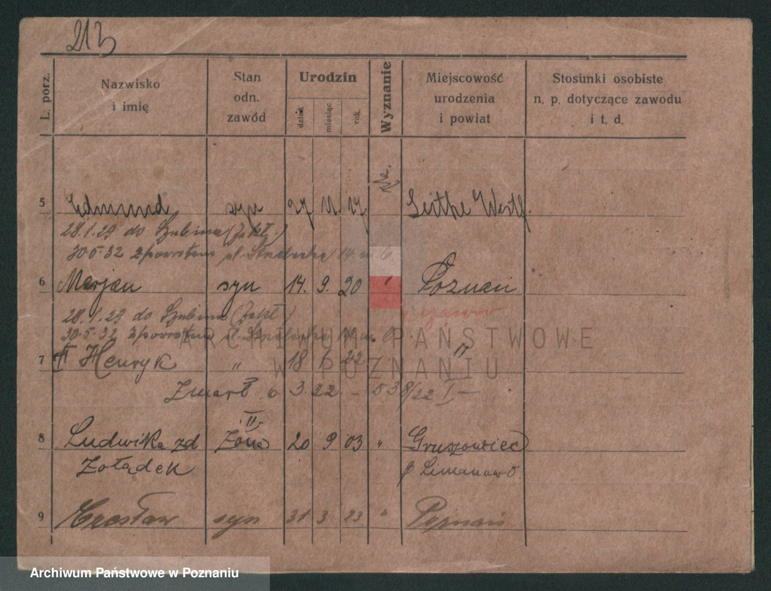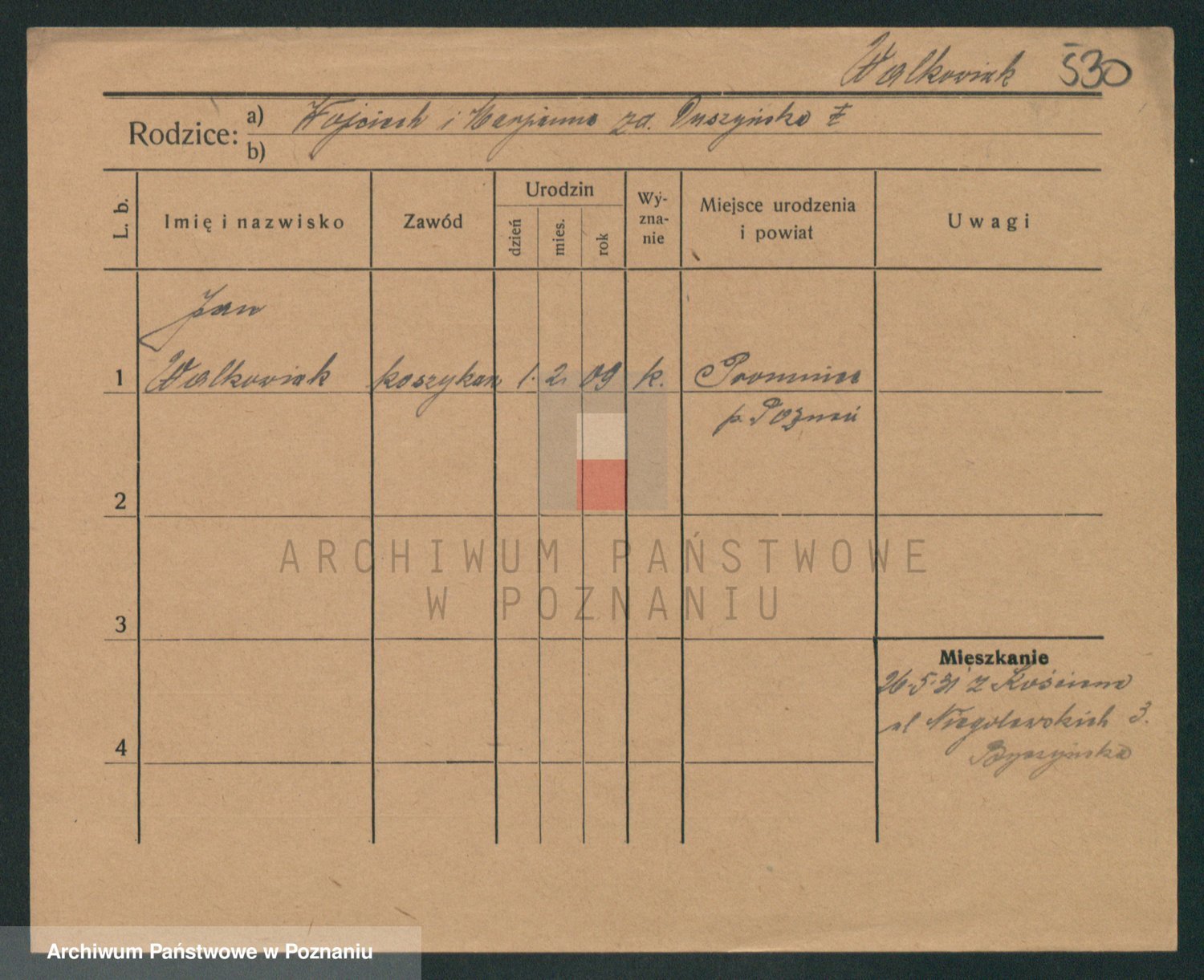 Podgląd karty osobowej dostępny jest po kliknięciu na nazwisko lub ikonkę karty. Można dokonywać powiększenia (ikony na górze) lub przechodzić między kolejnymi skanami (strzałki po bokach).