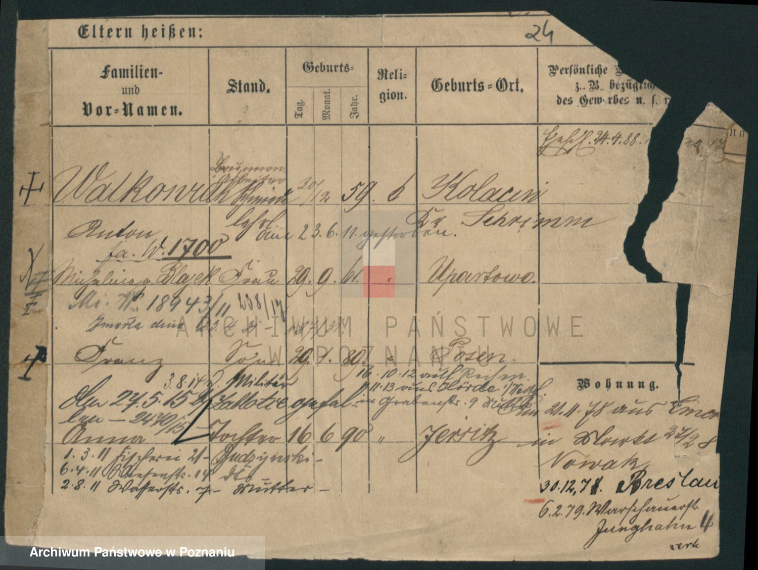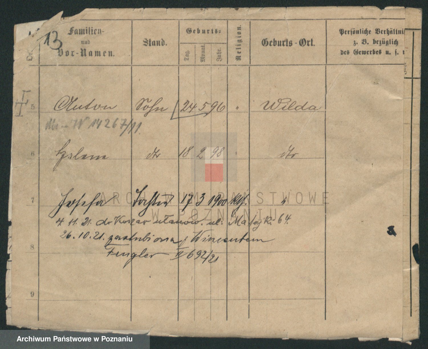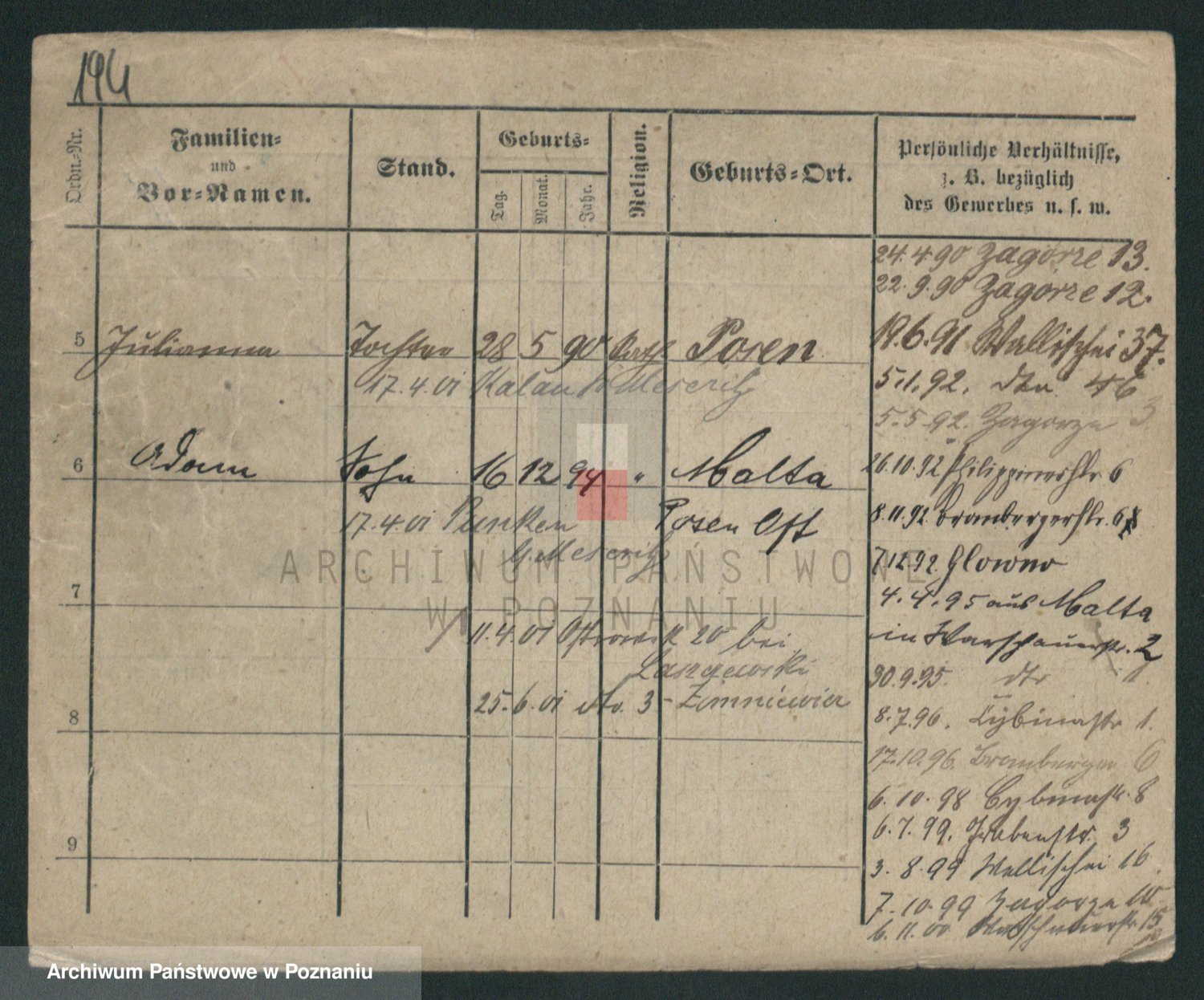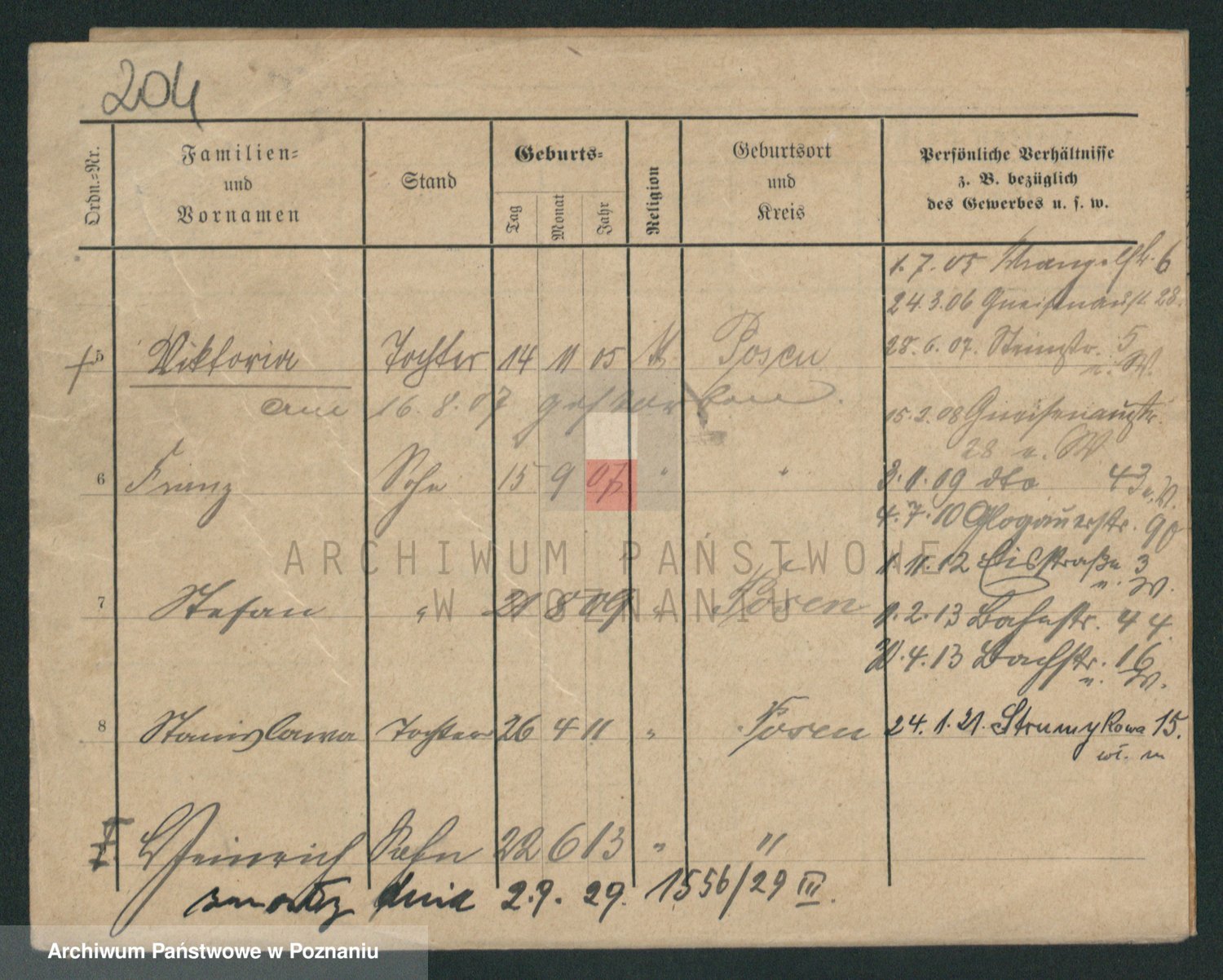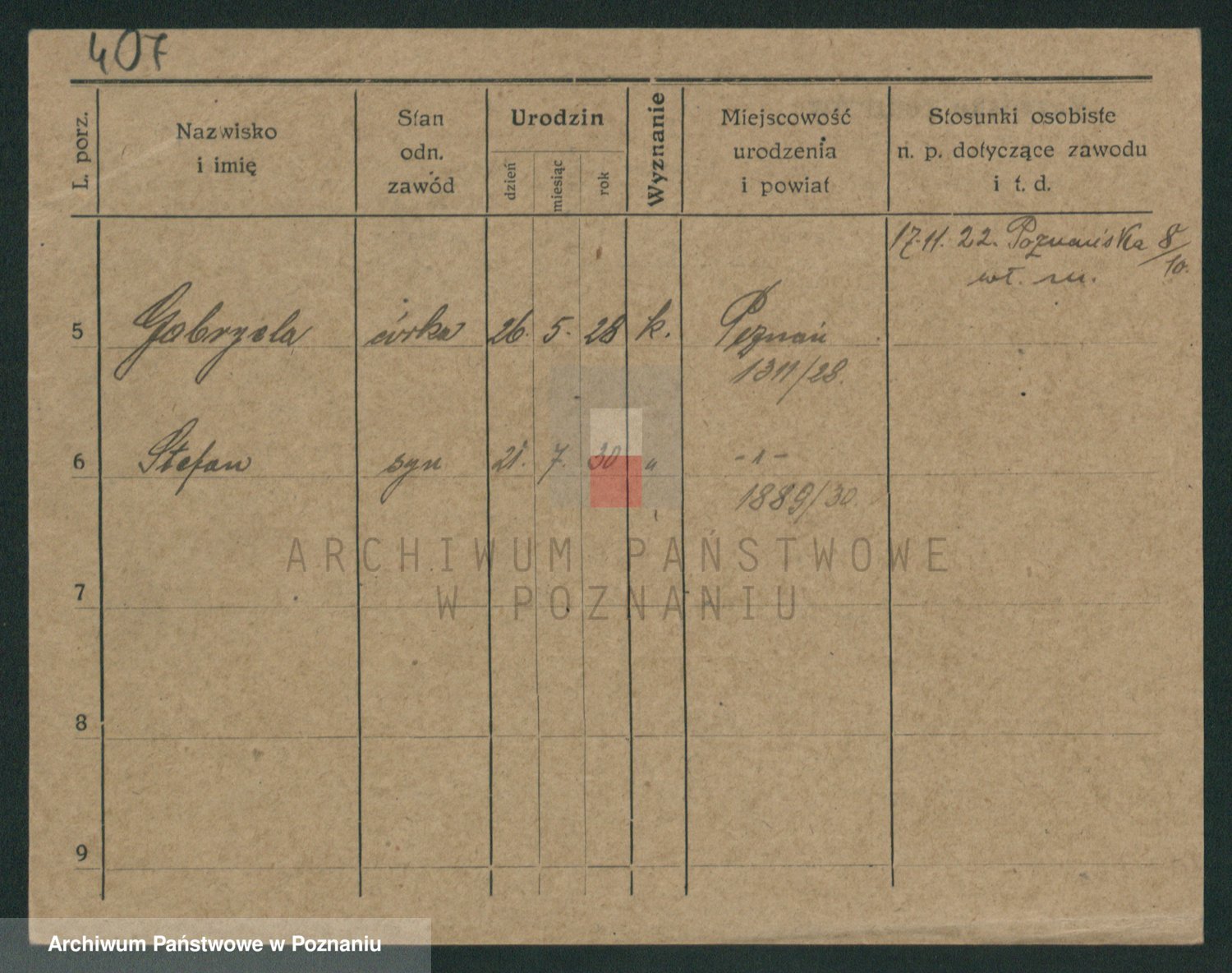Podgląd karty osobowej dostępny jest po kliknięciu na nazwisko lub ikonkę karty. Można dokonywać powiększenia (ikony na górze) lub przechodzić między kolejnymi skanami (strzałki po bokach).