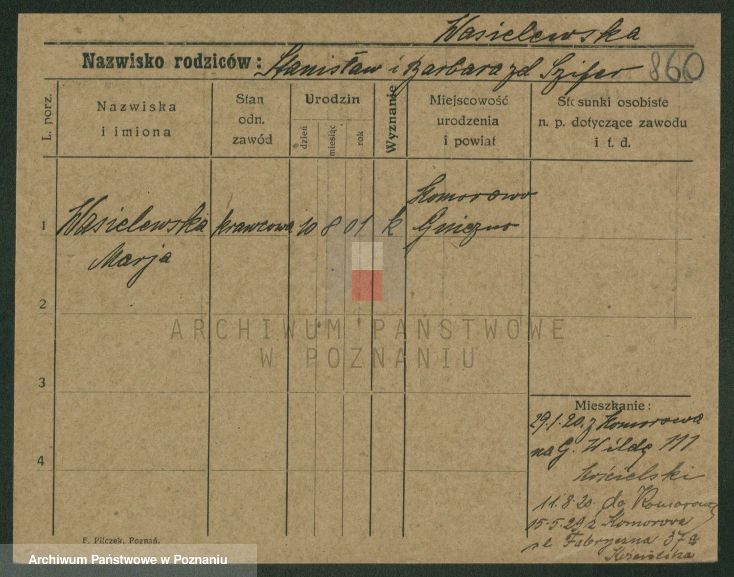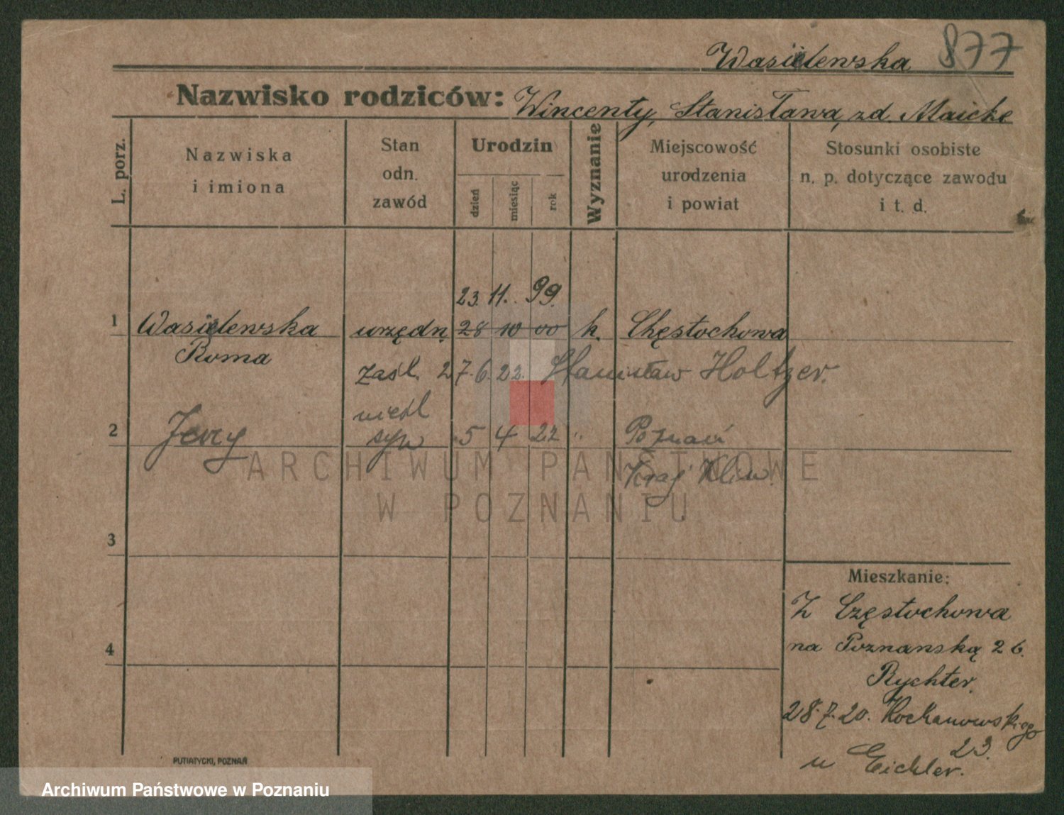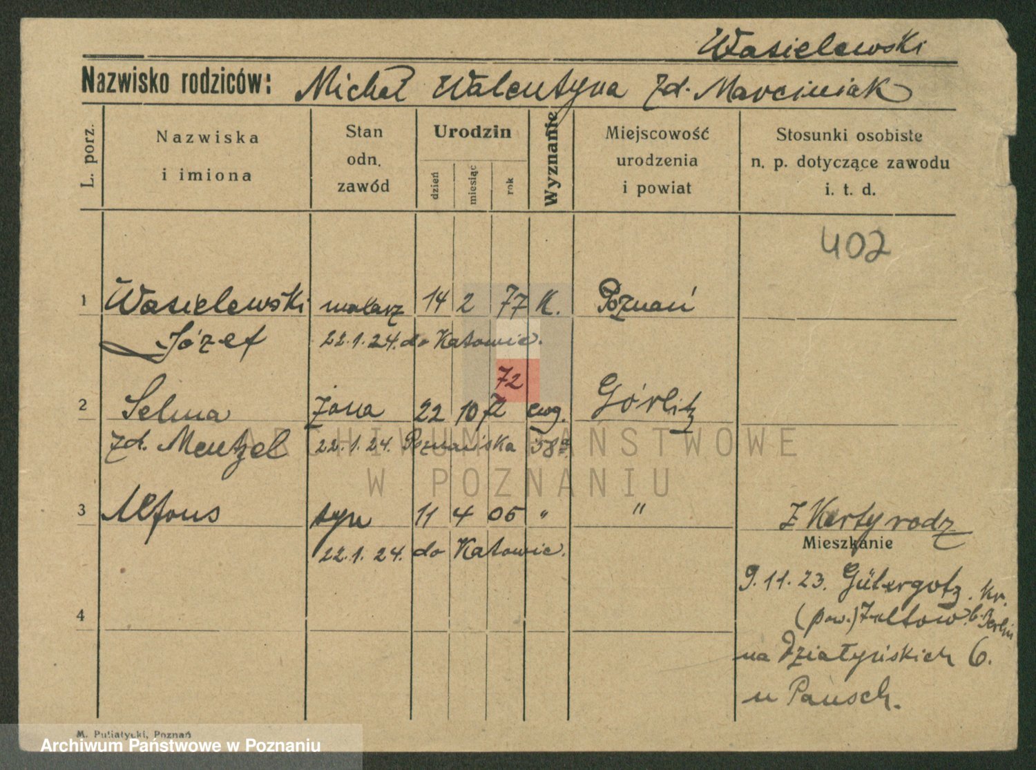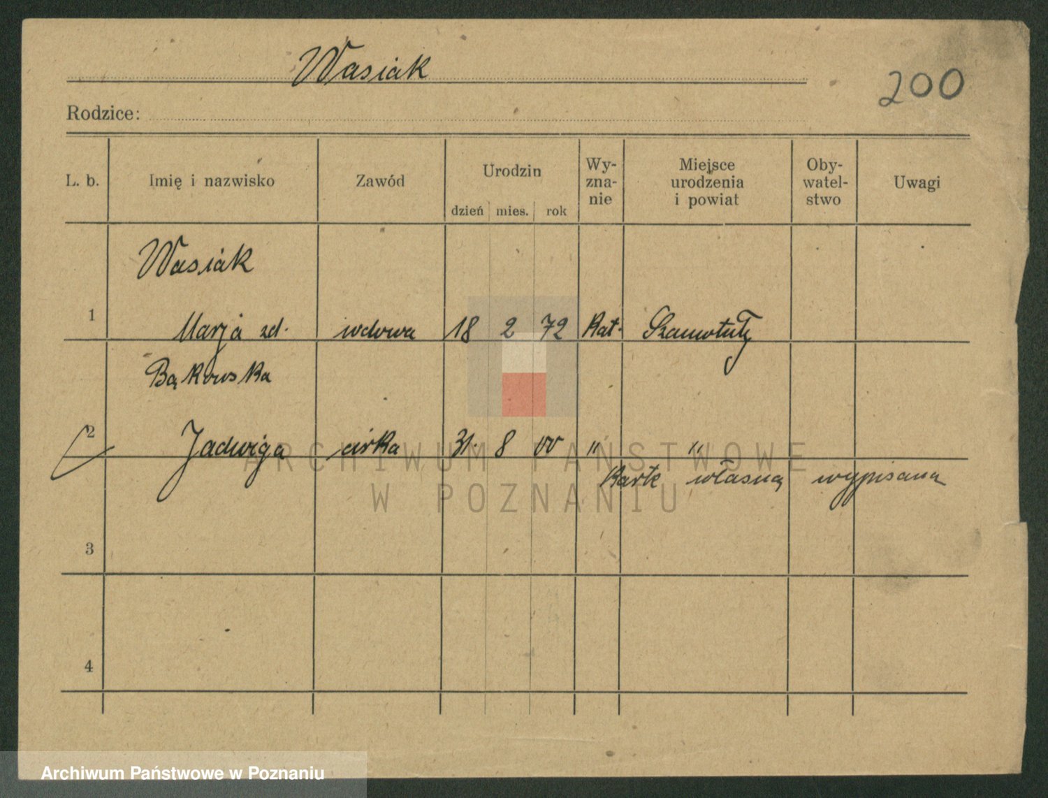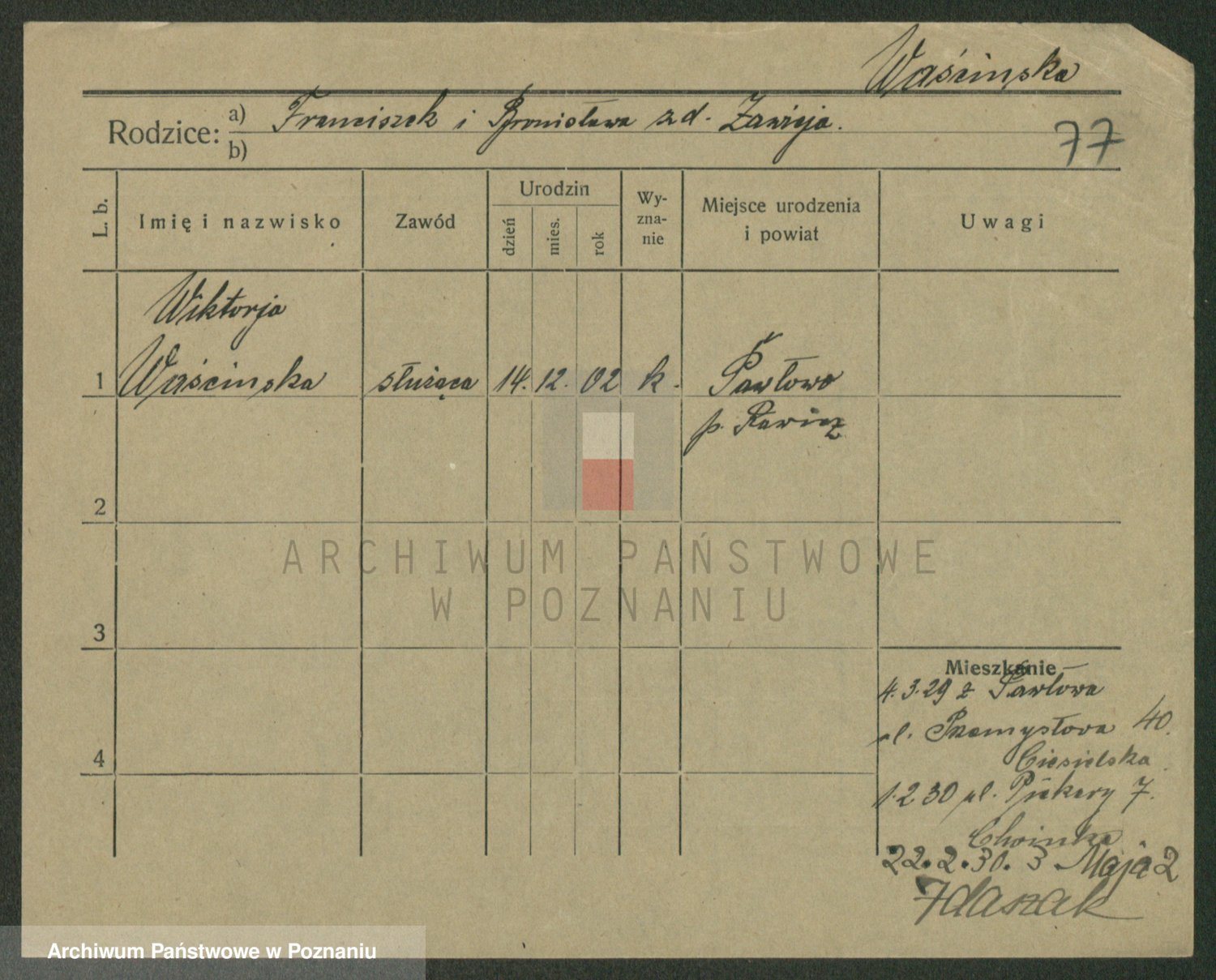 Podgląd karty osobowej dostępny jest po kliknięciu na nazwisko lub ikonkę karty. Można dokonywać powiększenia (ikony na górze) lub przechodzić między kolejnymi skanami (strzałki po bokach).